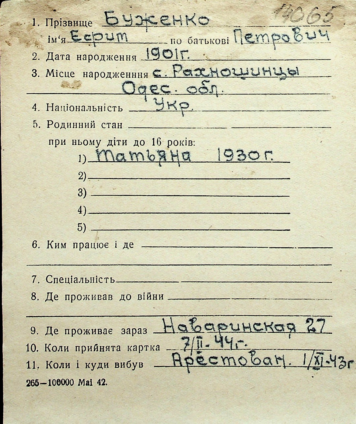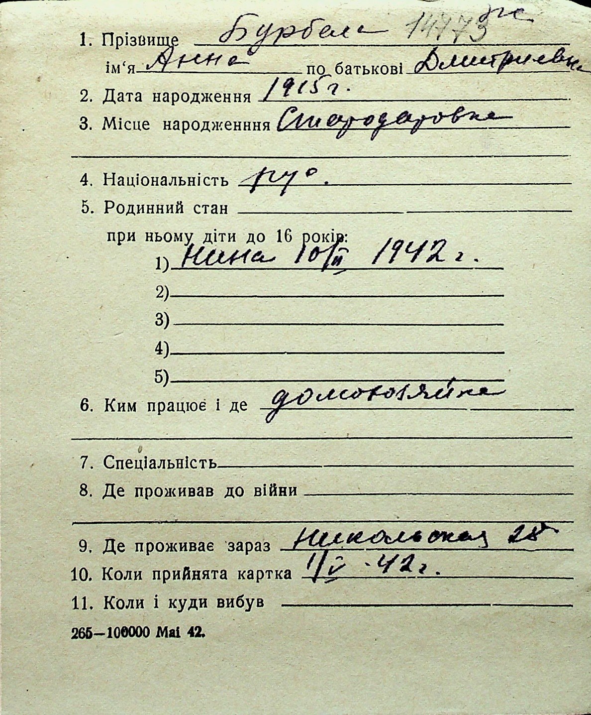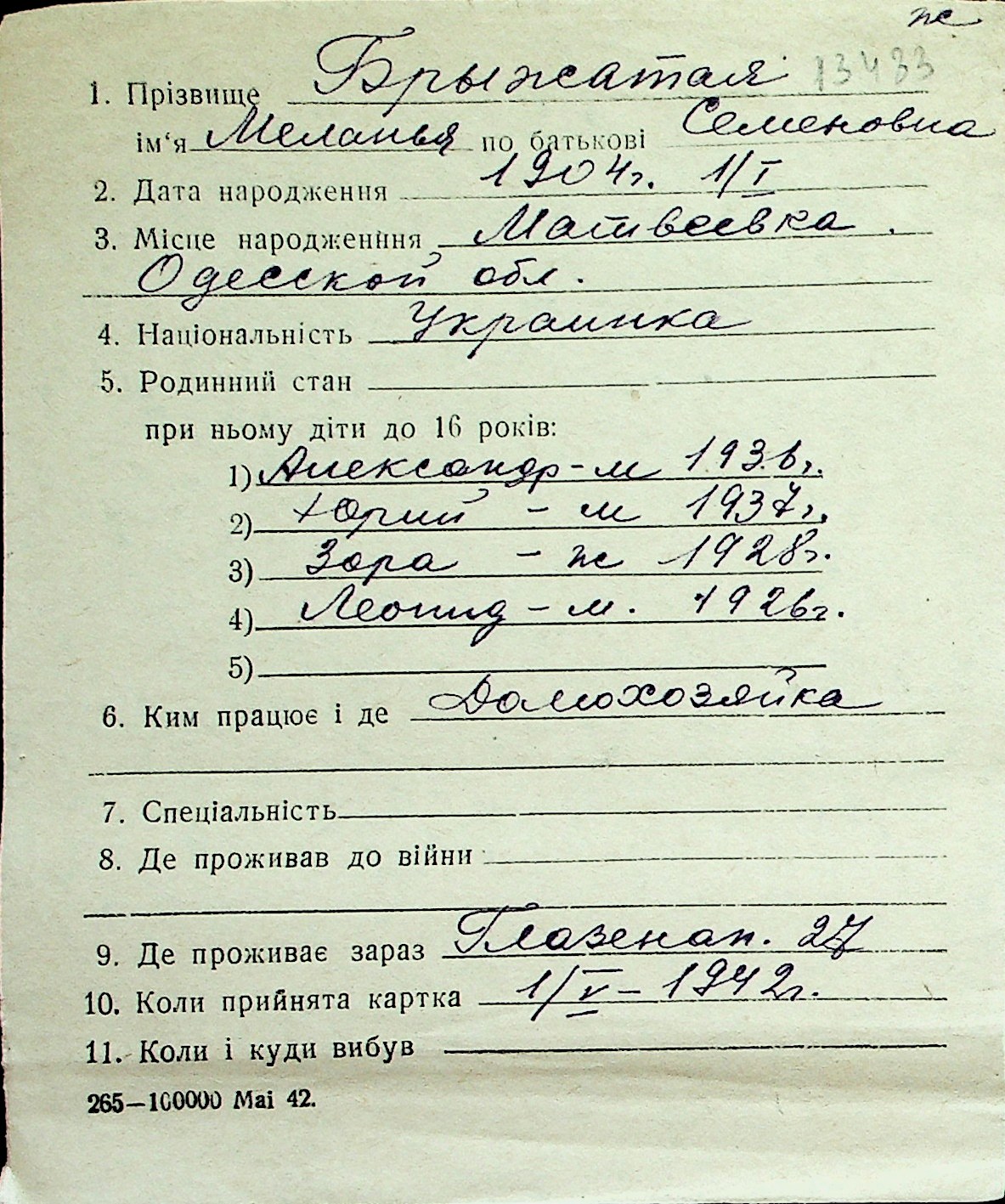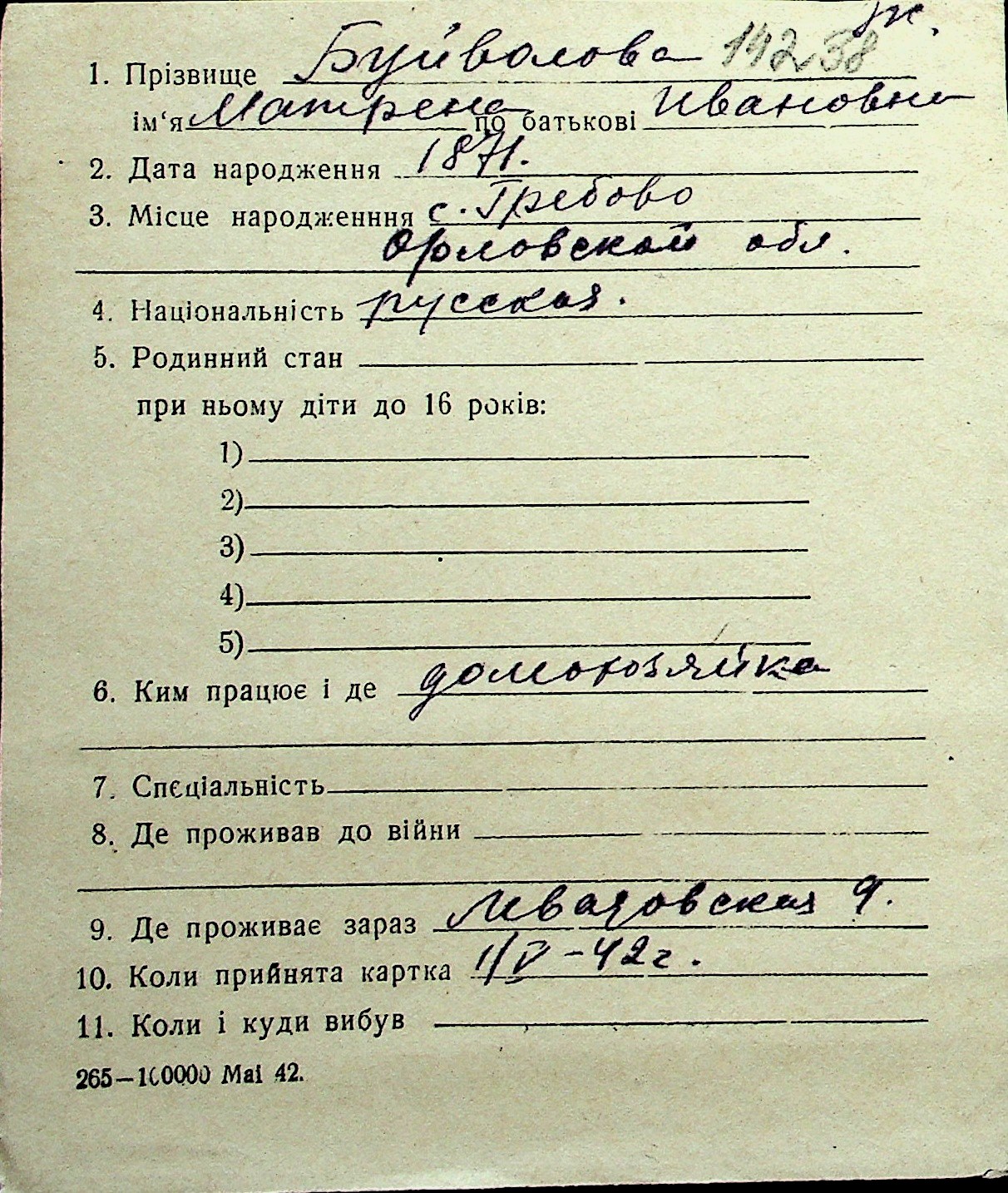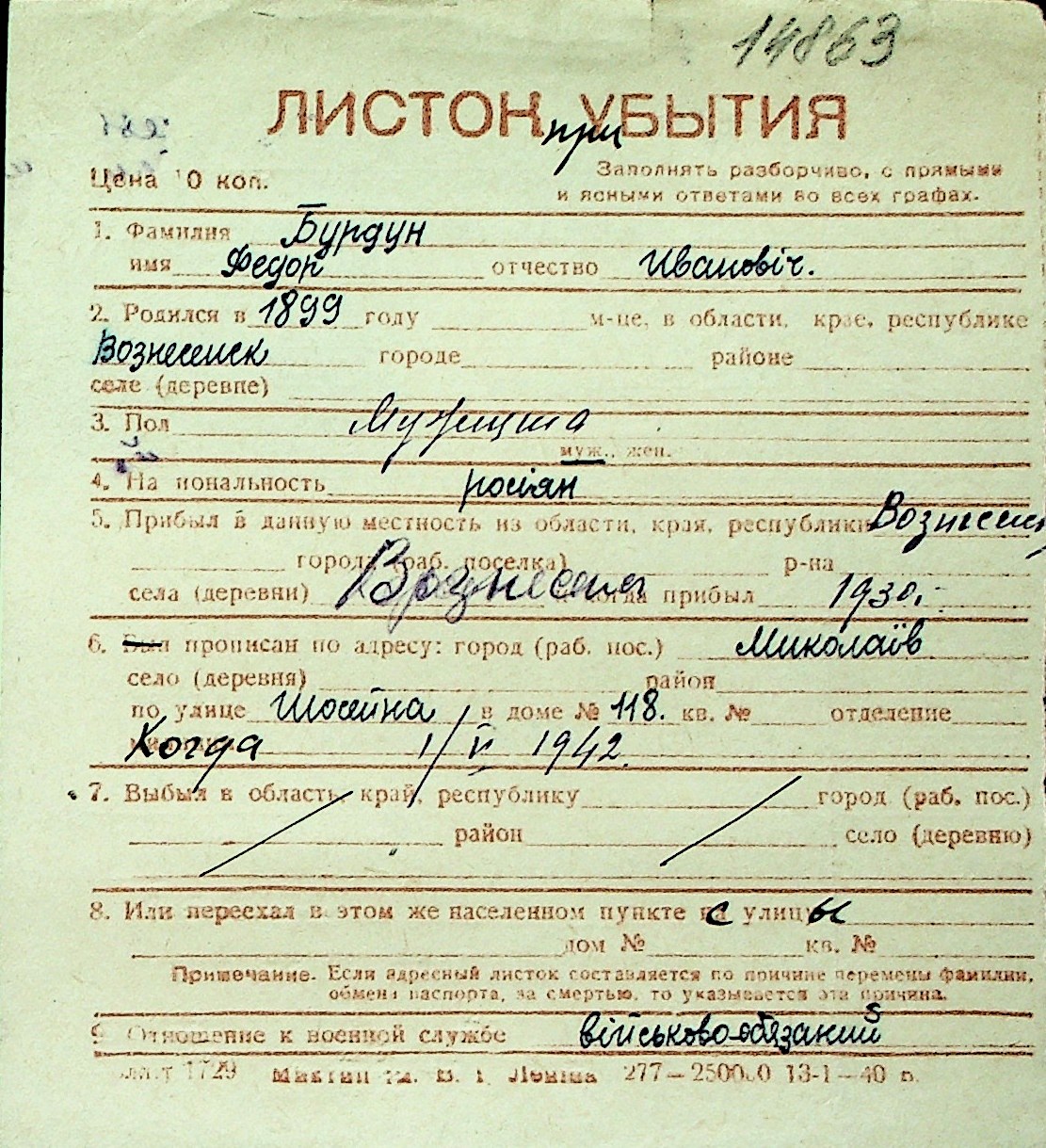 ◦ ◦ Перелік карток на осіб, які мешкали у м. Миколаїв у період окупації 1941–1944 років