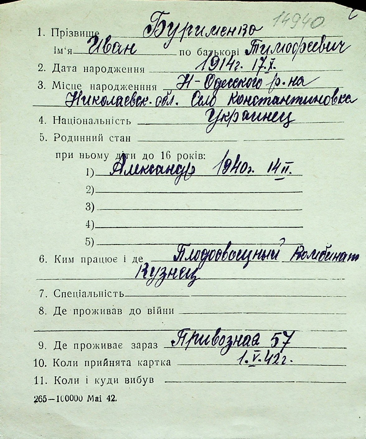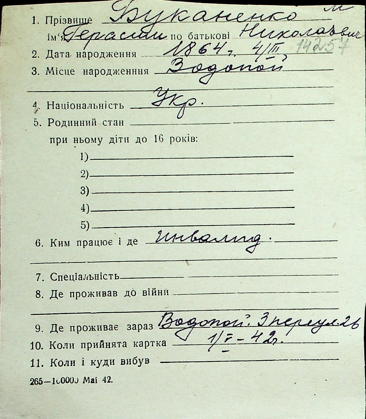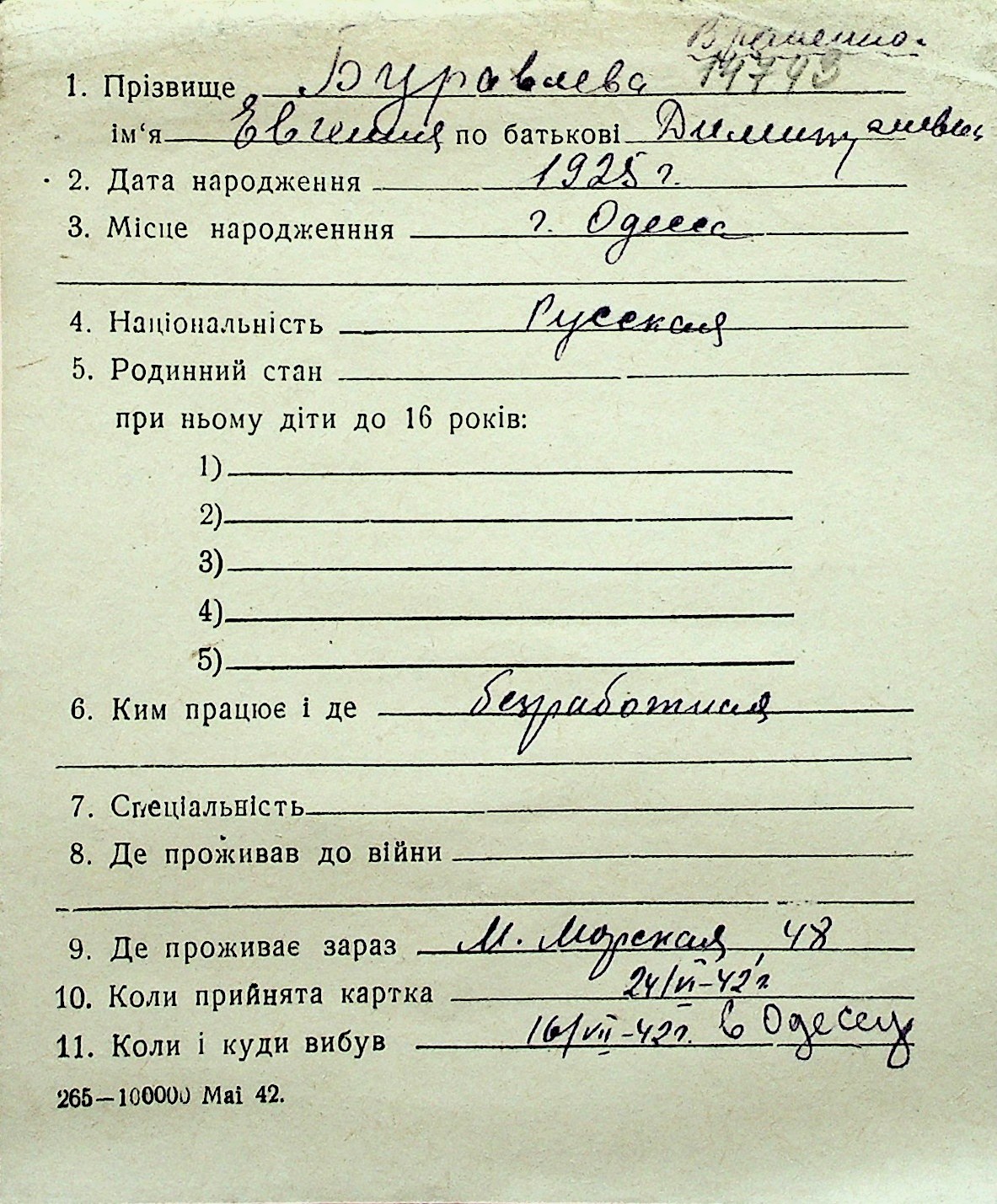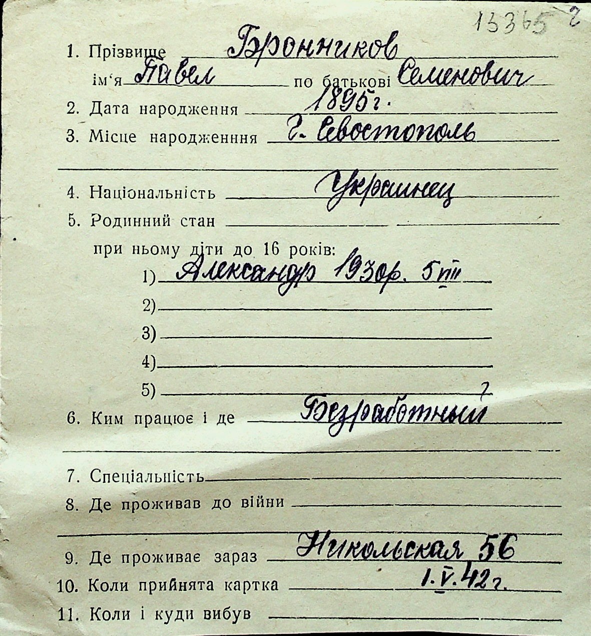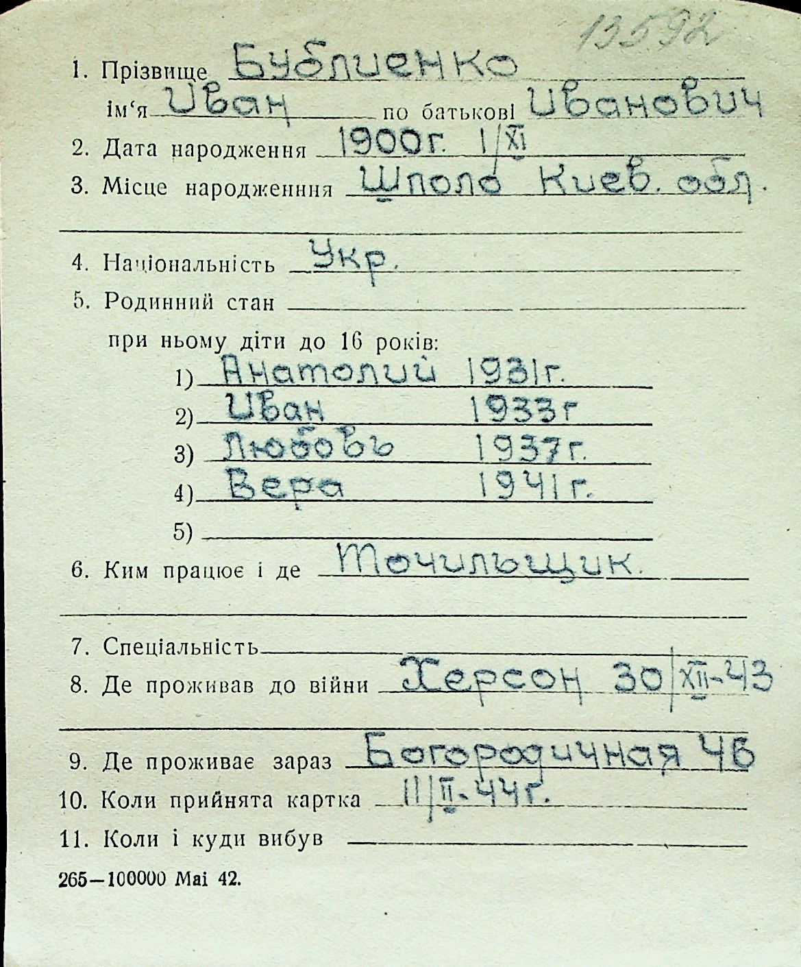 ◦ ◦ Перелік карток на осіб, які мешкали у м. Миколаїв у період окупації 1941–1944 років