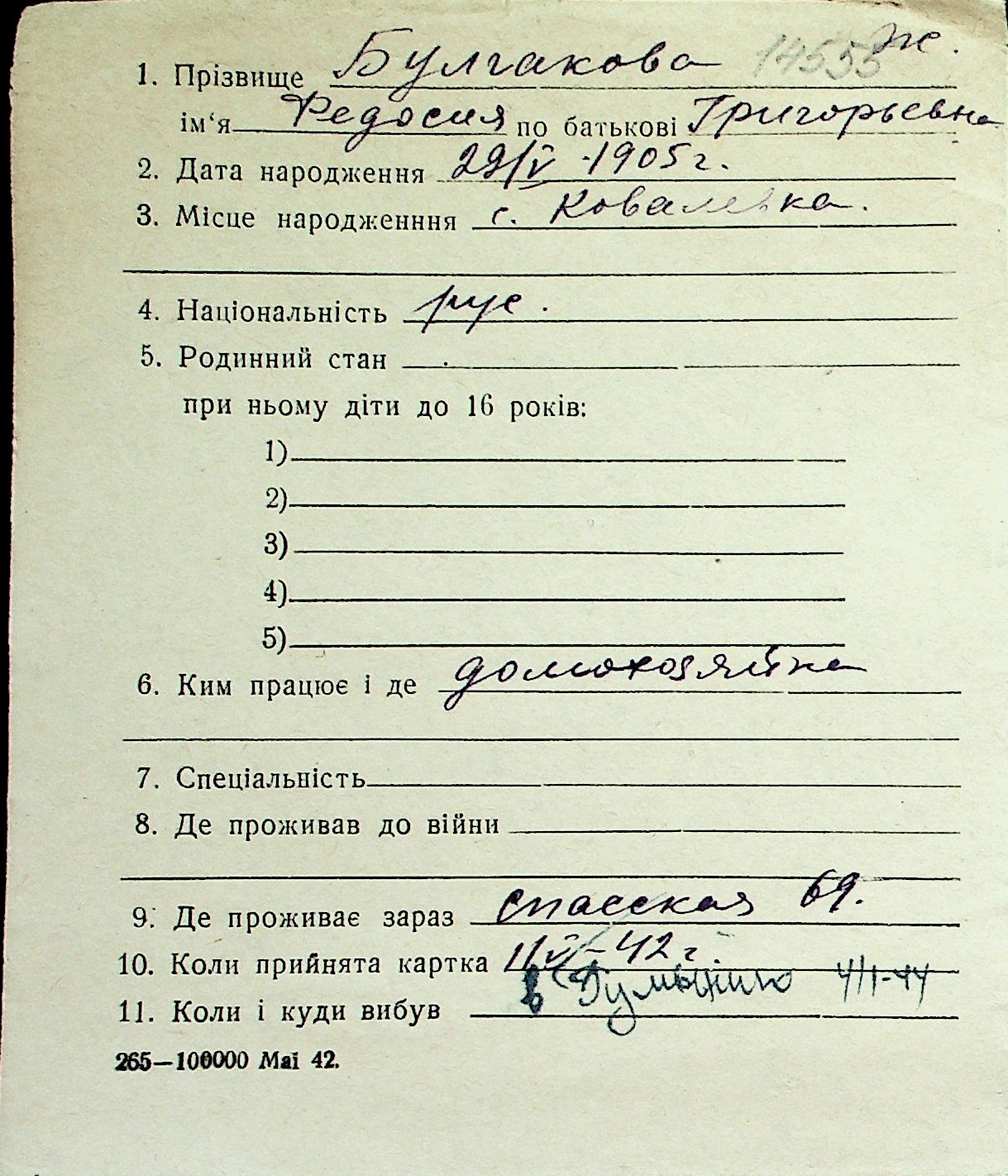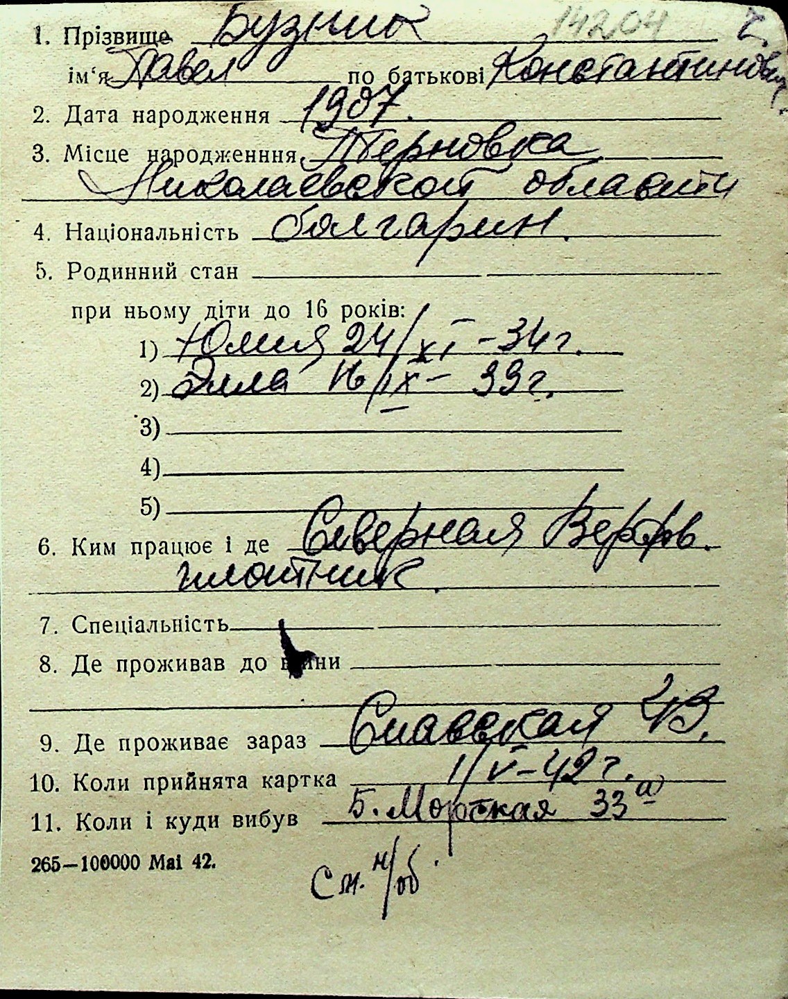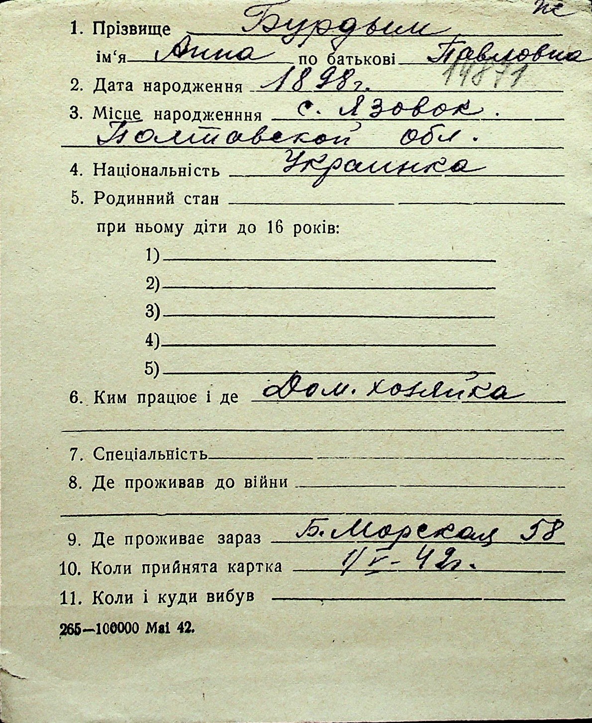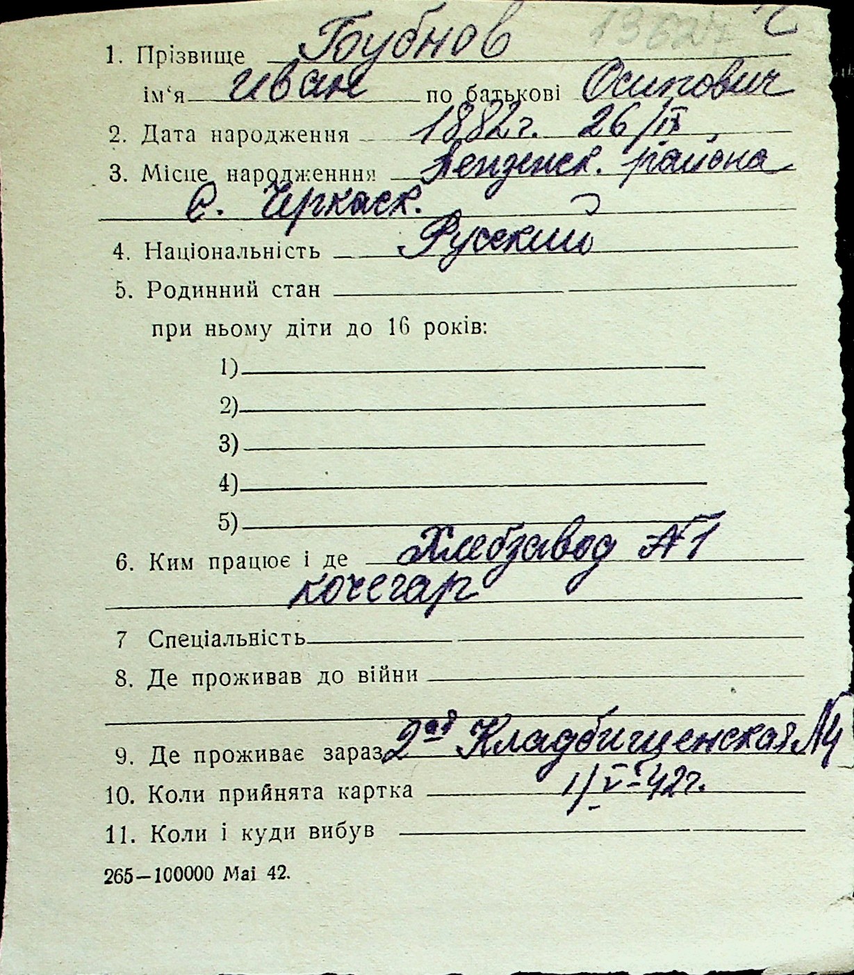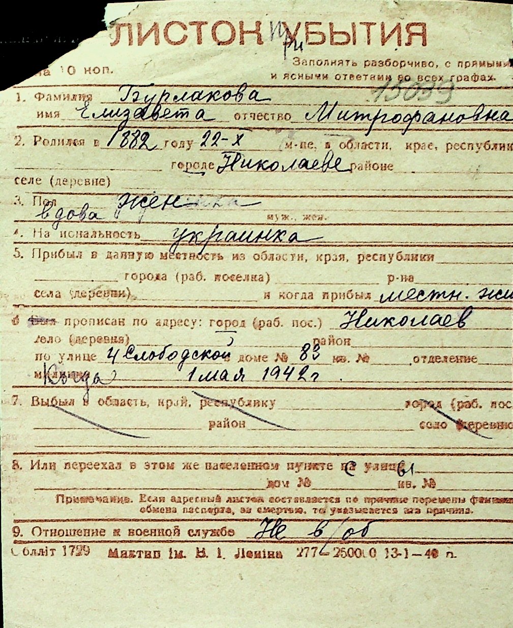 ◦ ◦ Перелік карток на осіб, які мешкали у м. Миколаїв у період окупації 1941–1944 років