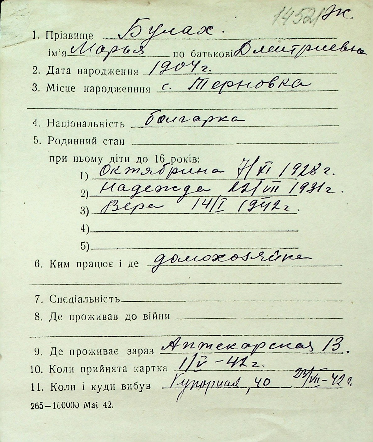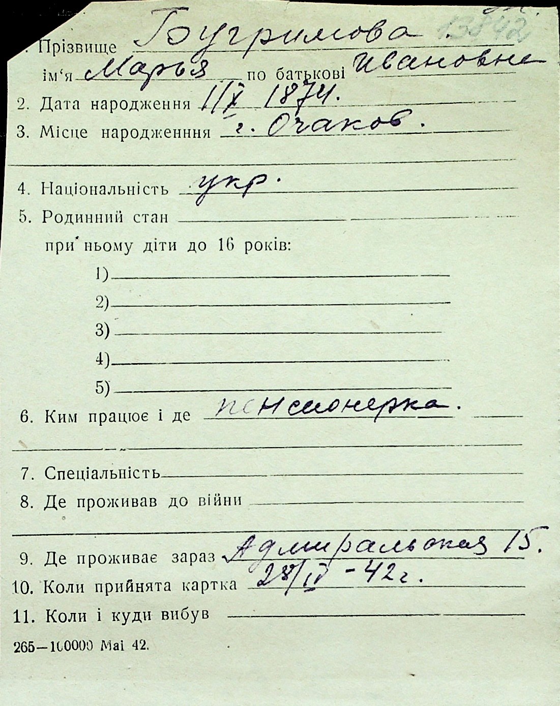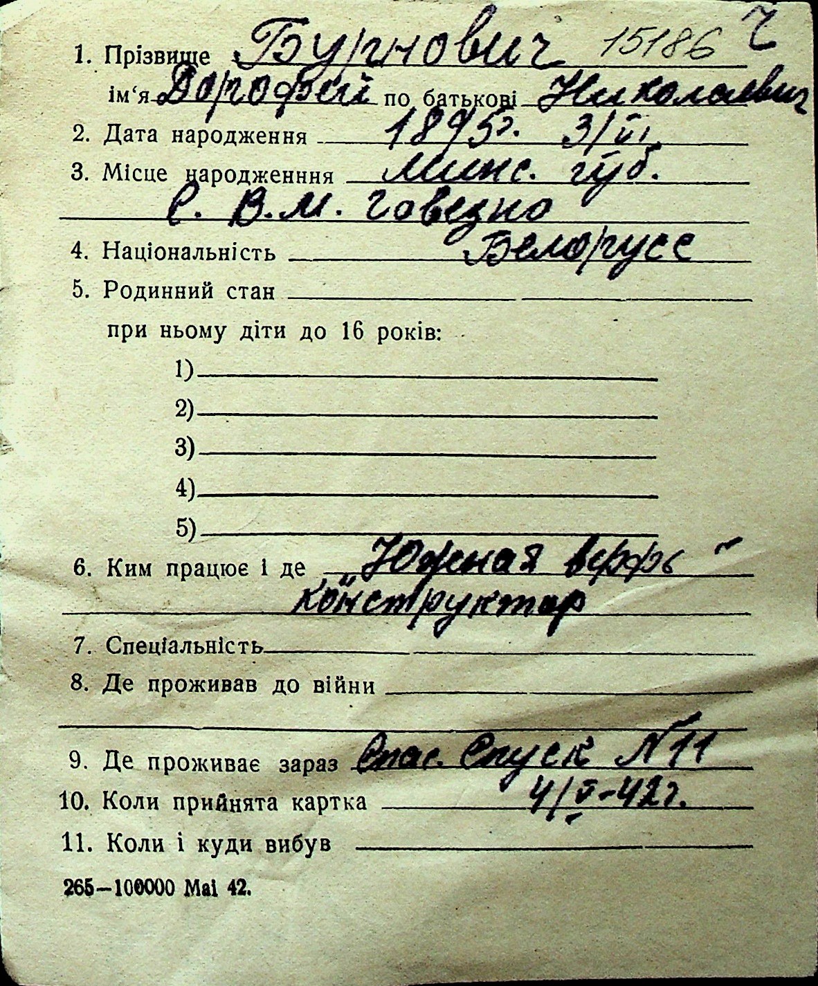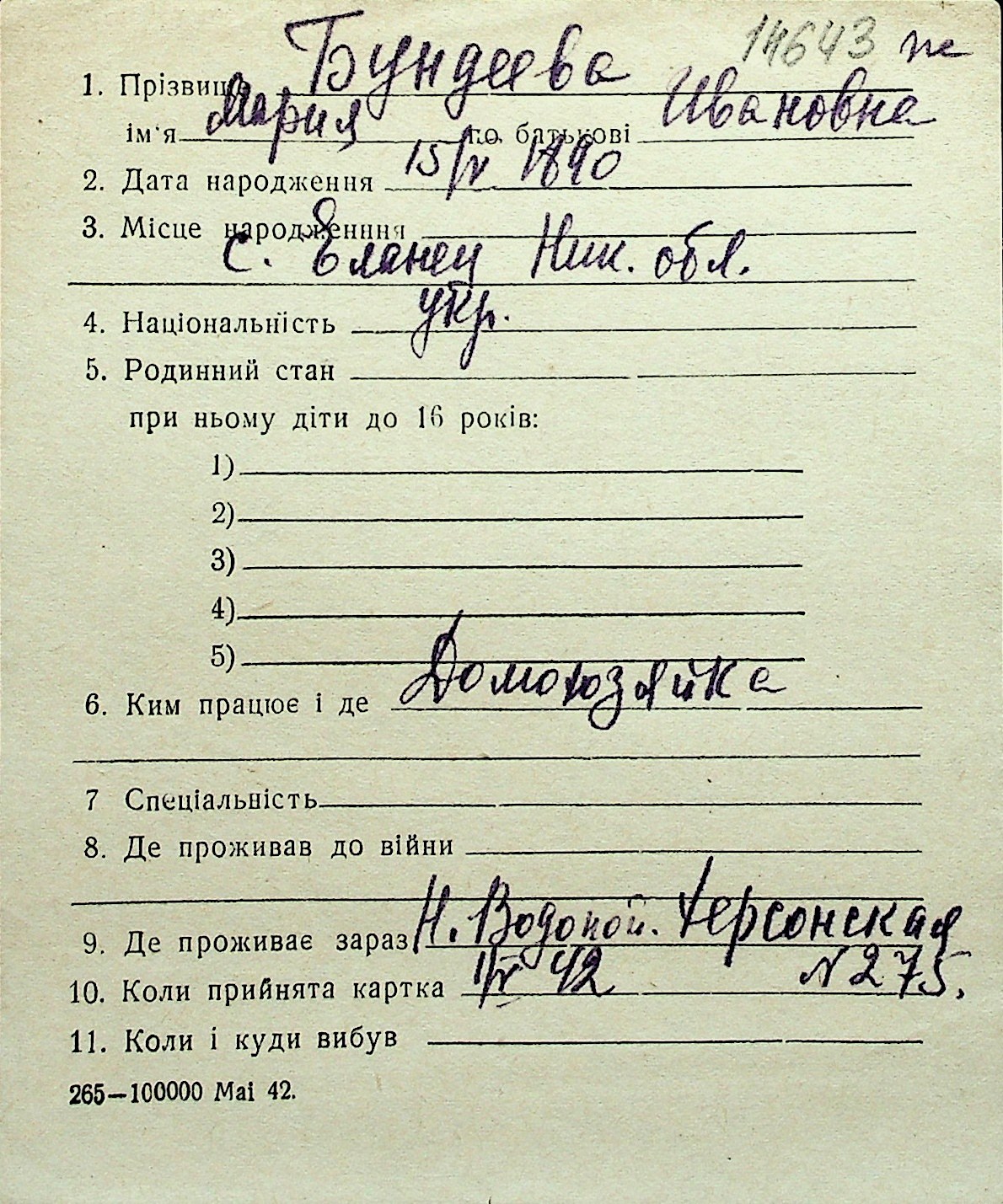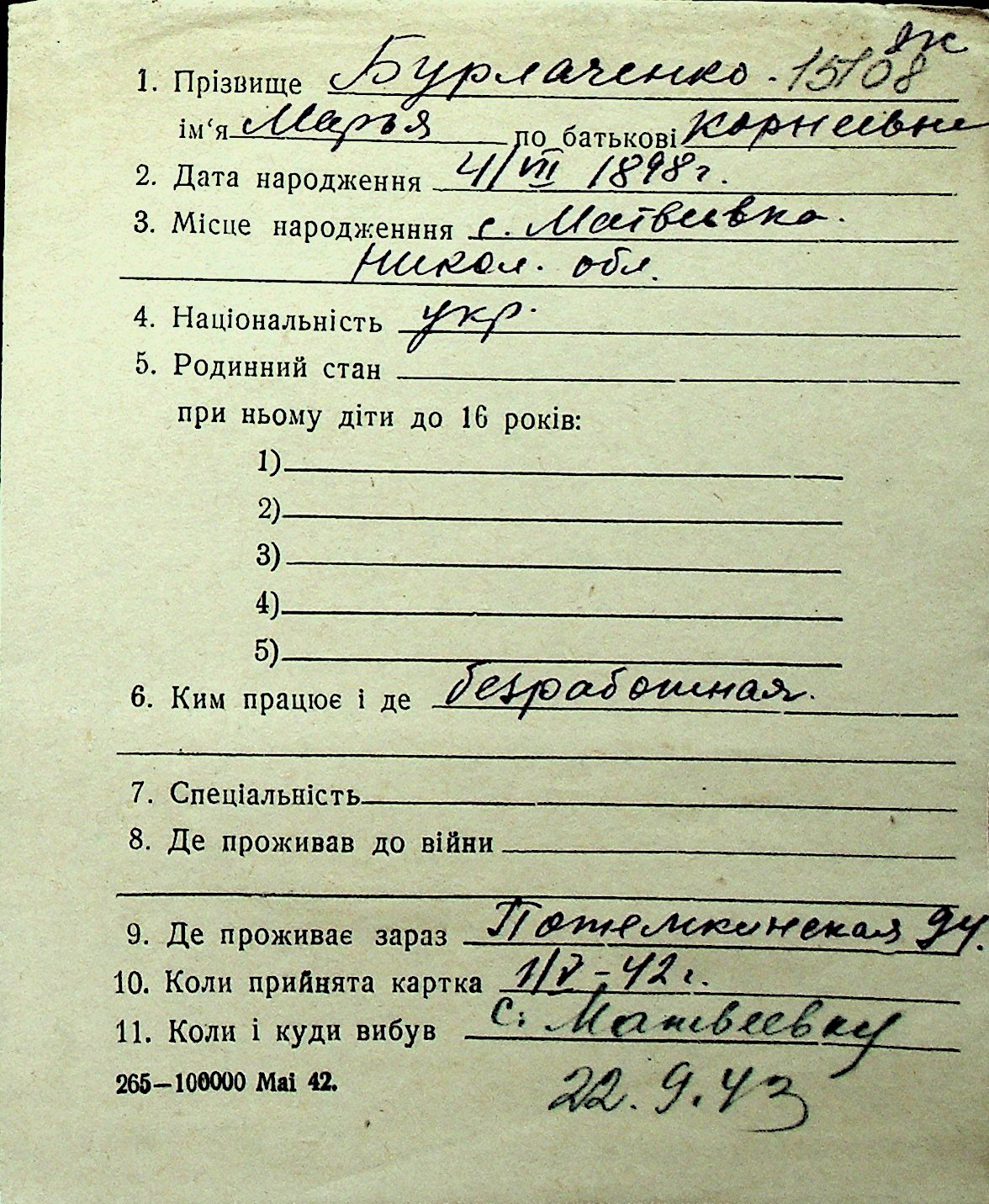 ◦ ◦ Перелік карток на осіб, які мешкали у м. Миколаїв у період окупації 1941–1944 років
