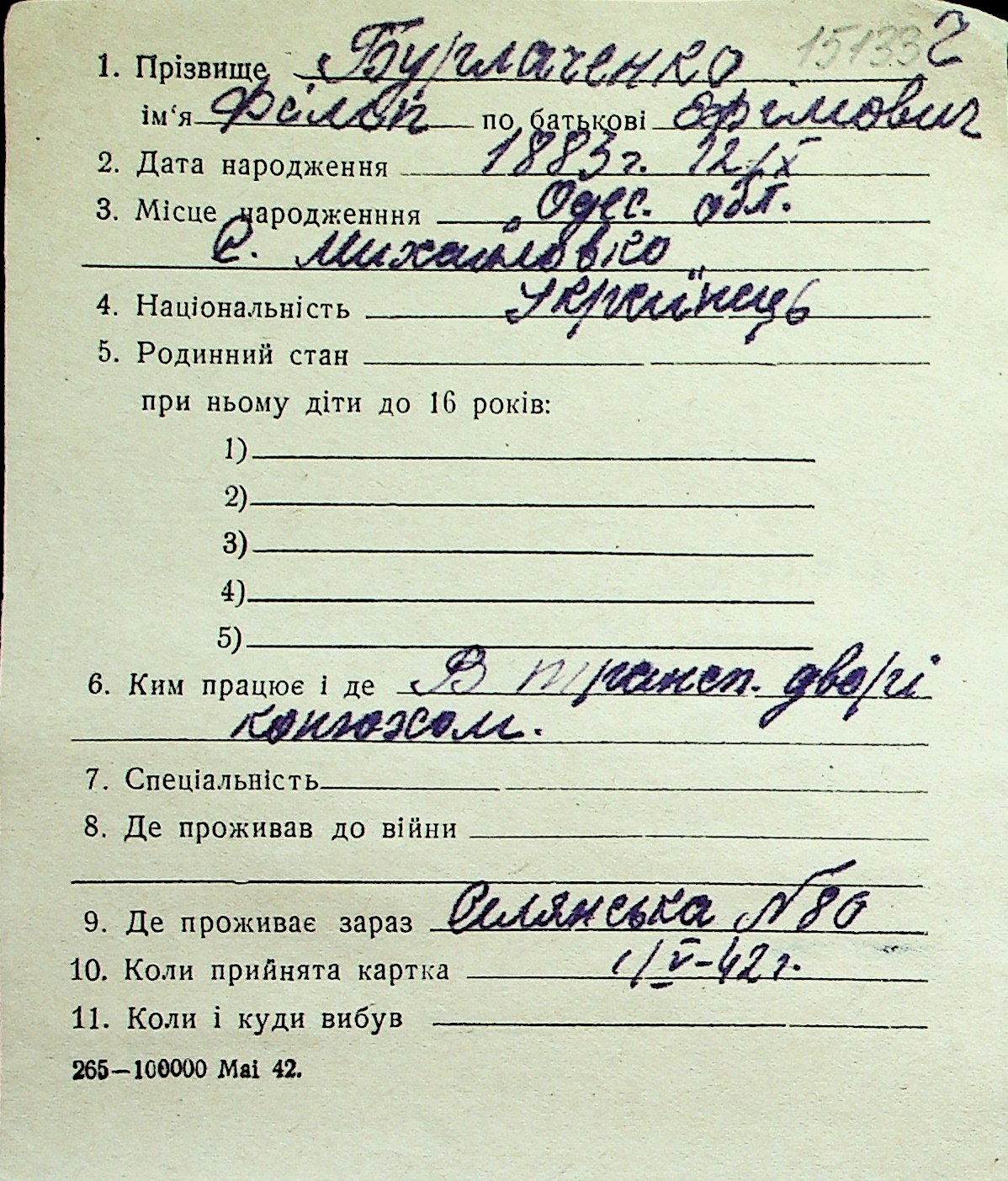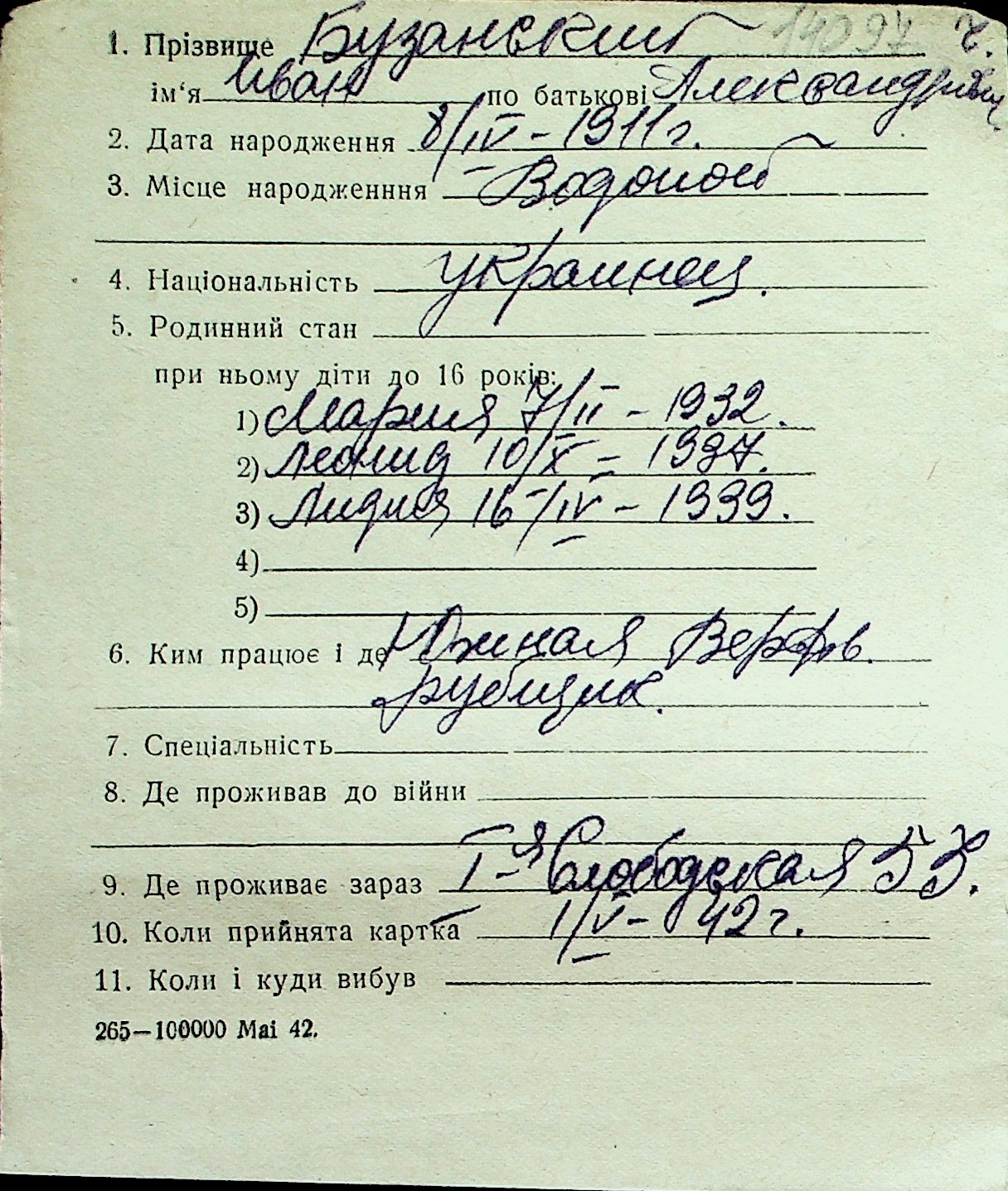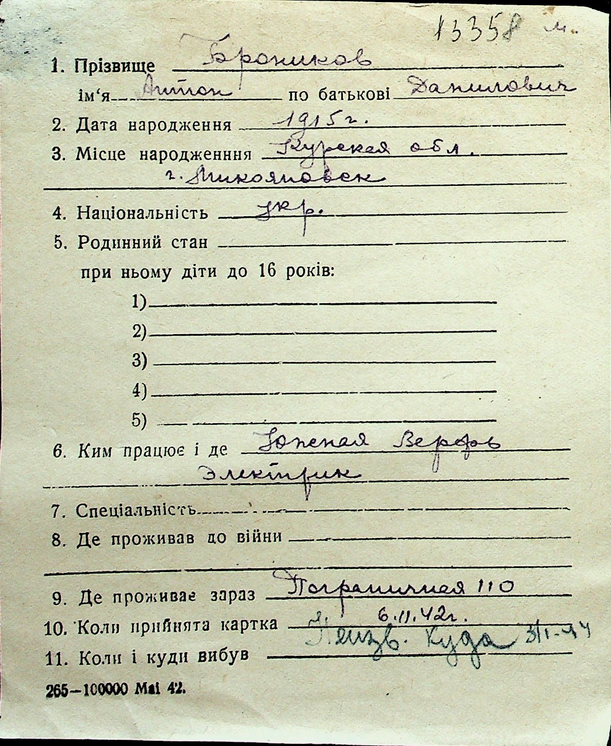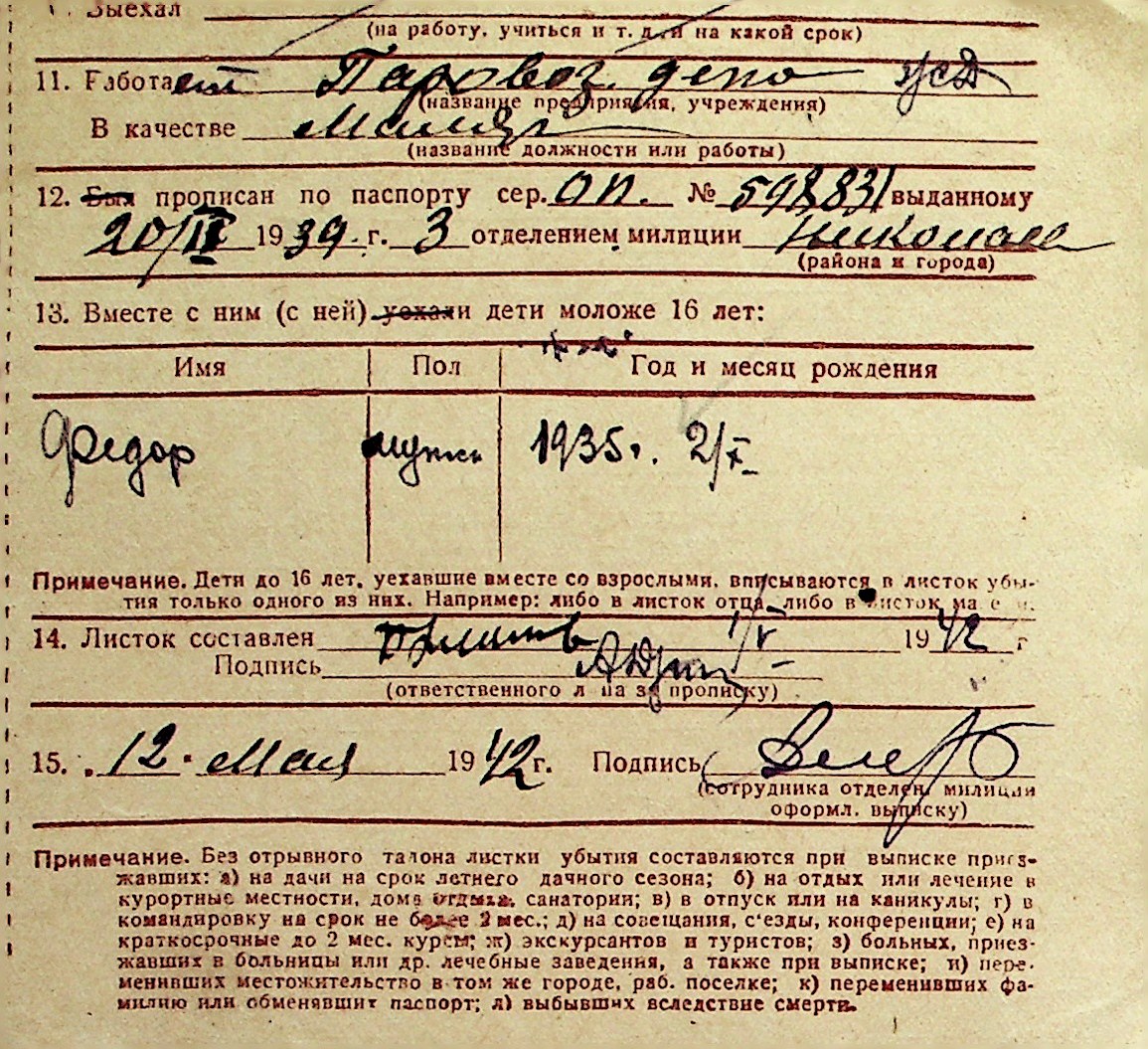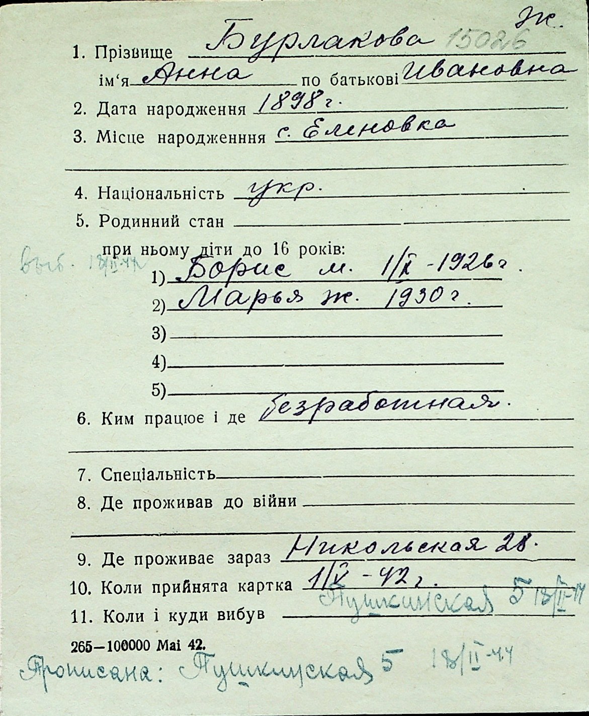 ◦ ◦ Перелік карток на осіб, які мешкали у м. Миколаїв у період окупації 1941–1944 років
