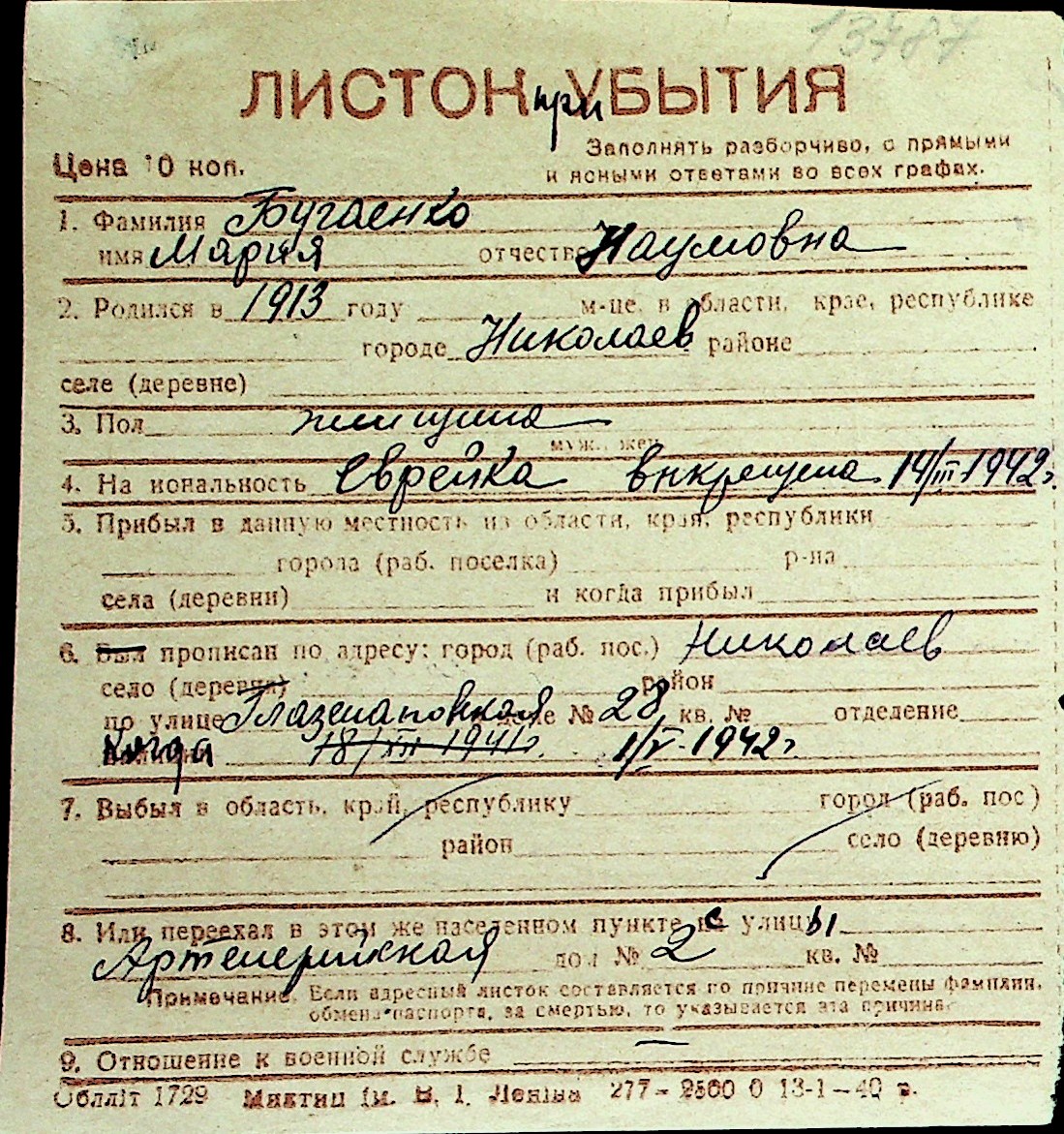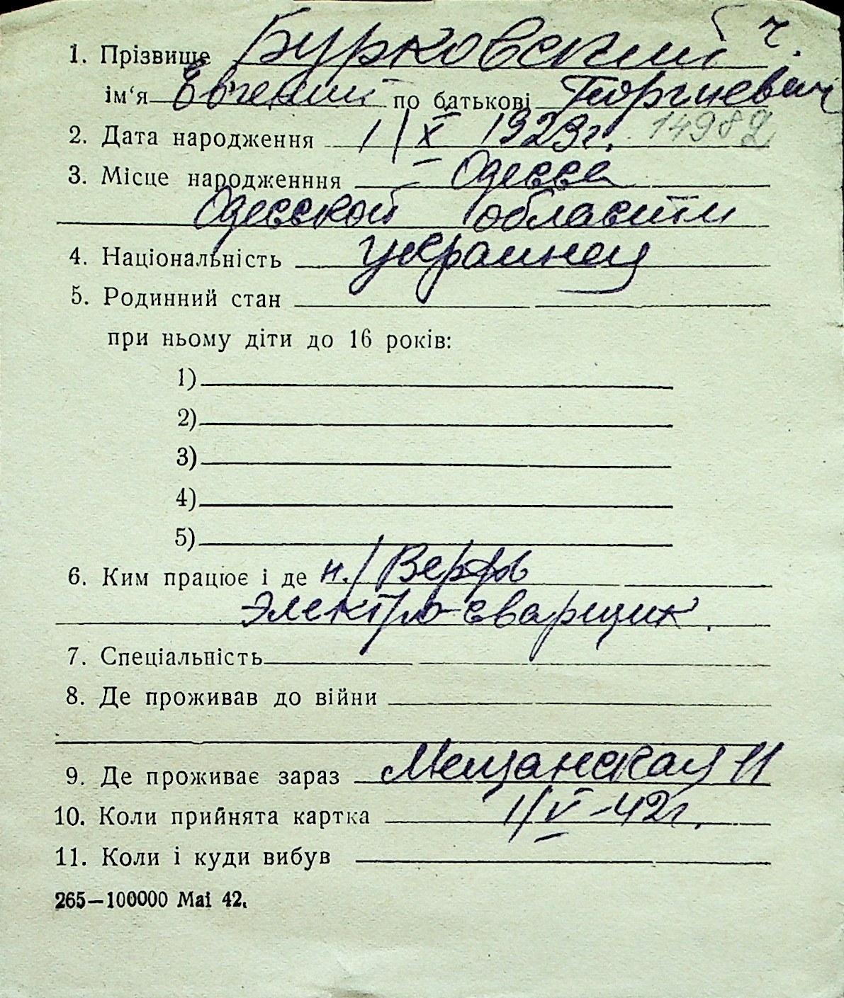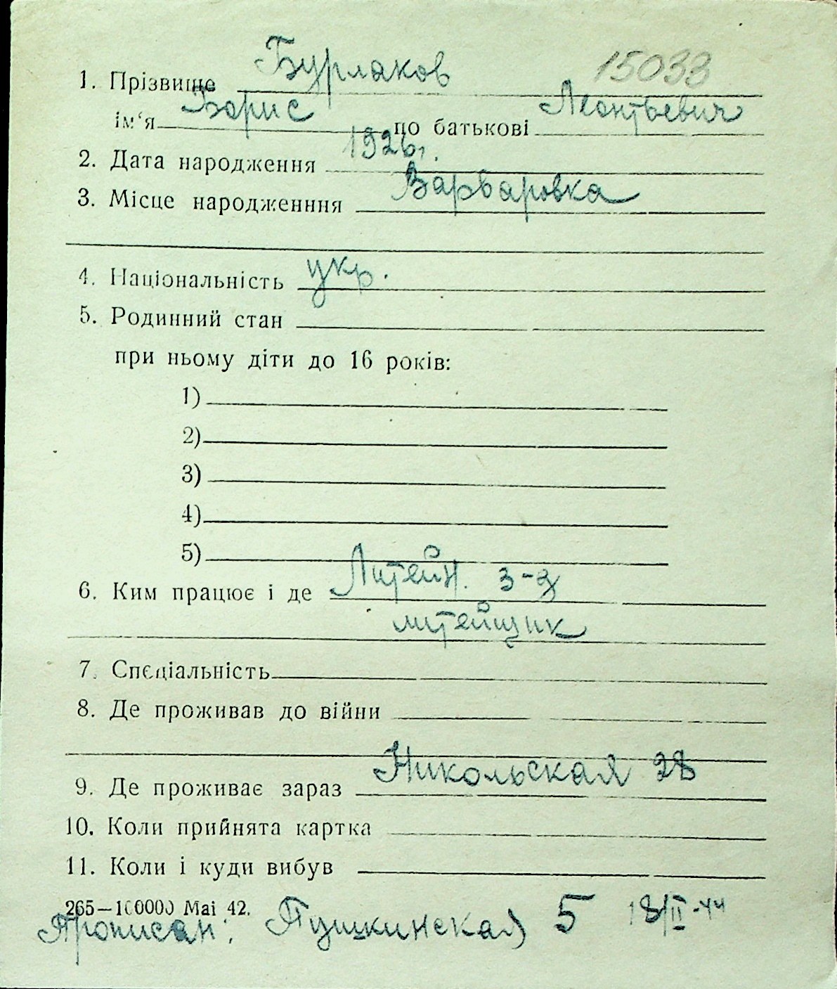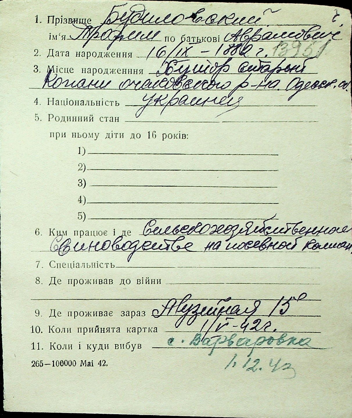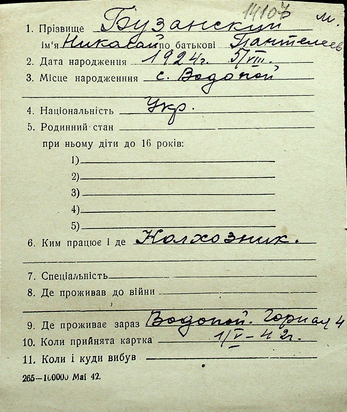 ◦ ◦ Перелік карток на осіб, які мешкали у м. Миколаїв у період окупації 1941–1944 років