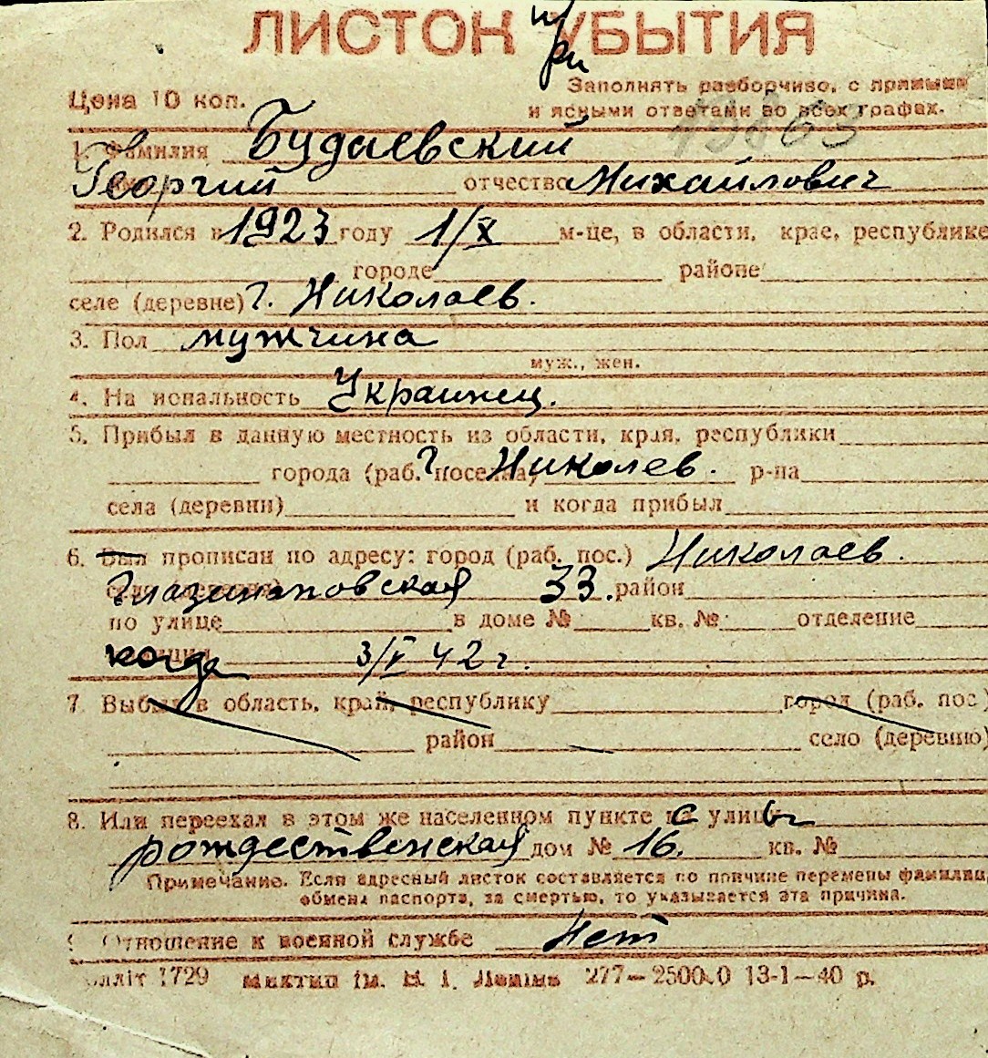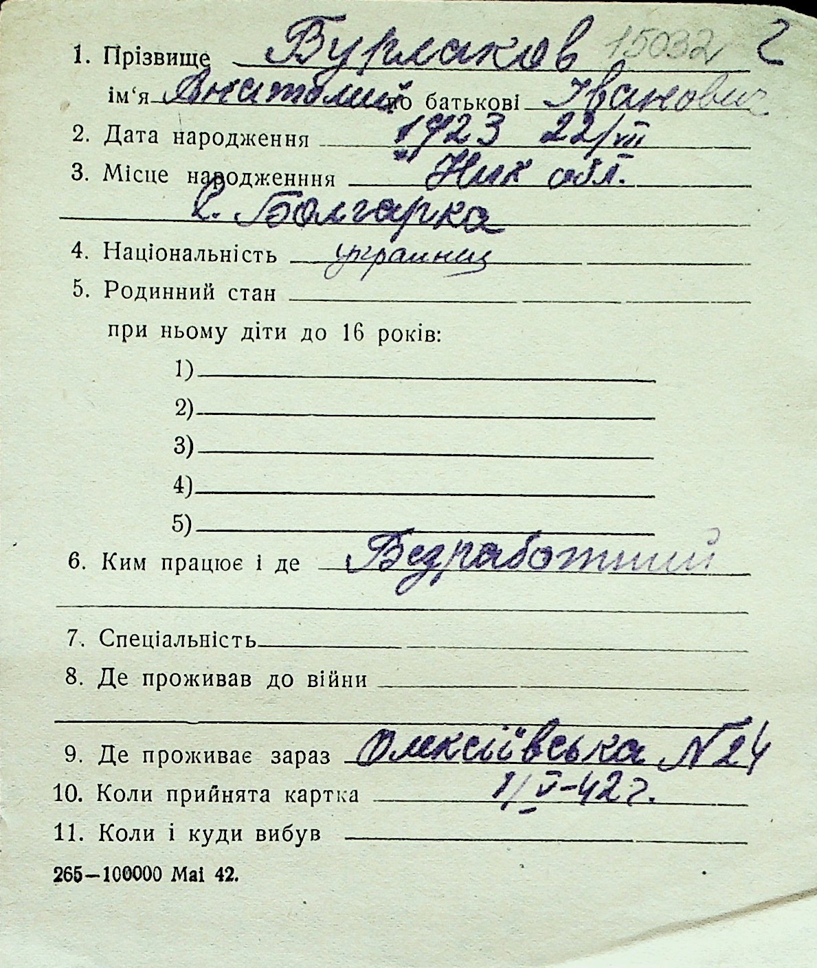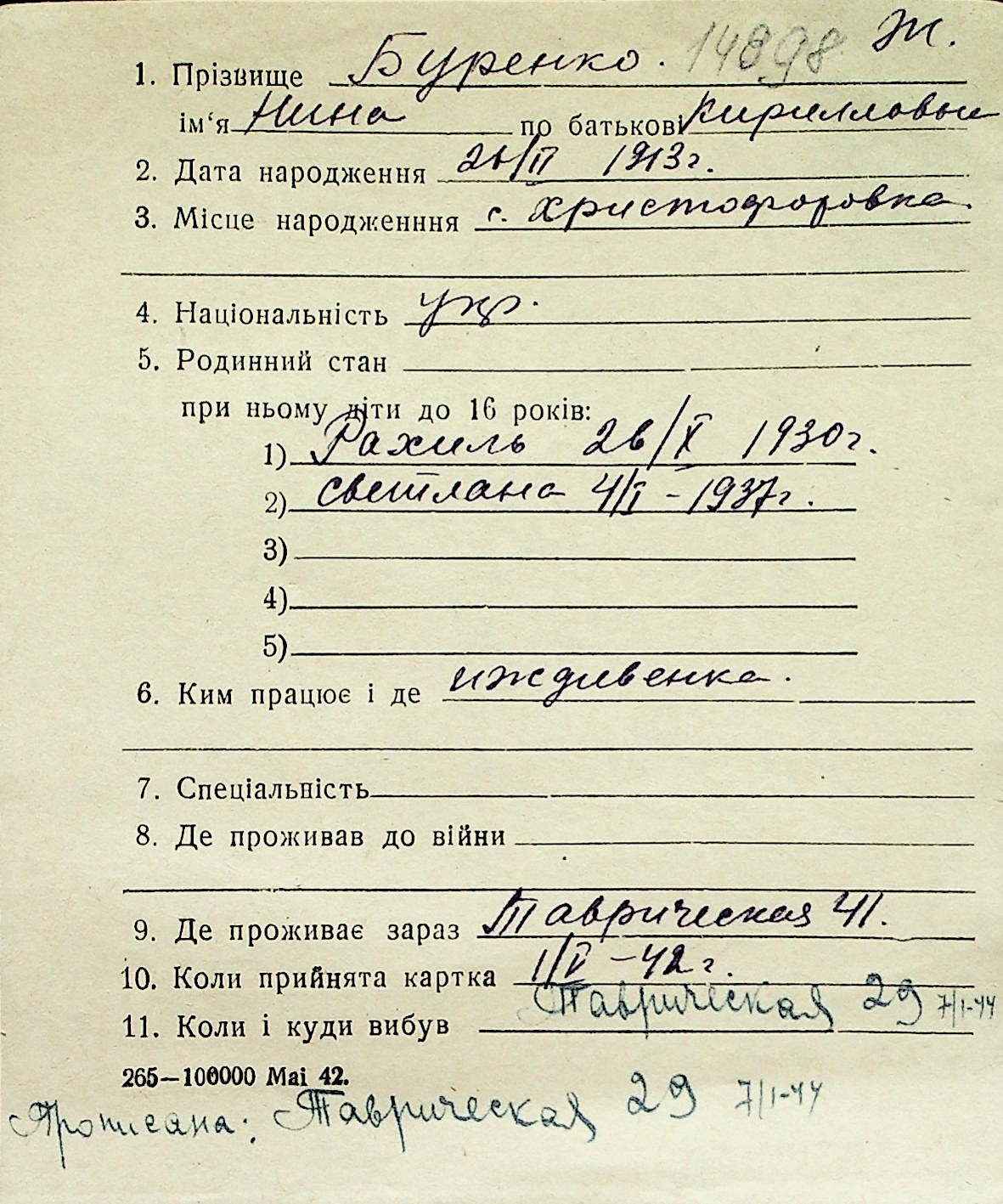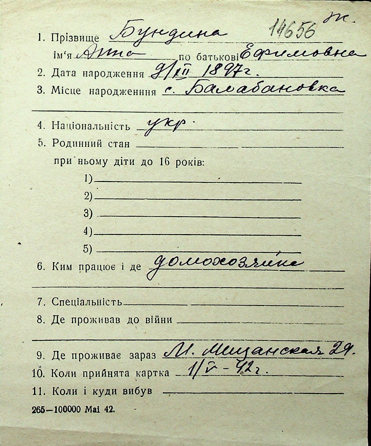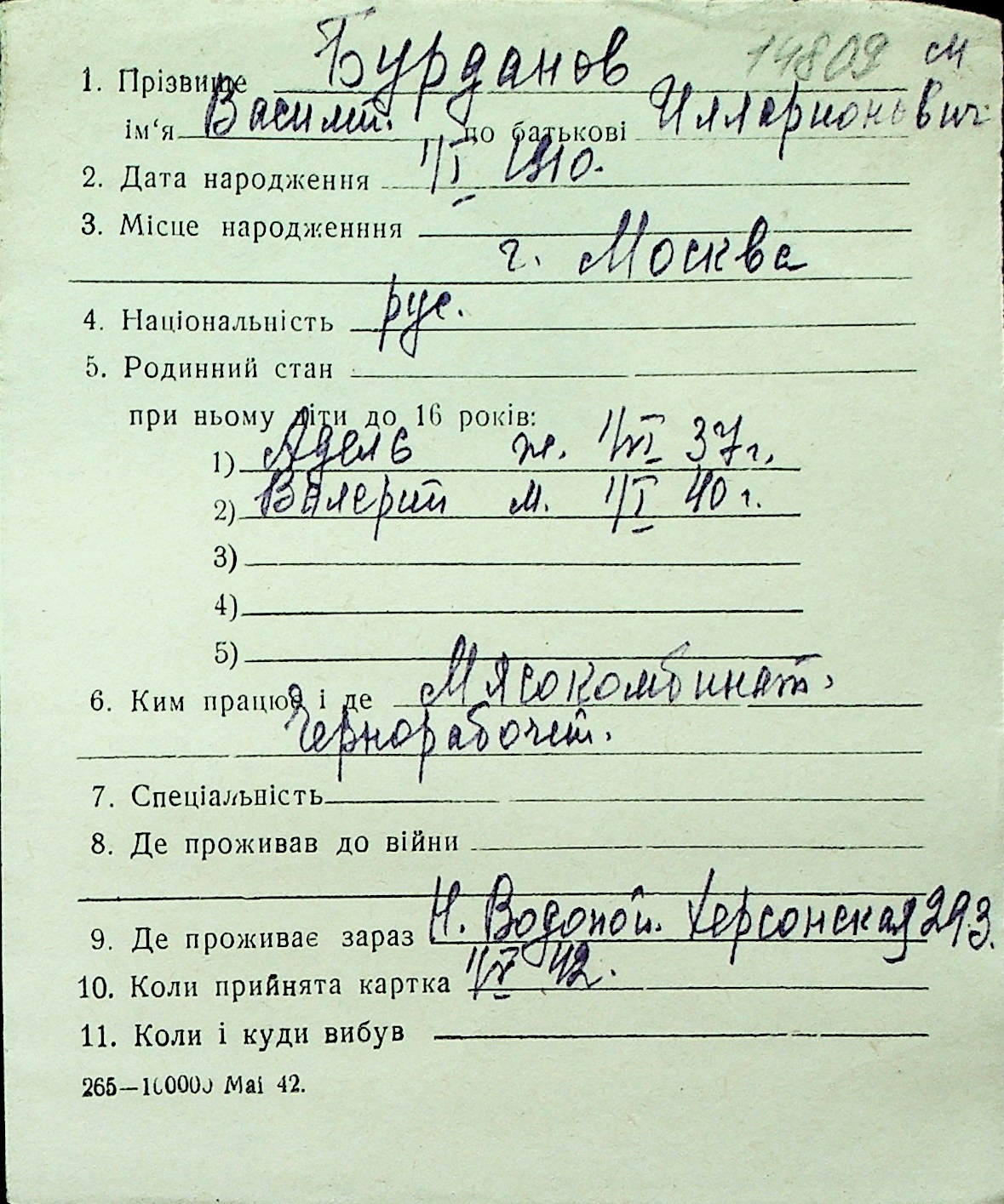 ◦ ◦ Перелік карток на осіб, які мешкали у м. Миколаїв у період окупації 1941–1944 років