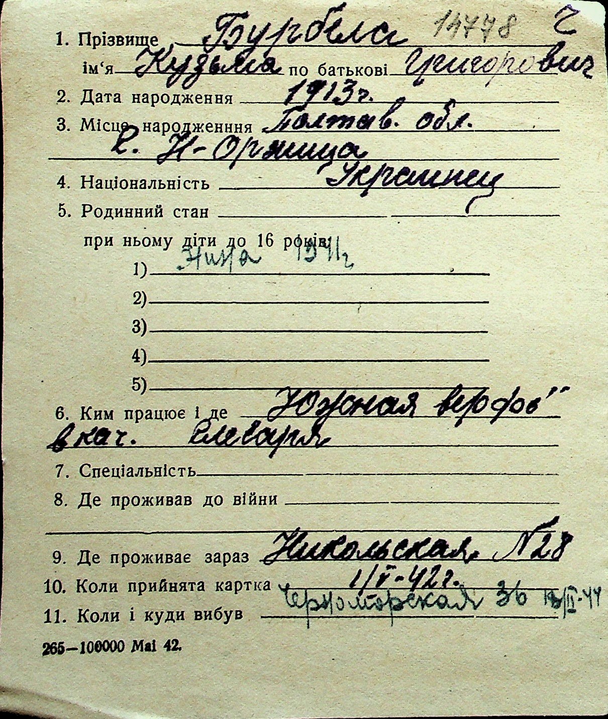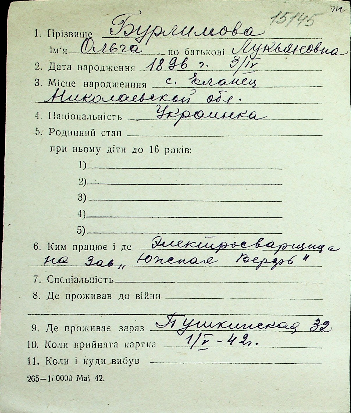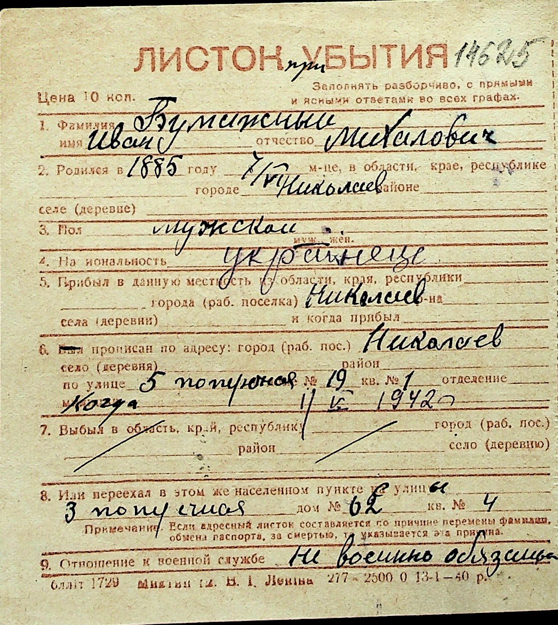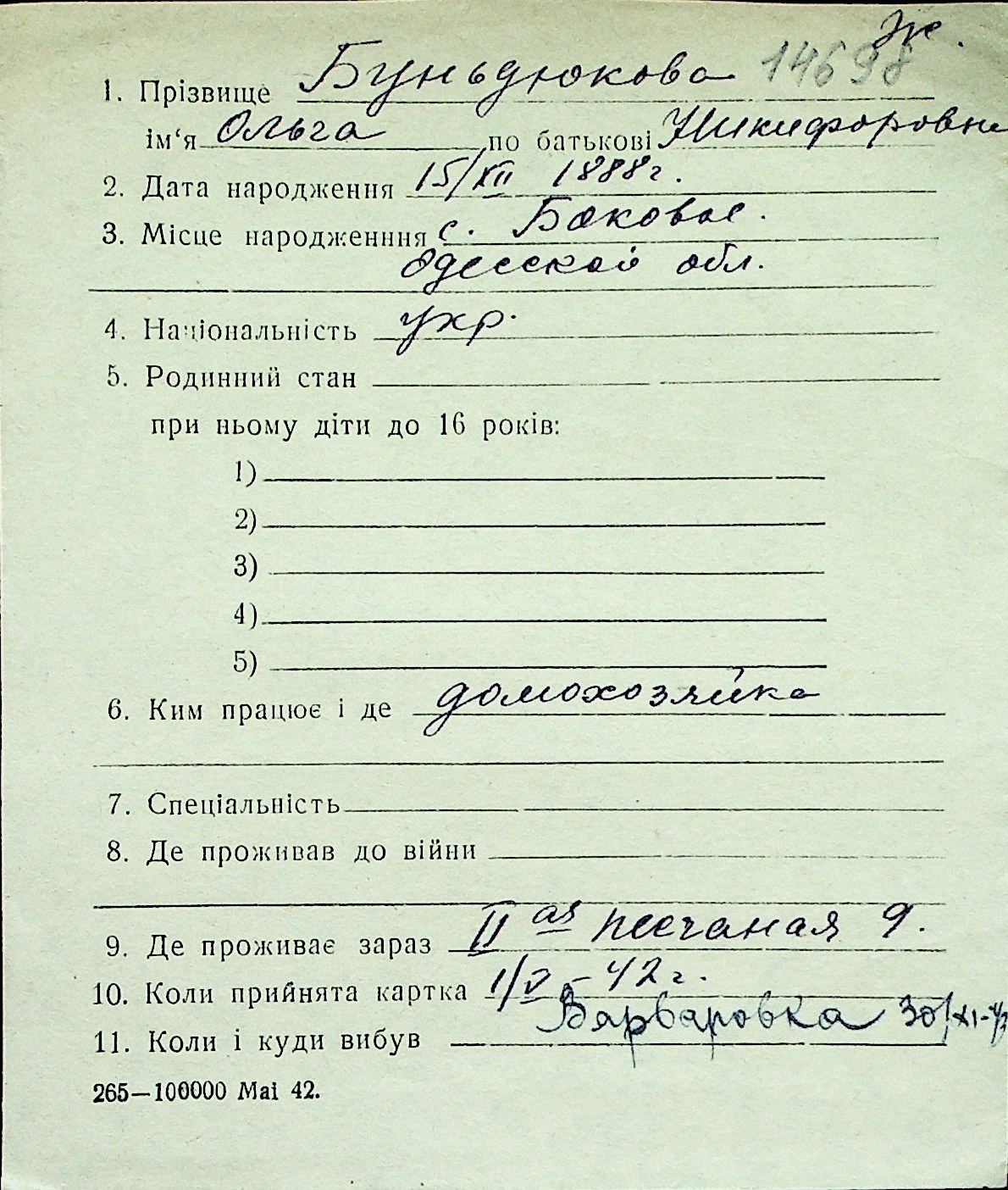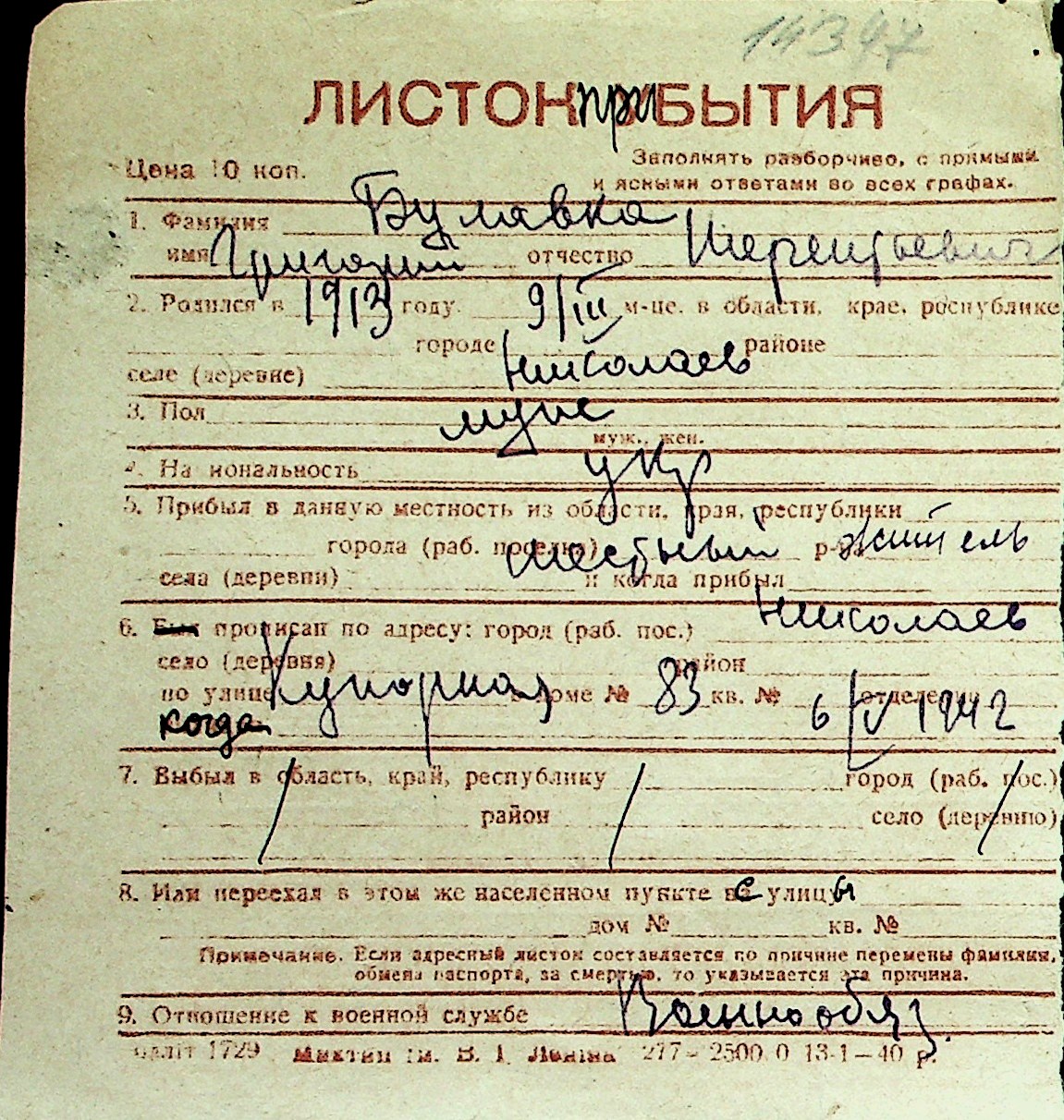 ◦ ◦ Перелік карток на осіб, які мешкали у м. Миколаїв у період окупації 1941–1944 років