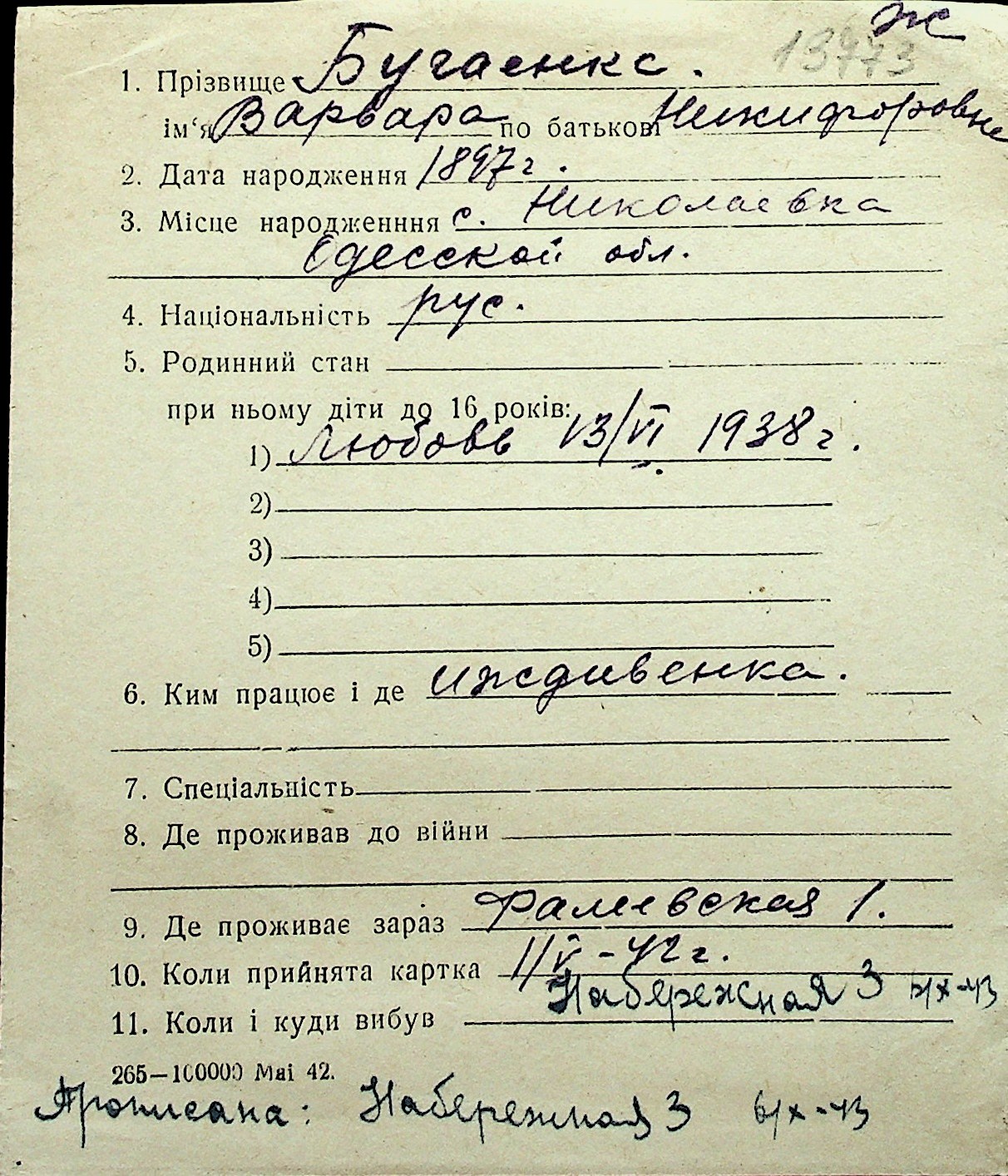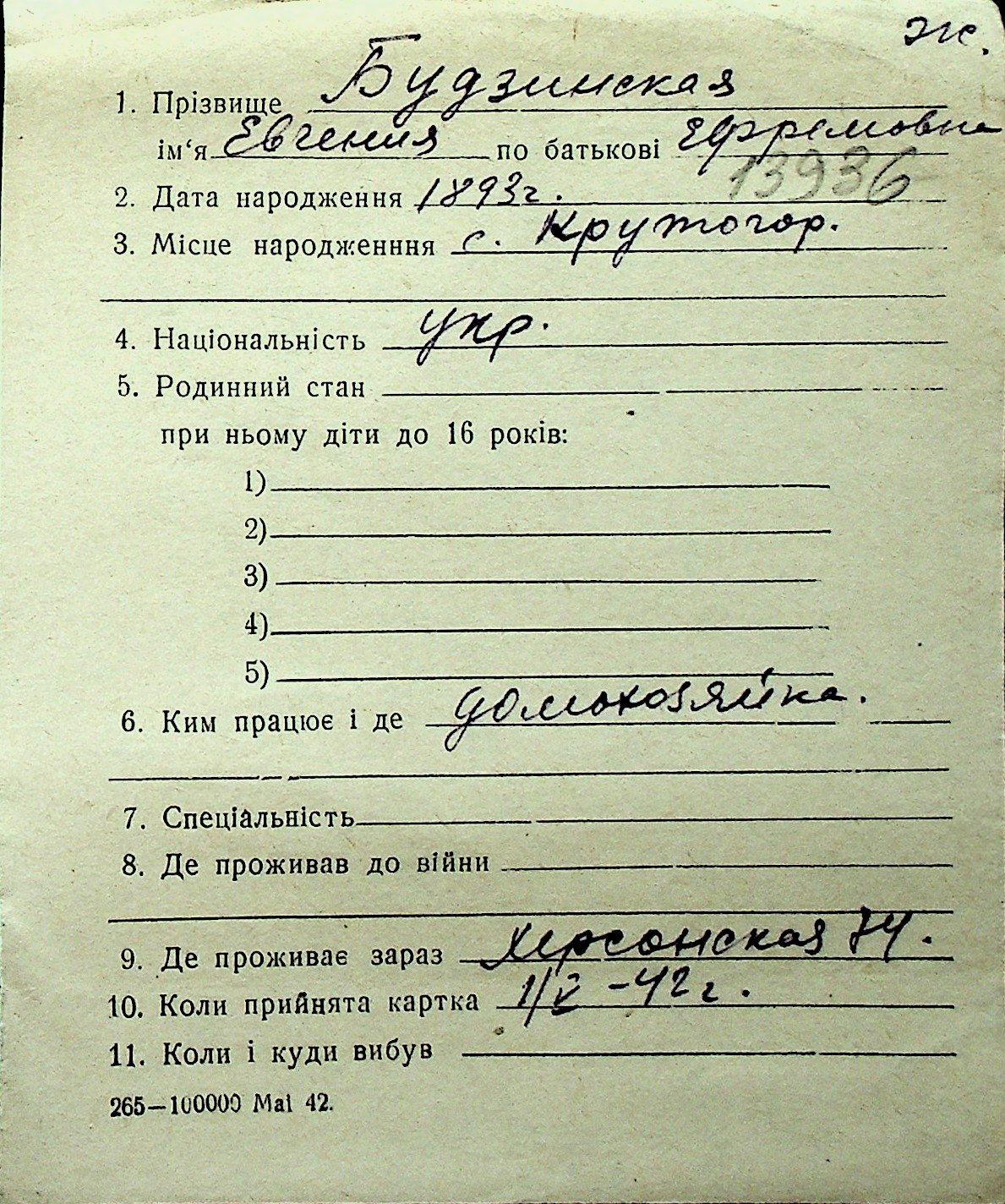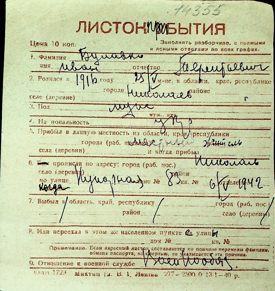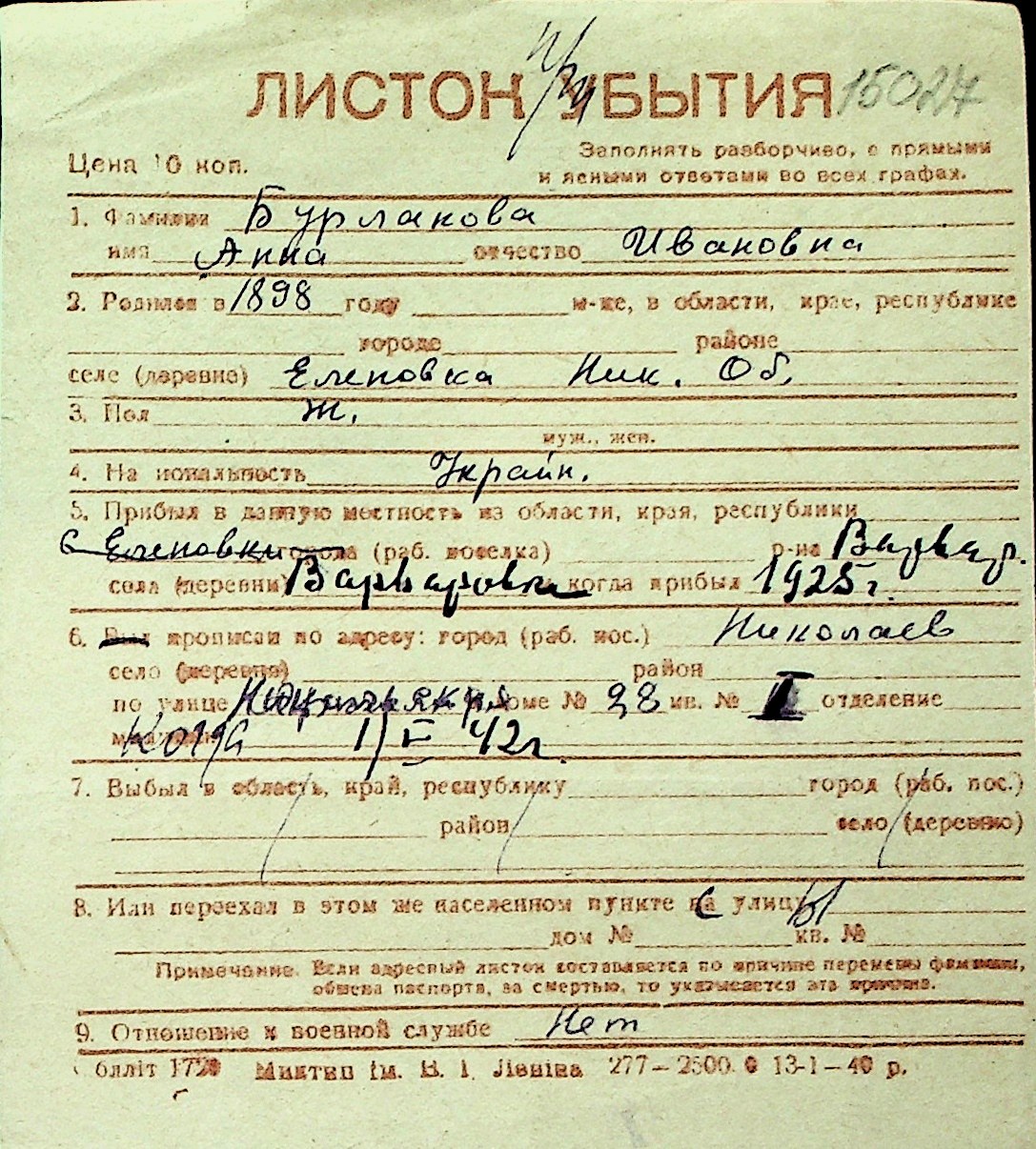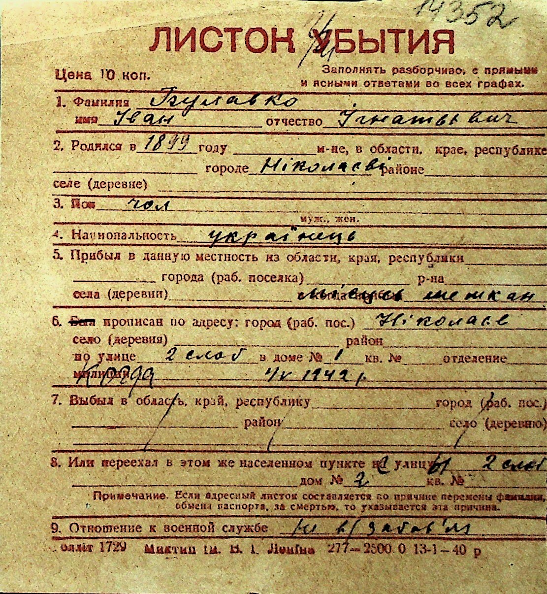 ◦ ◦ Перелік карток на осіб, які мешкали у м. Миколаїв у період окупації 1941–1944 років