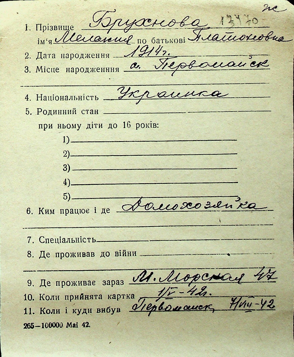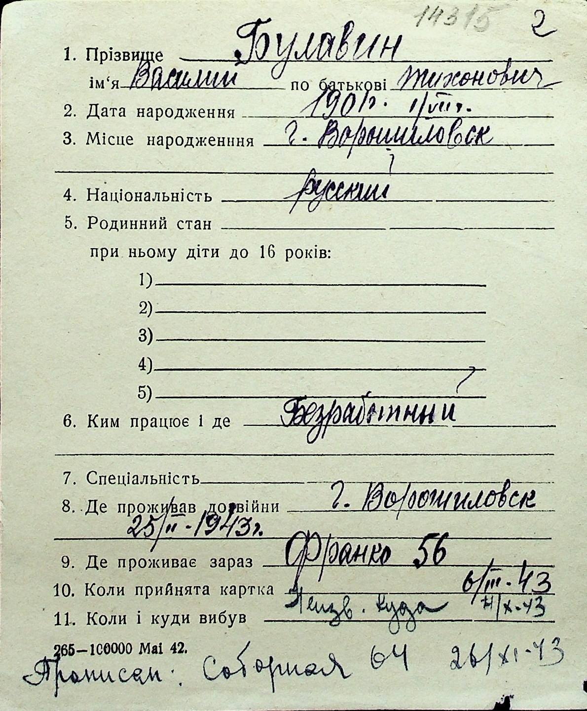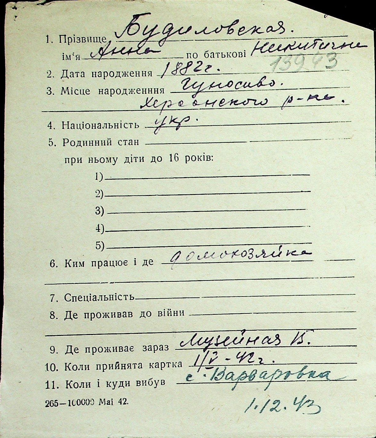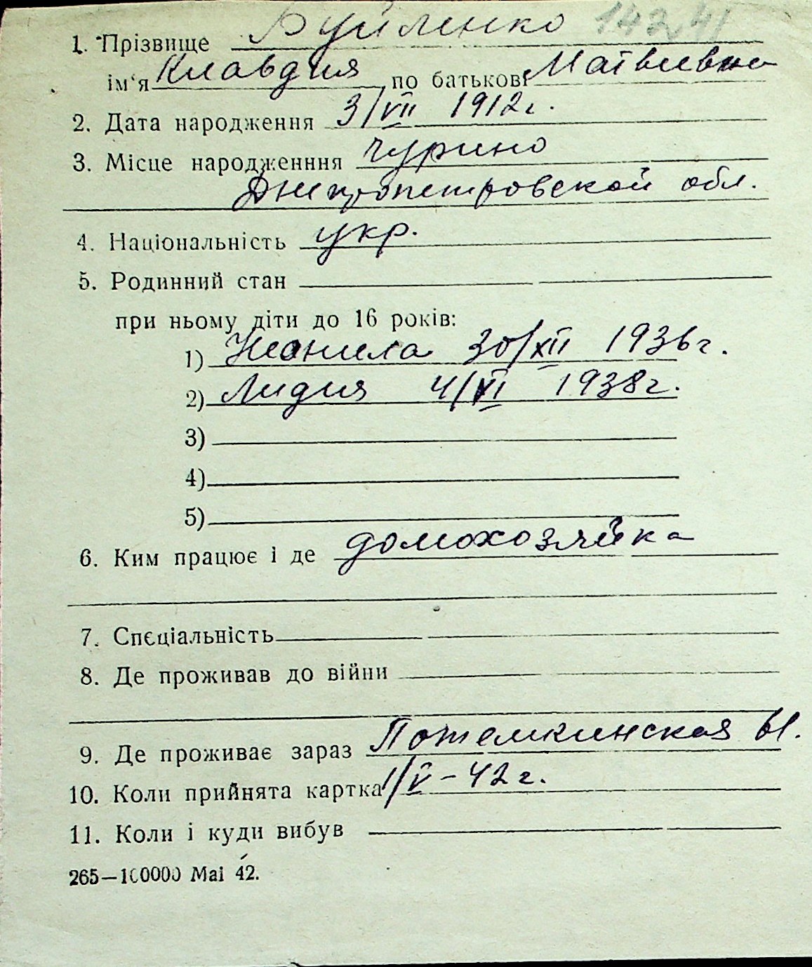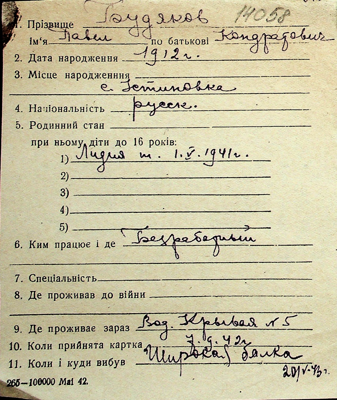 ◦ ◦ Перелік карток на осіб, які мешкали у м. Миколаїв у період окупації 1941–1944 років
