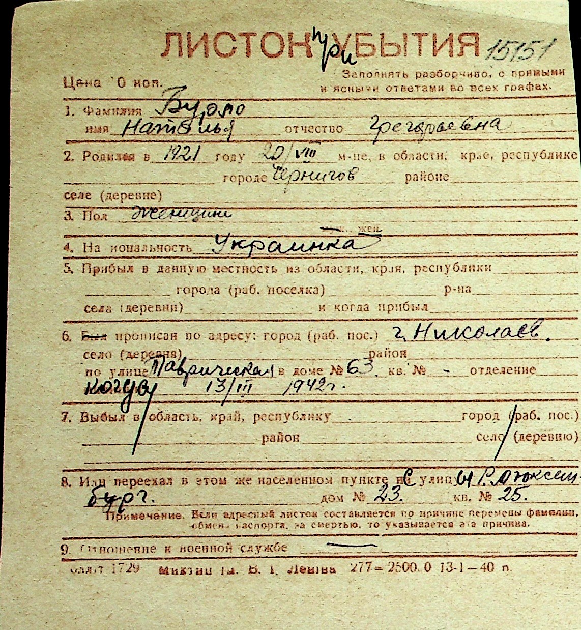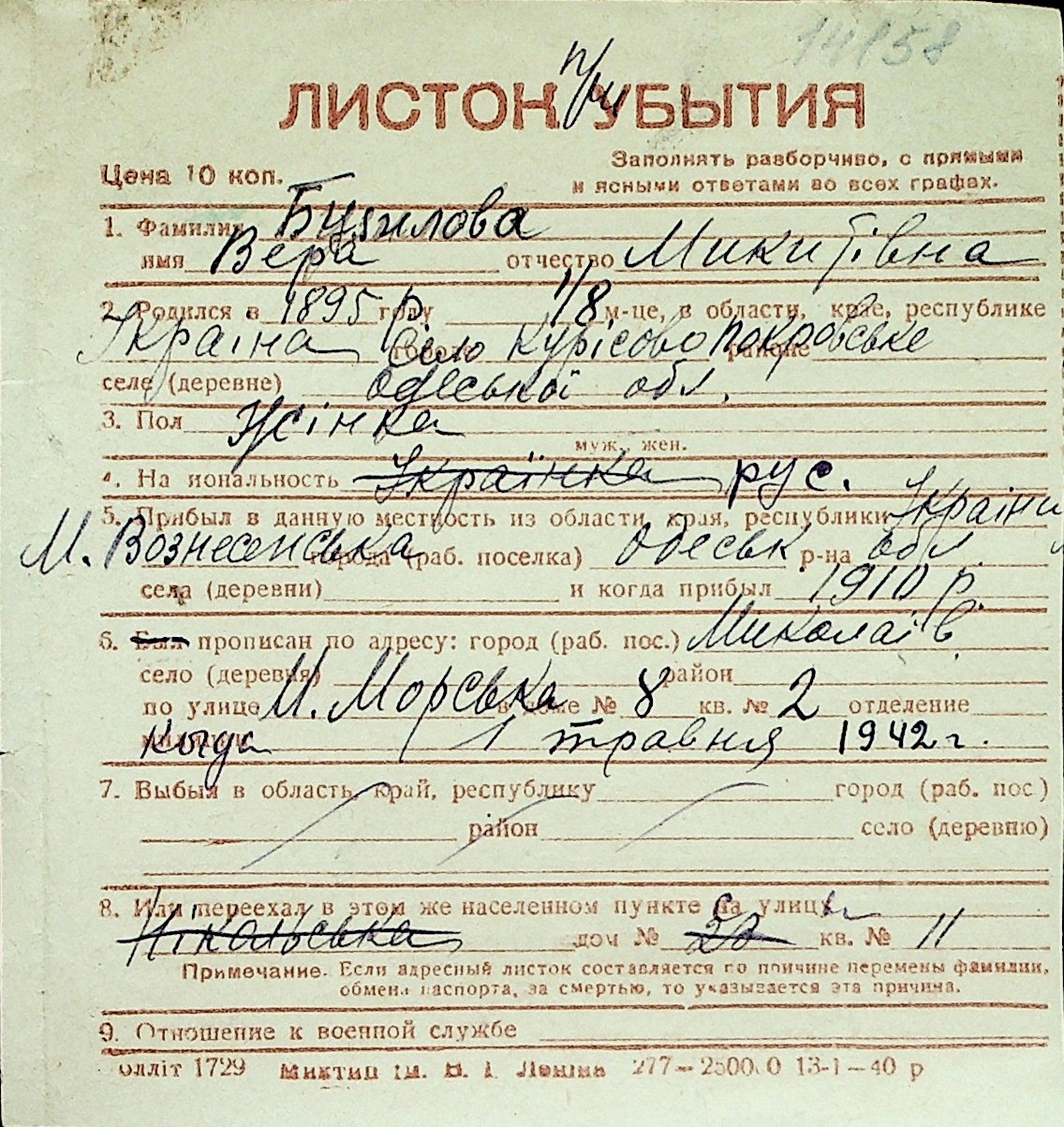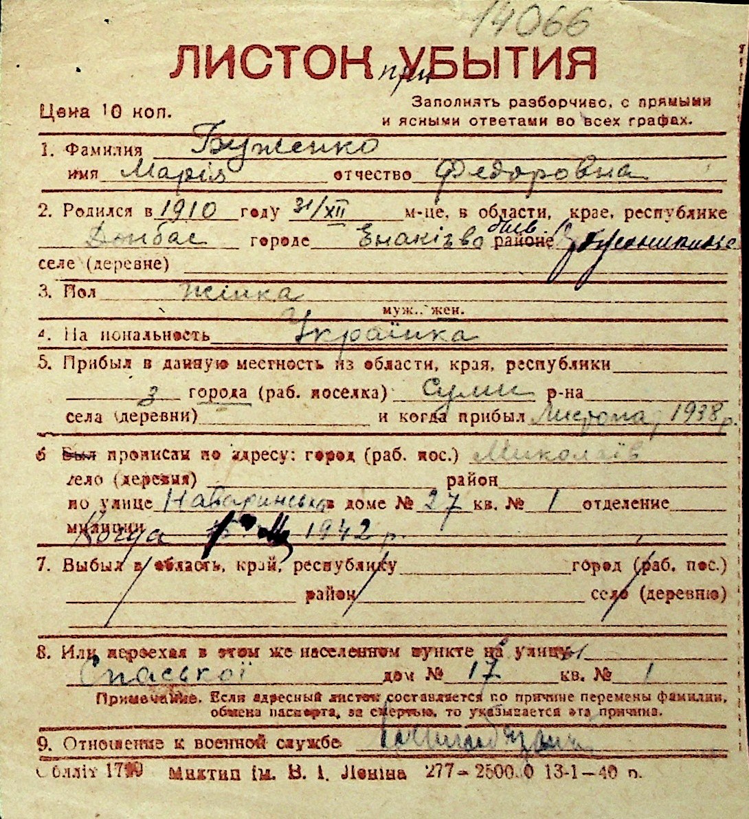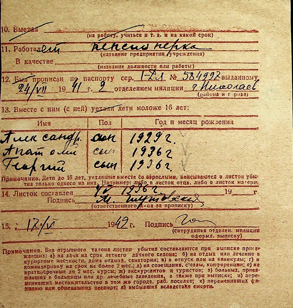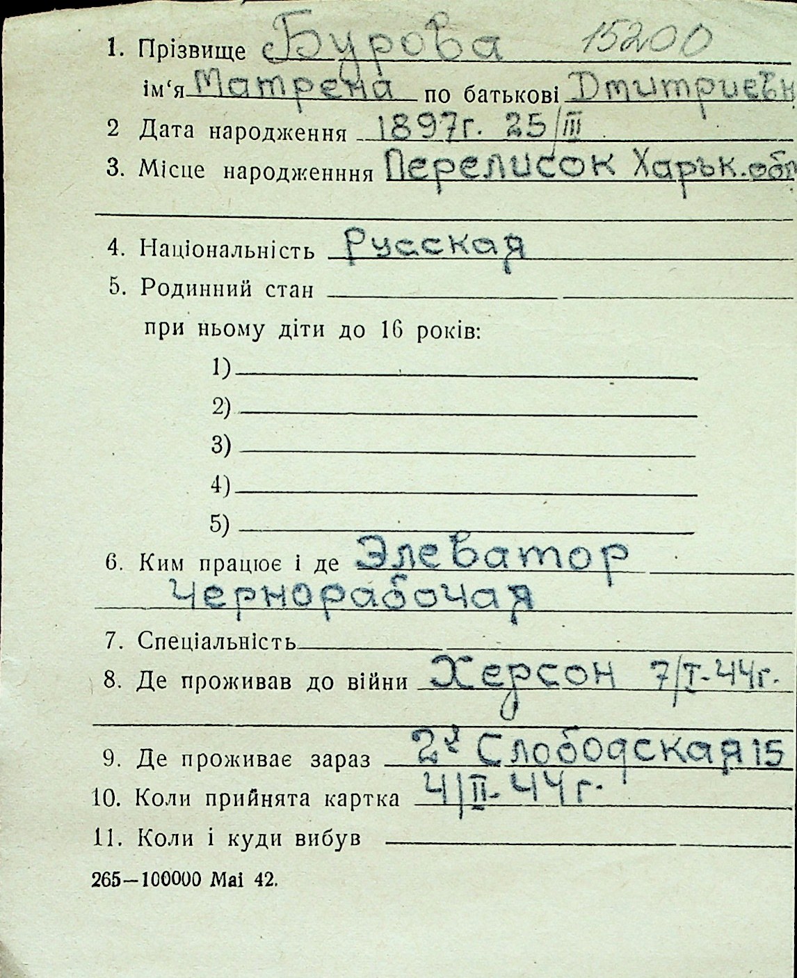 ◦ ◦ Перелік карток на осіб, які мешкали у м. Миколаїв у період окупації 1941–1944 років