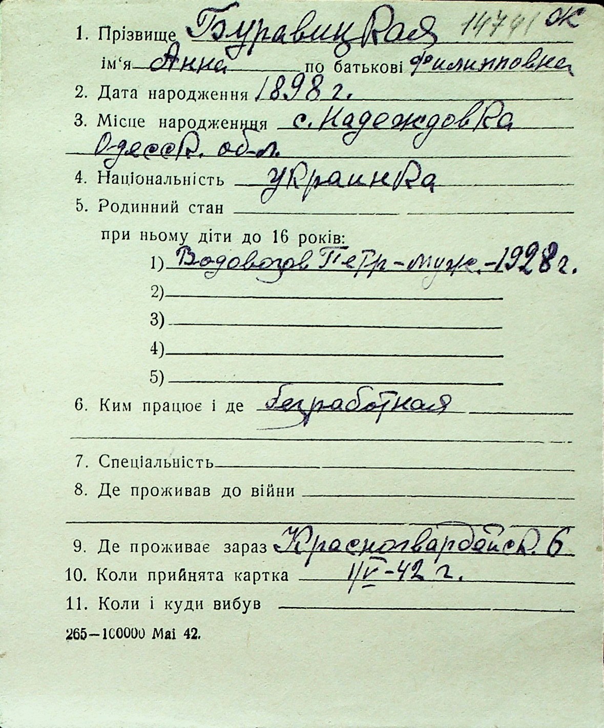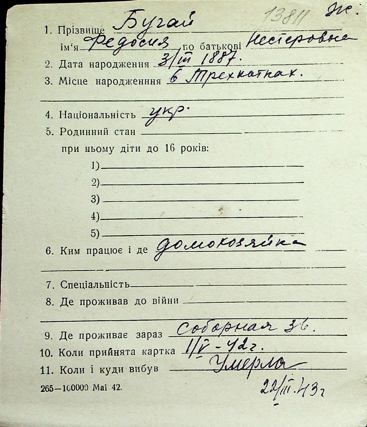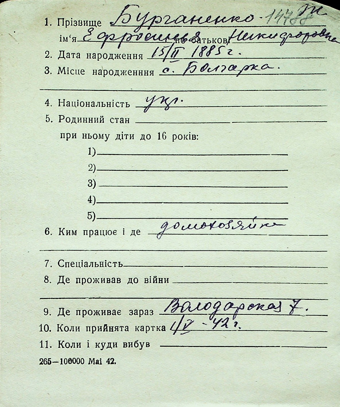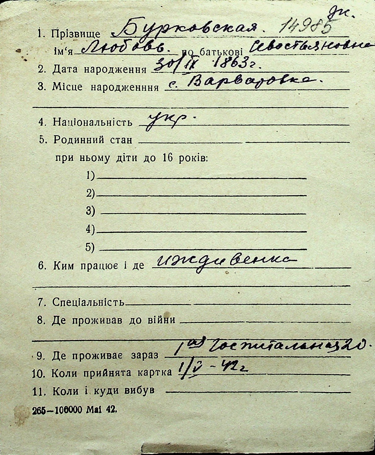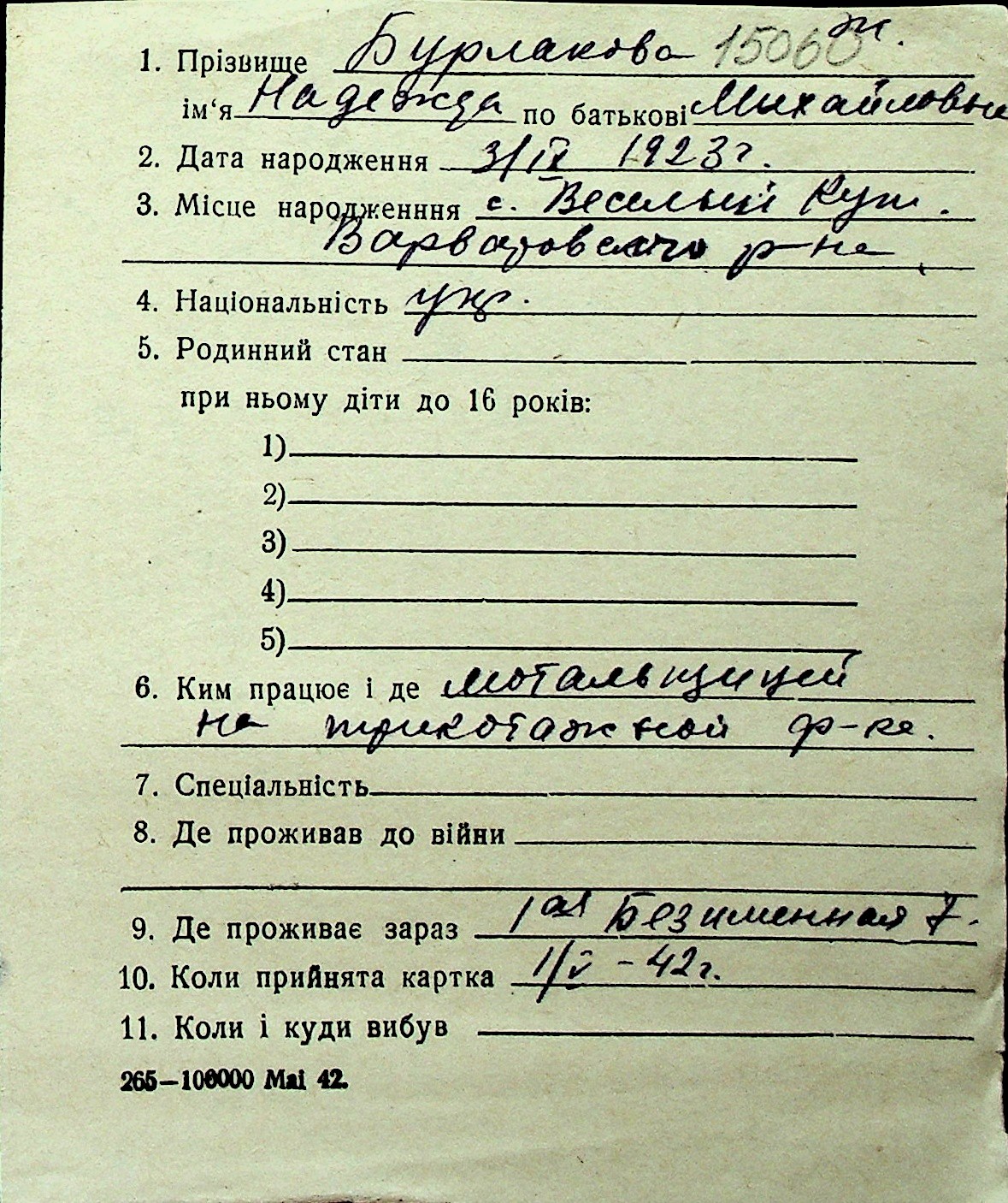 ◦ ◦ Перелік карток на осіб, які мешкали у м. Миколаїв у період окупації 1941–1944 років