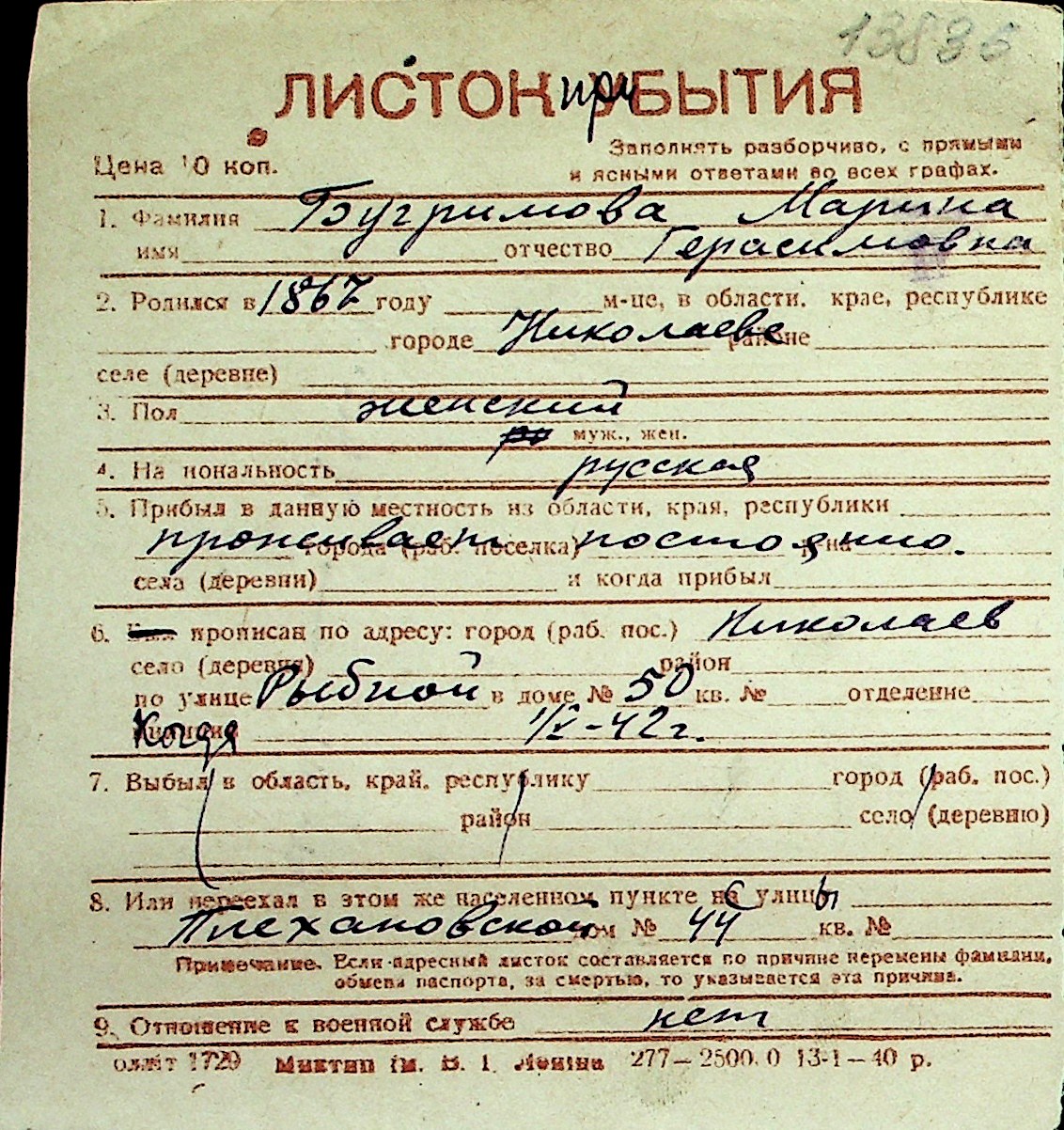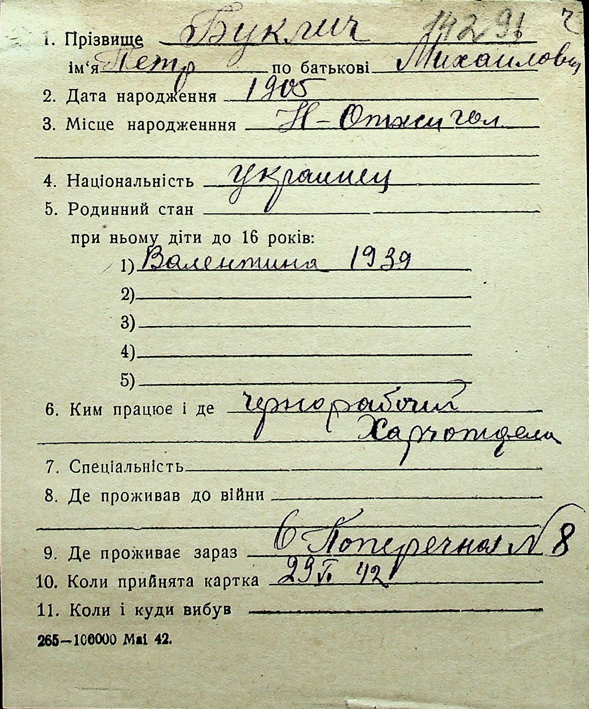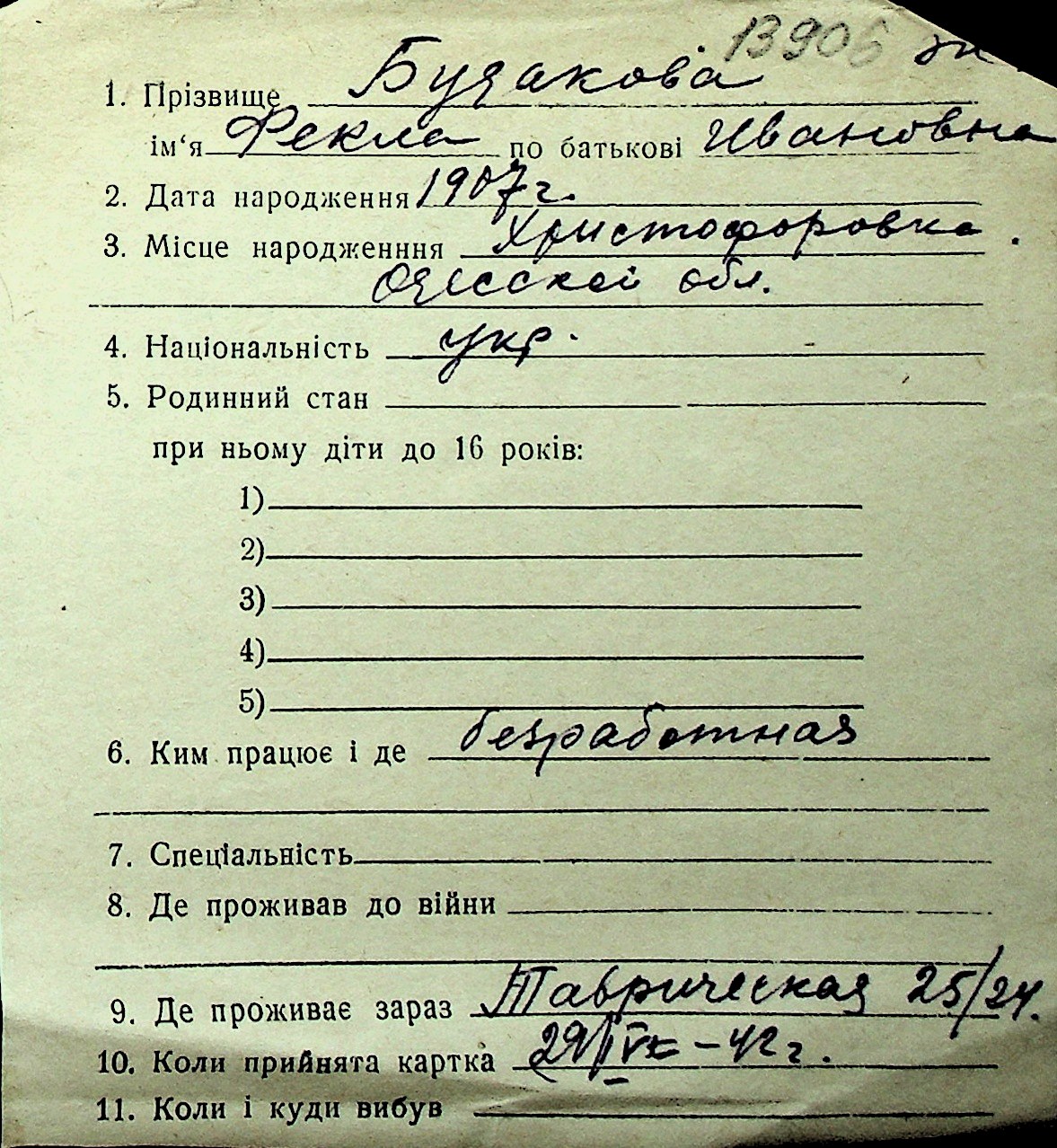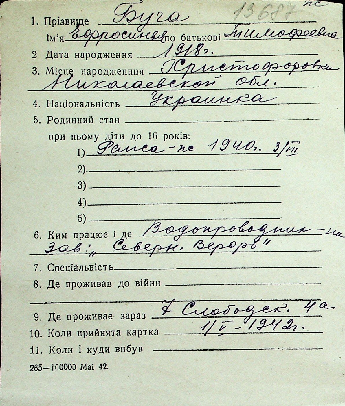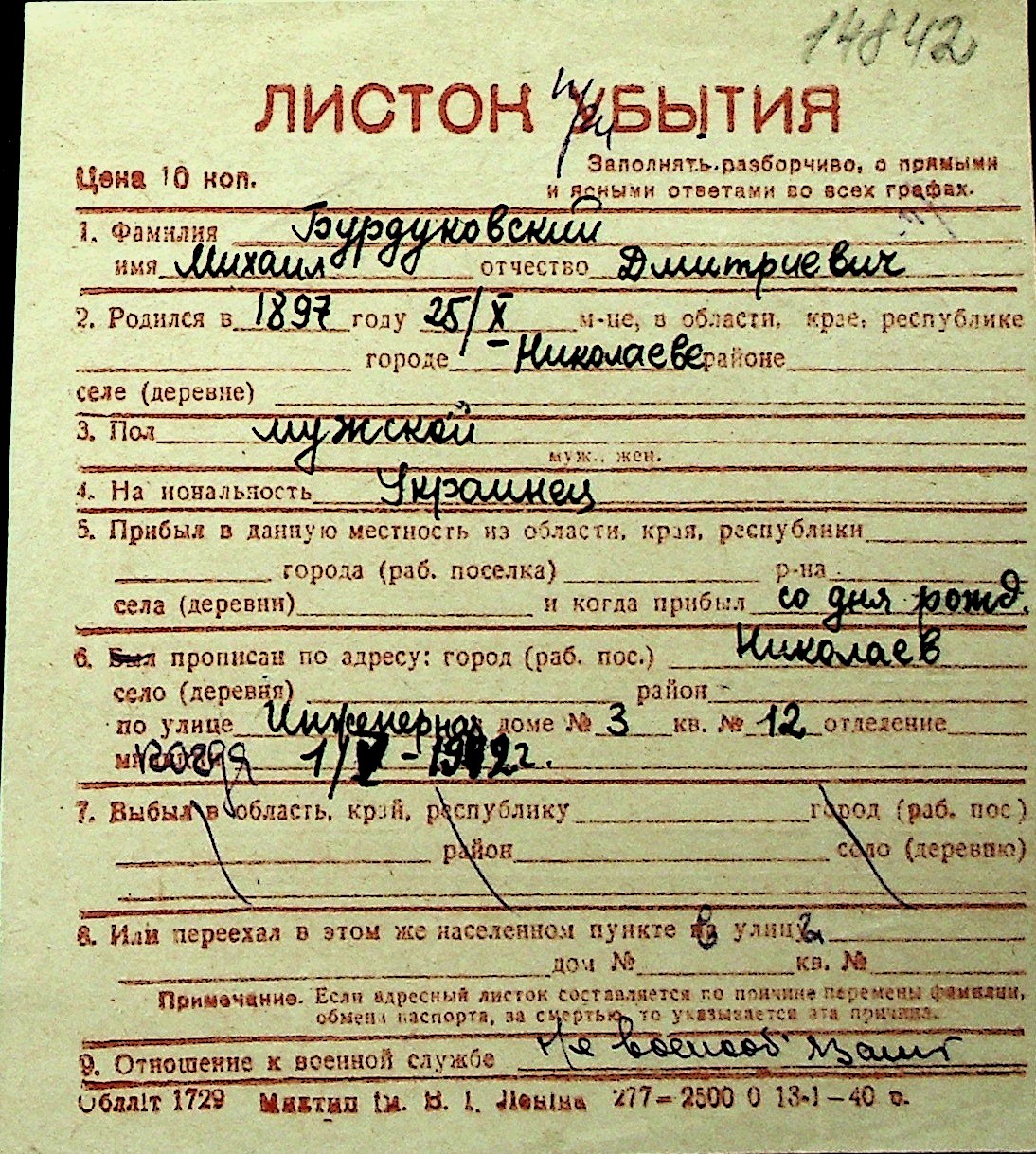 ◦ ◦ Перелік карток на осіб, які мешкали у м. Миколаїв у період окупації 1941–1944 років
