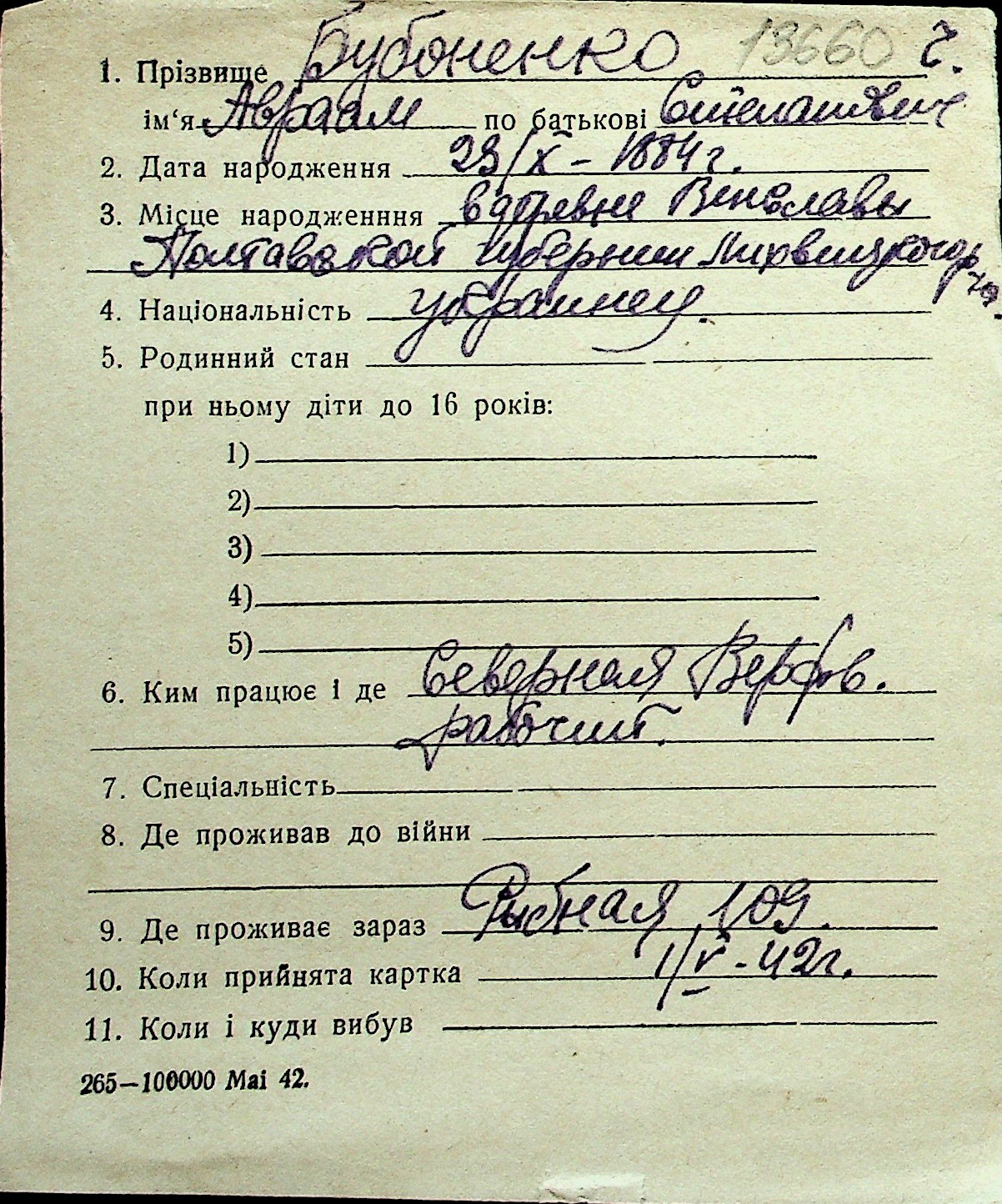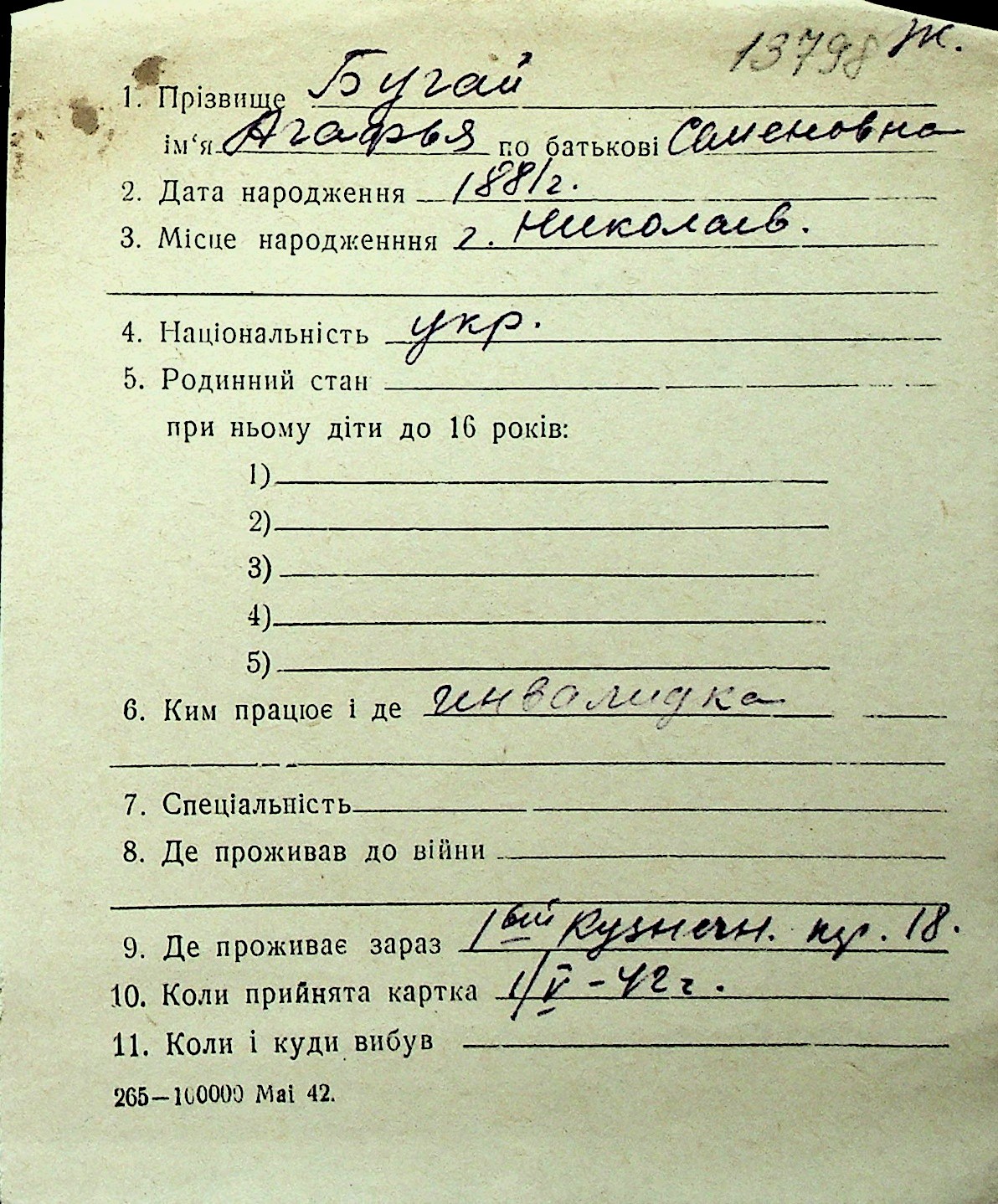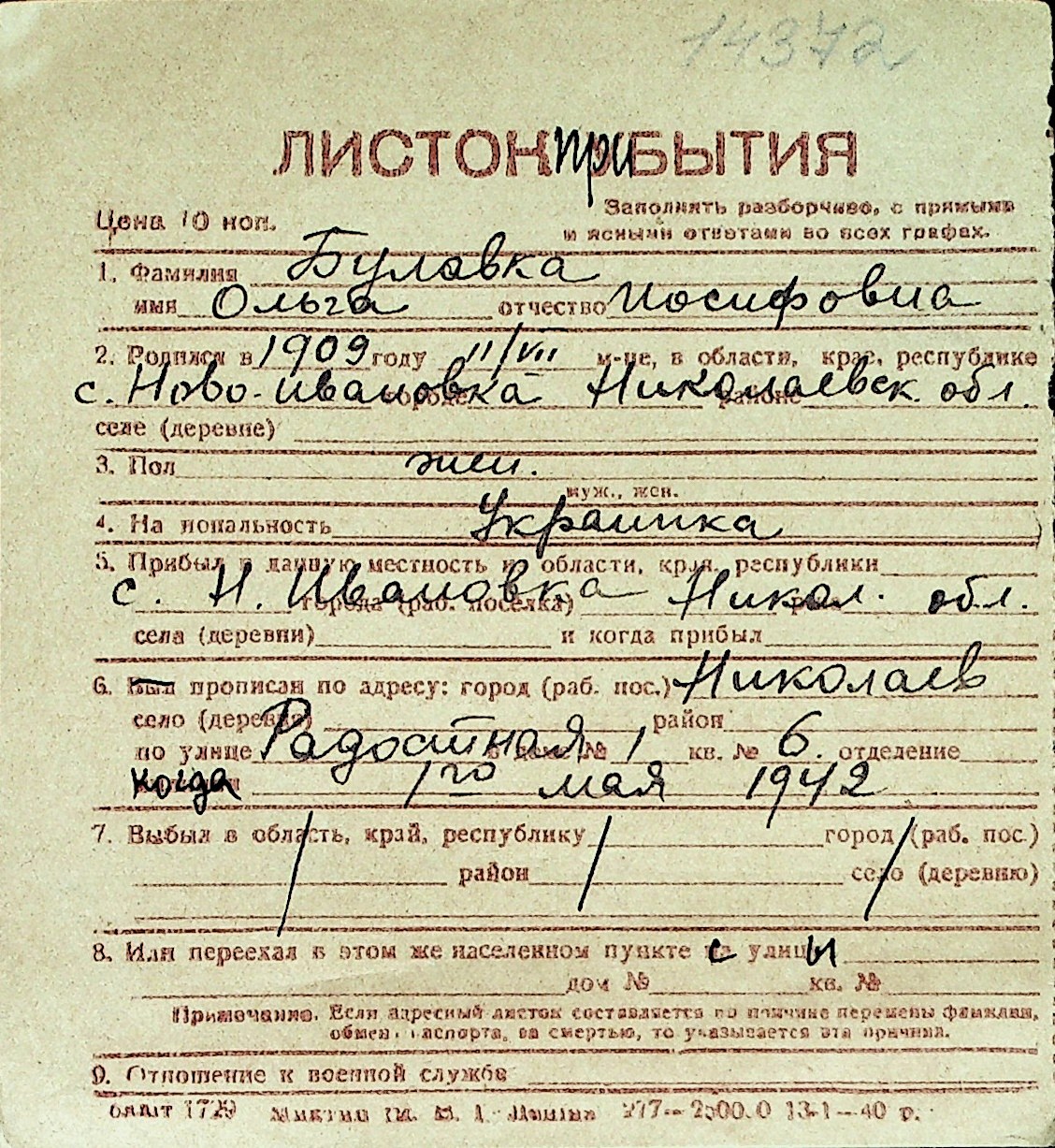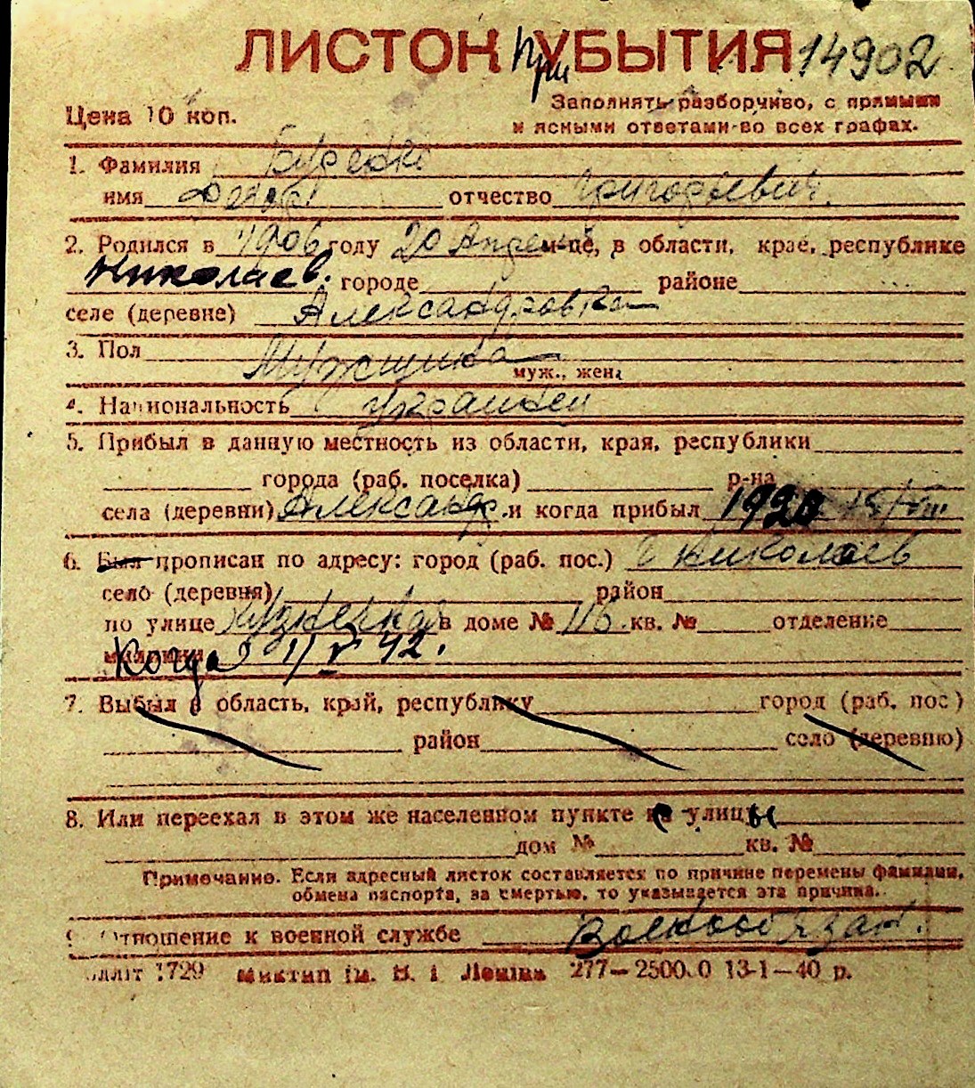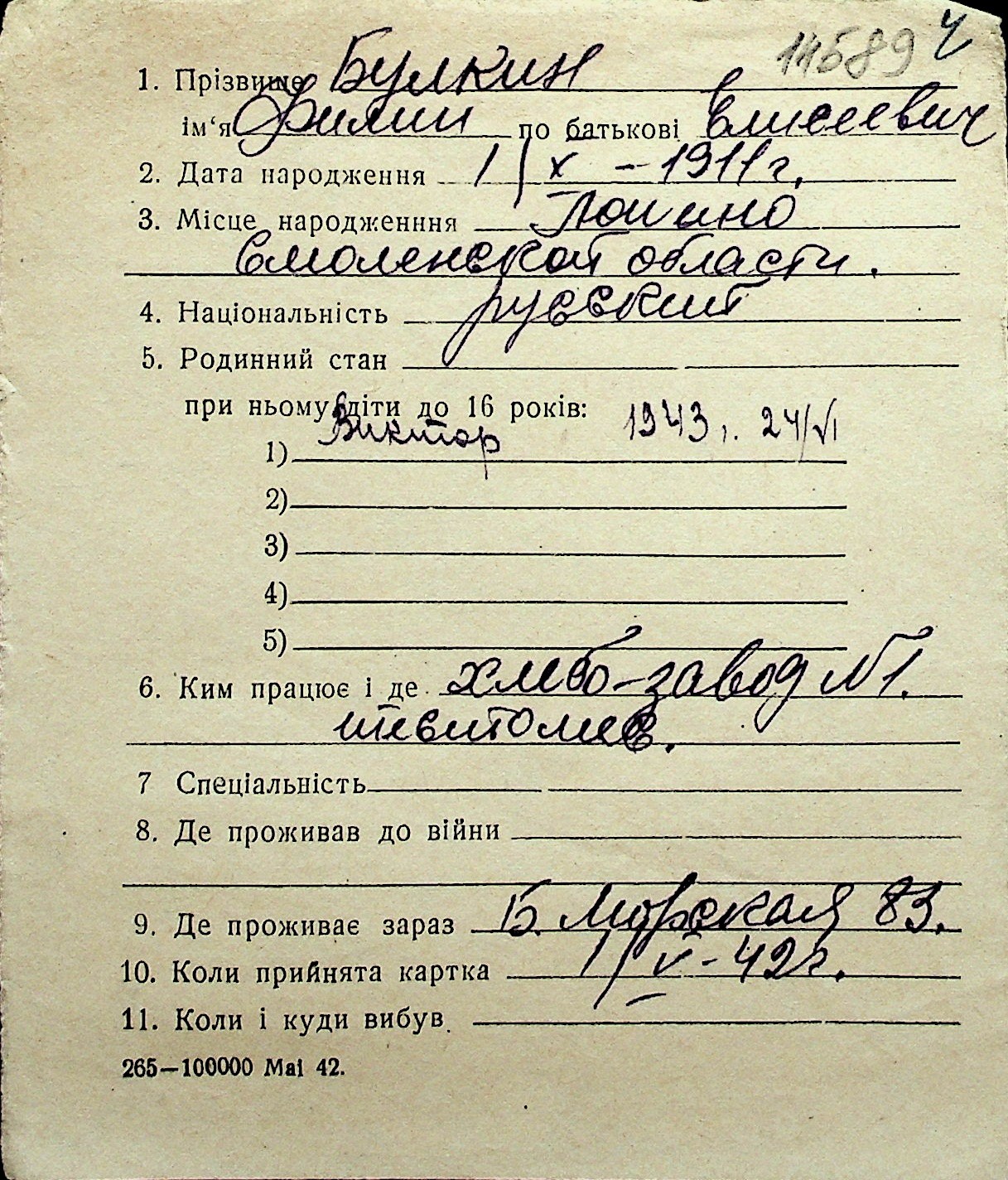 ◦ ◦ Перелік карток на осіб, які мешкали у м. Миколаїв у період окупації 1941–1944 років