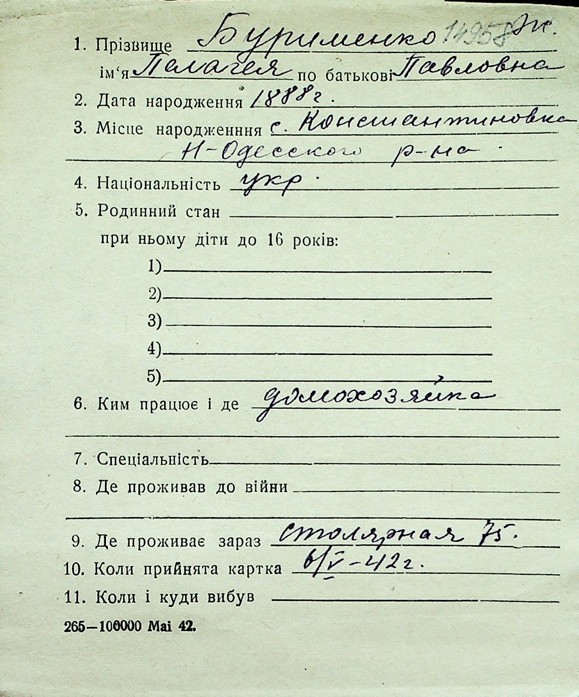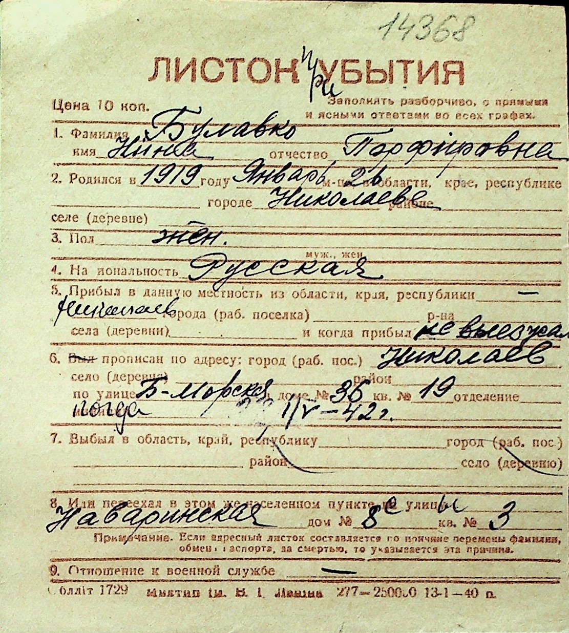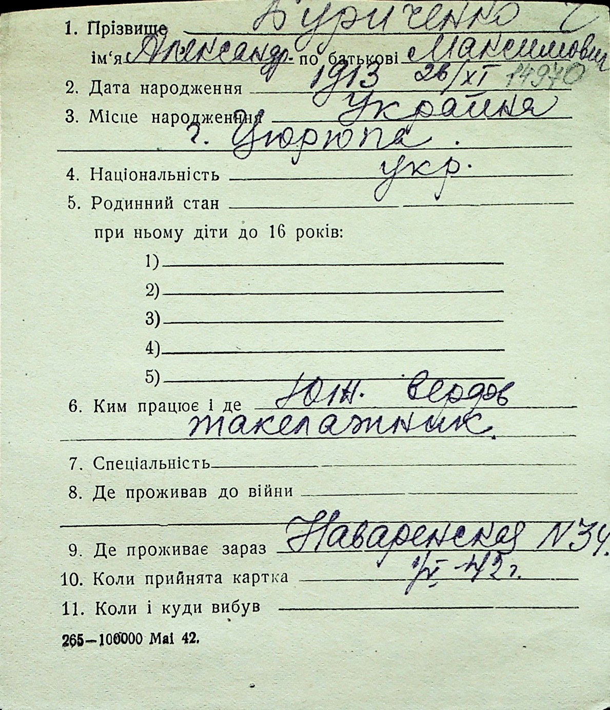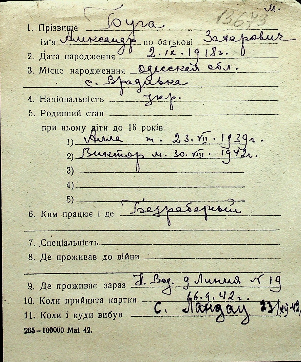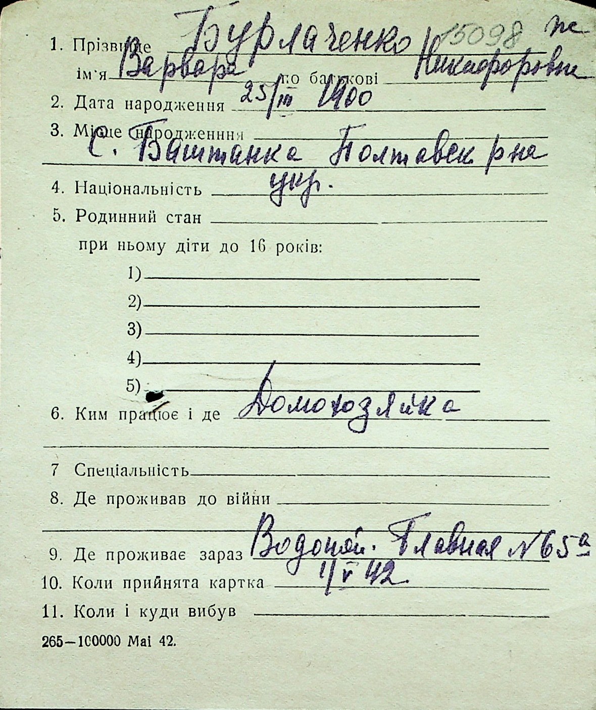 ◦ ◦ Перелік карток на осіб, які мешкали у м. Миколаїв у період окупації 1941–1944 років
