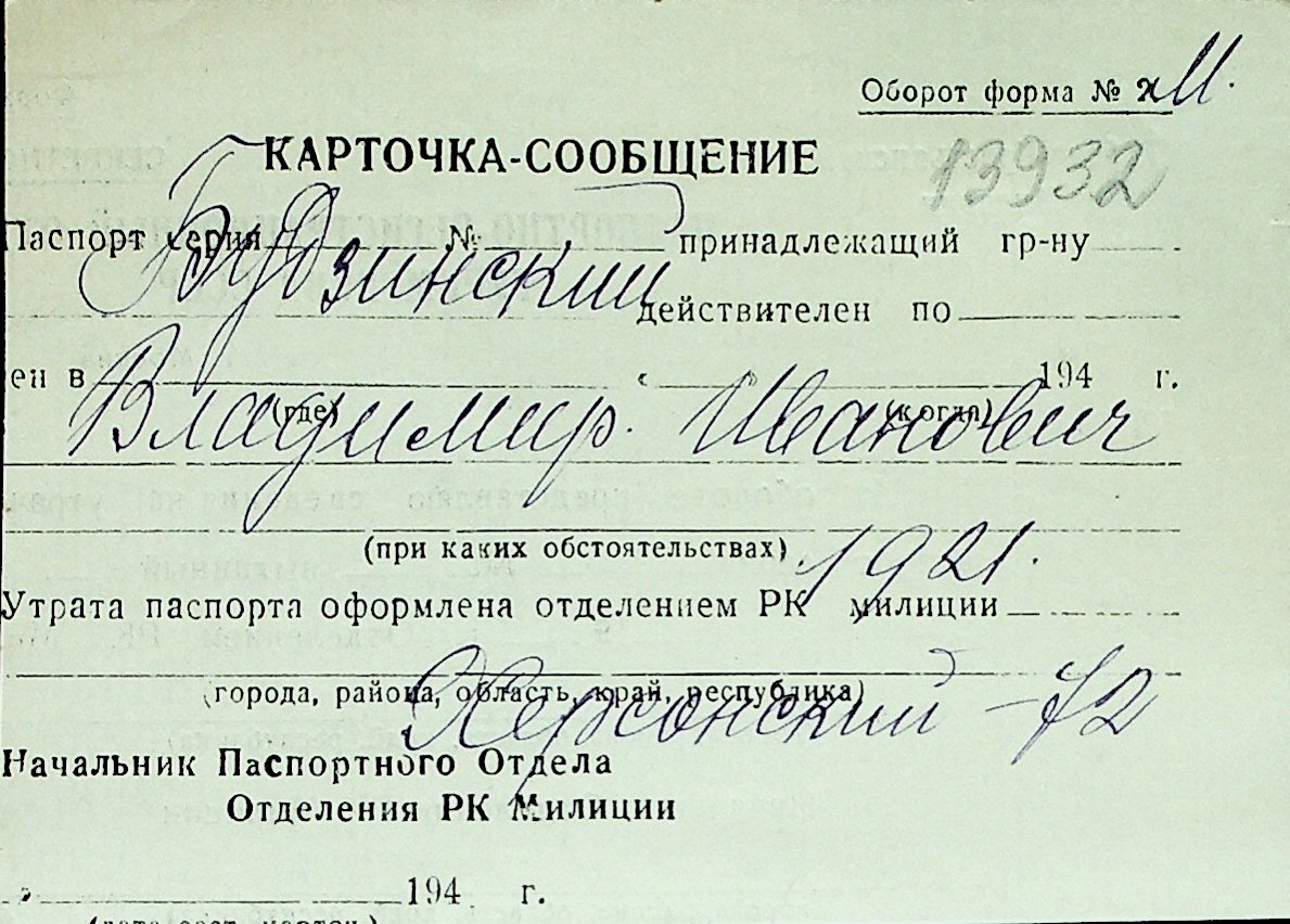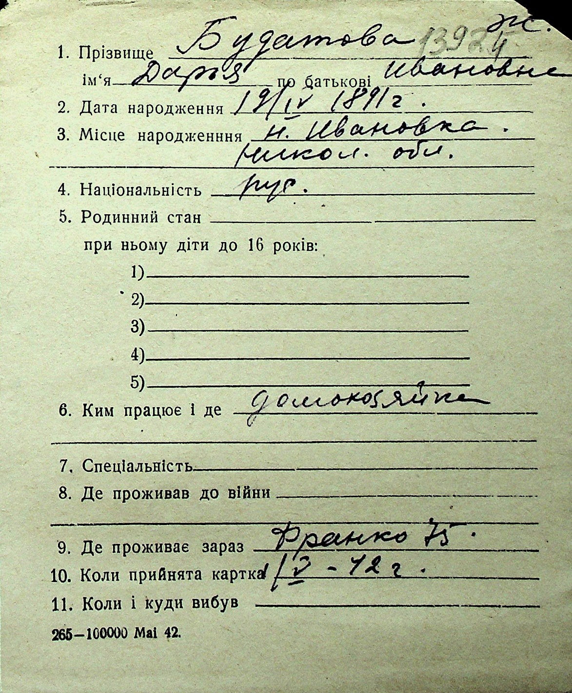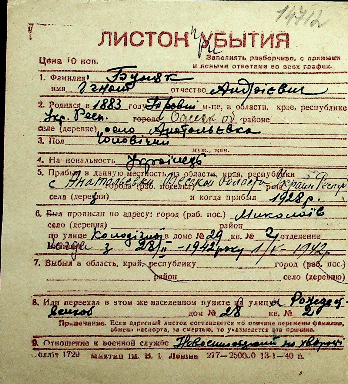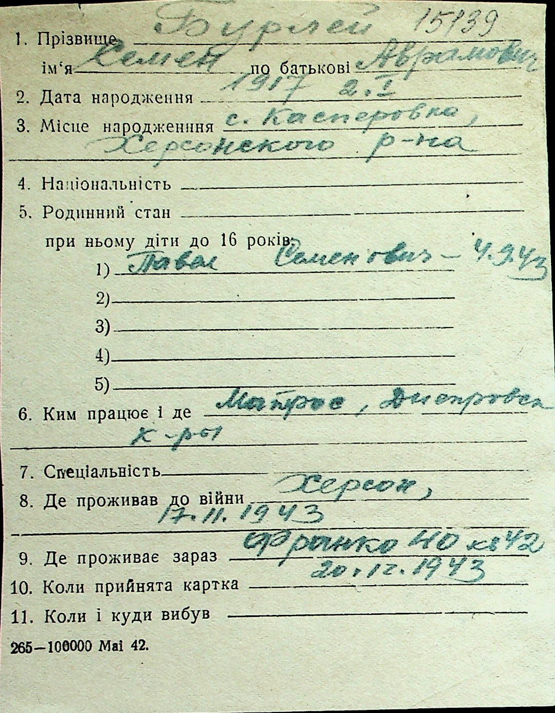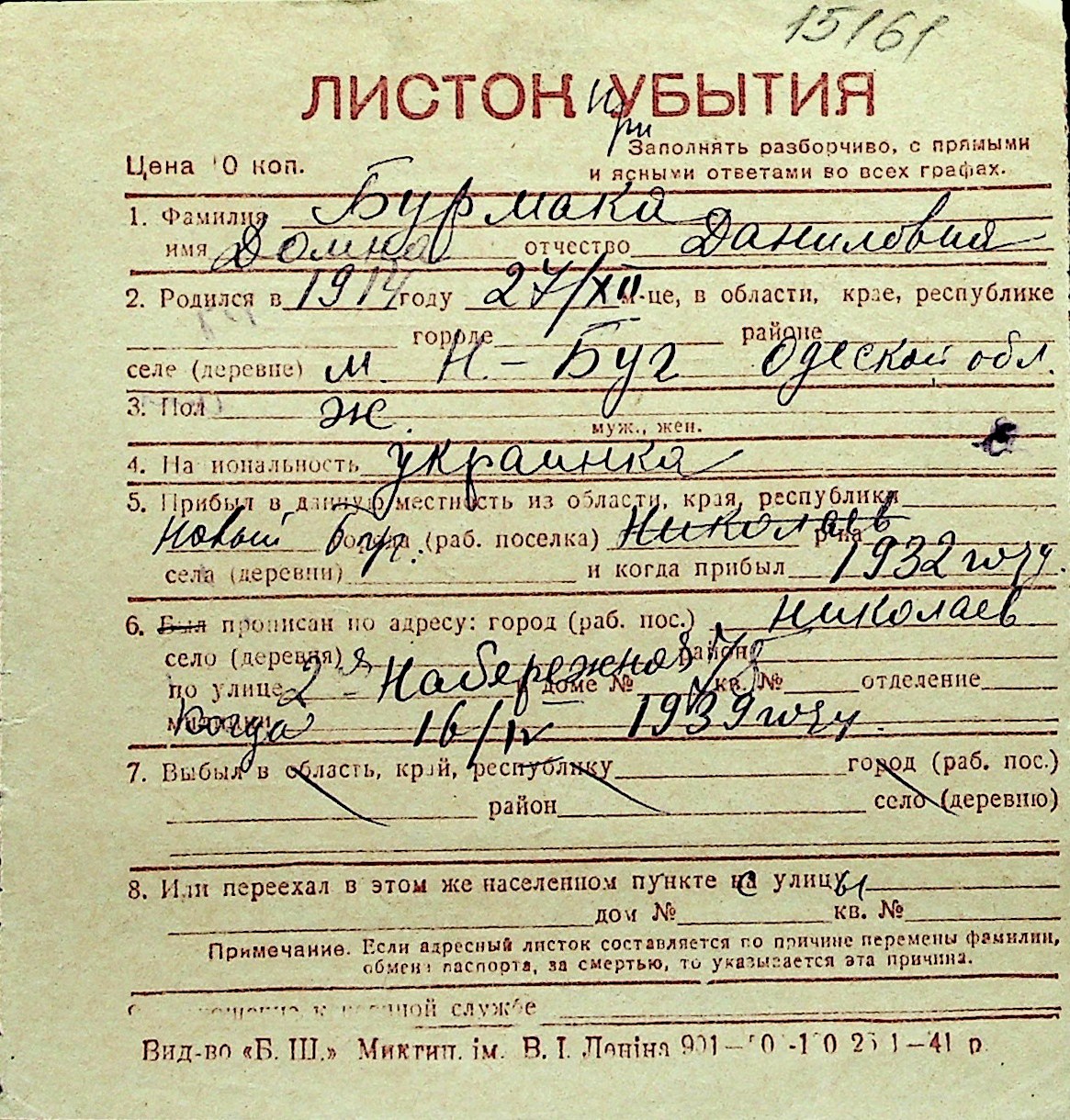 ◦ ◦ Перелік карток на осіб, які мешкали у м. Миколаїв у період окупації 1941–1944 років