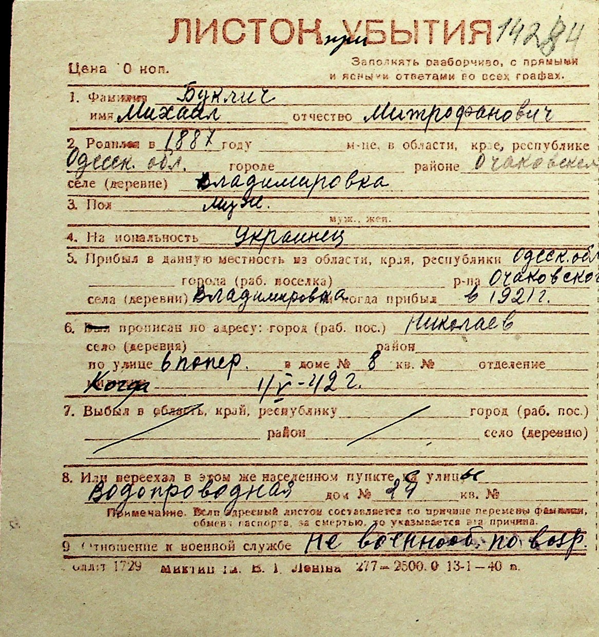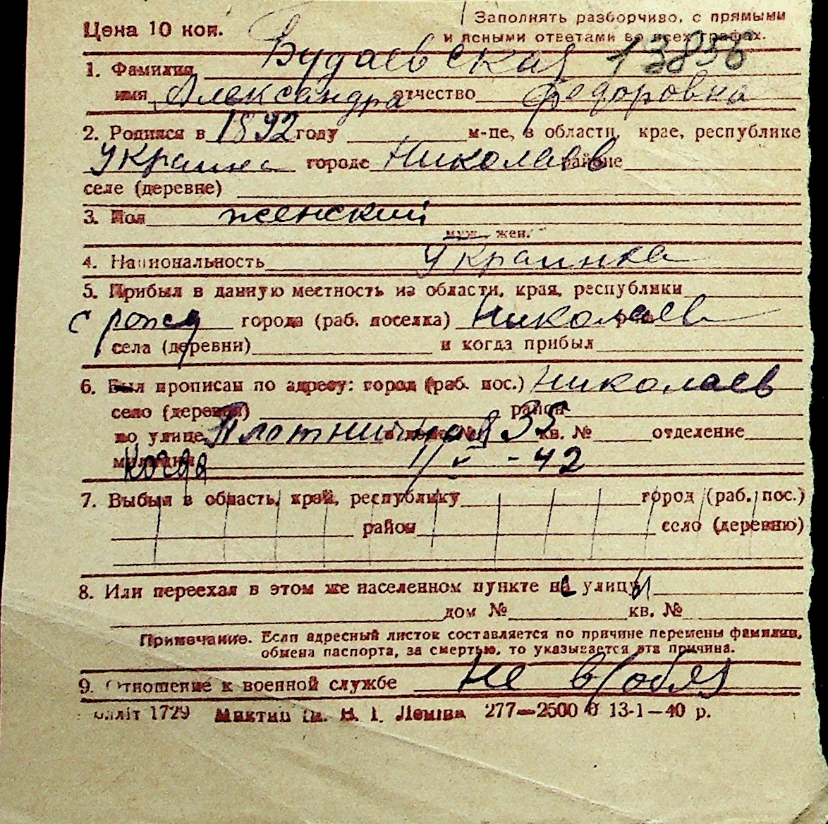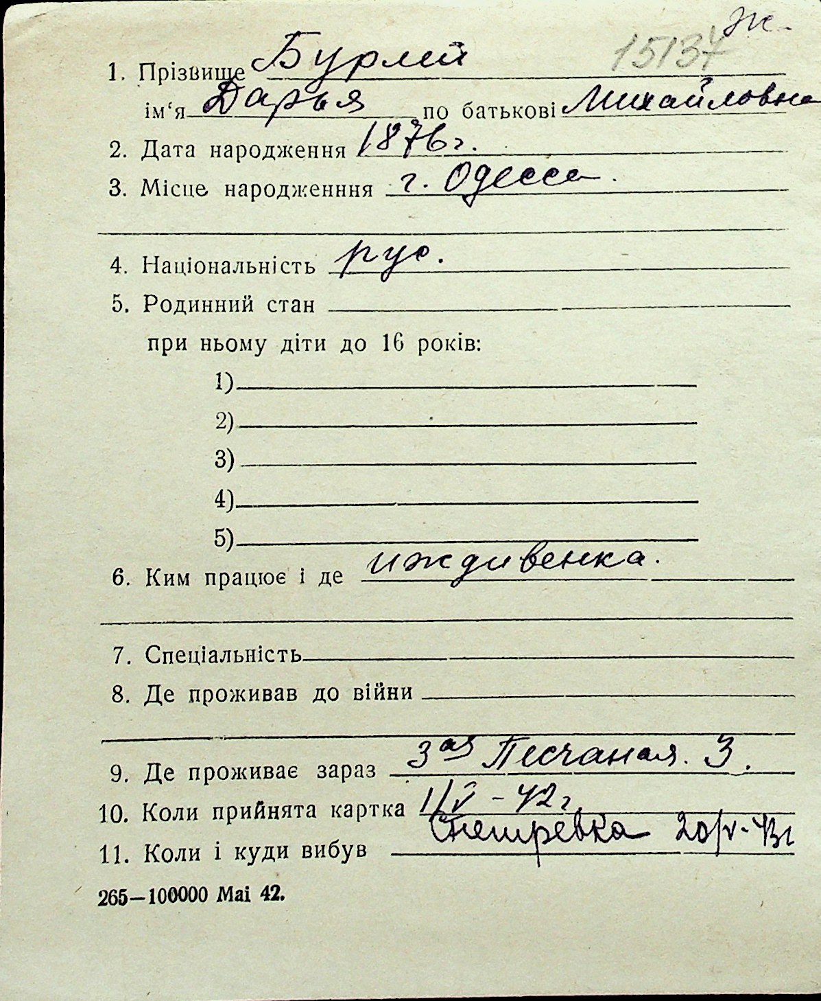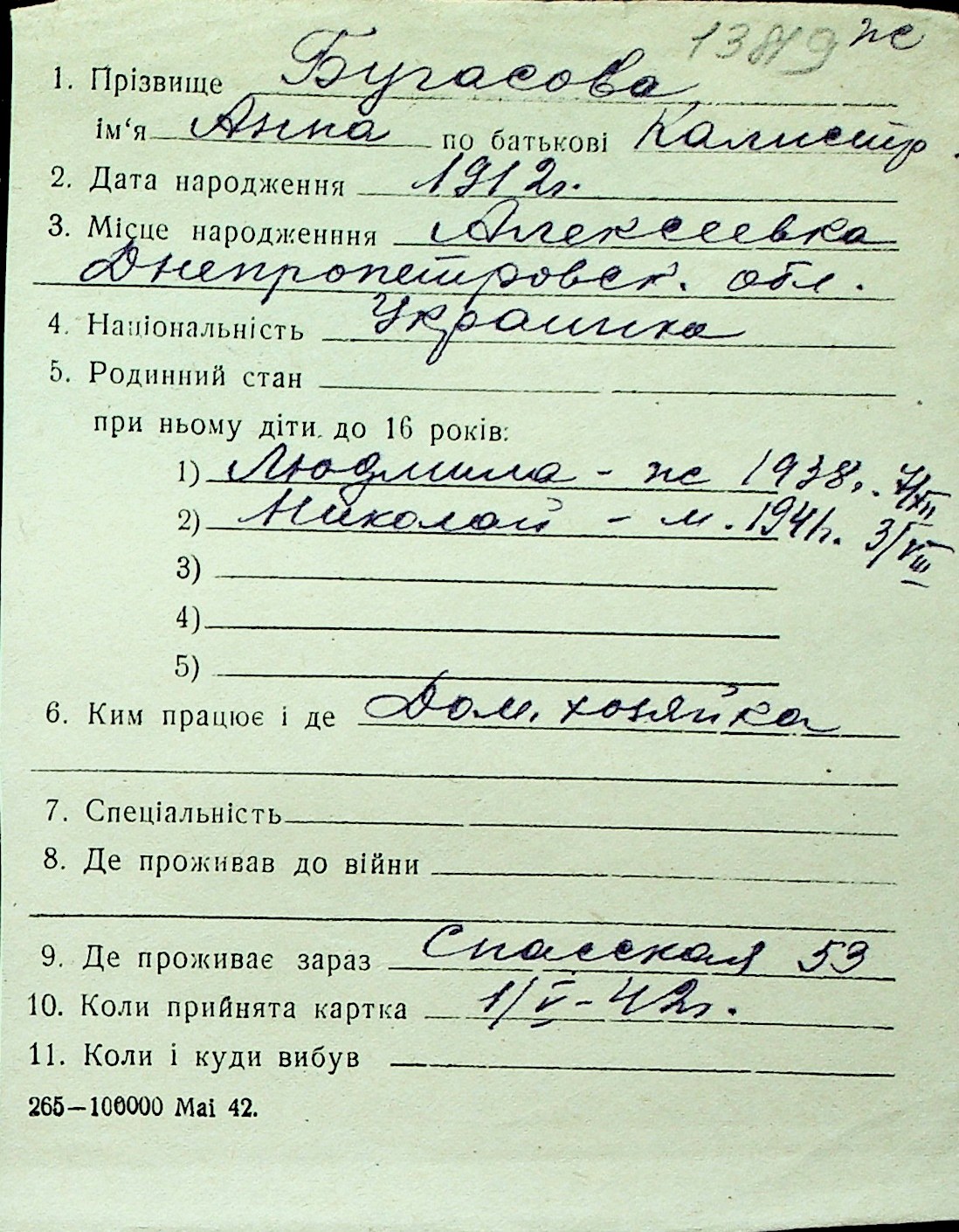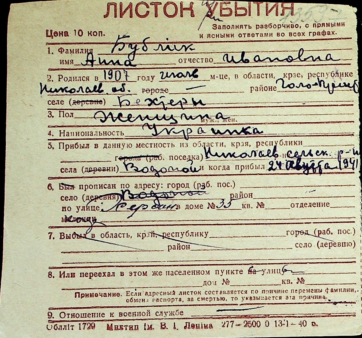 ◦ ◦ Перелік карток на осіб, які мешкали у м. Миколаїв у період окупації 1941–1944 років