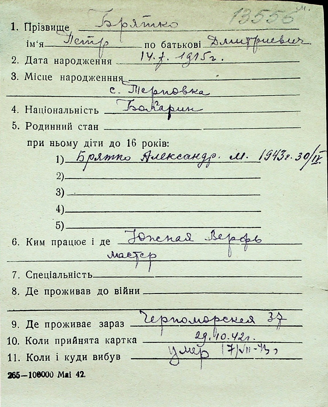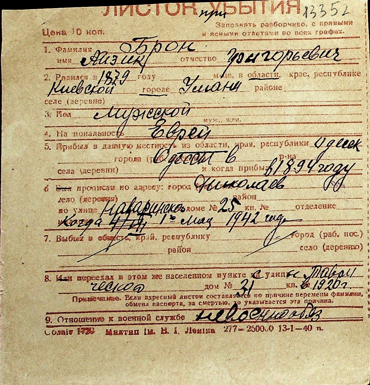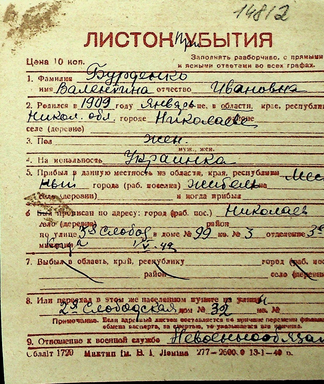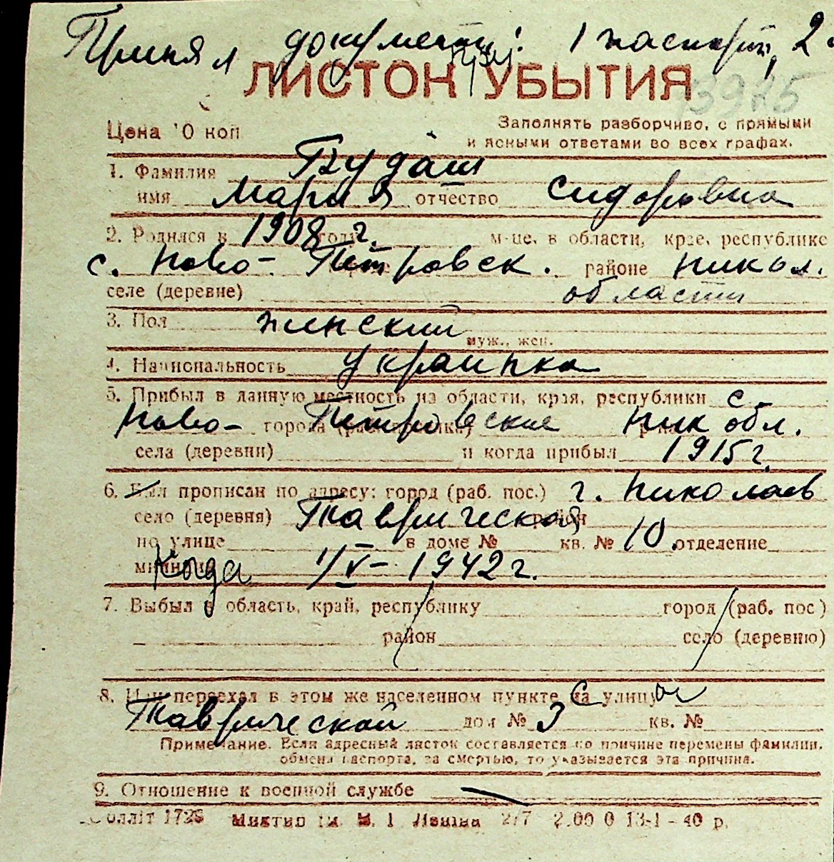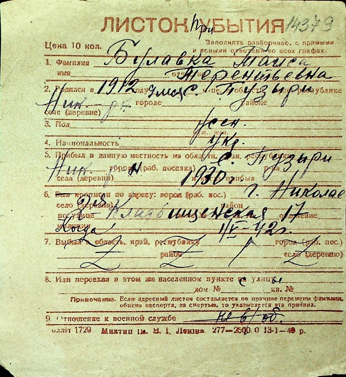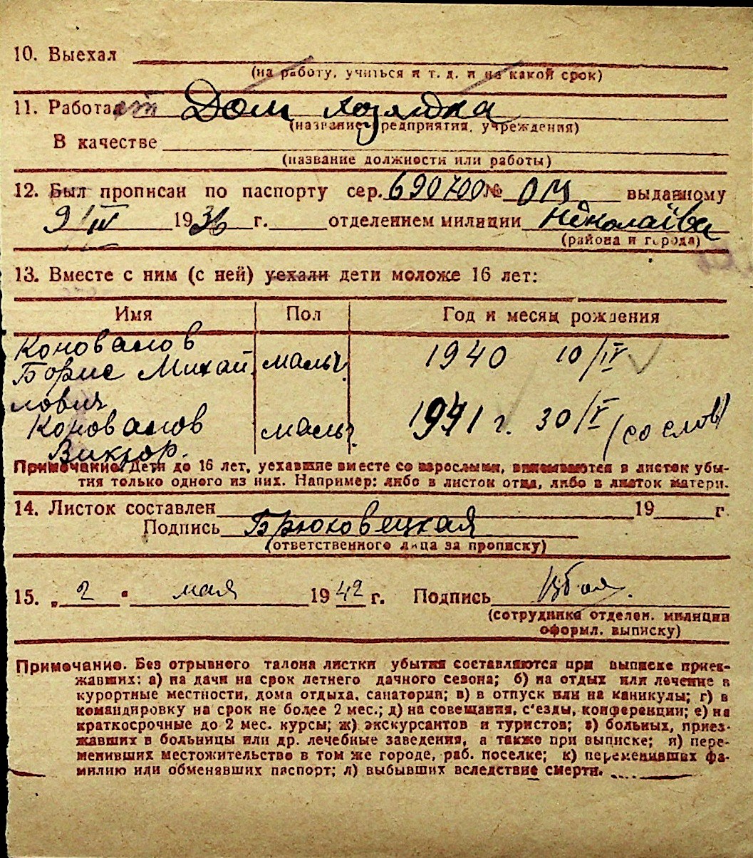 ◦ ◦ Перелік карток на осіб, які мешкали у м. Миколаїв у період окупації 1941–1944 років
