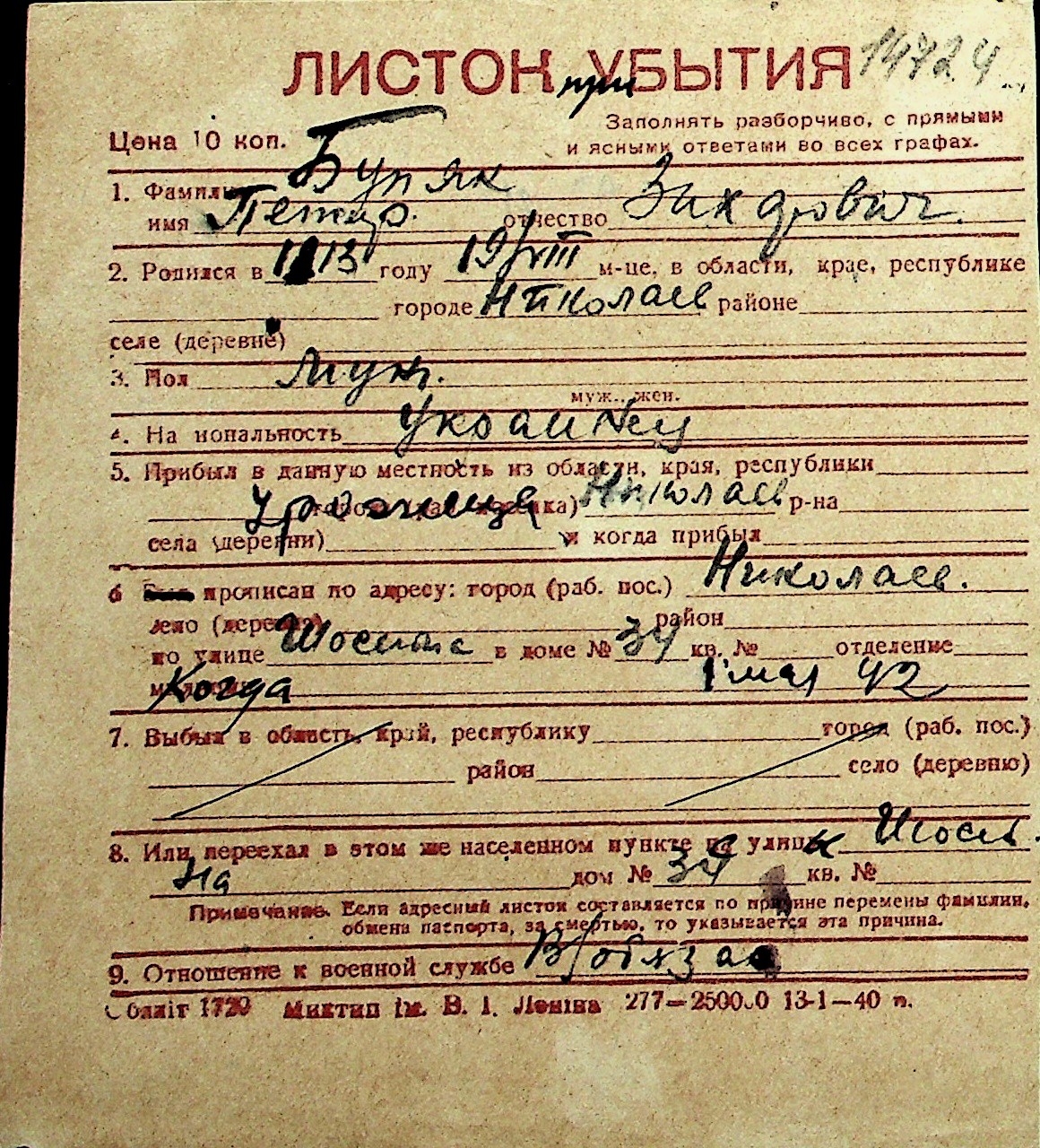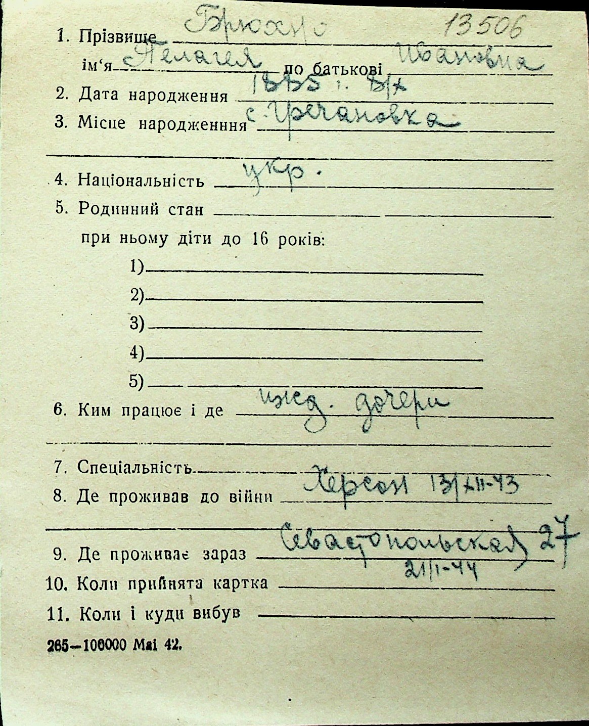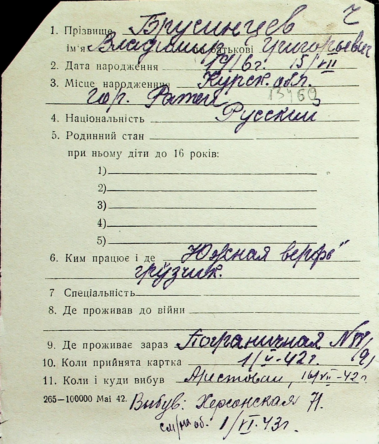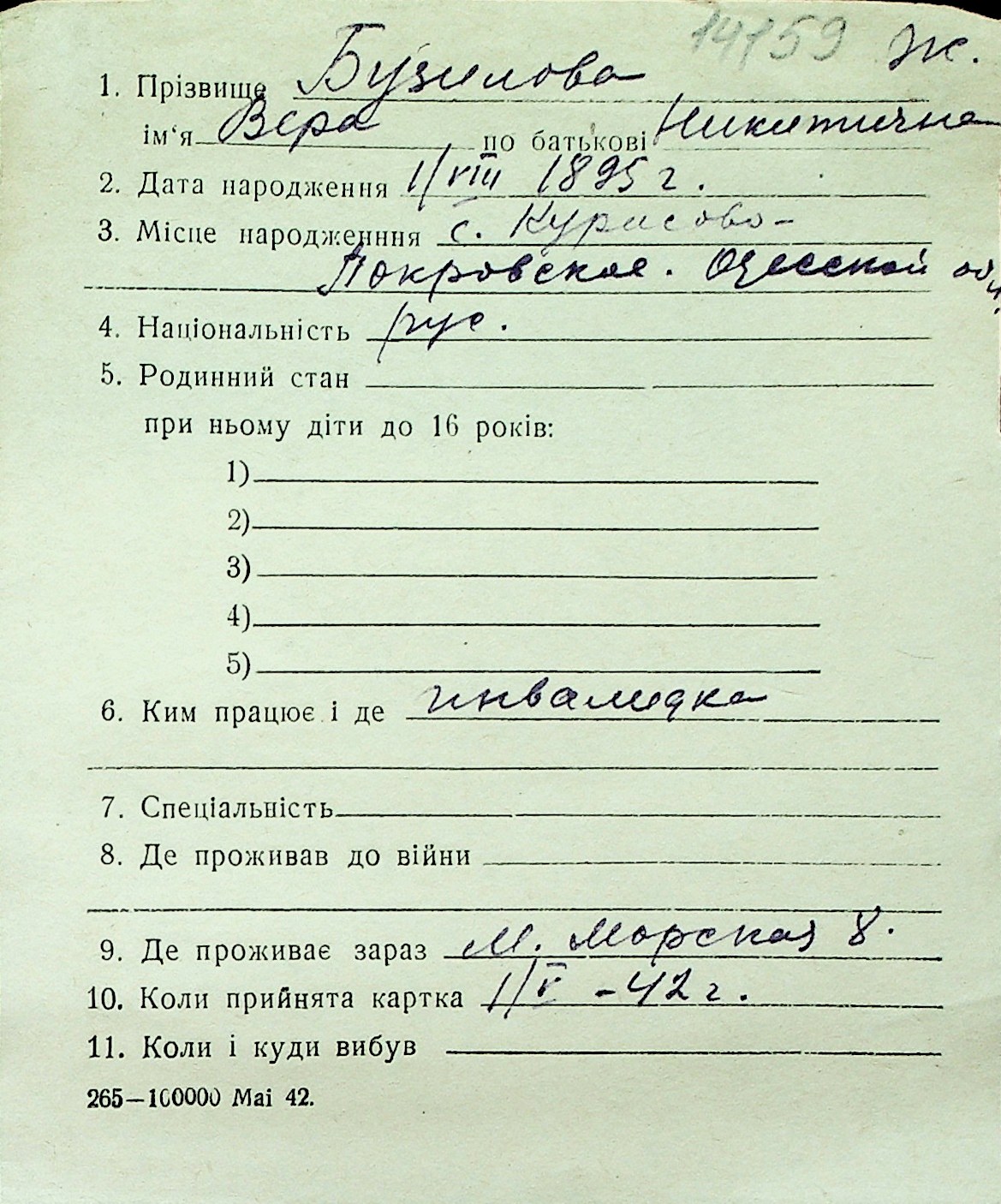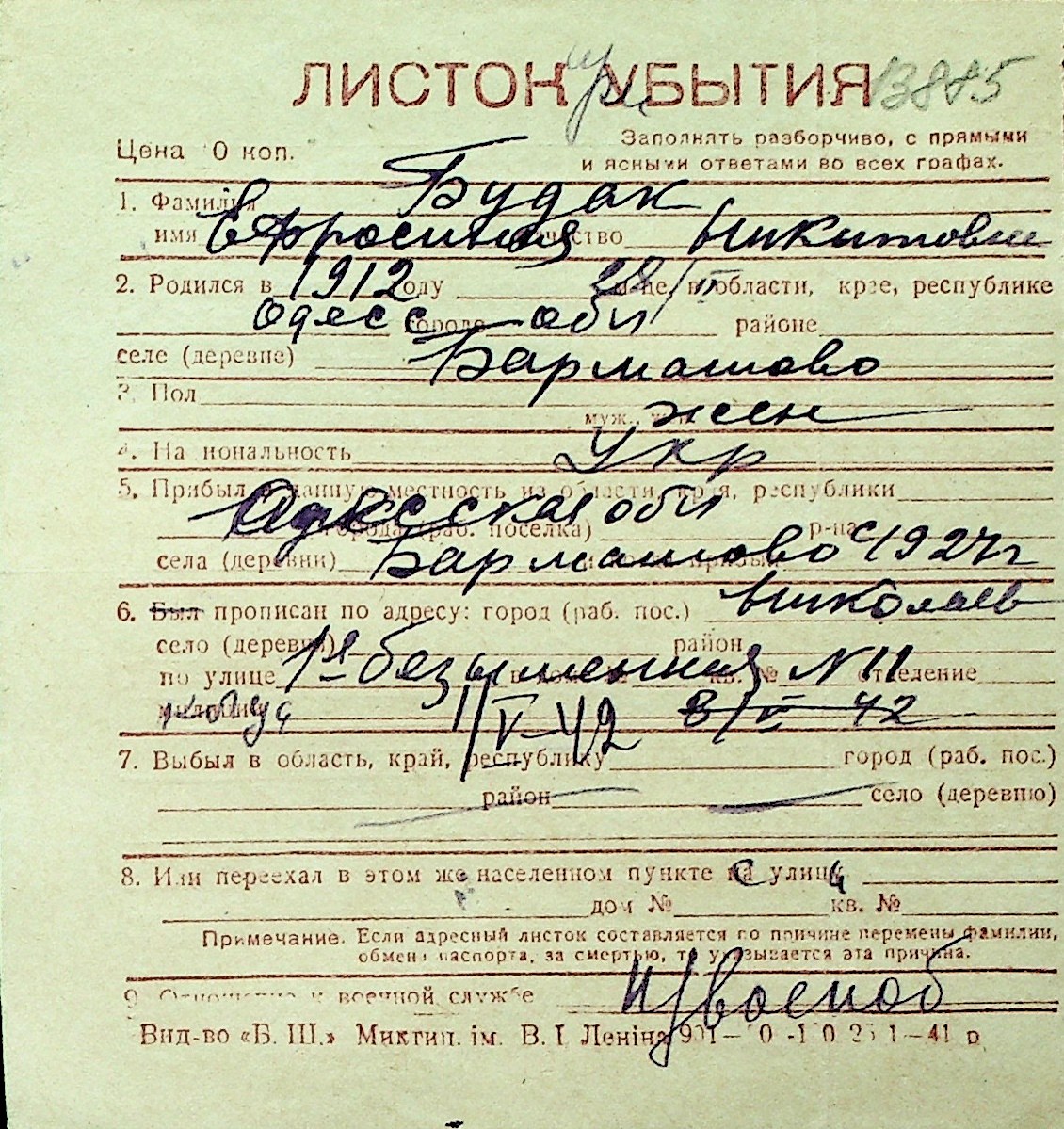 ◦ ◦ Перелік карток на осіб, які мешкали у м. Миколаїв у період окупації 1941–1944 років