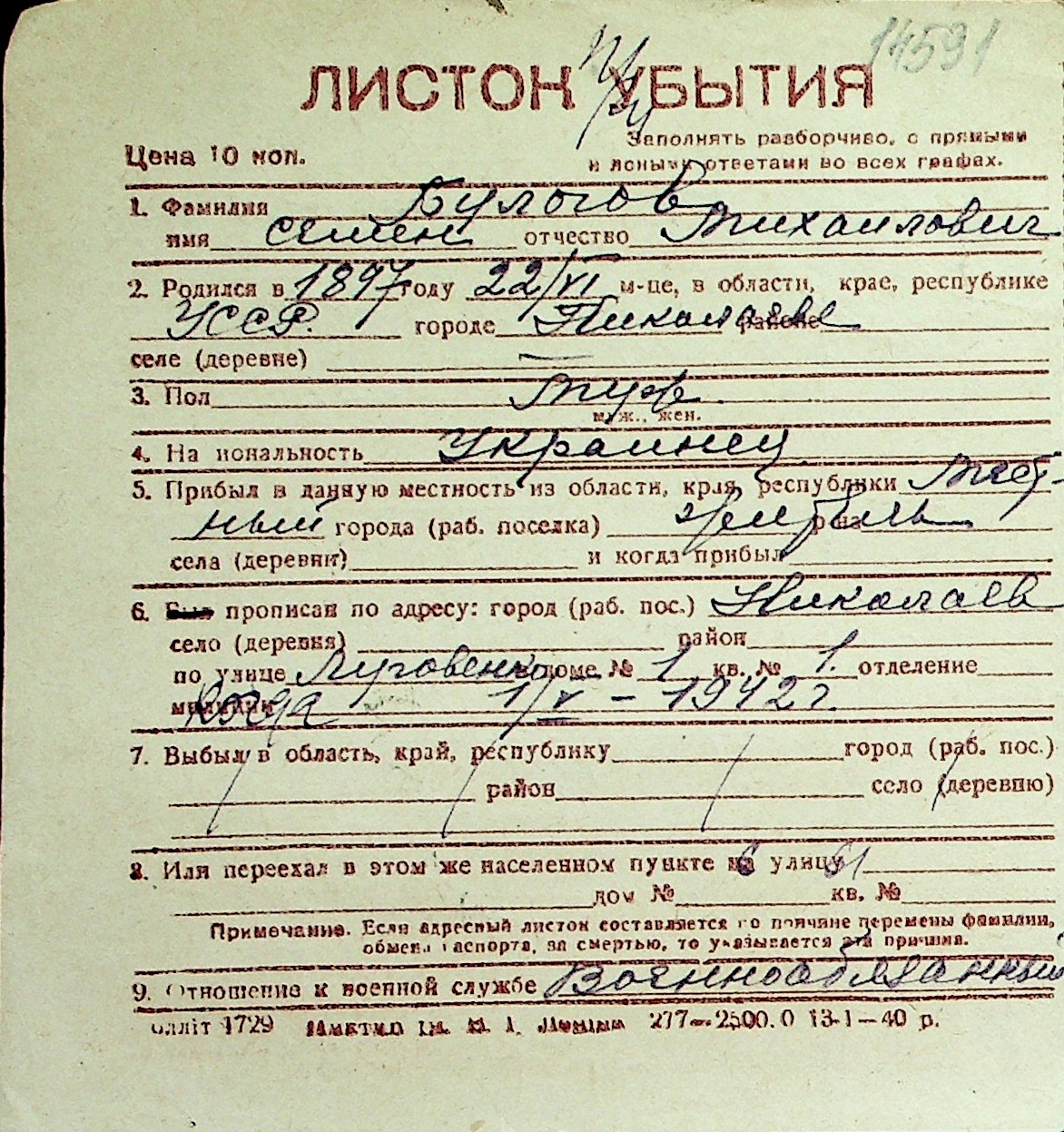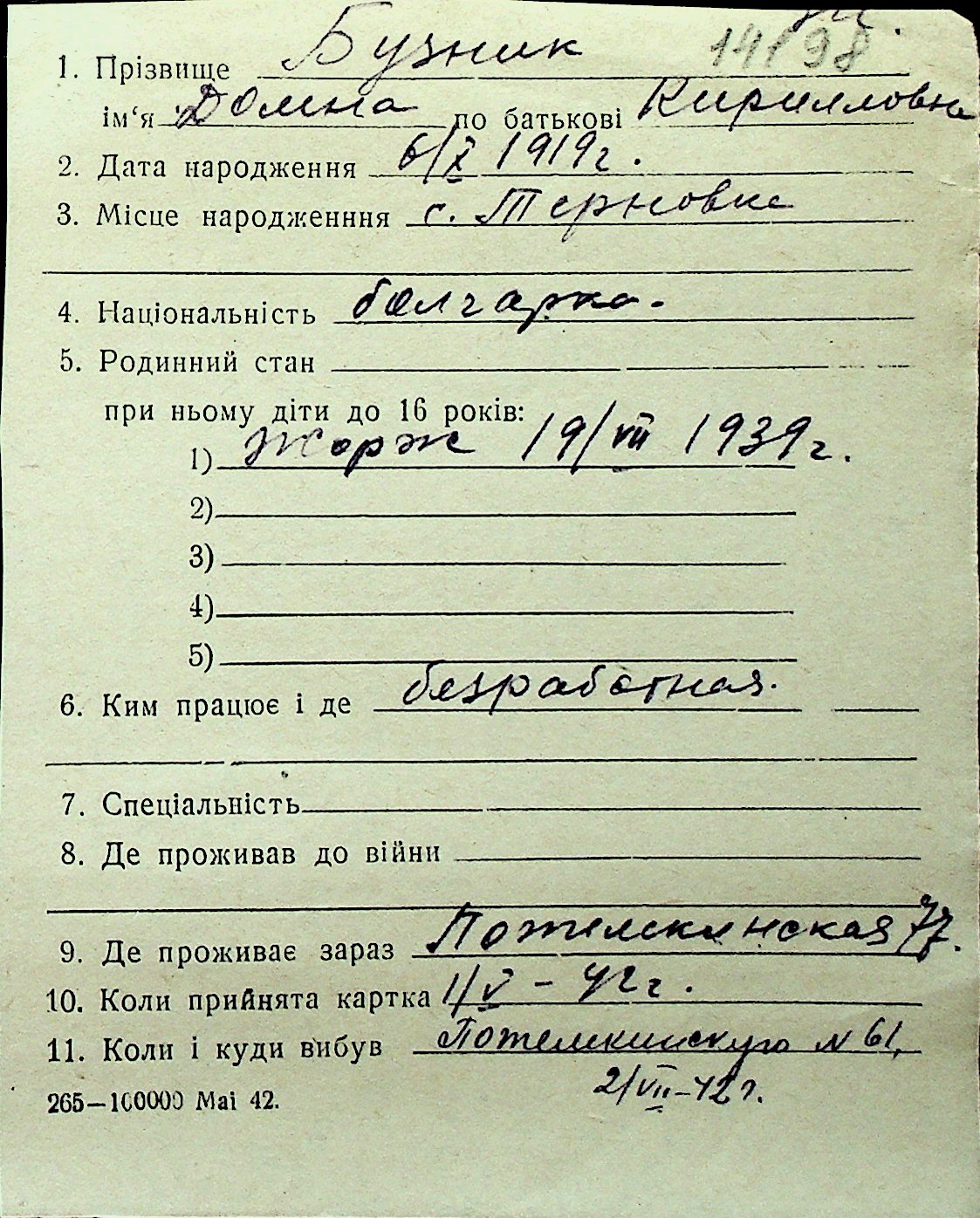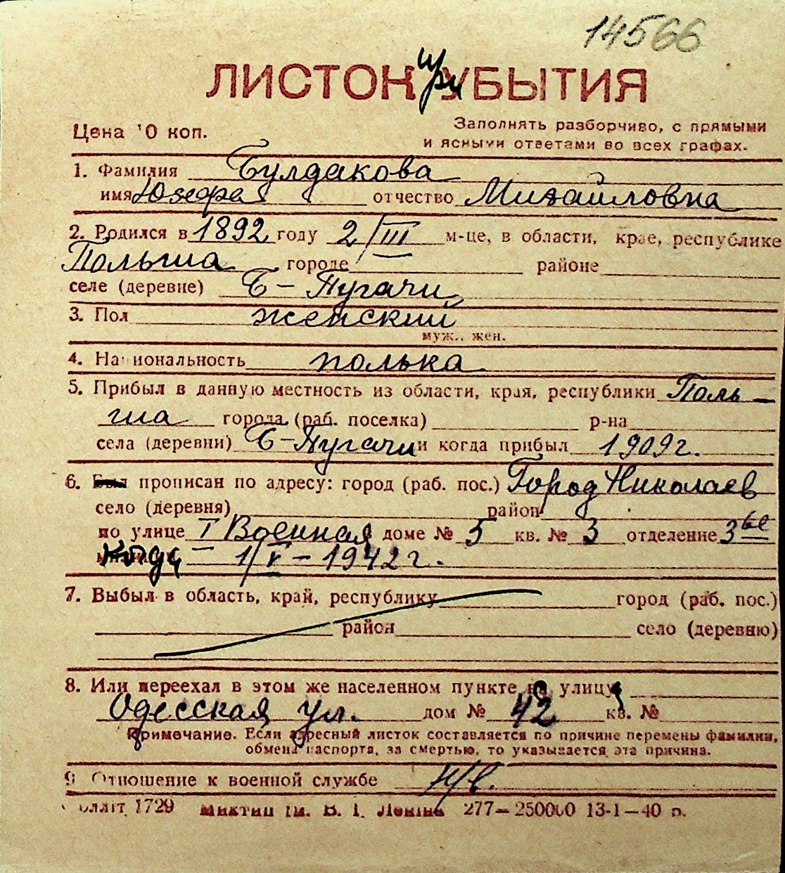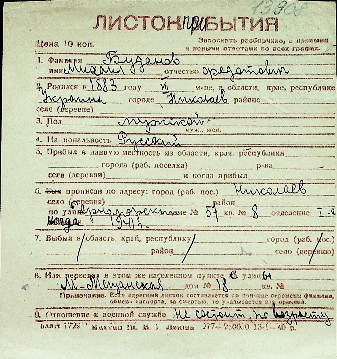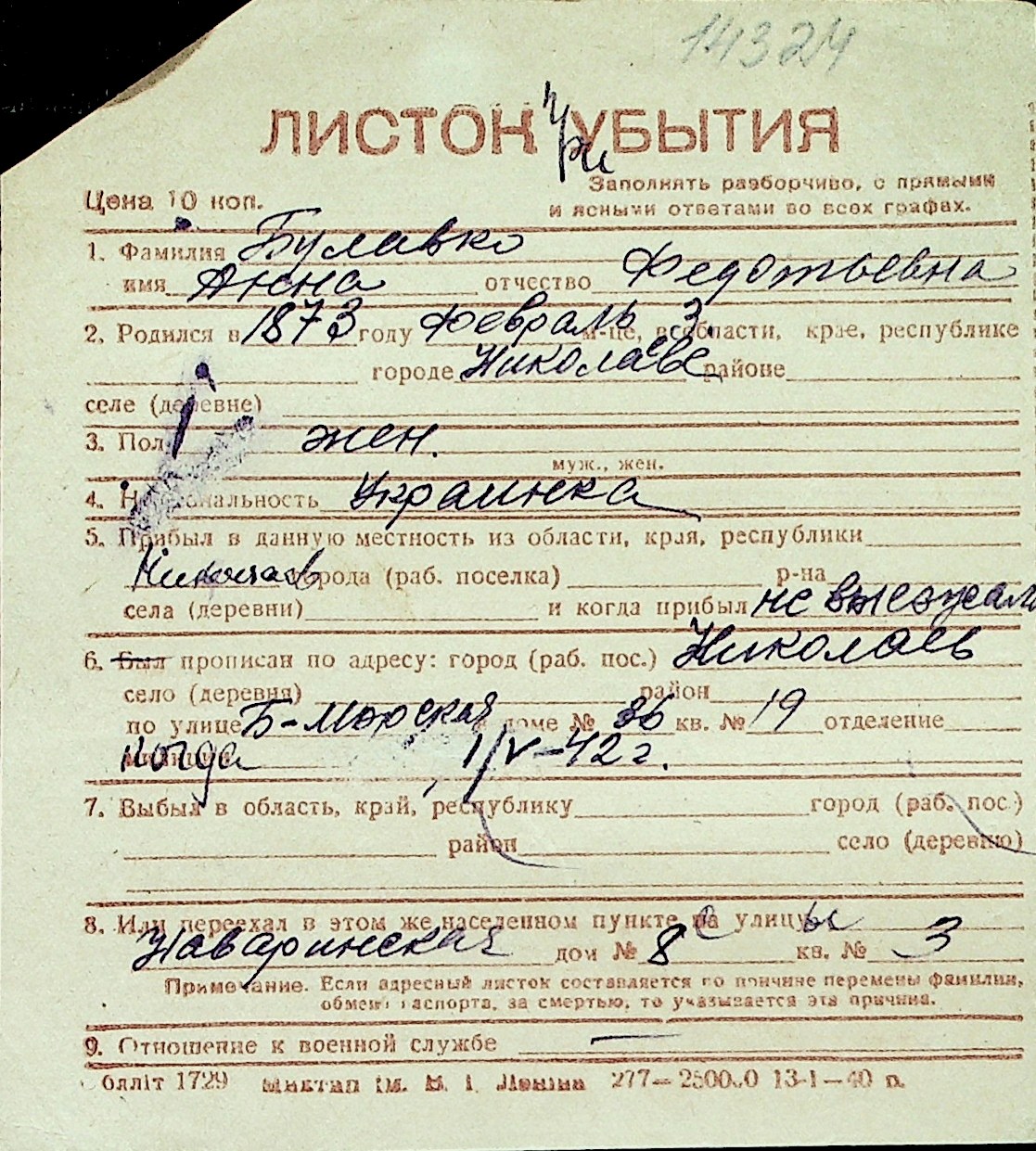 ◦ ◦ Перелік карток на осіб, які мешкали у м. Миколаїв у період окупації 1941–1944 років