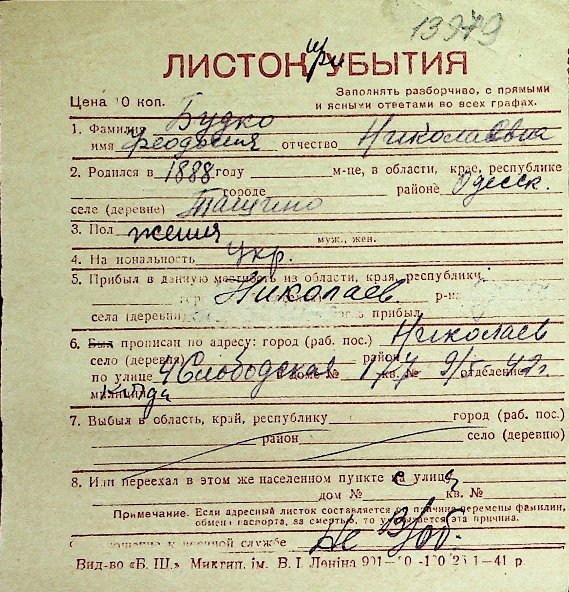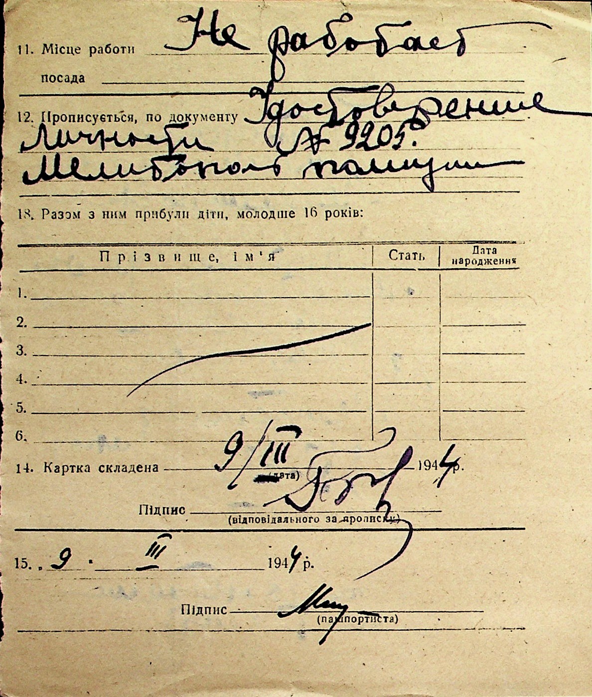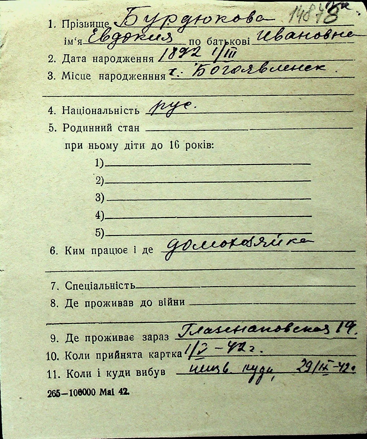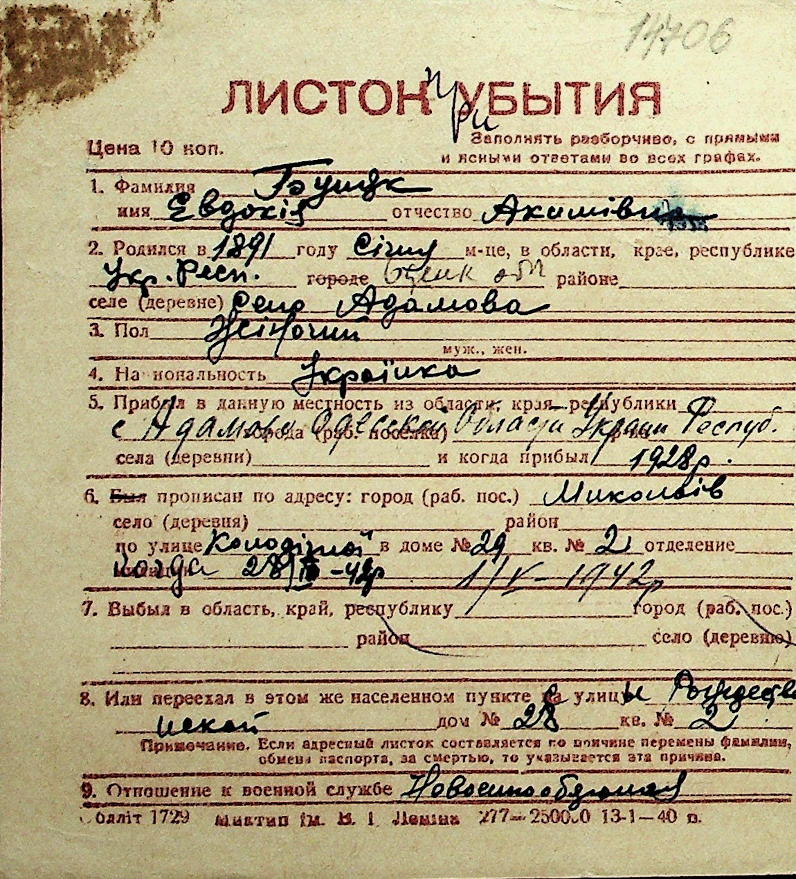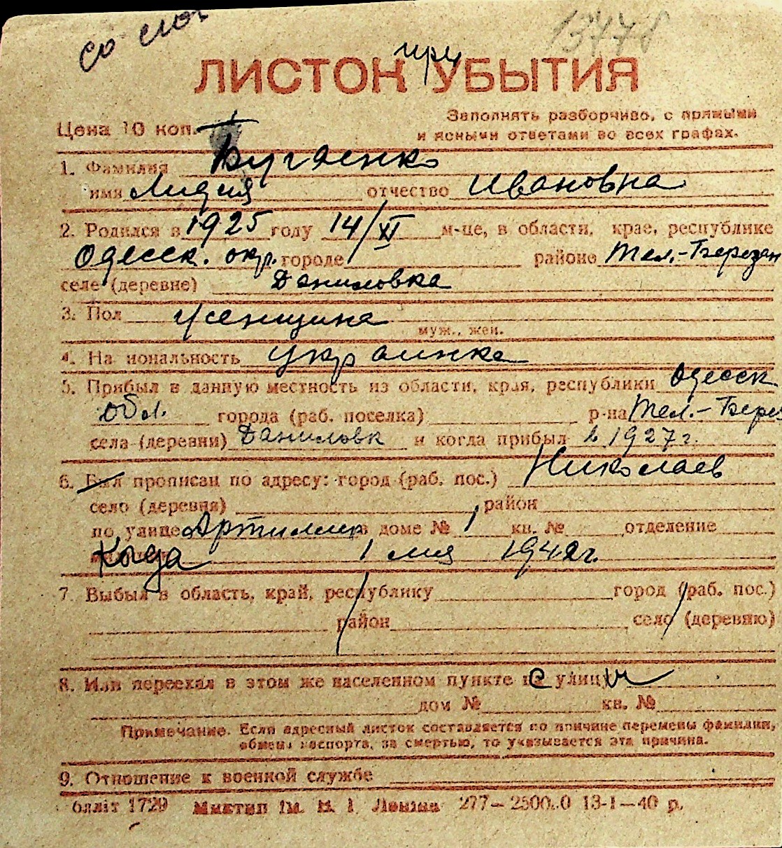 ◦ ◦ Перелік карток на осіб, які мешкали у м. Миколаїв у період окупації 1941–1944 років