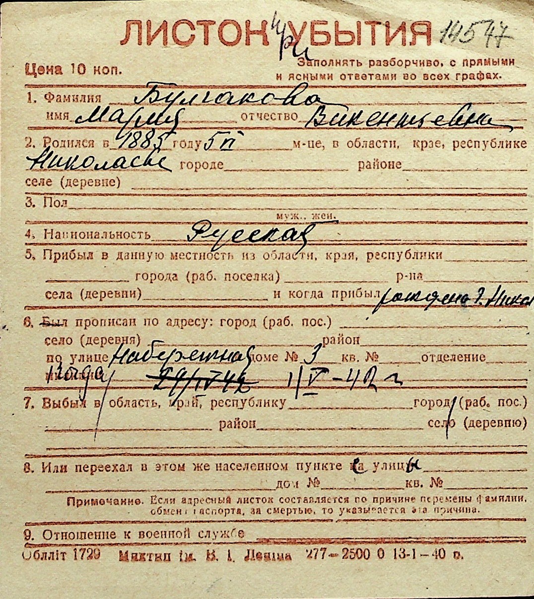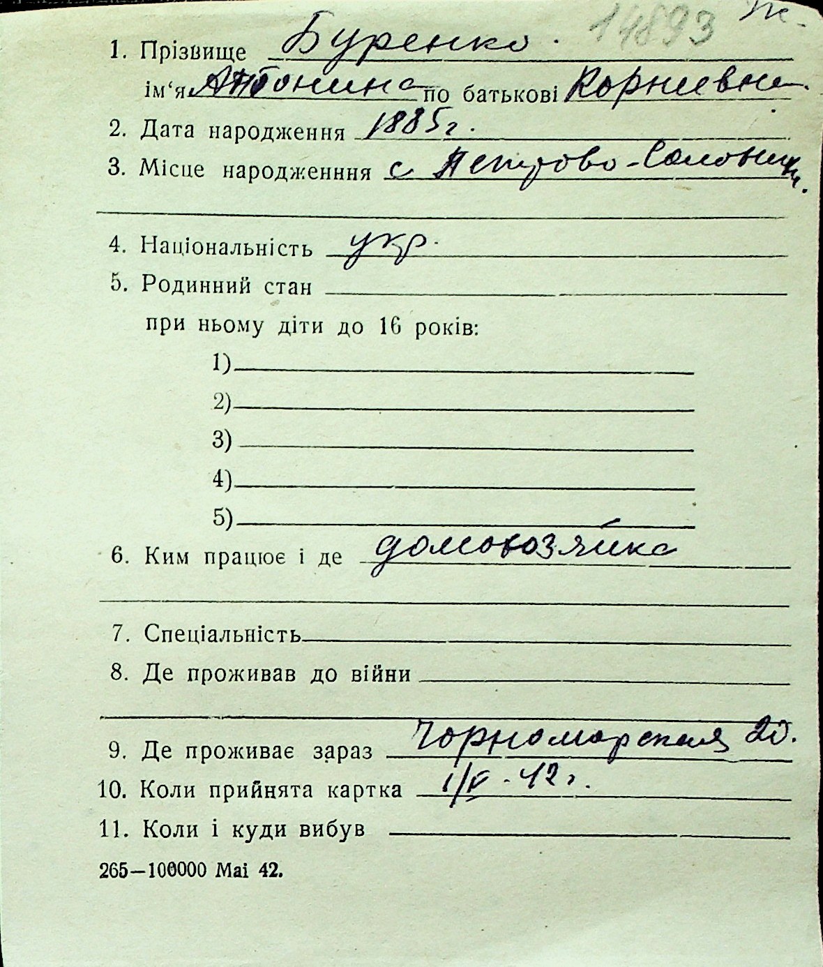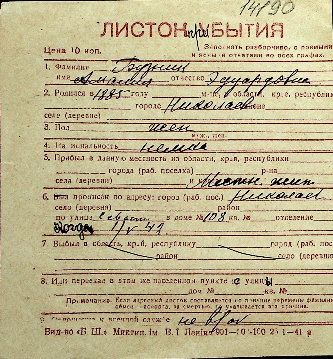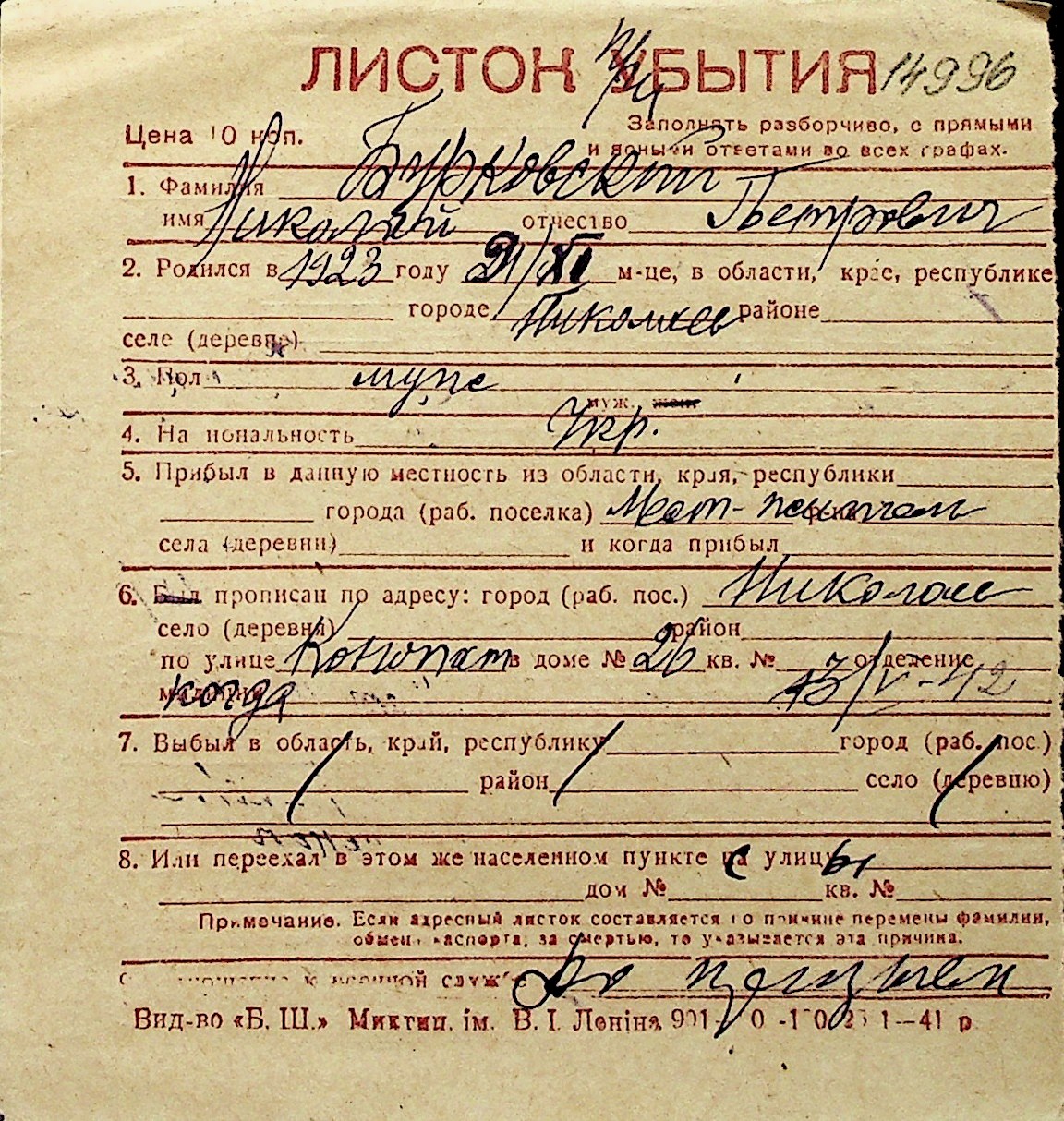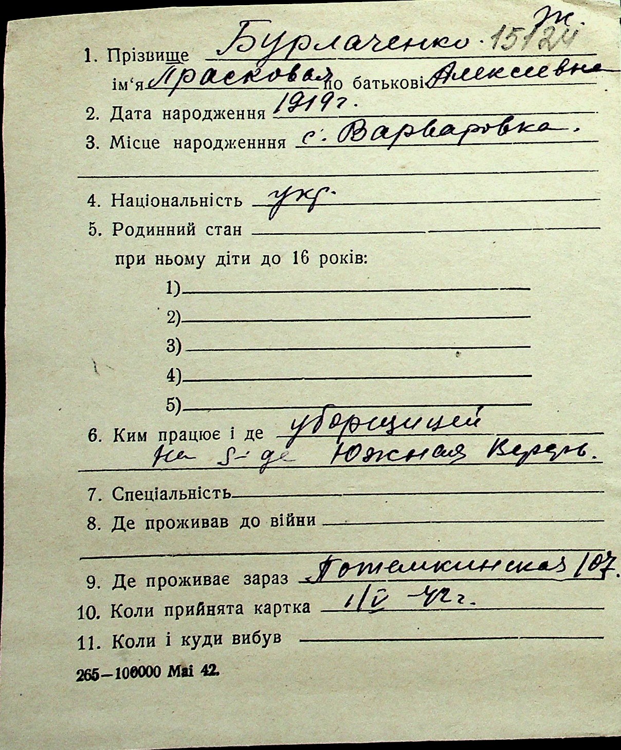 ◦ ◦ Перелік карток на осіб, які мешкали у м. Миколаїв у період окупації 1941–1944 років