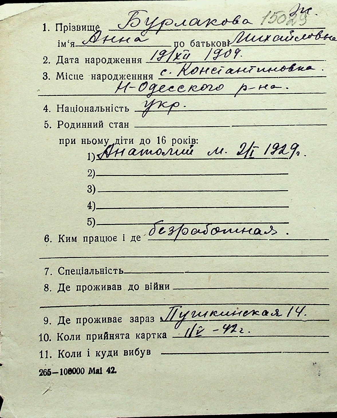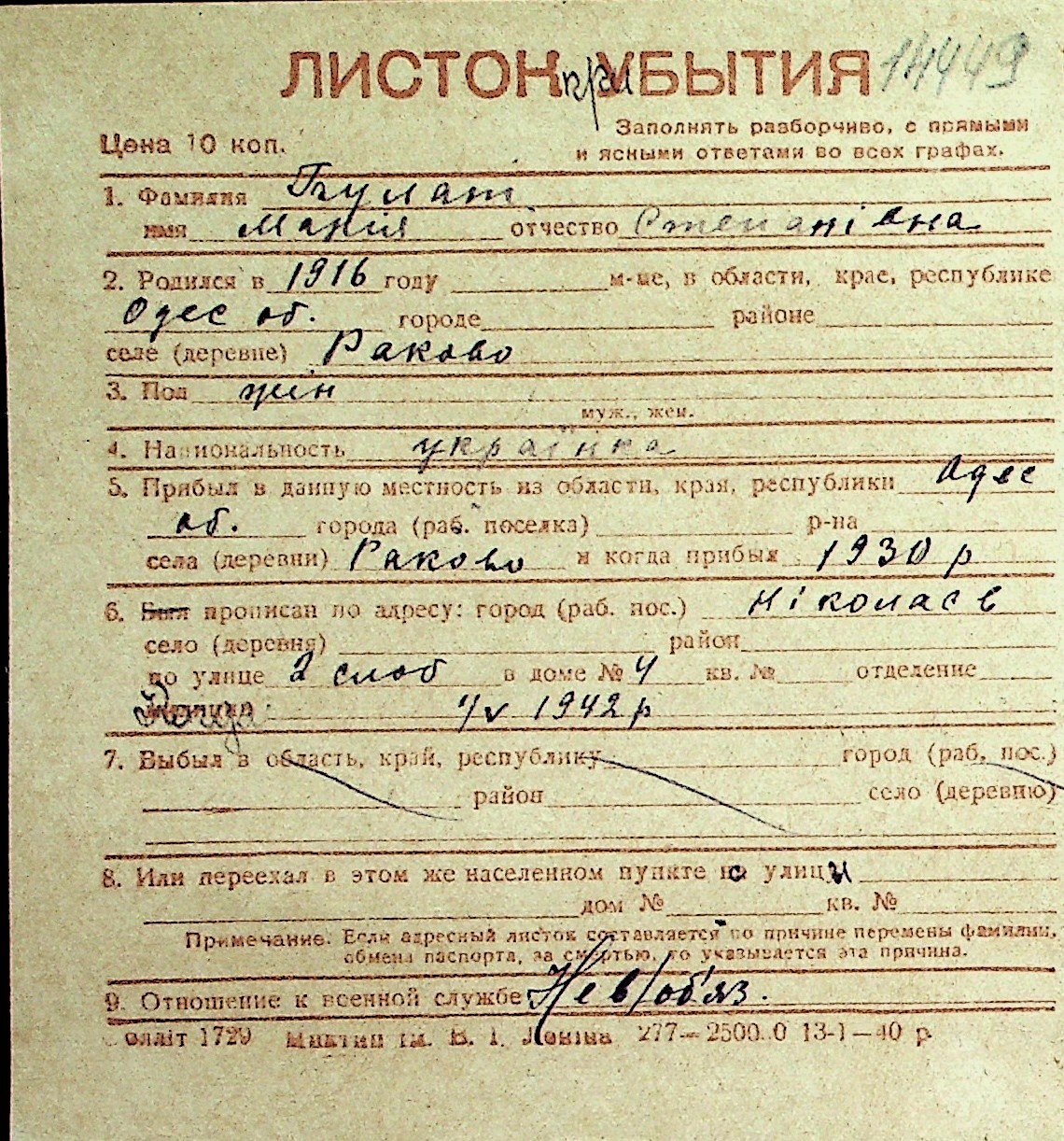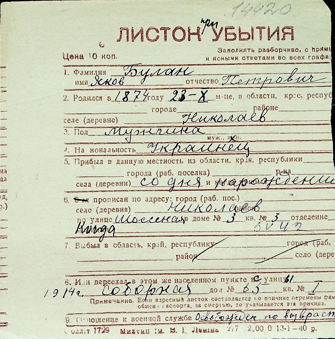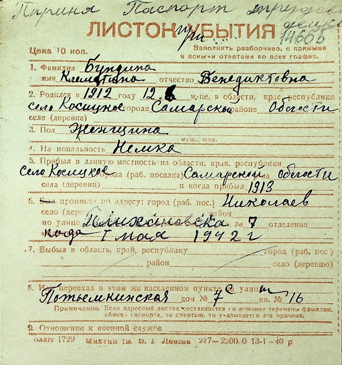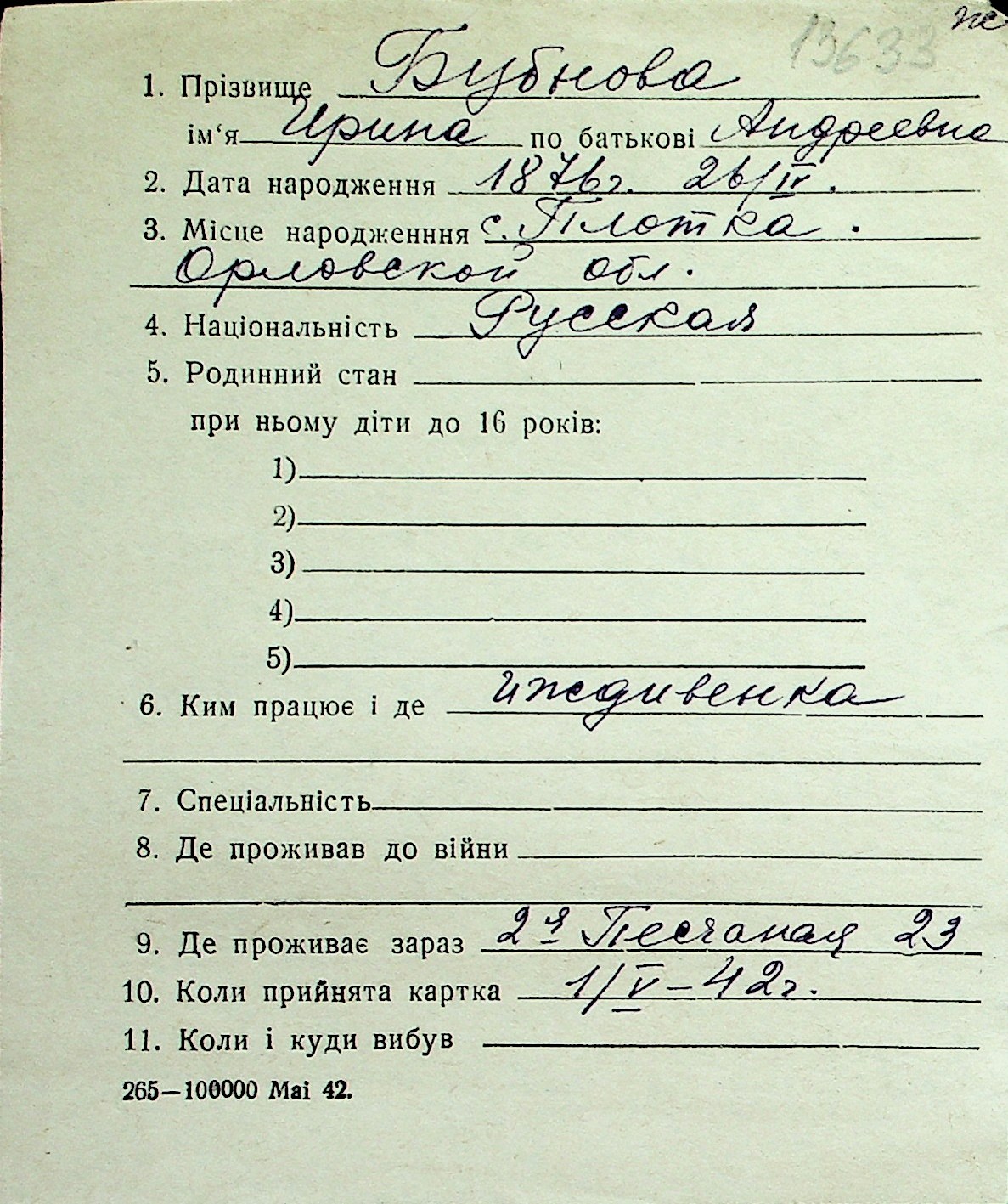 ◦ ◦ Перелік карток на осіб, які мешкали у м. Миколаїв у період окупації 1941–1944 років