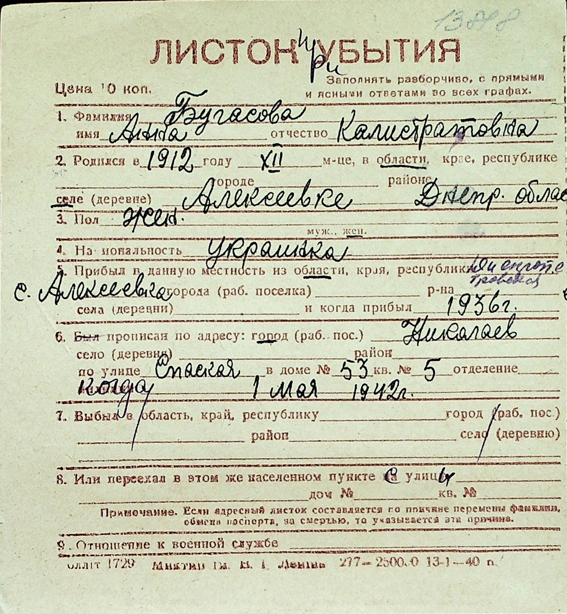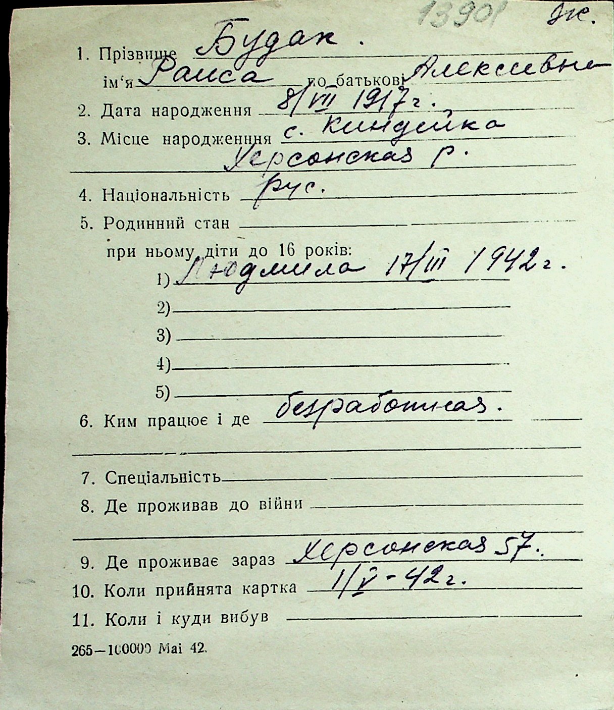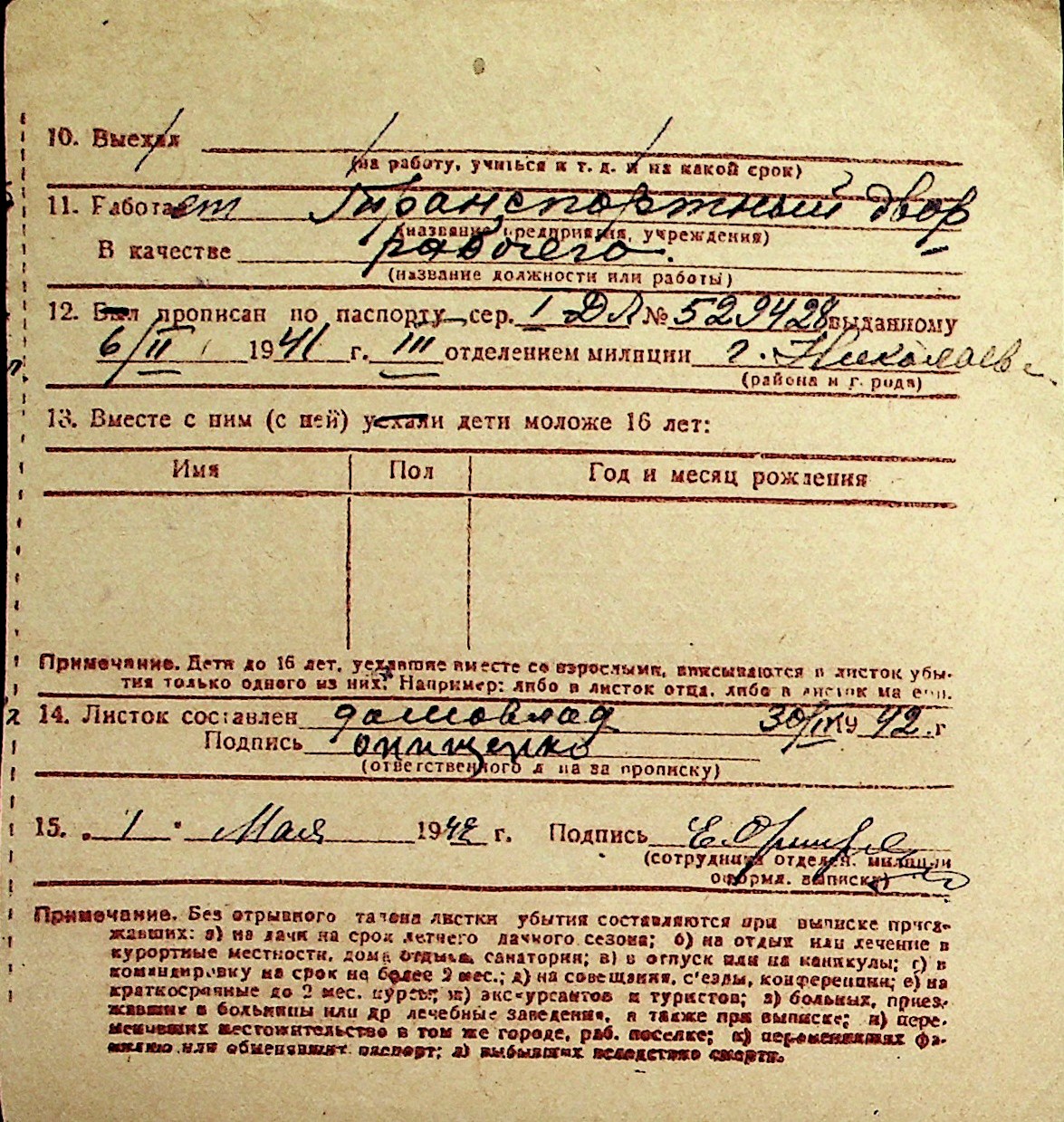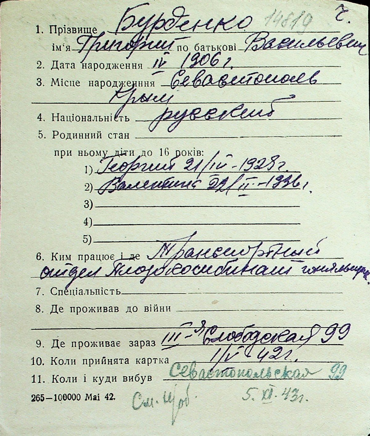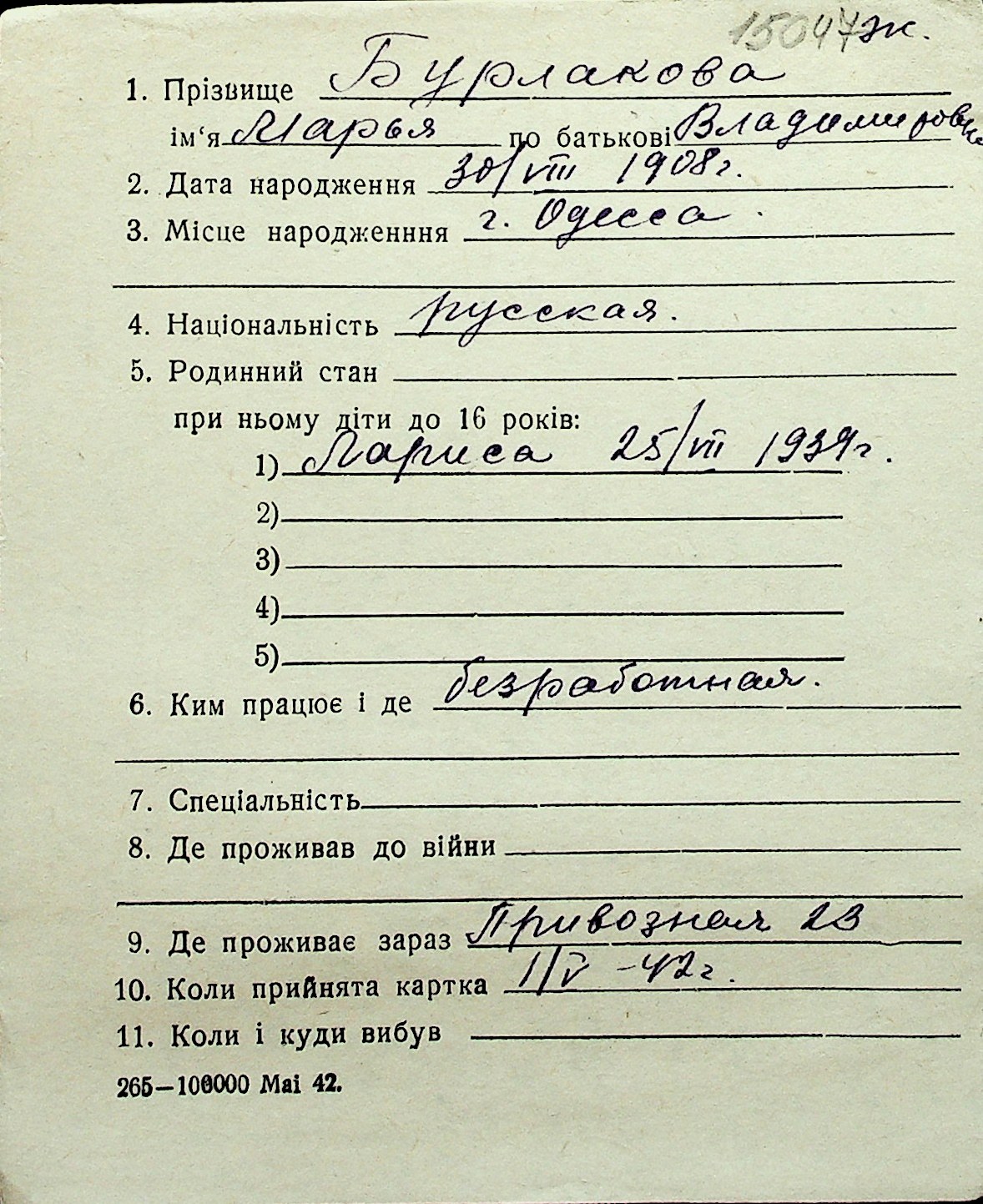 ◦ ◦ Перелік карток на осіб, які мешкали у м. Миколаїв у період окупації 1941–1944 років