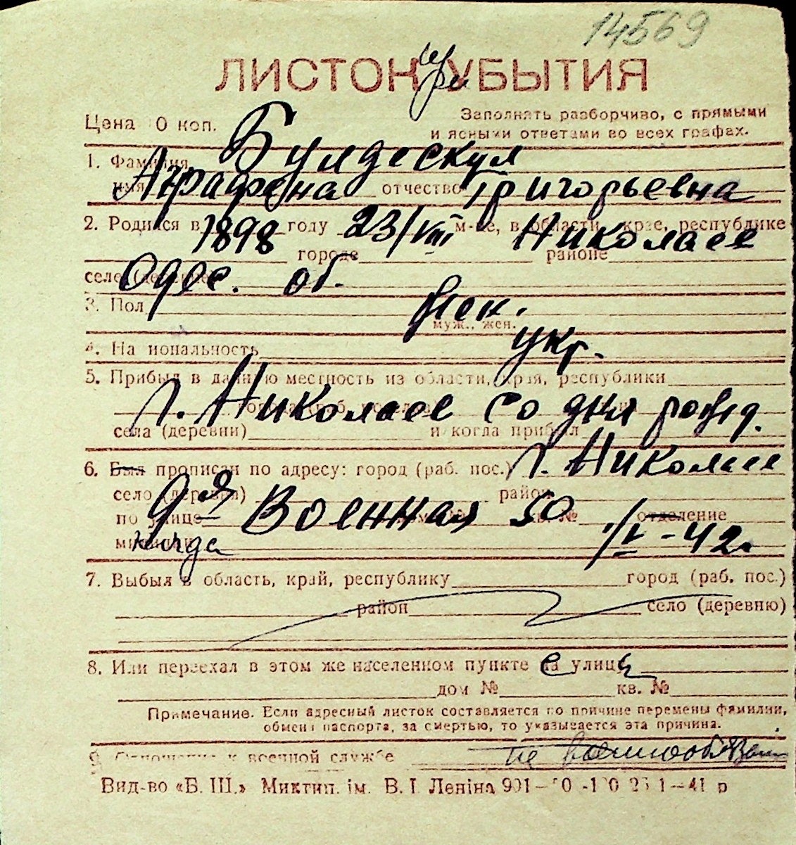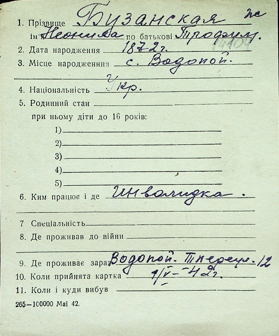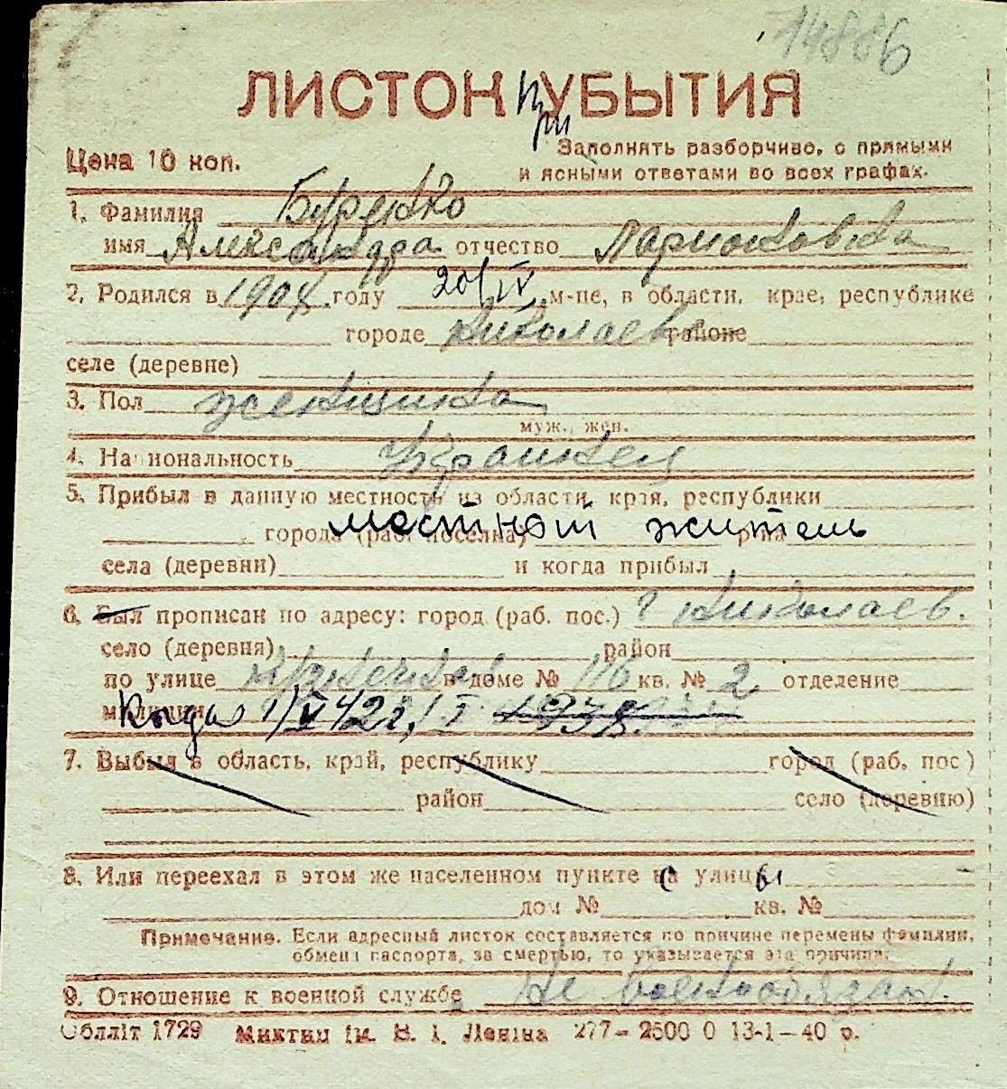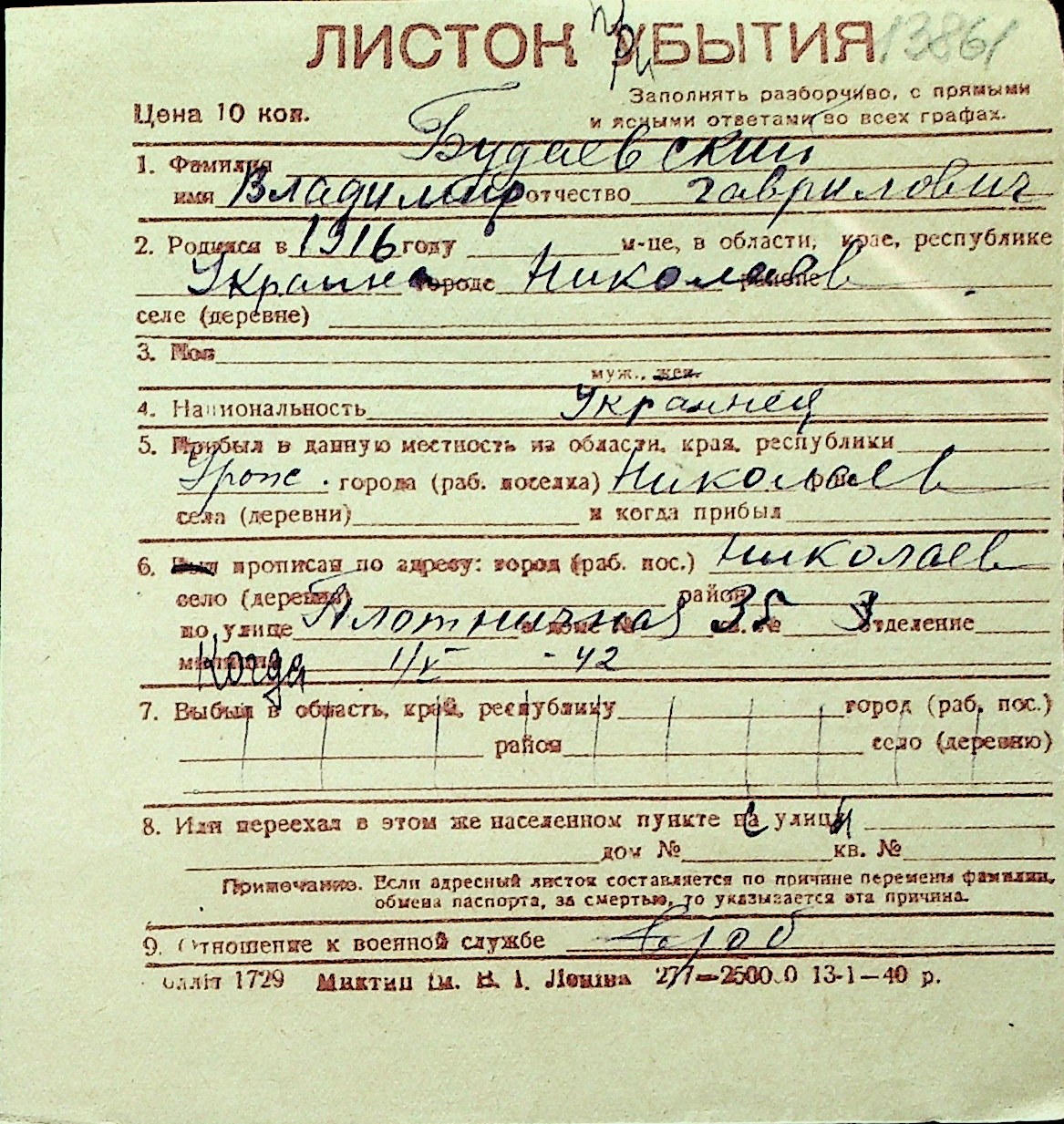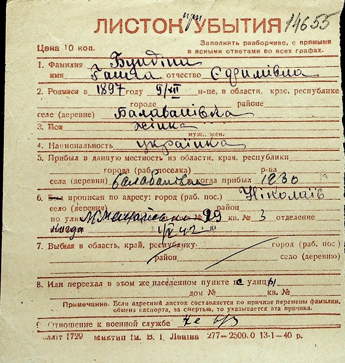 ◦ ◦ Перелік карток на осіб, які мешкали у м. Миколаїв у період окупації 1941–1944 років