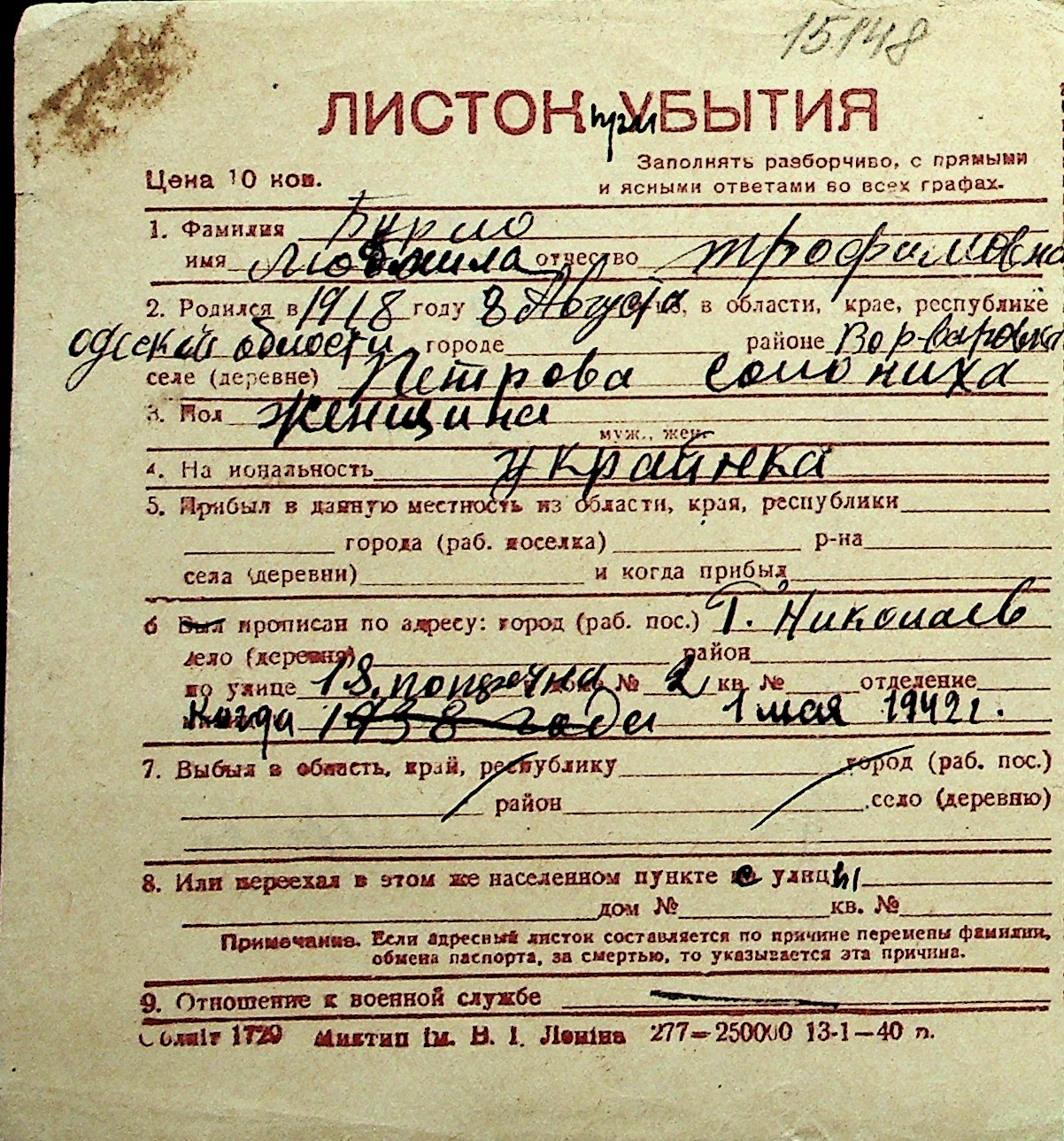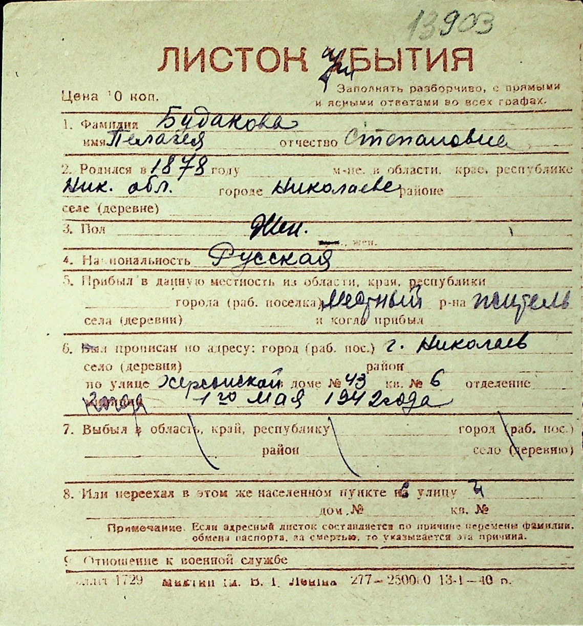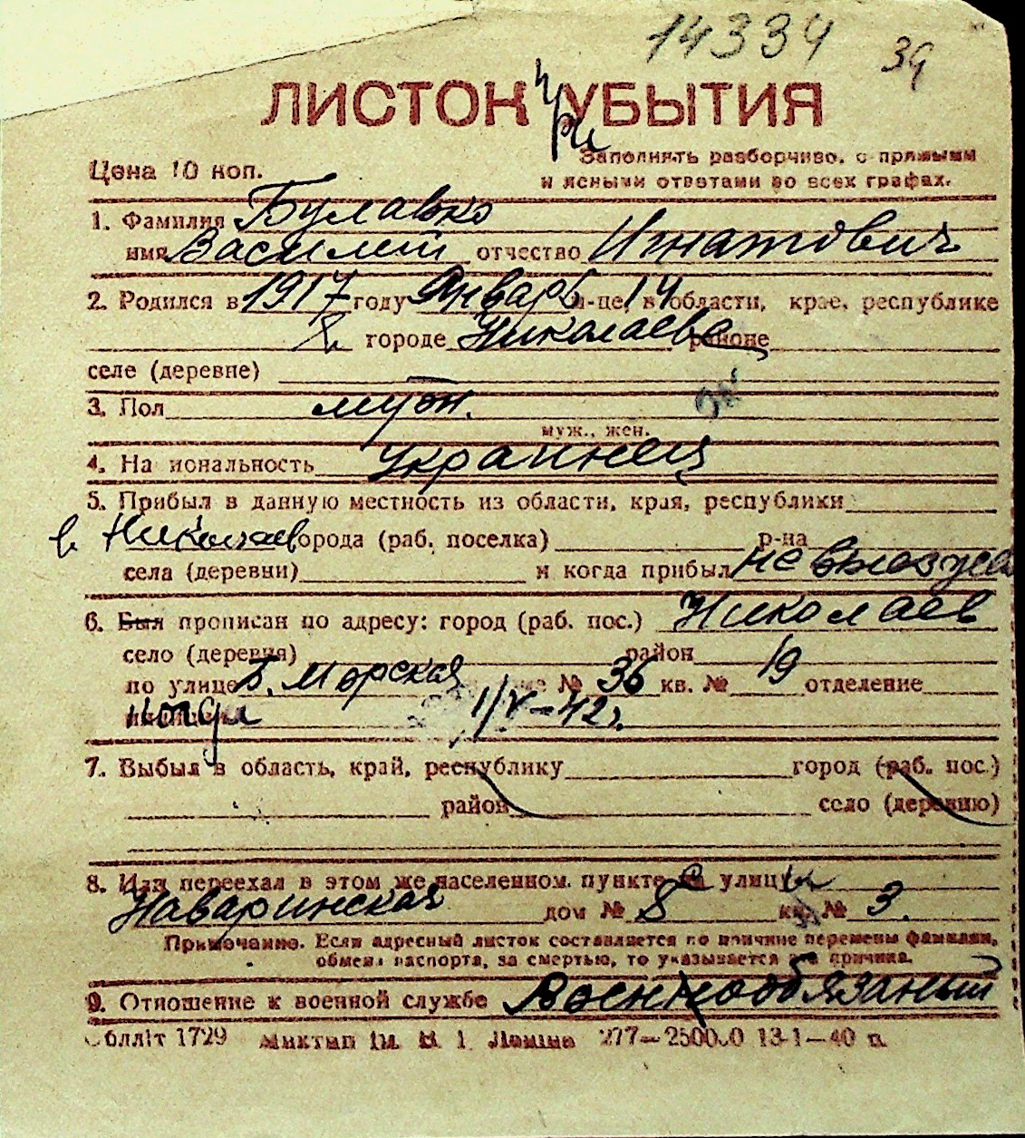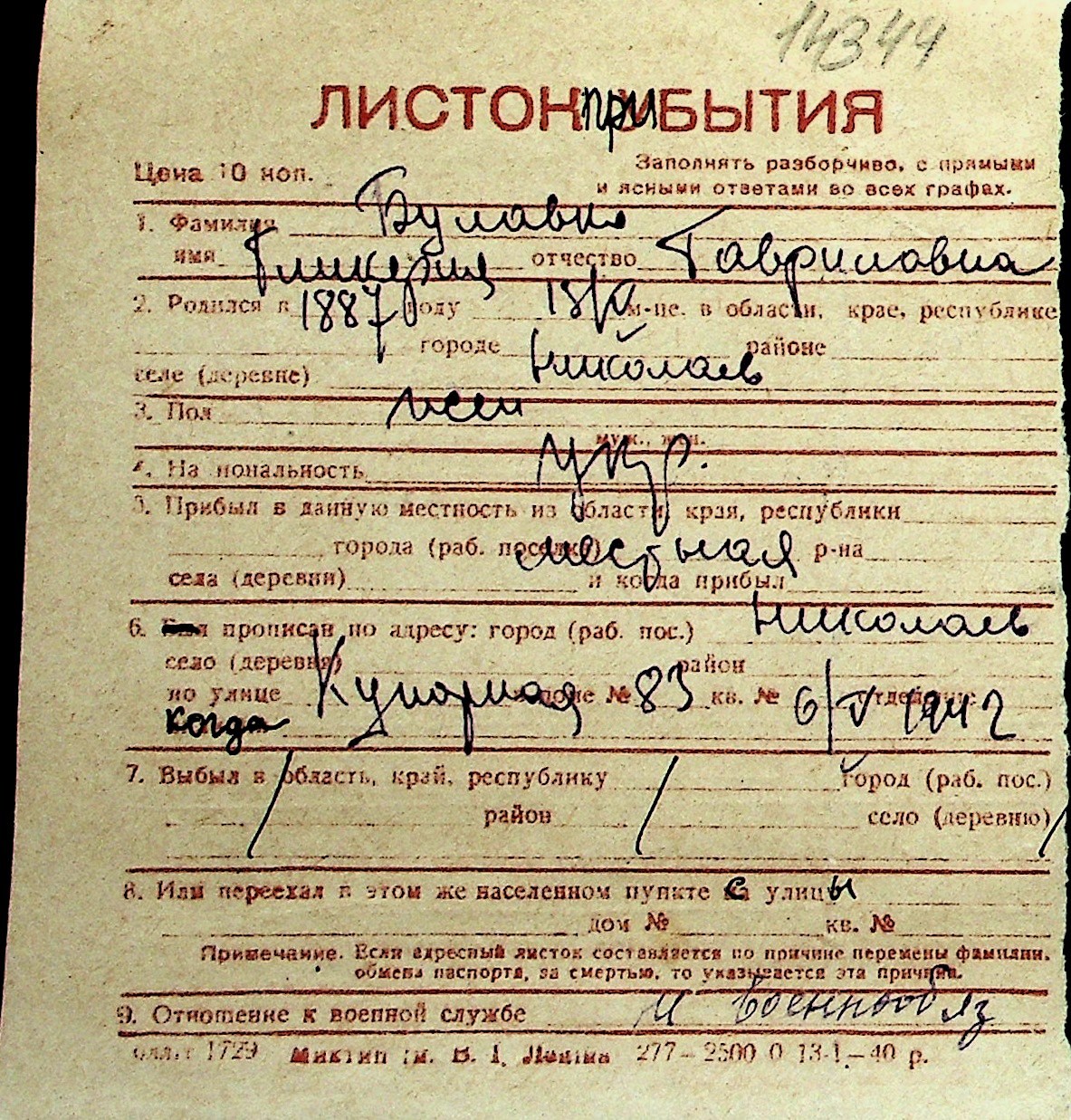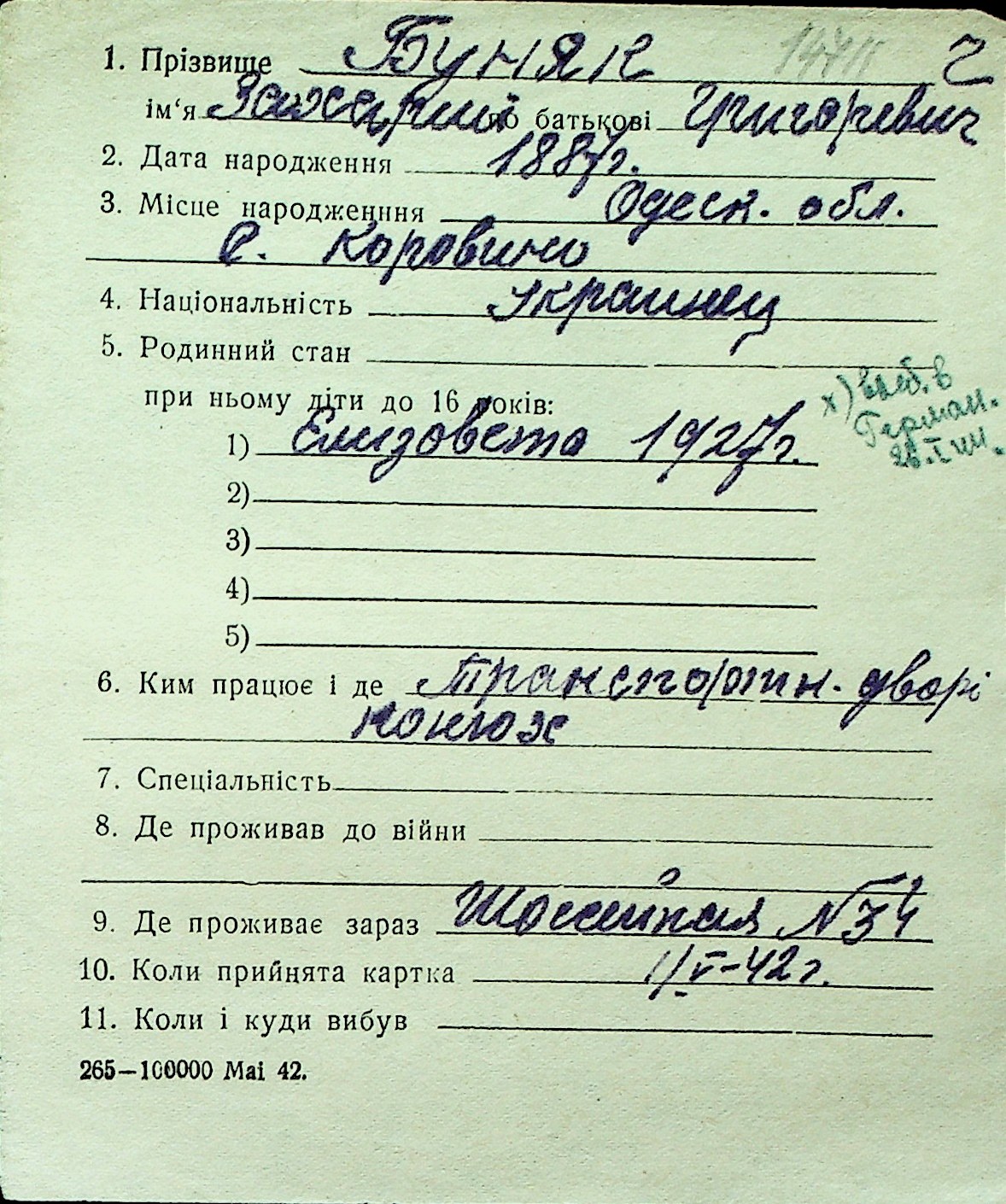 ◦ ◦ Перелік карток на осіб, які мешкали у м. Миколаїв у період окупації 1941–1944 років