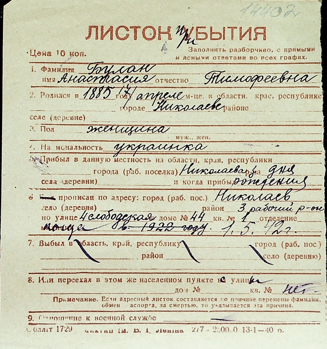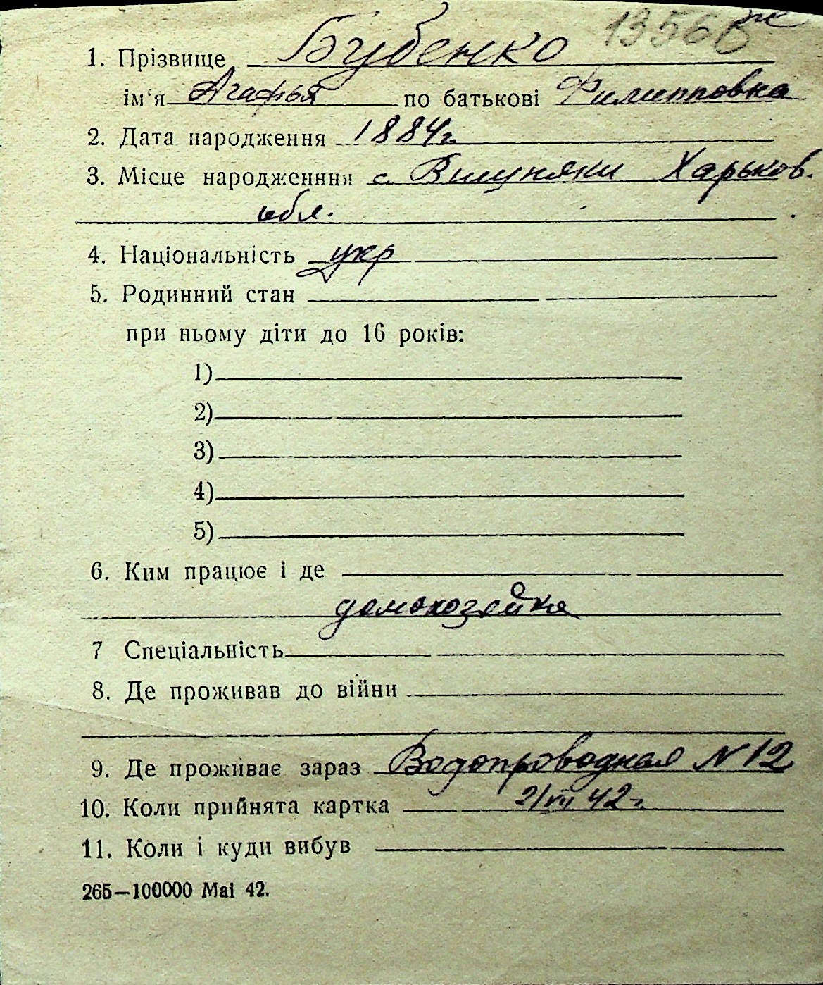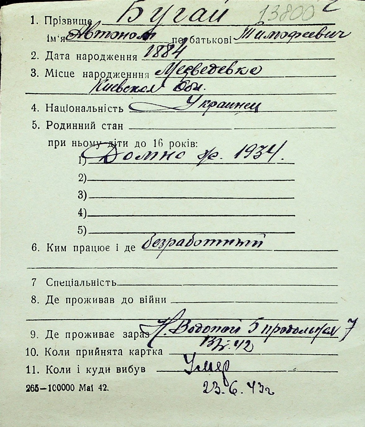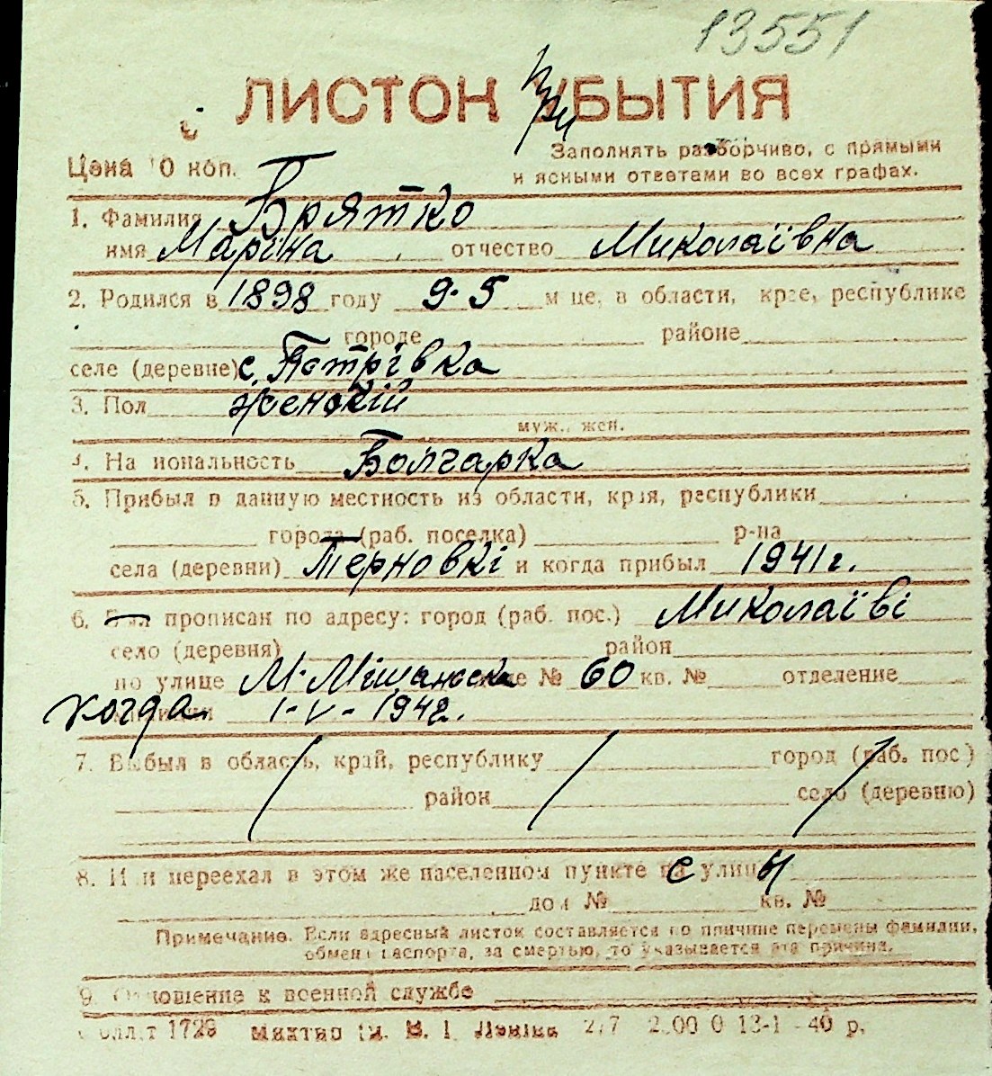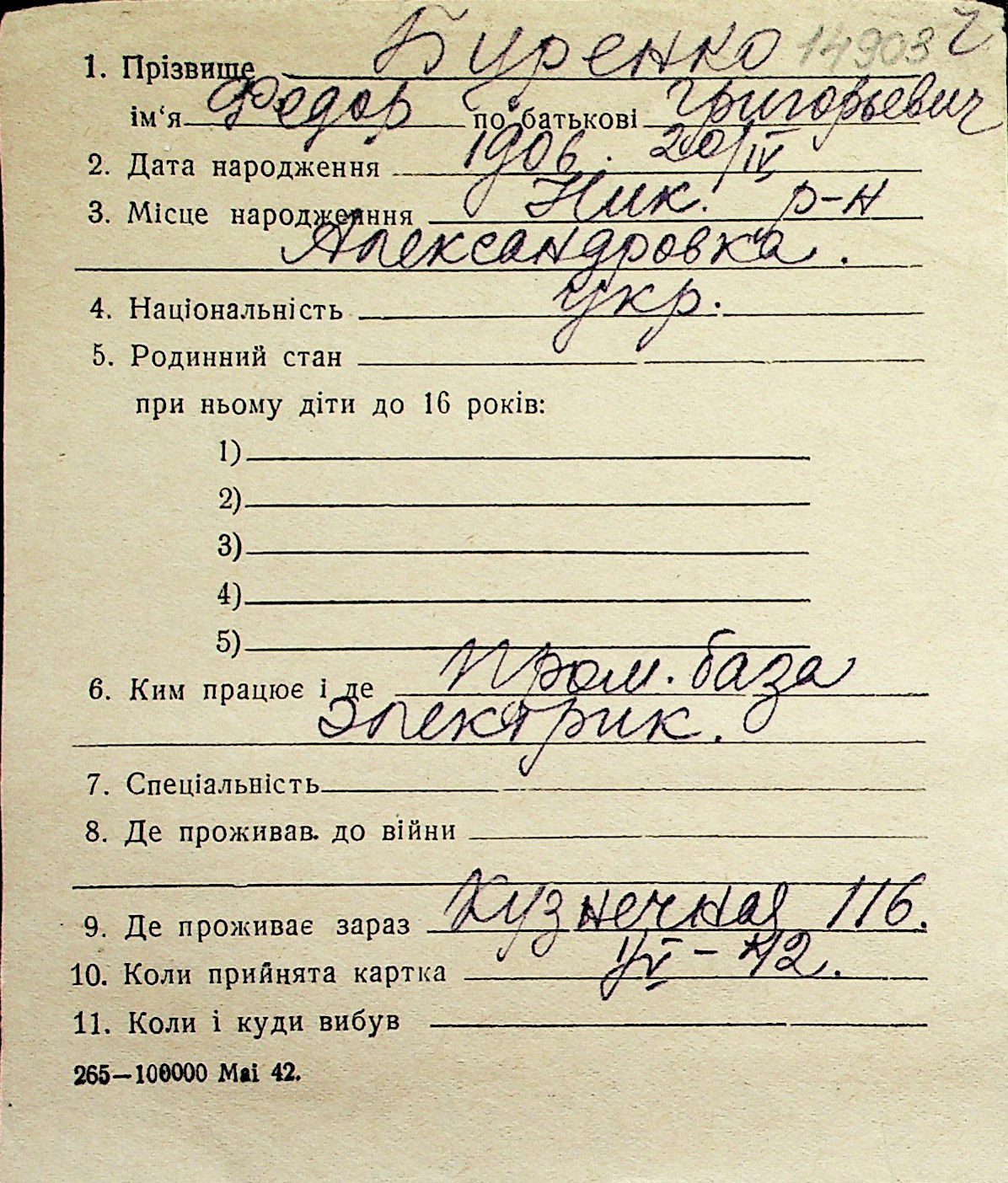◦ ◦ Перелік карток на осіб, які мешкали у м. Миколаїв у період окупації 1941–1944 років