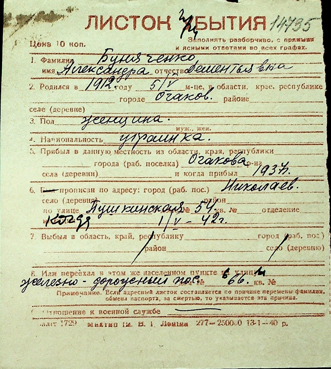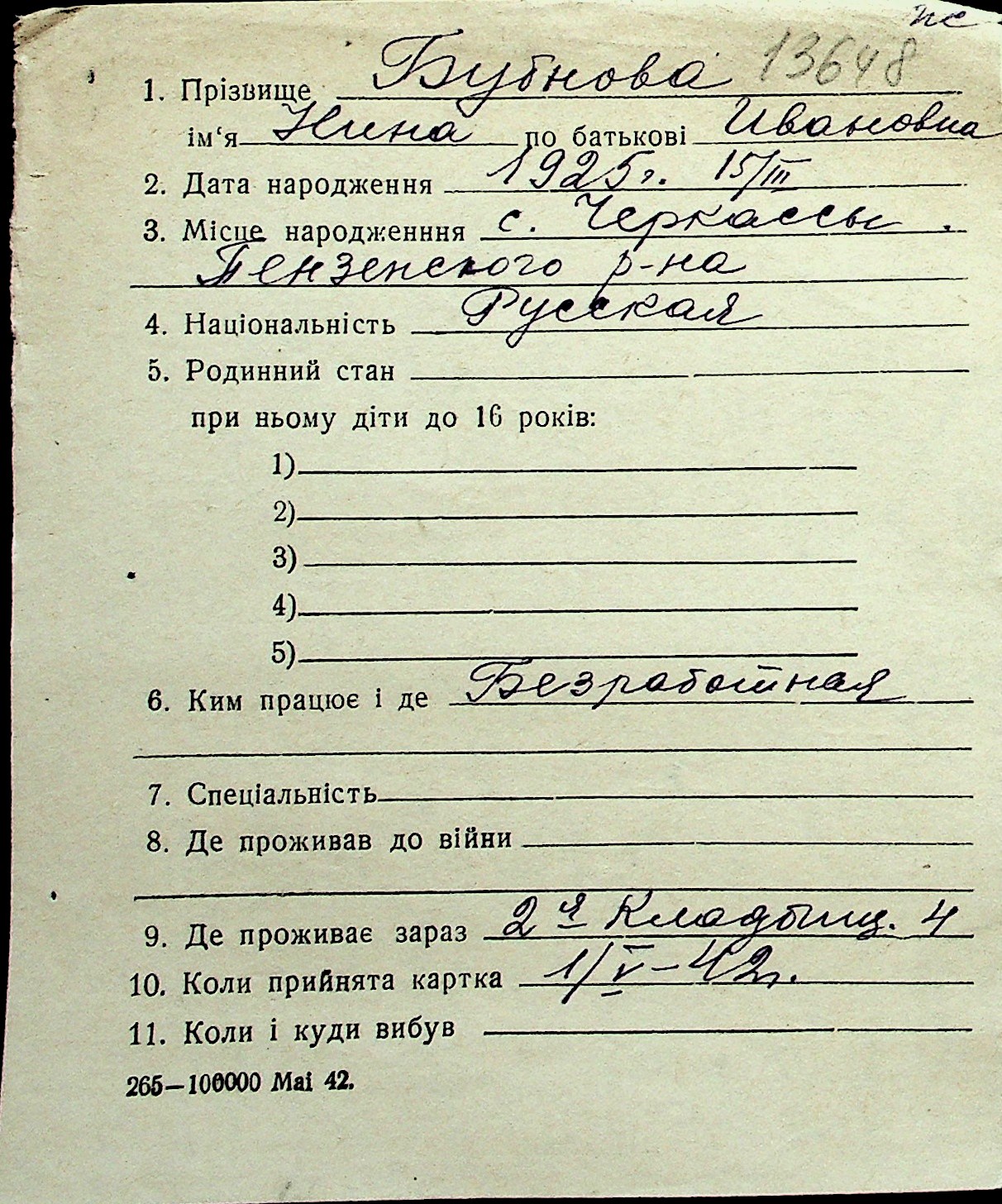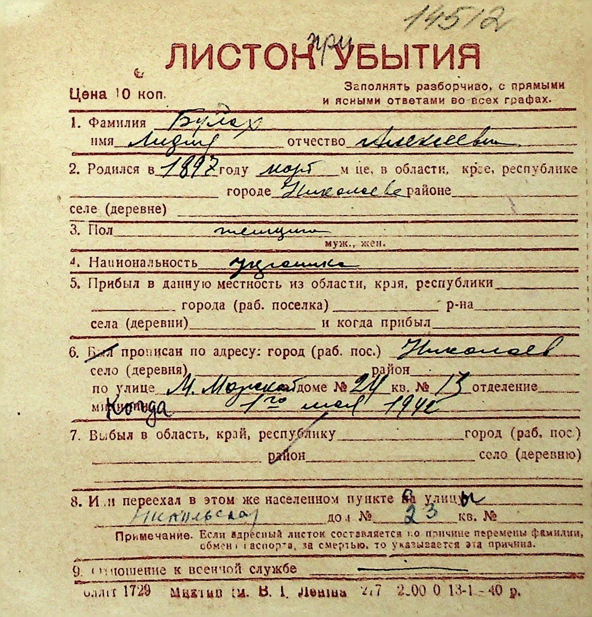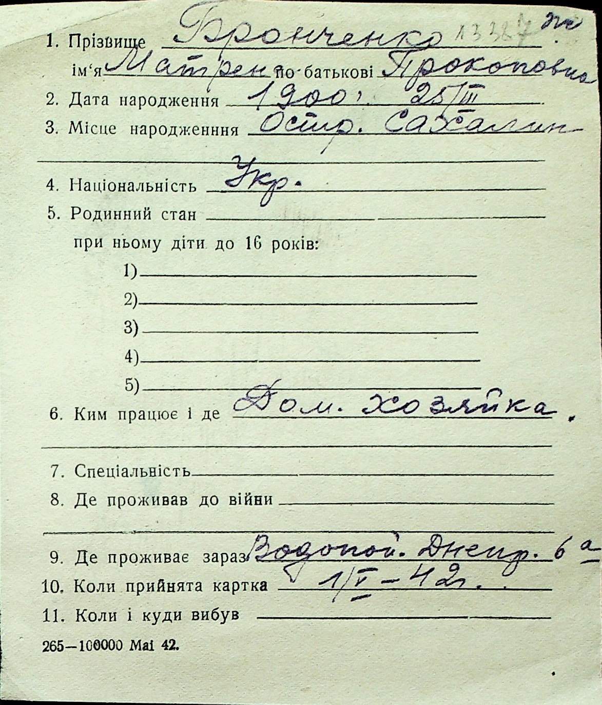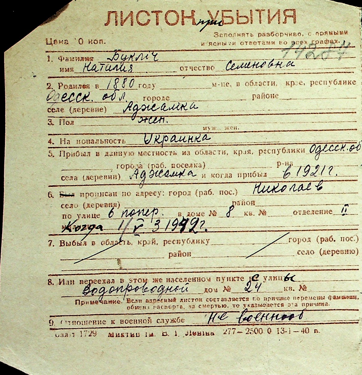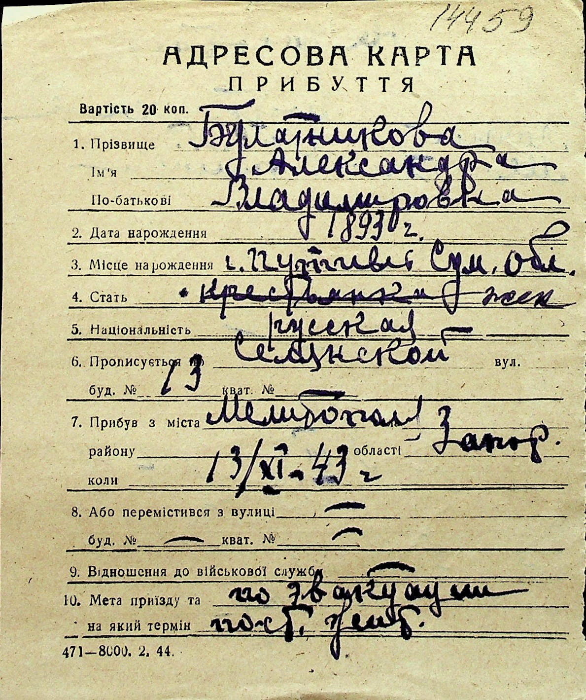 ◦ ◦ Перелік карток на осіб, які мешкали у м. Миколаїв у період окупації 1941–1944 років