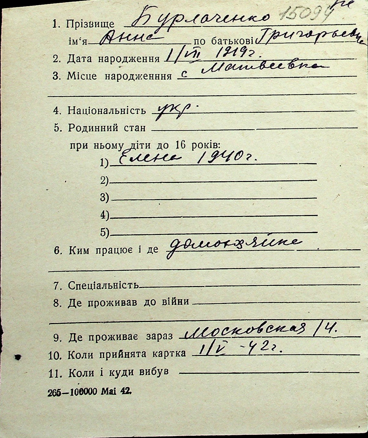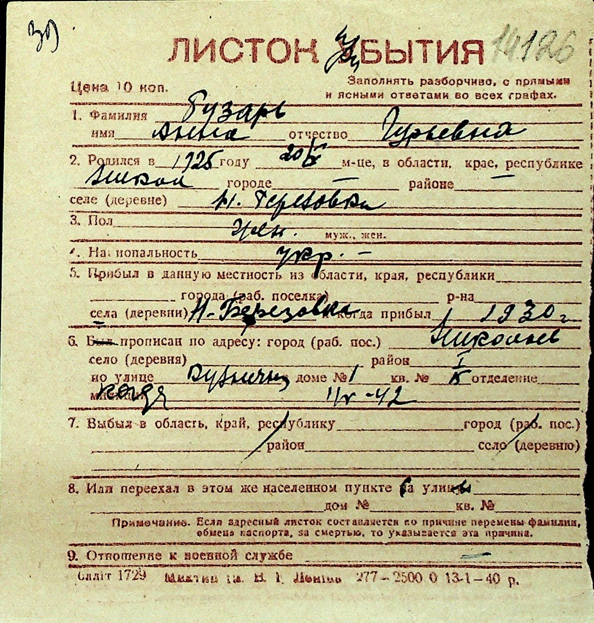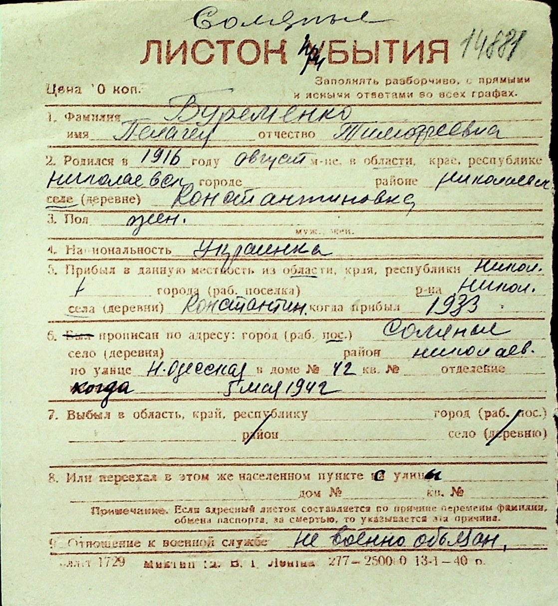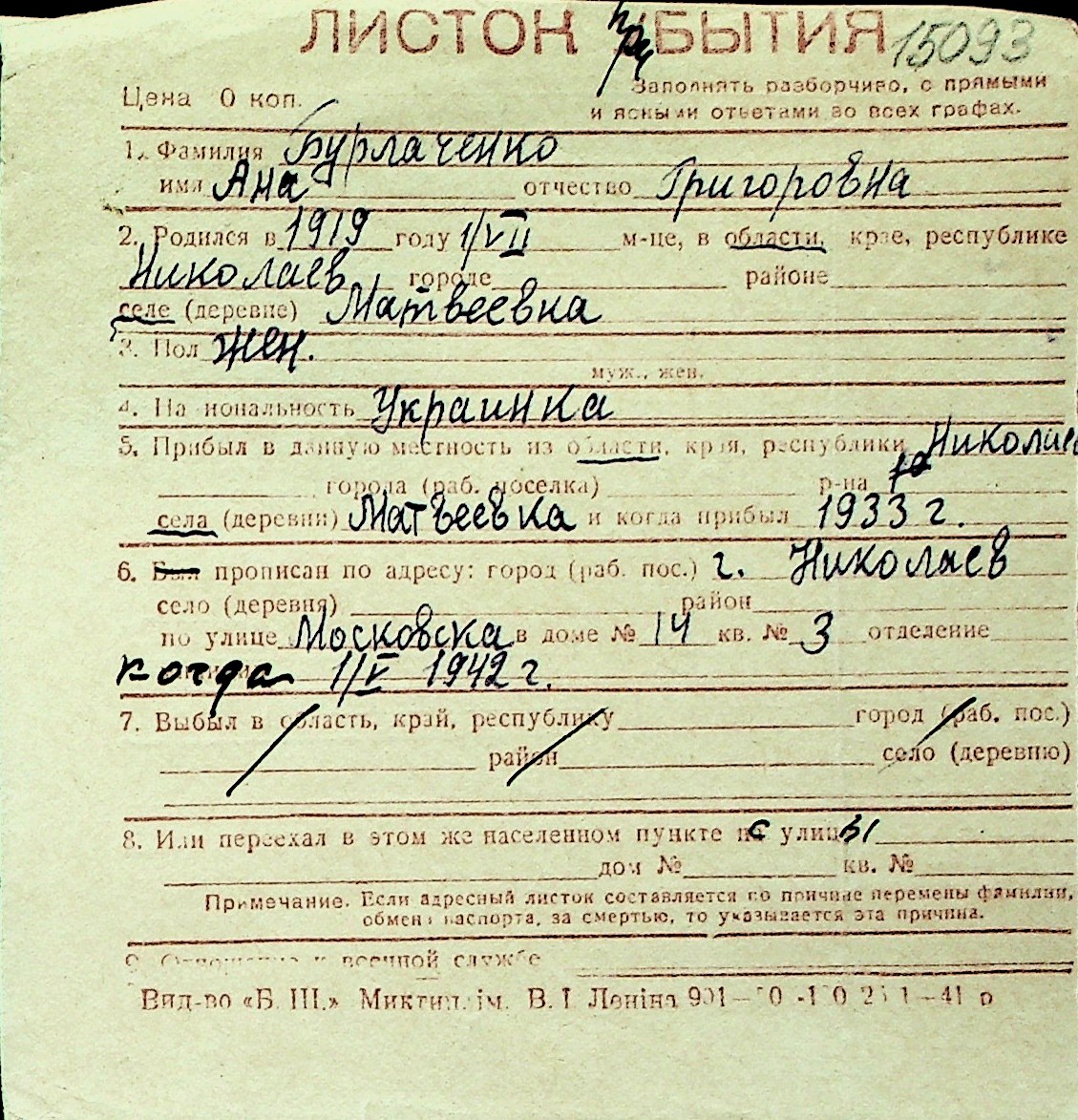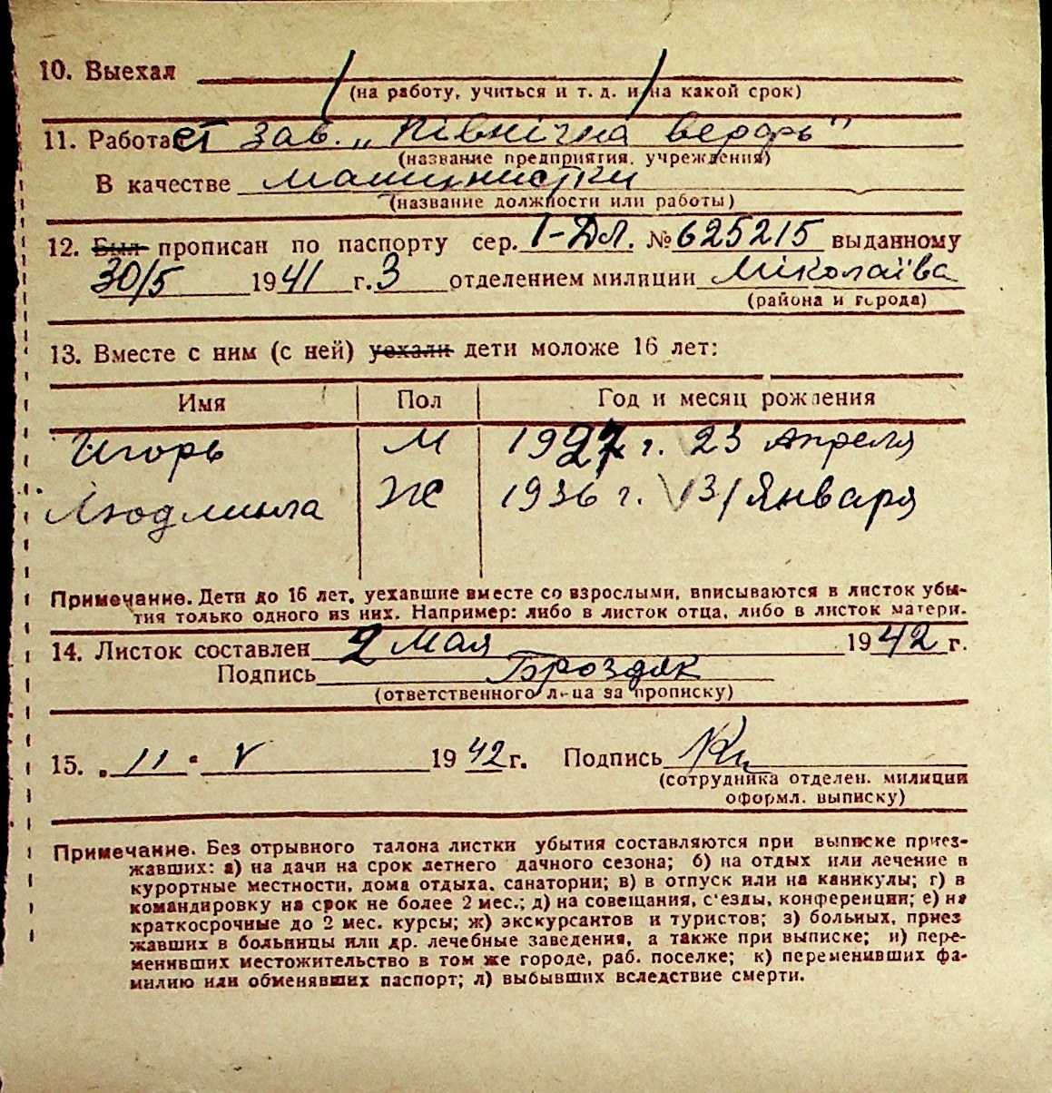 ◦ ◦ Перелік карток на осіб, які мешкали у м. Миколаїв у період окупації 1941–1944 років