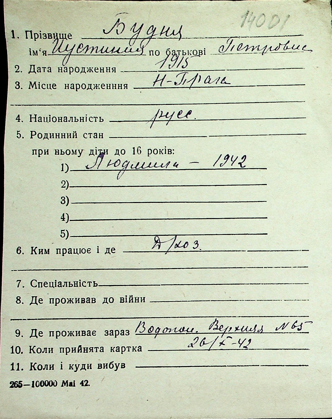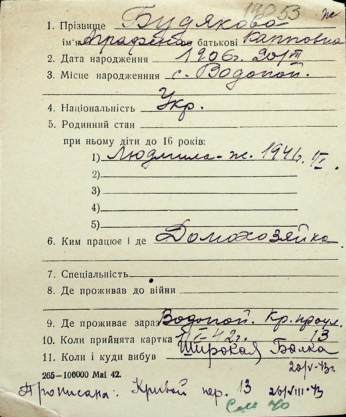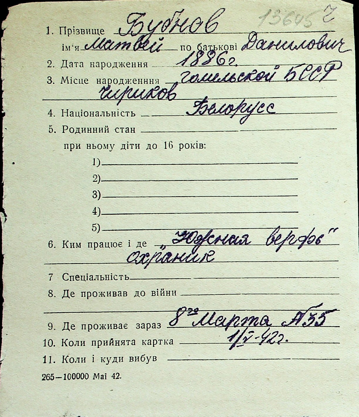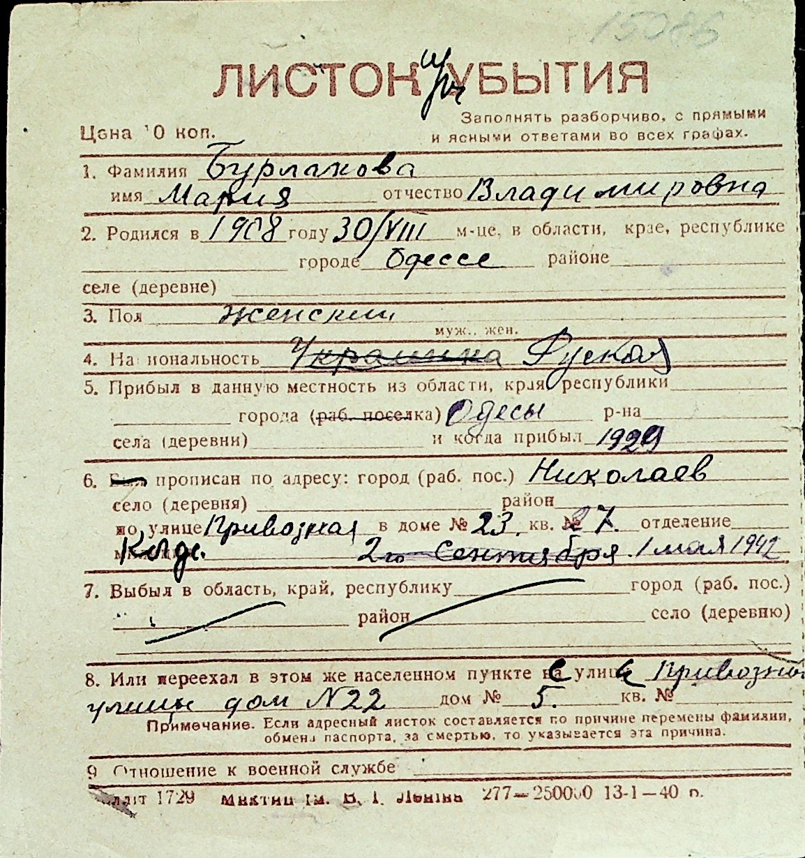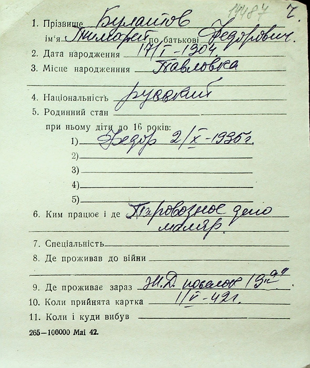 ◦ ◦ Перелік карток на осіб, які мешкали у м. Миколаїв у період окупації 1941–1944 років