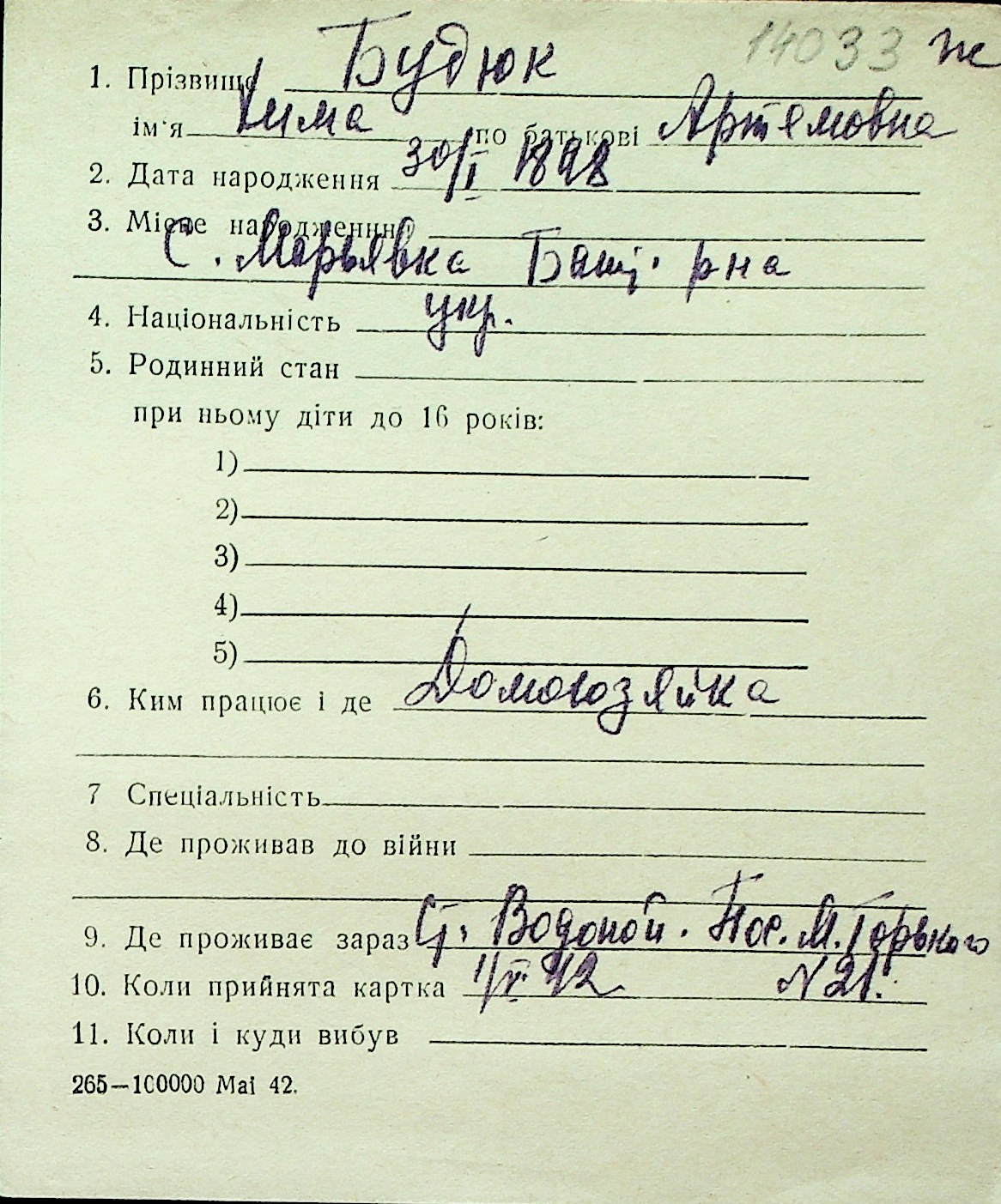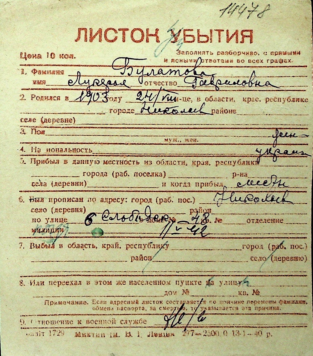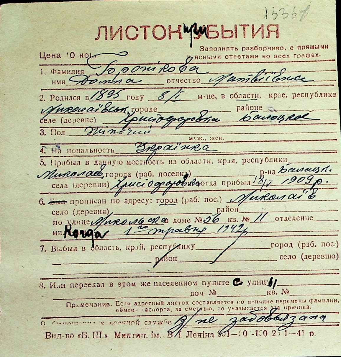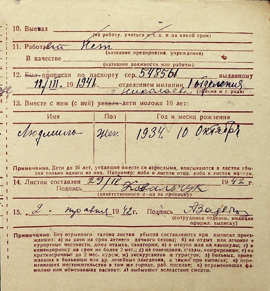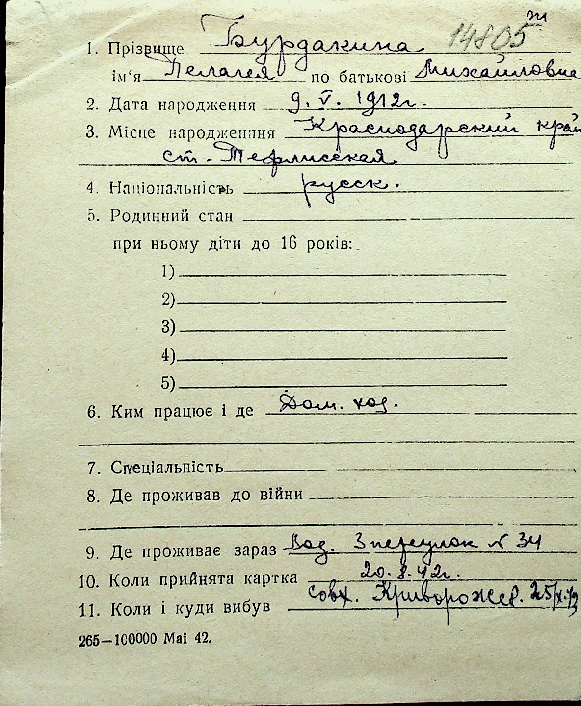 ◦ ◦ Перелік карток на осіб, які мешкали у м. Миколаїв у період окупації 1941–1944 років