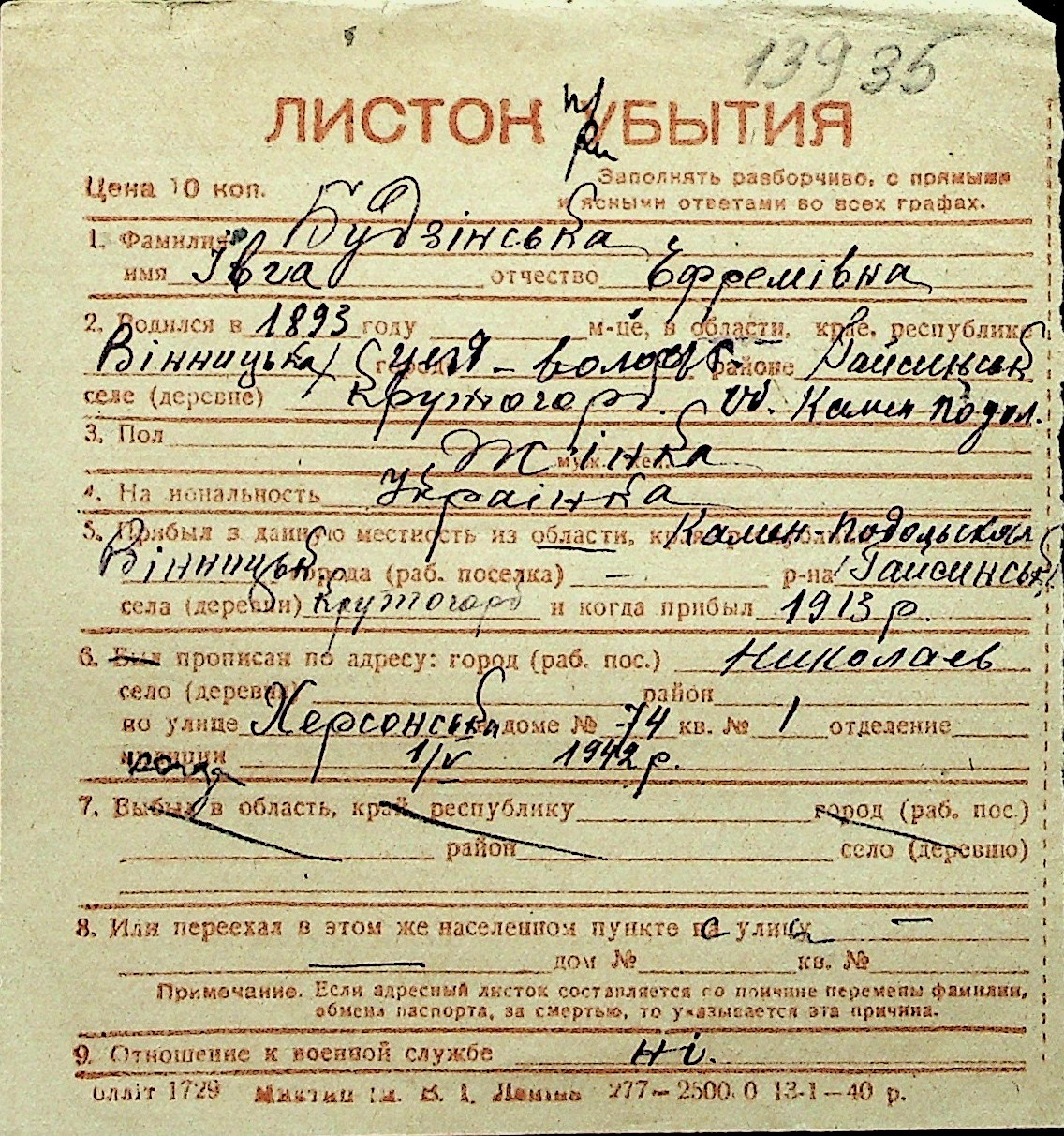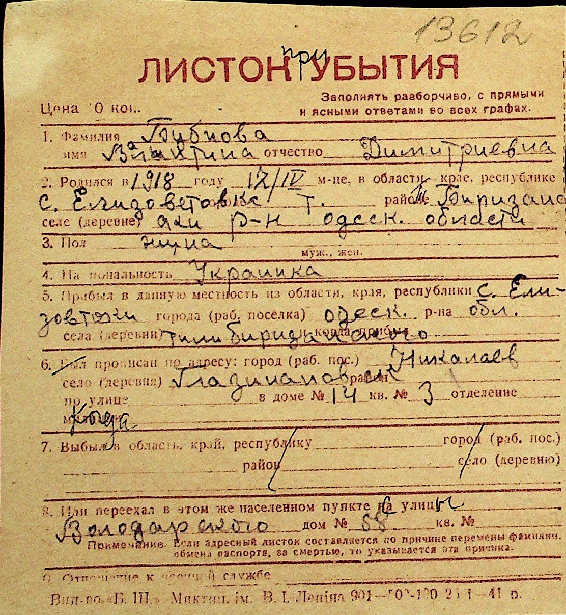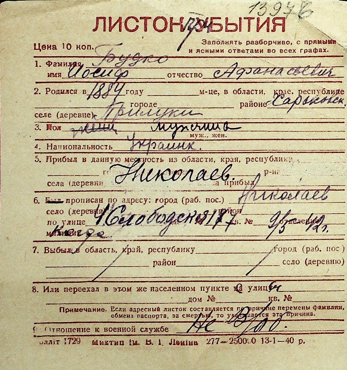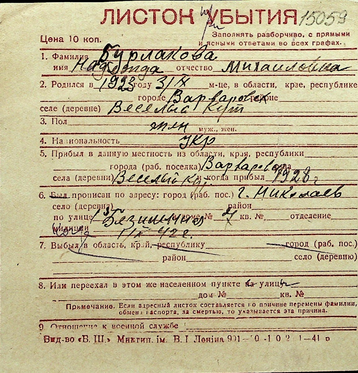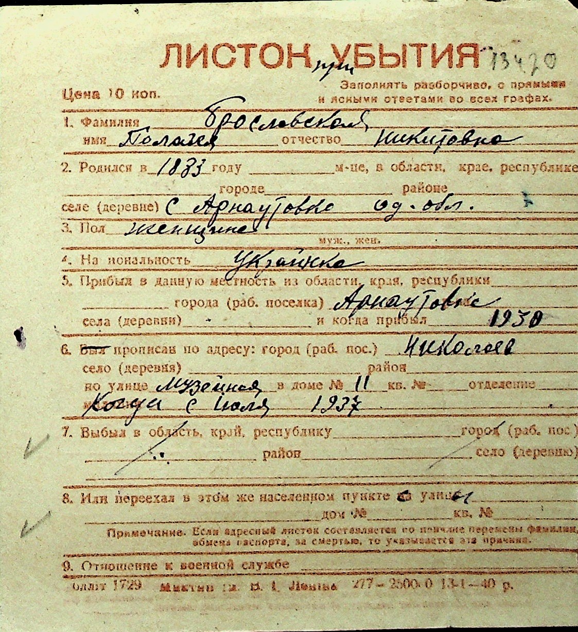 ◦ ◦ Перелік карток на осіб, які мешкали у м. Миколаїв у період окупації 1941–1944 років