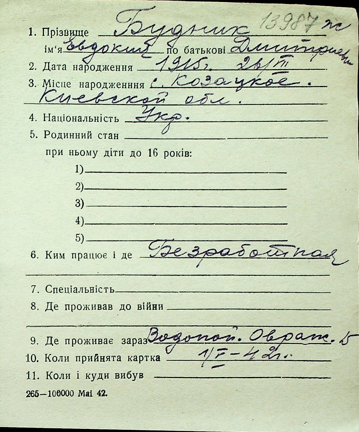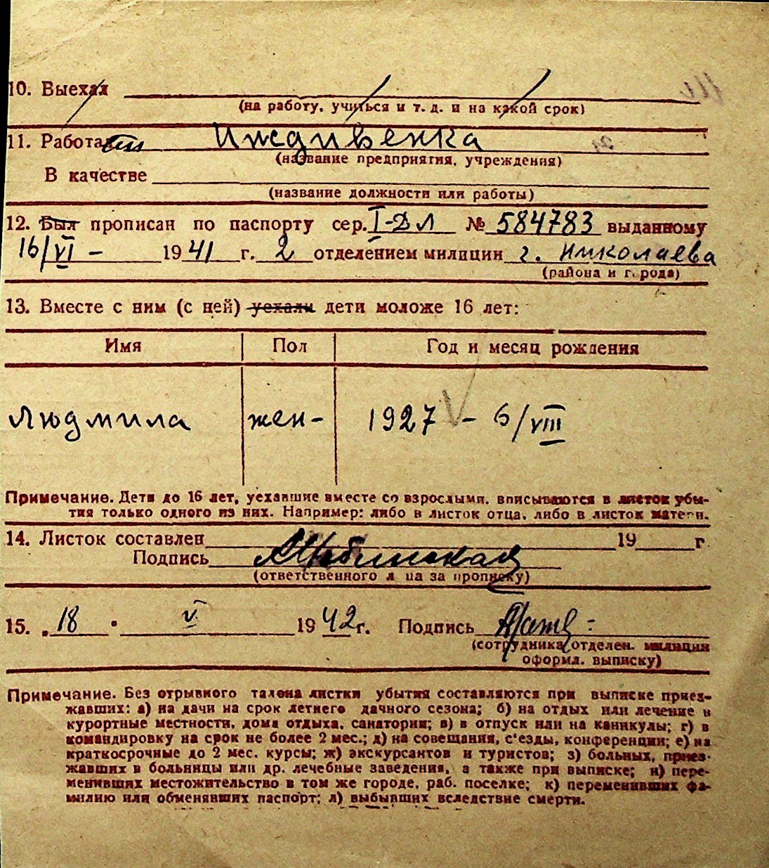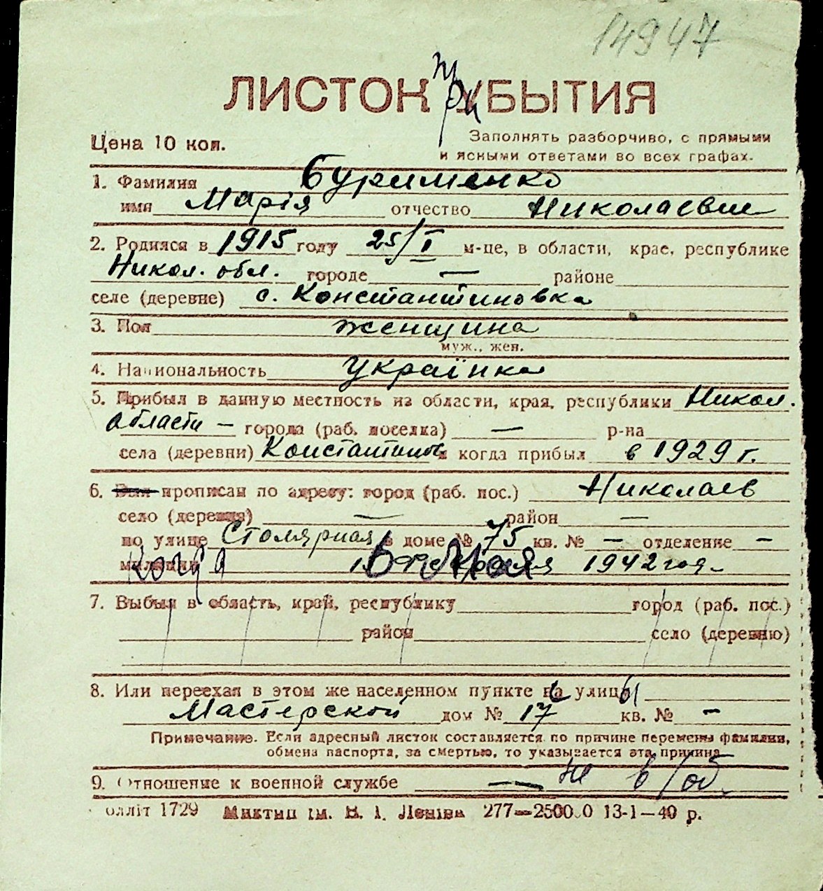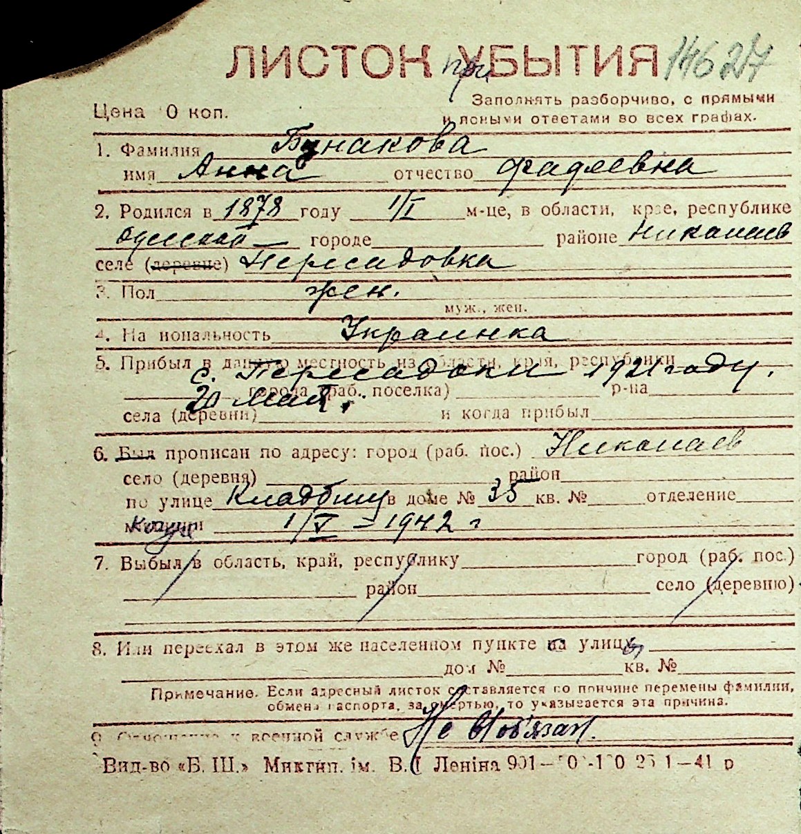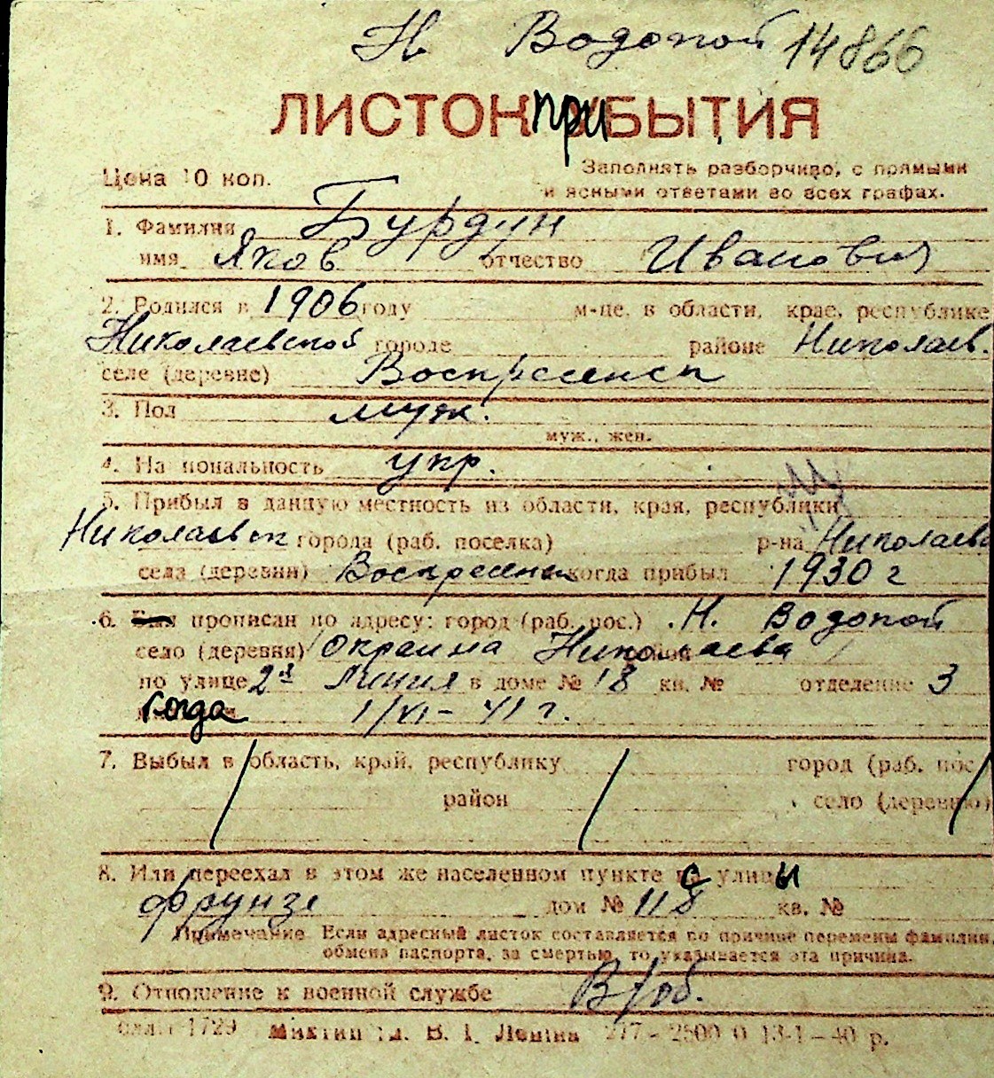 ◦ ◦ Перелік карток на осіб, які мешкали у м. Миколаїв у період окупації 1941–1944 років