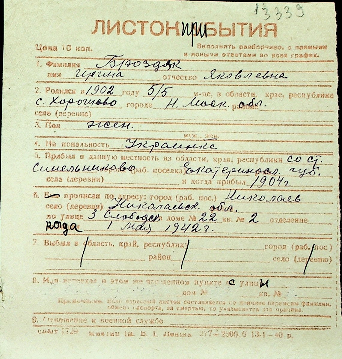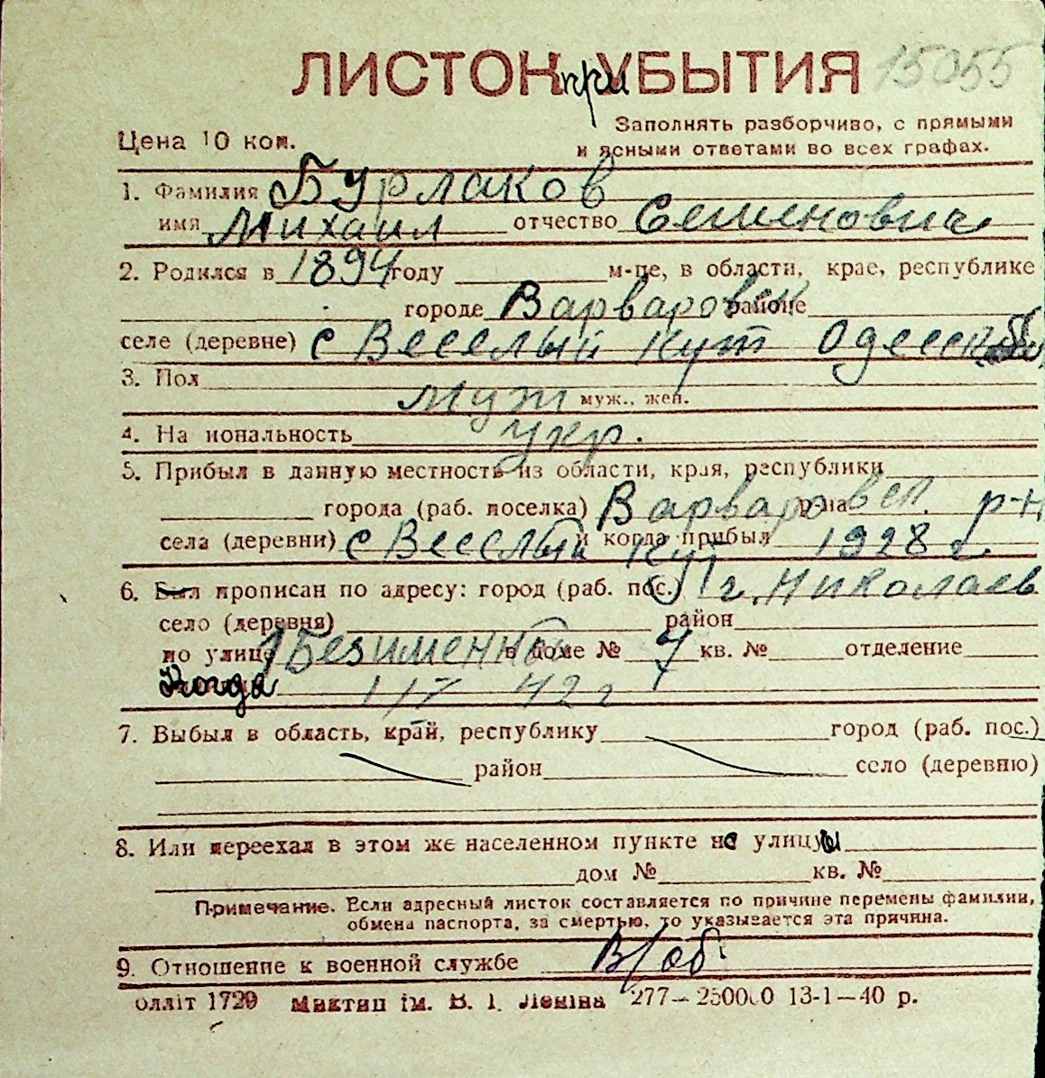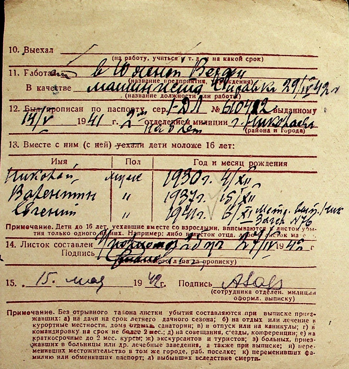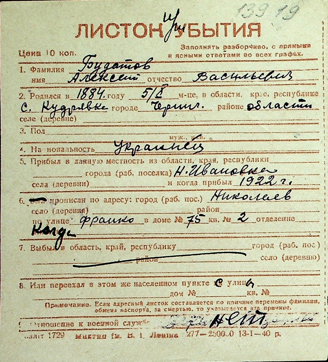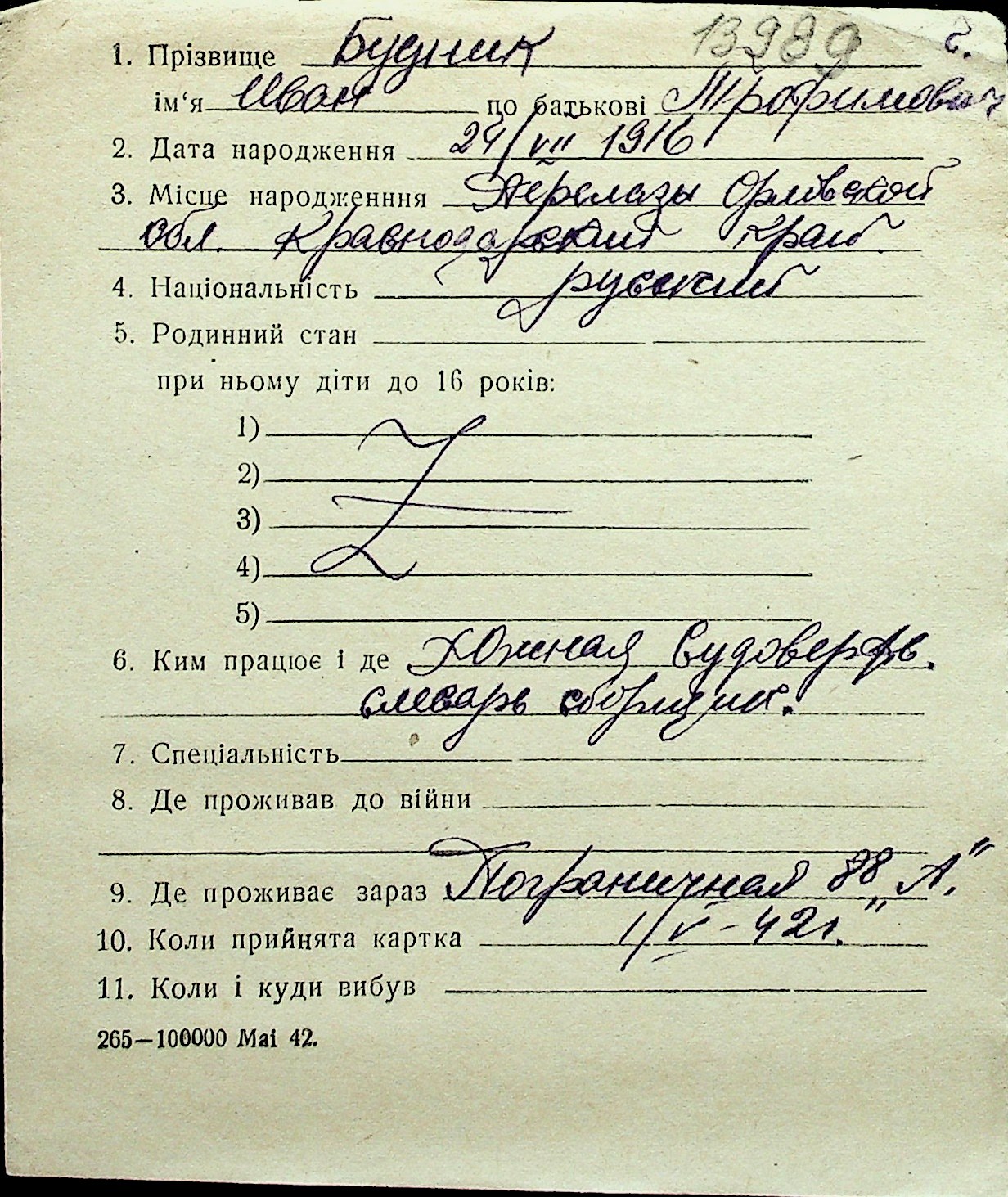 ◦ ◦ Перелік карток на осіб, які мешкали у м. Миколаїв у період окупації 1941–1944 років
