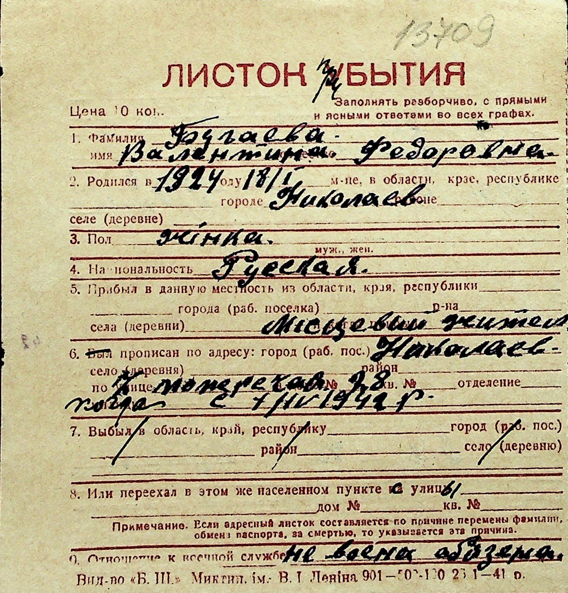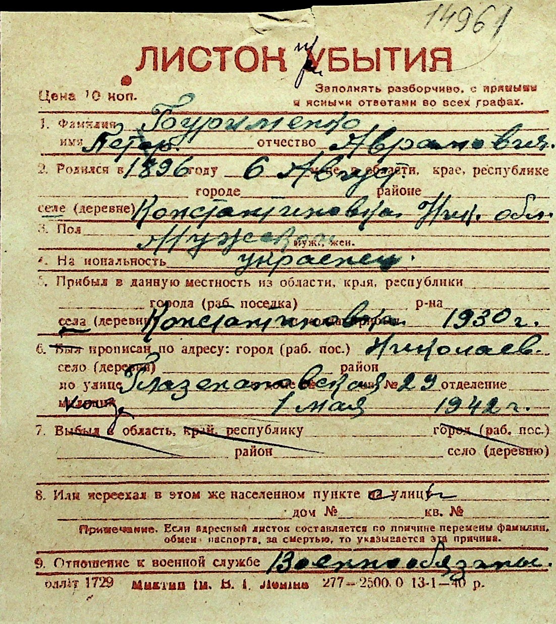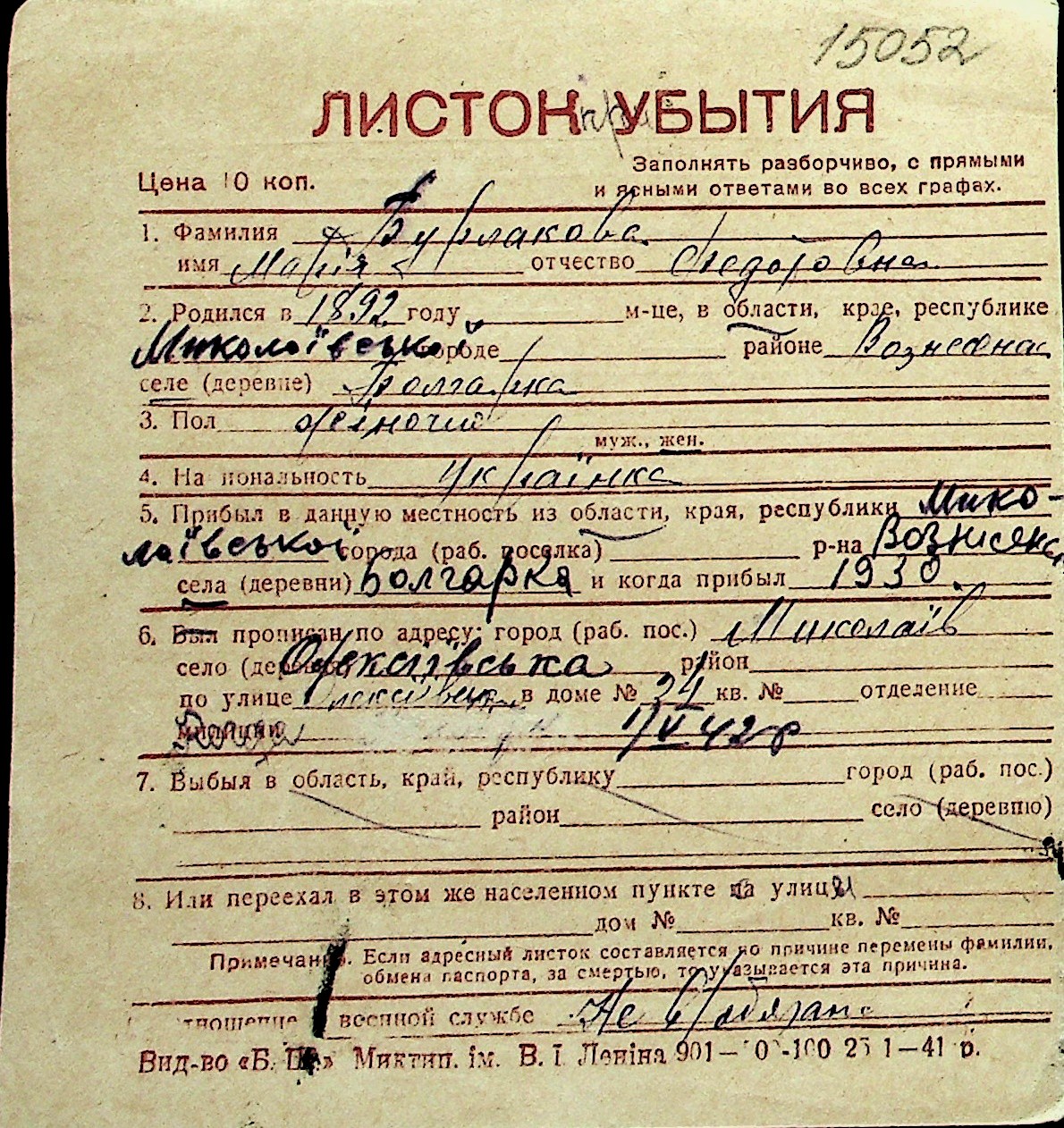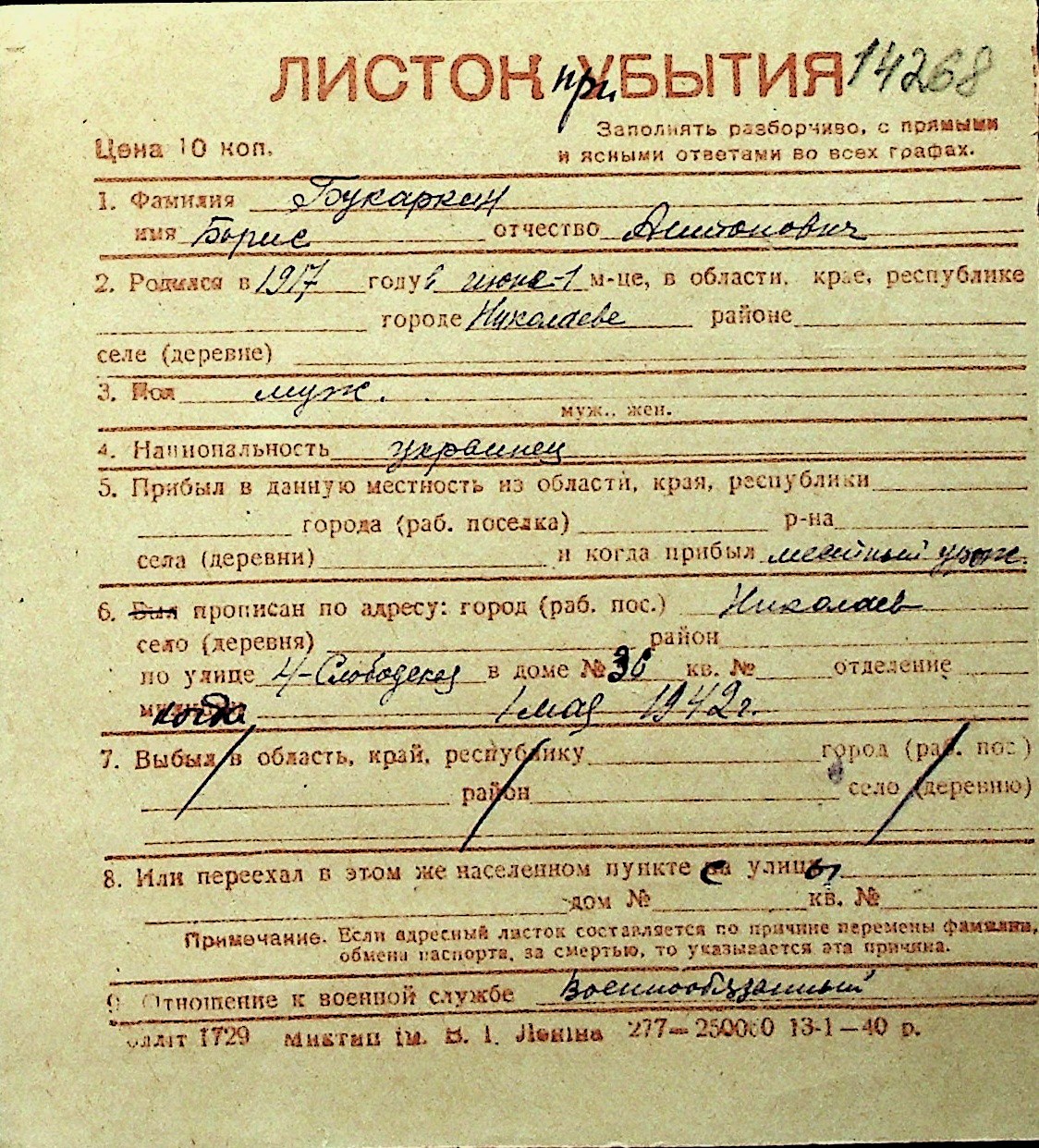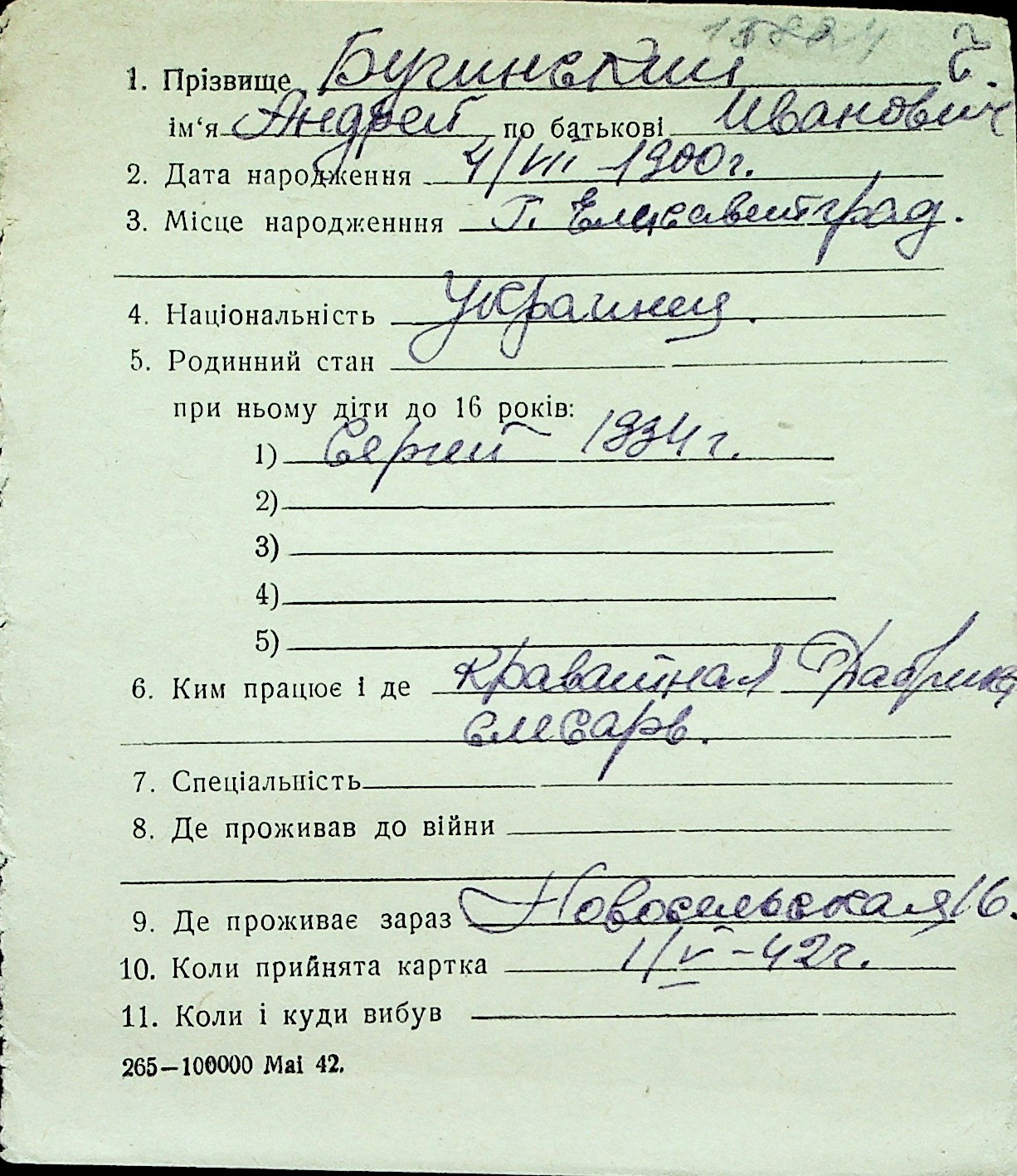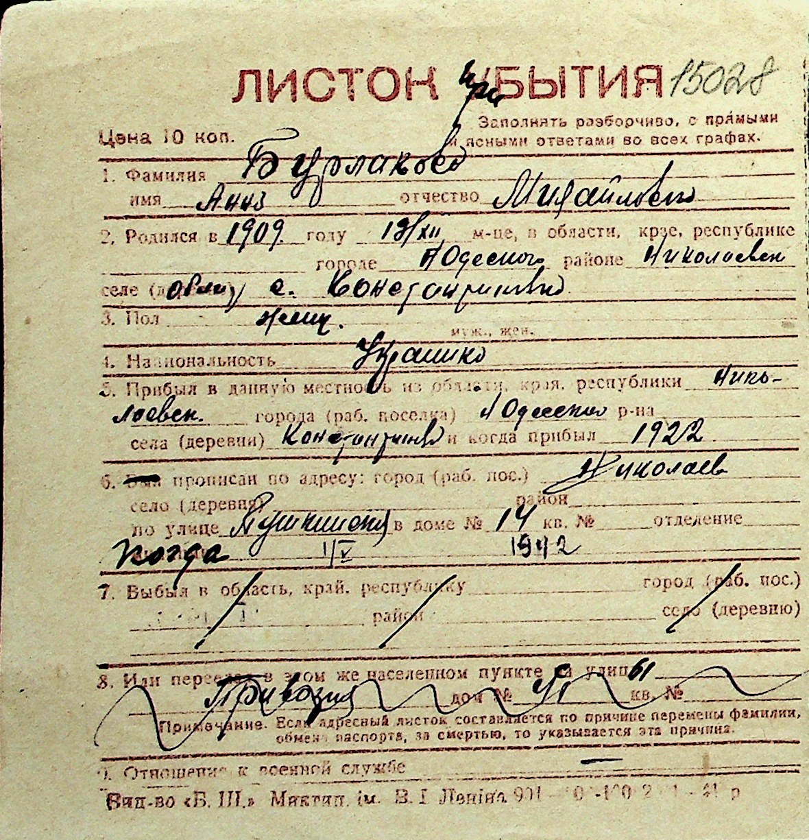 ◦ ◦ Перелік карток на осіб, які мешкали у м. Миколаїв у період окупації 1941–1944 років