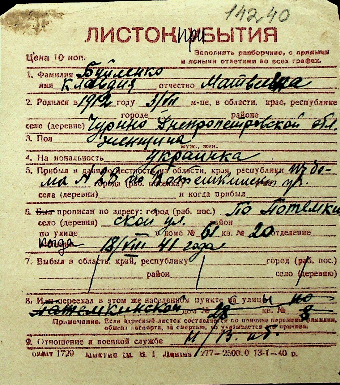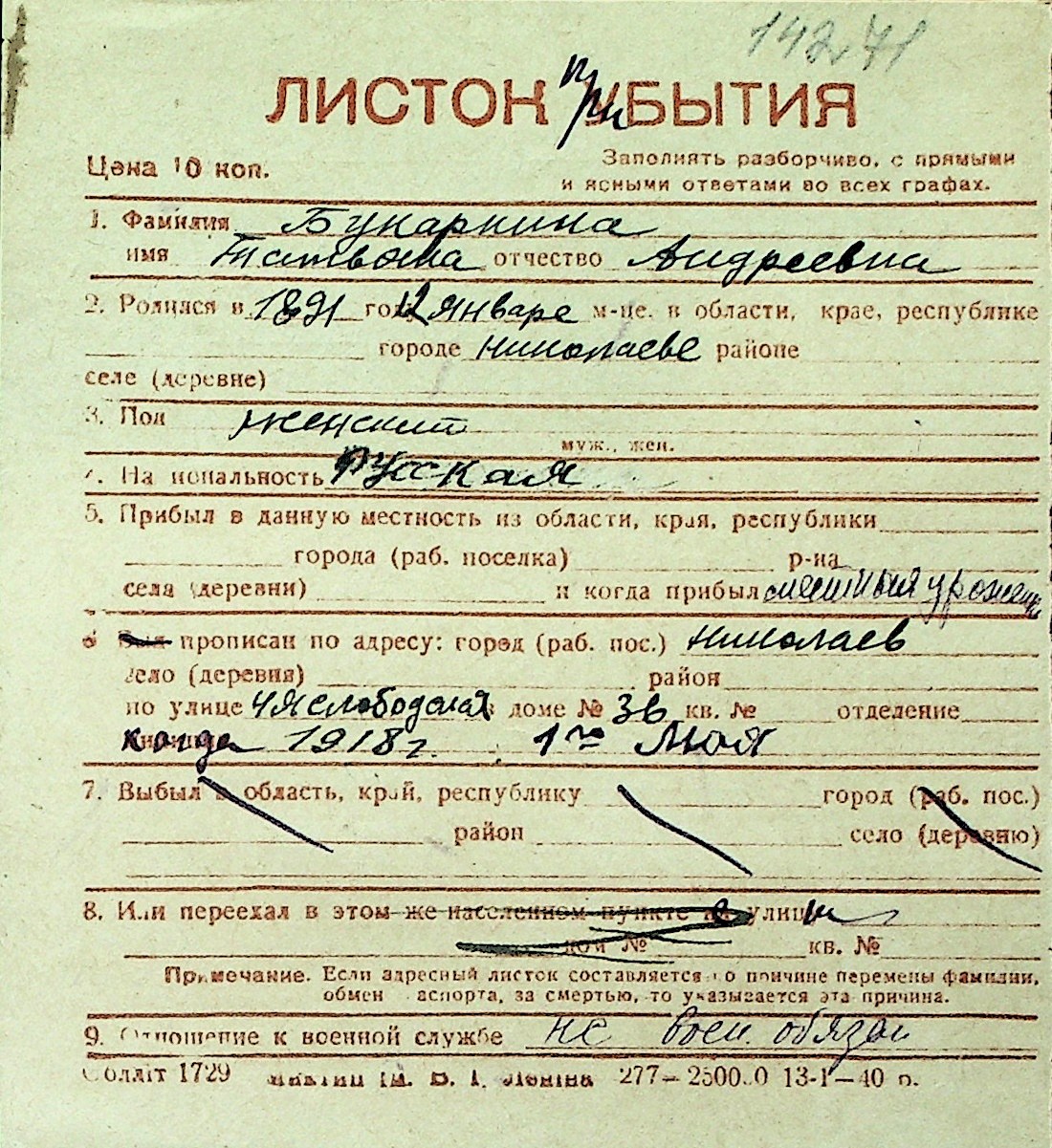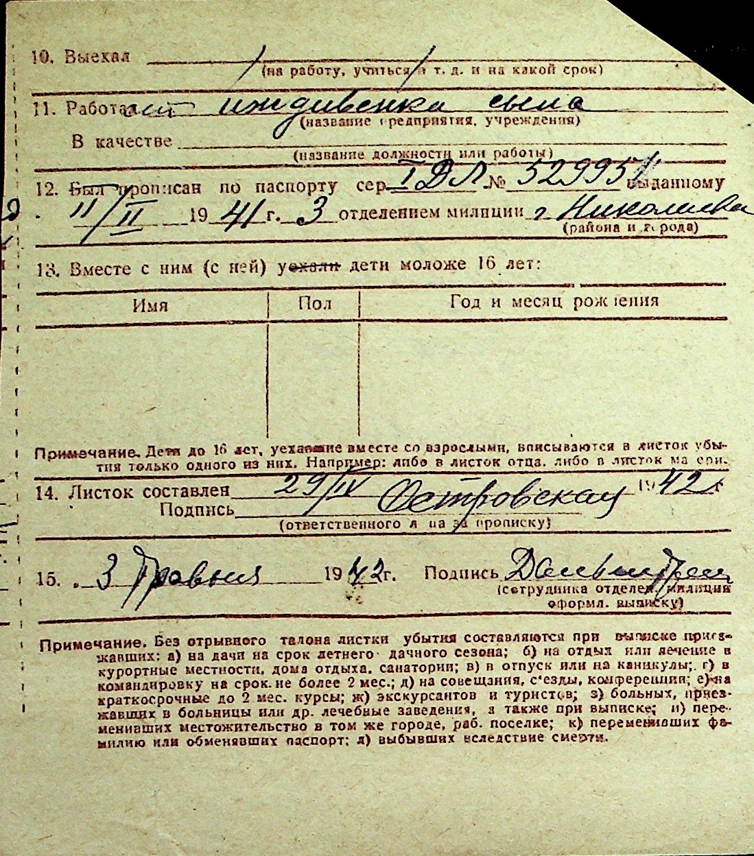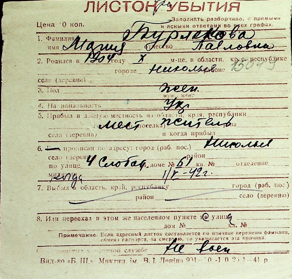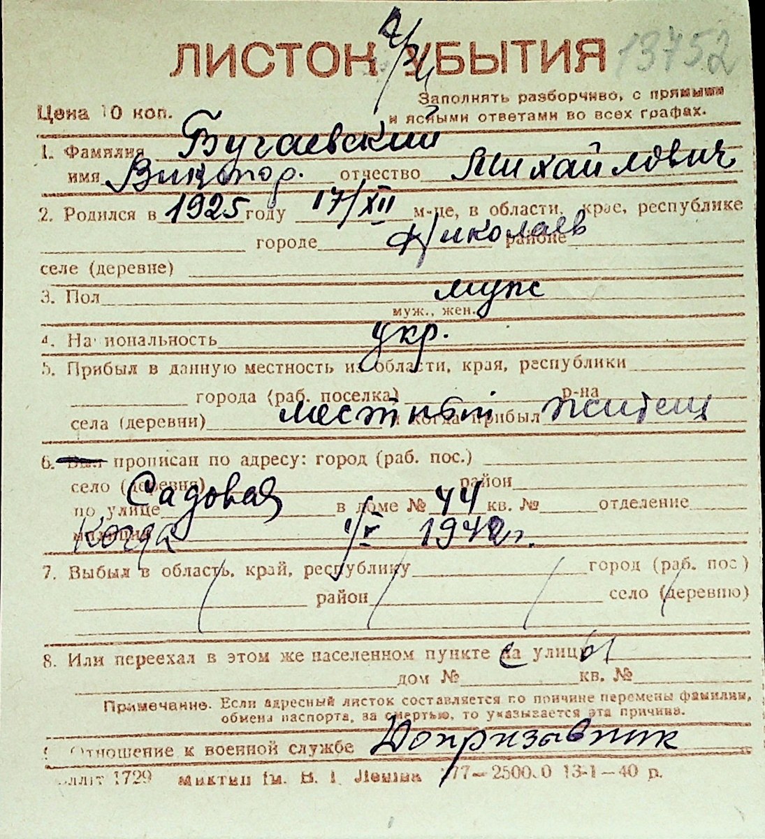 ◦ ◦ Перелік карток на осіб, які мешкали у м. Миколаїв у період окупації 1941–1944 років