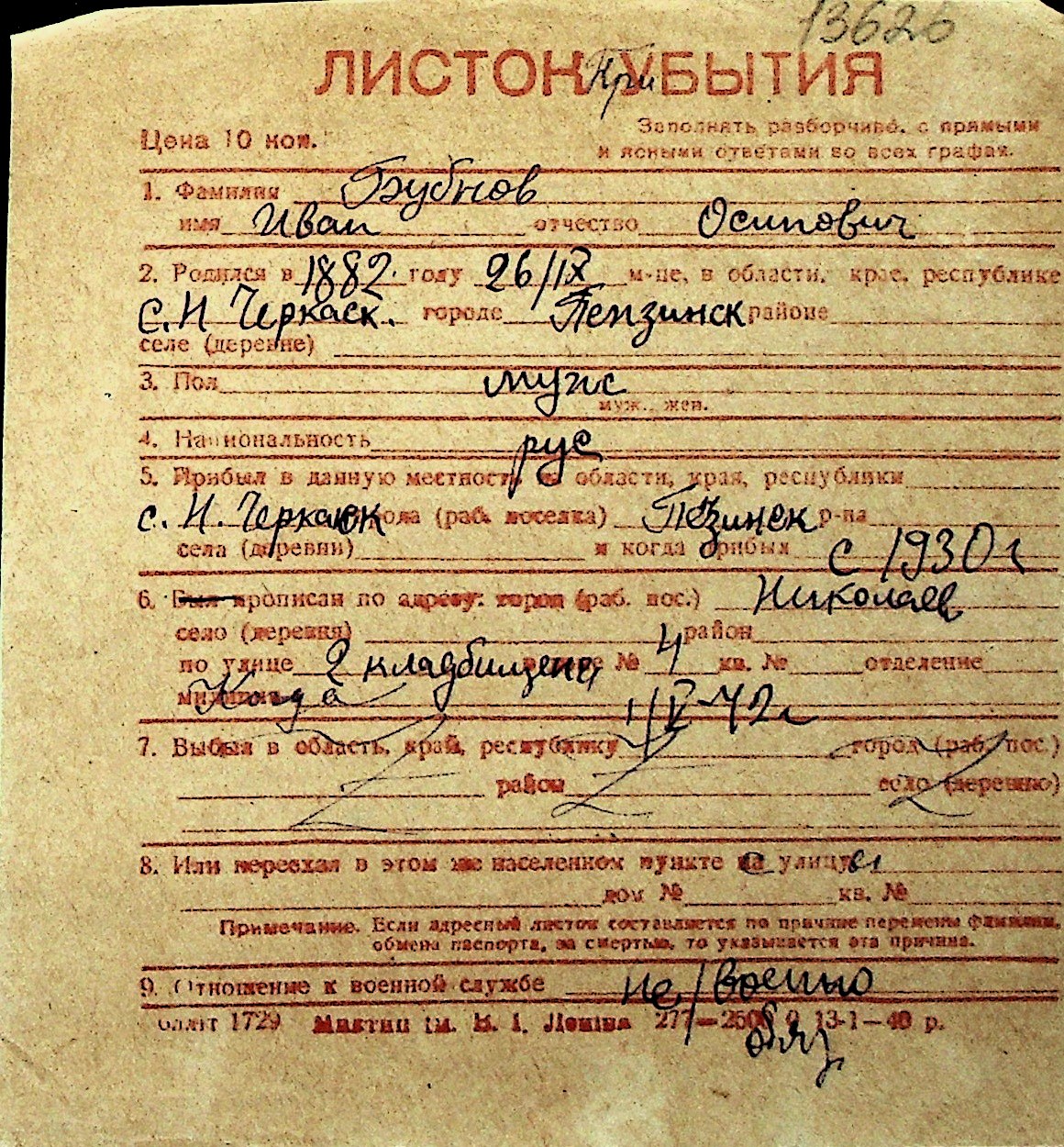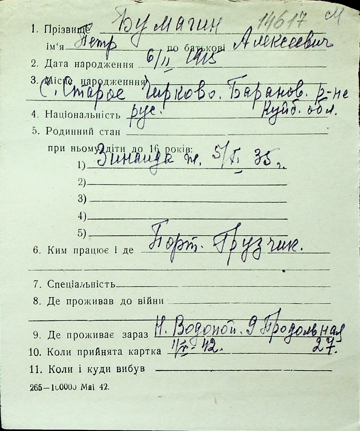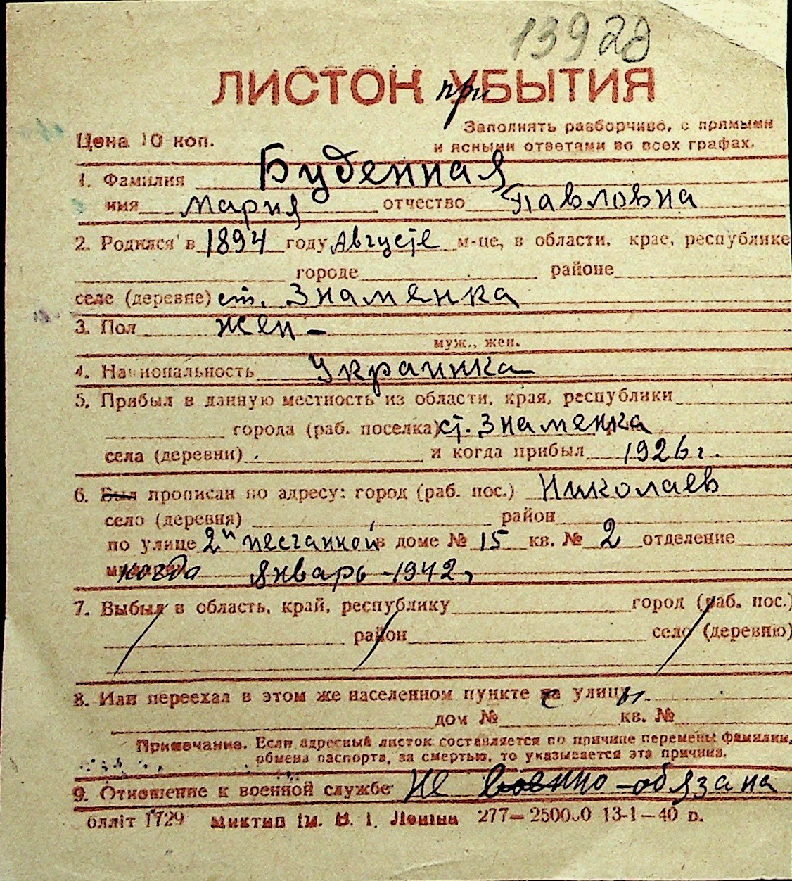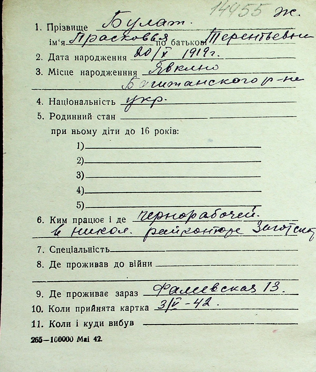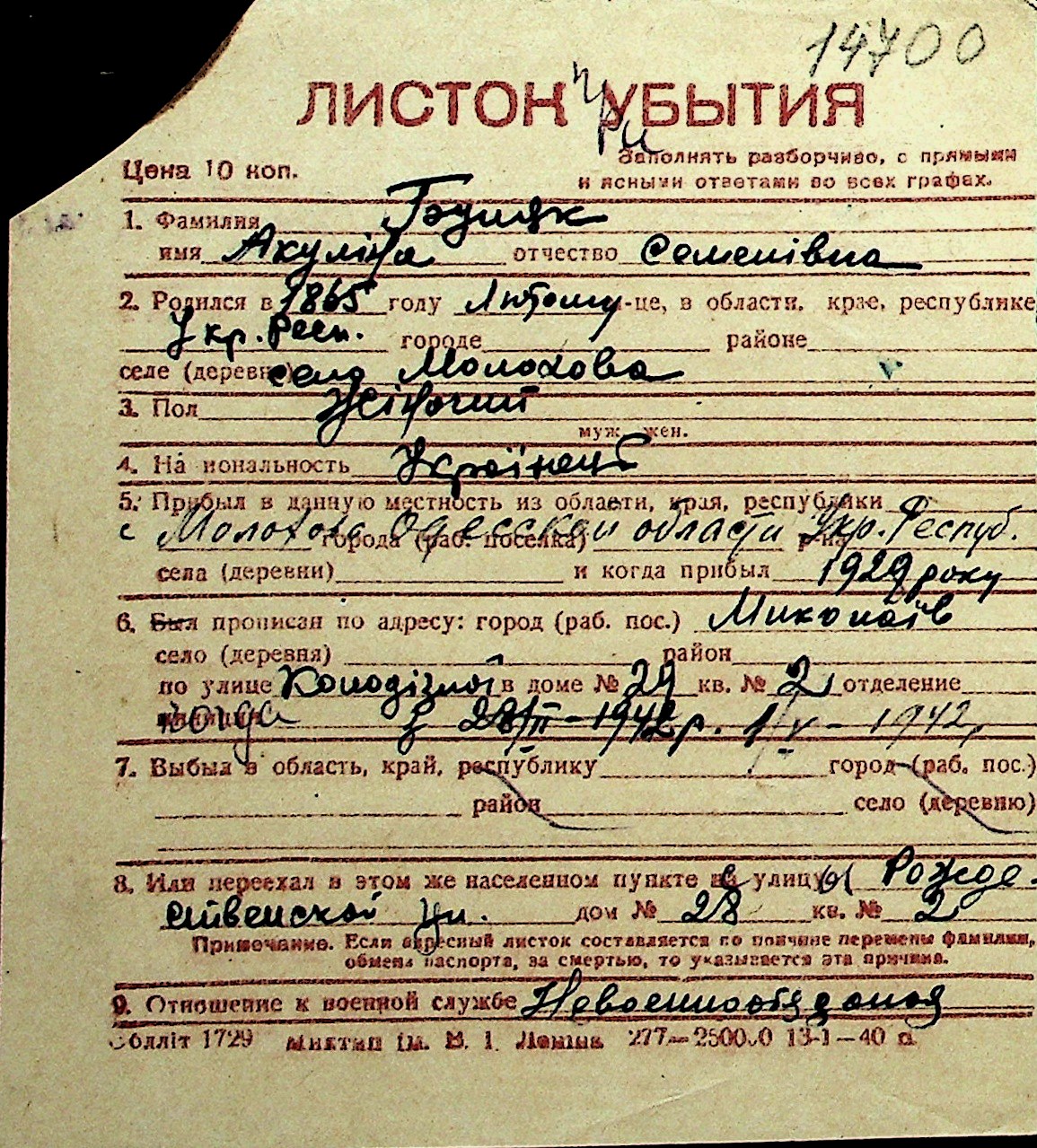 ◦ ◦ Перелік карток на осіб, які мешкали у м. Миколаїв у період окупації 1941–1944 років