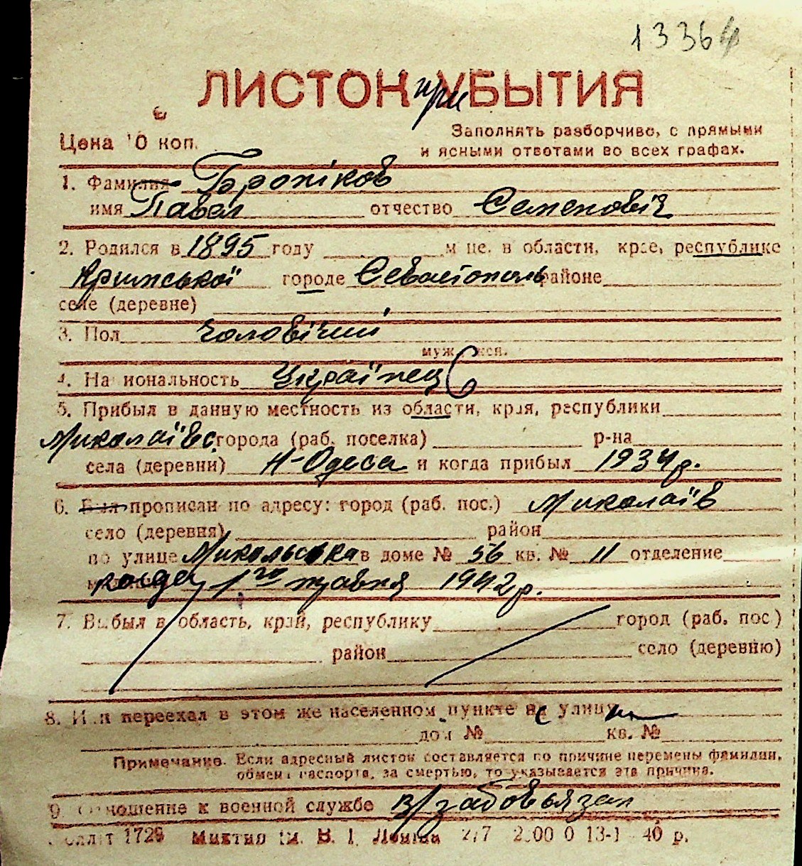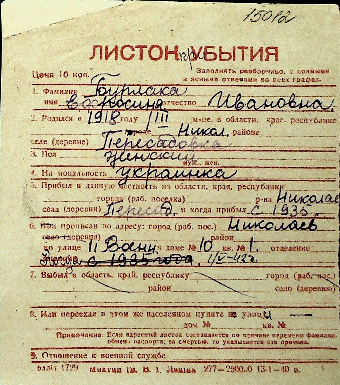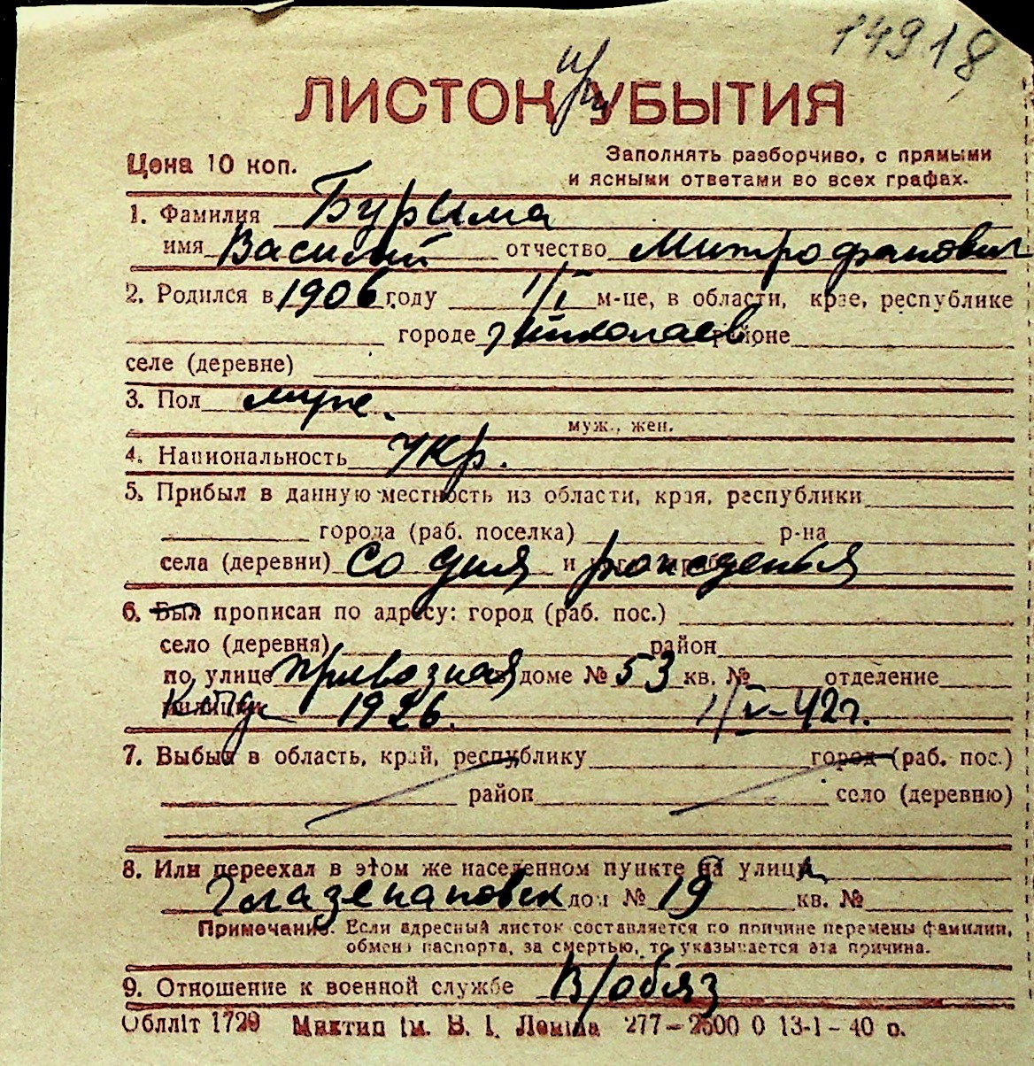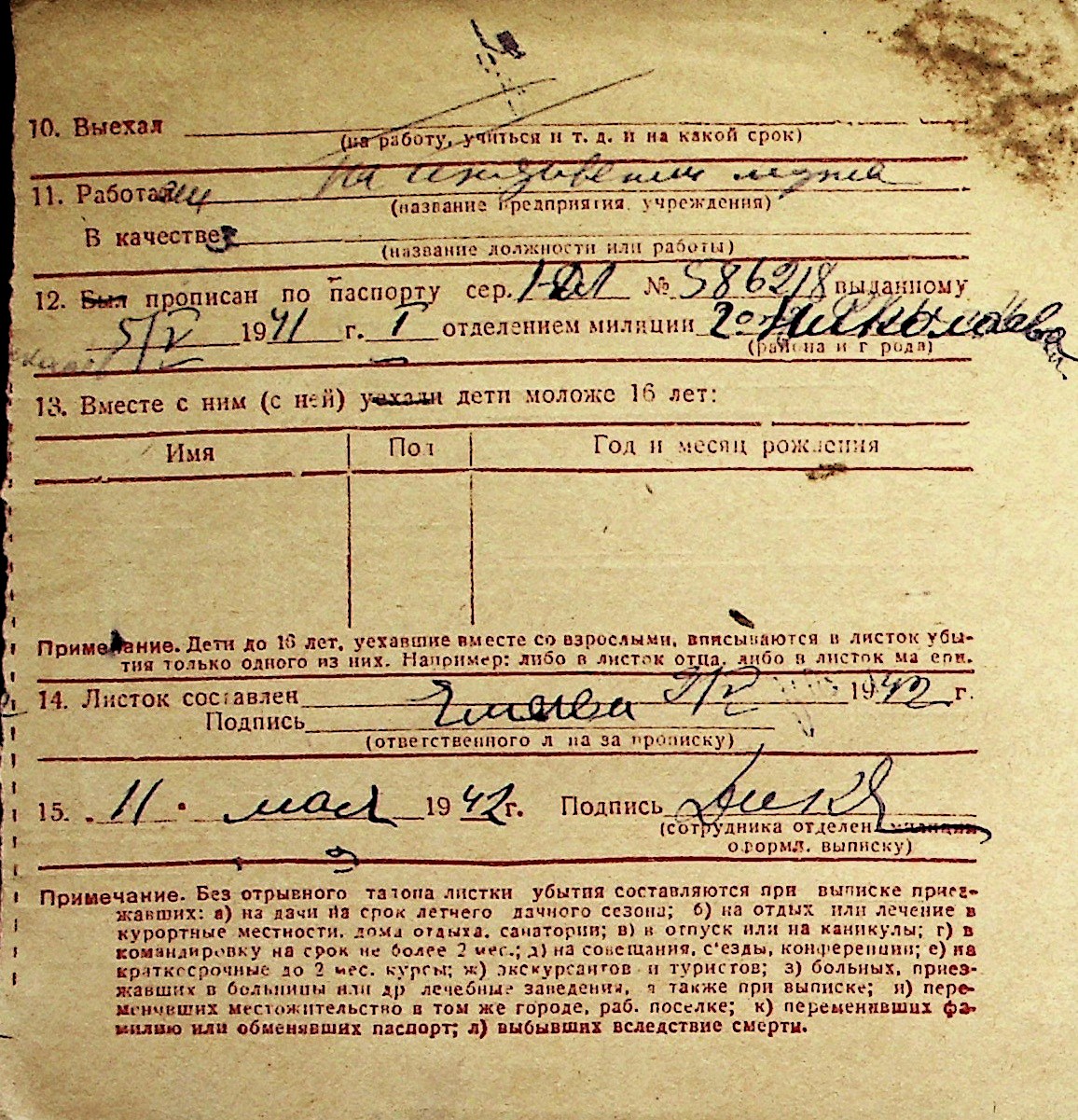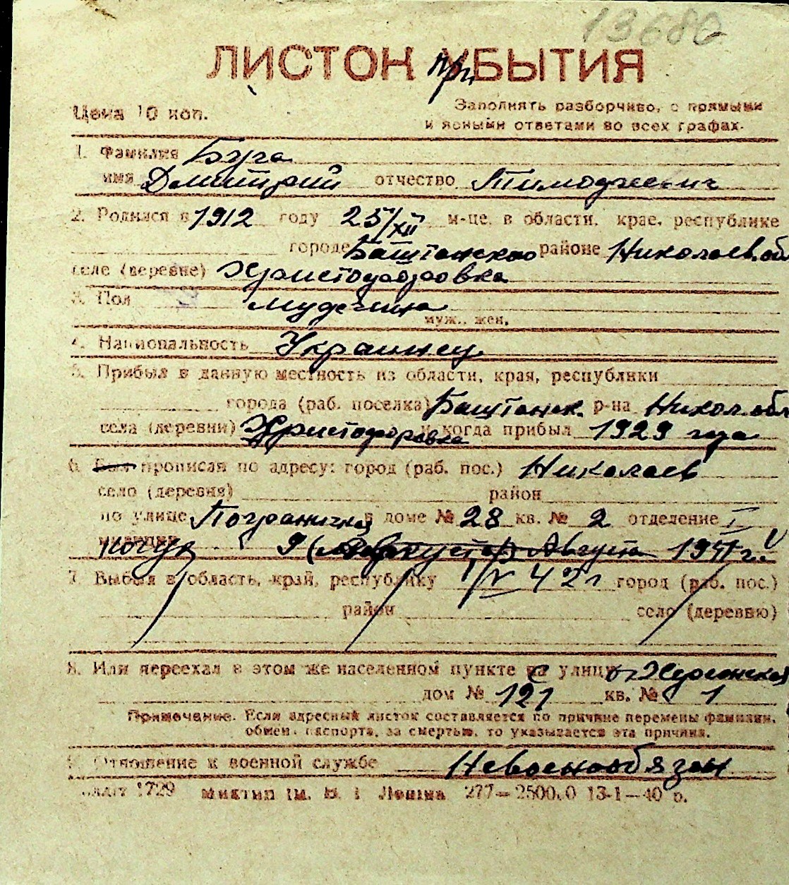 ◦ ◦ Перелік карток на осіб, які мешкали у м. Миколаїв у період окупації 1941–1944 років