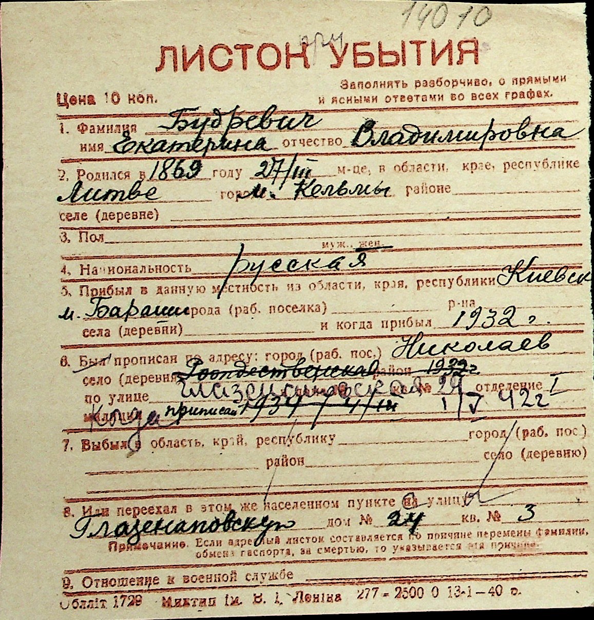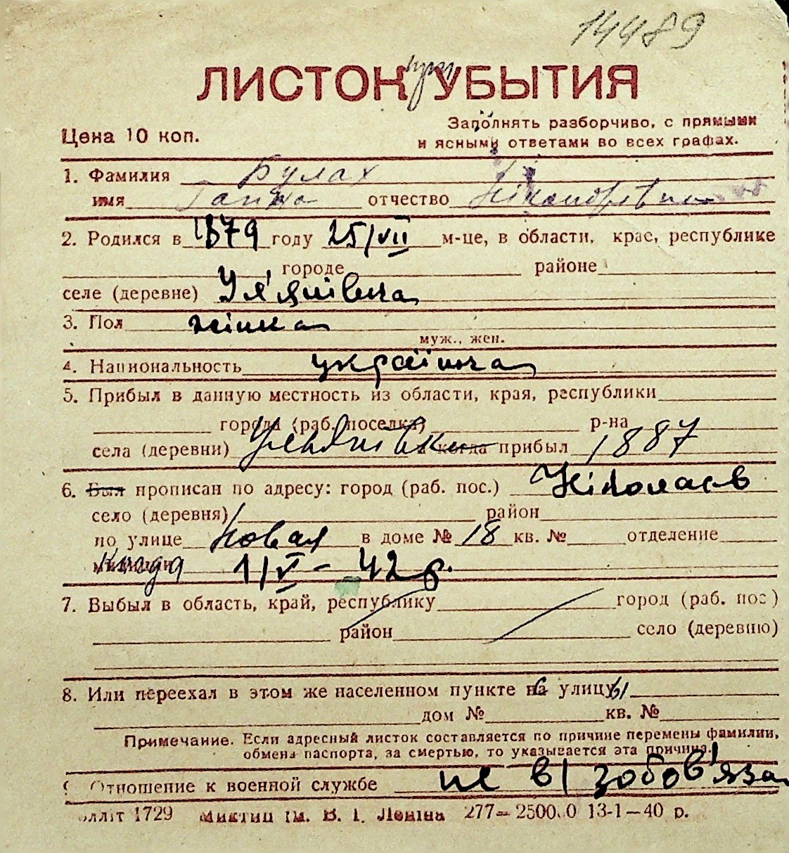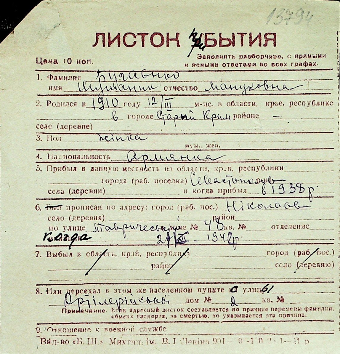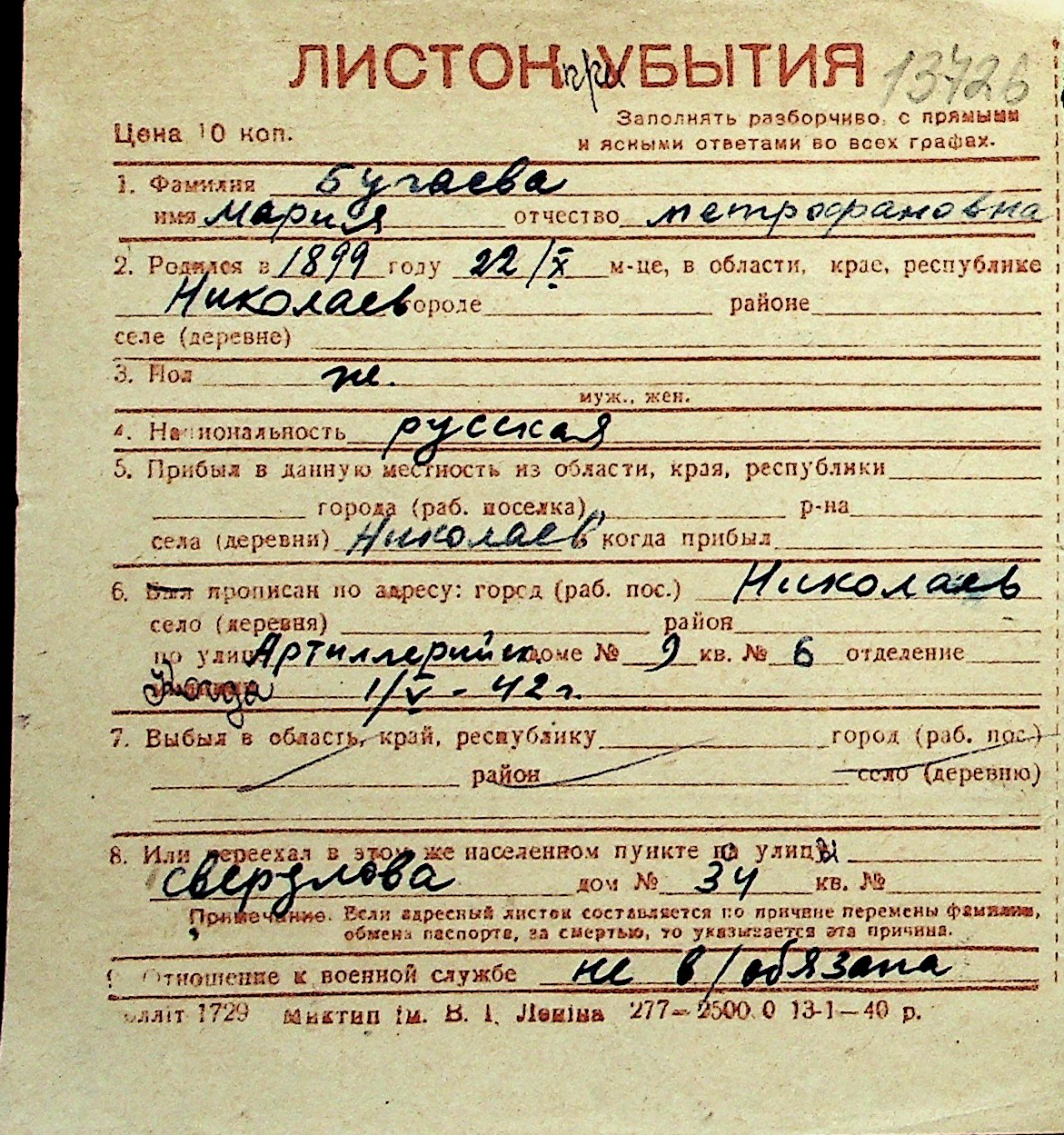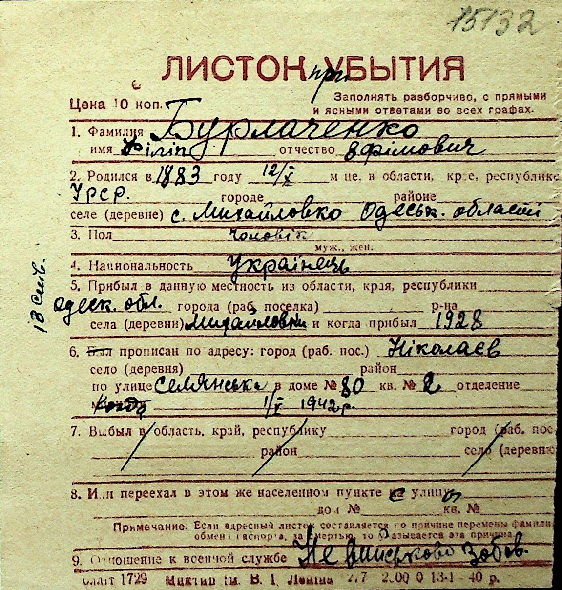 ◦ ◦ Перелік карток на осіб, які мешкали у м. Миколаїв у період окупації 1941–1944 років
