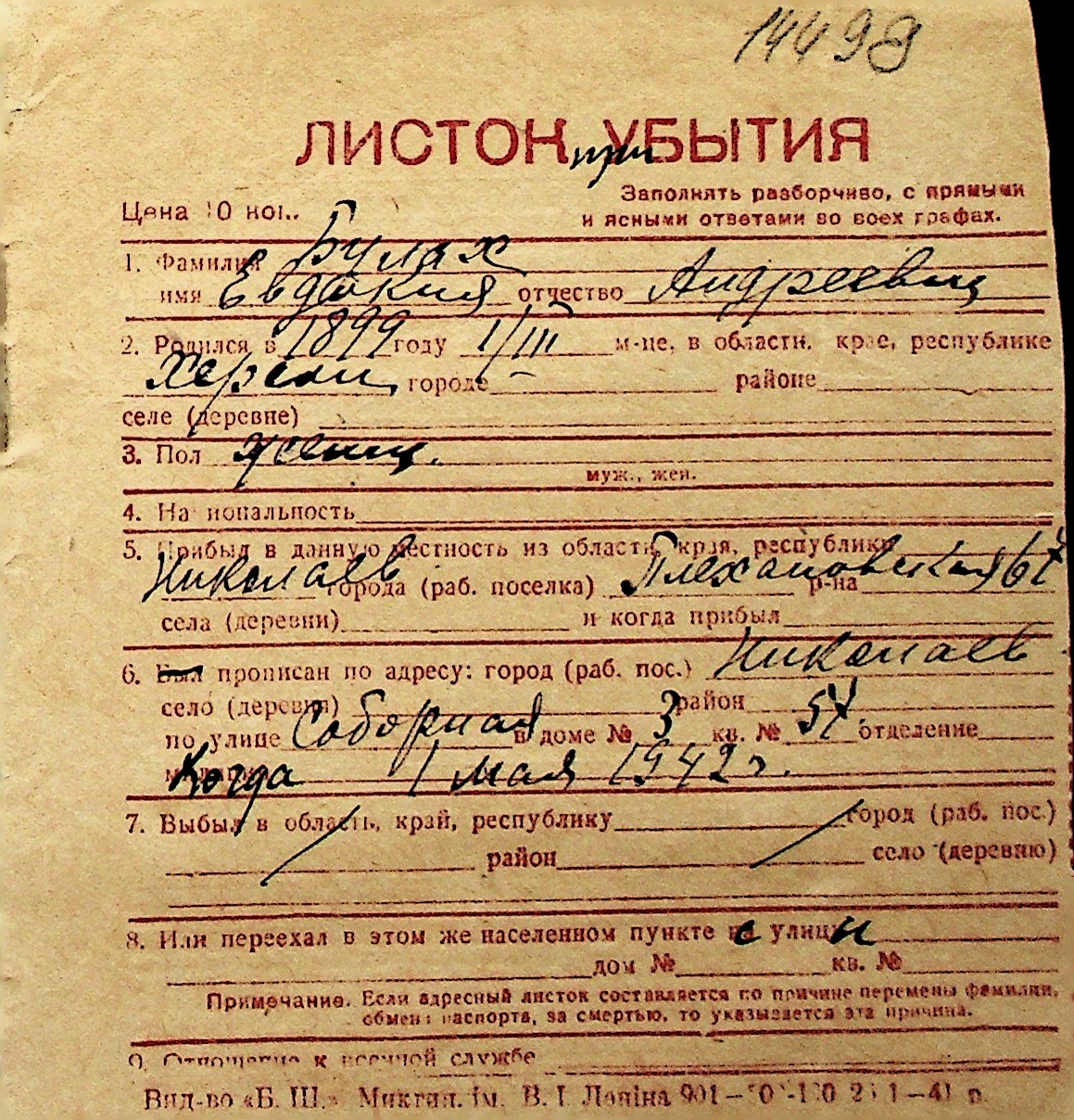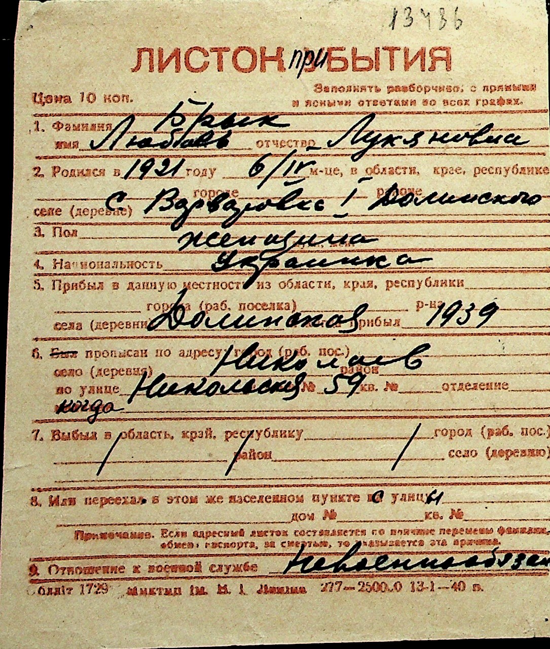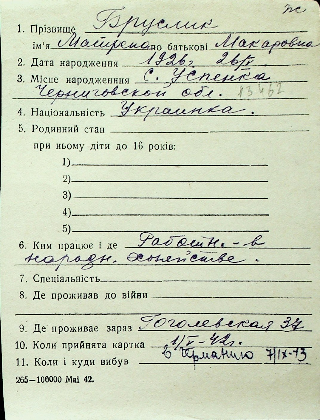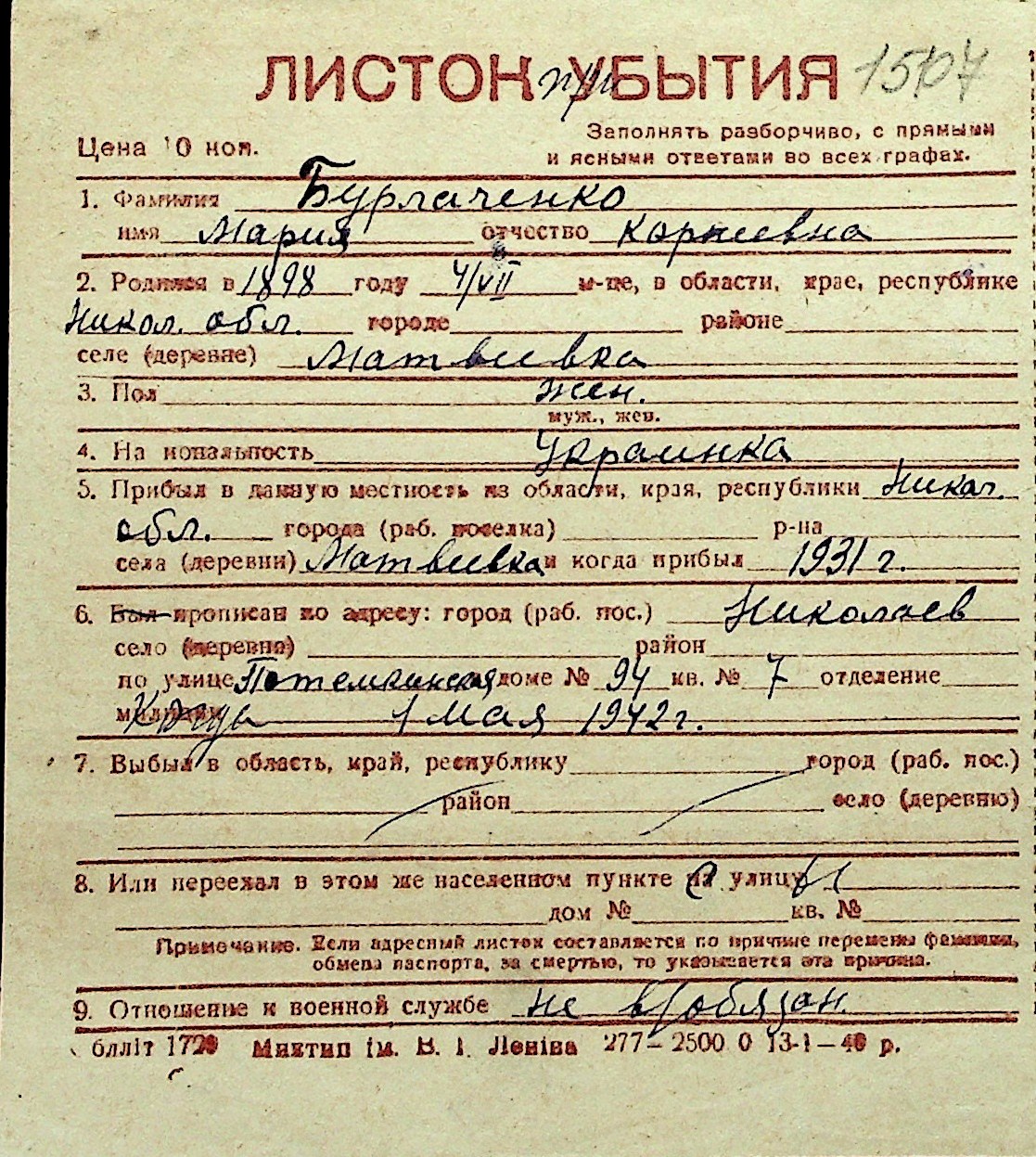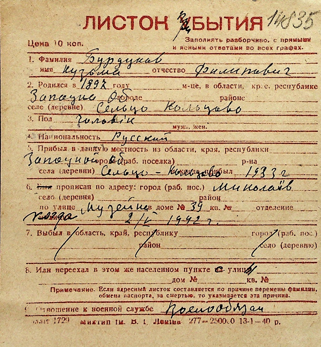 ◦ ◦ Перелік карток на осіб, які мешкали у м. Миколаїв у період окупації 1941–1944 років