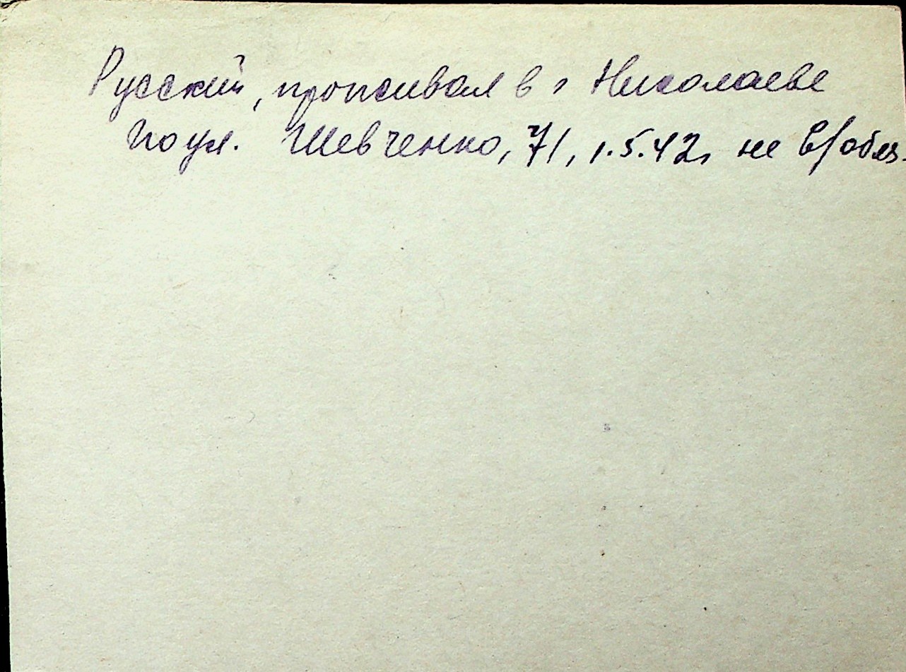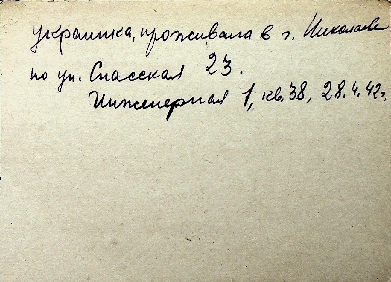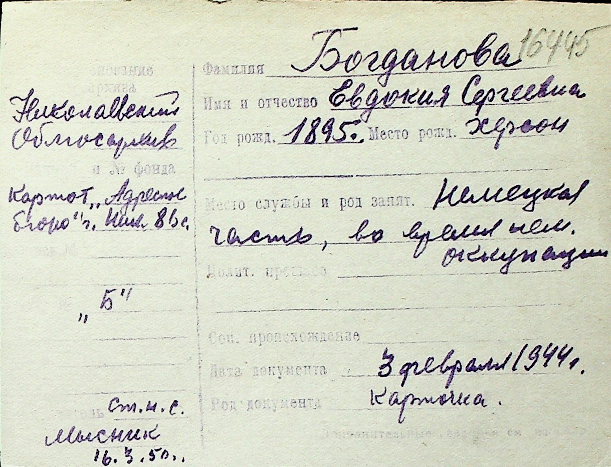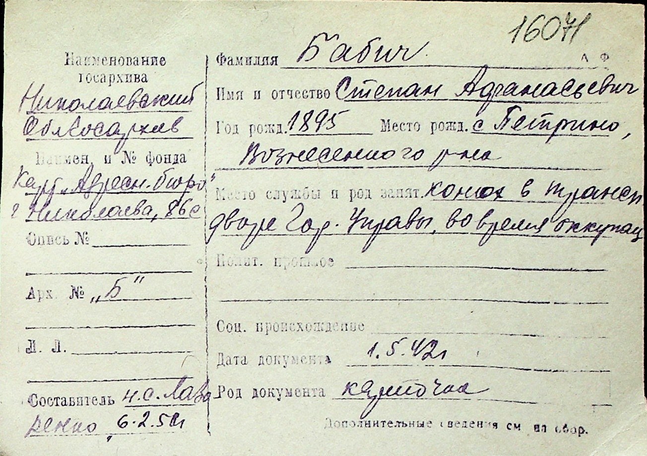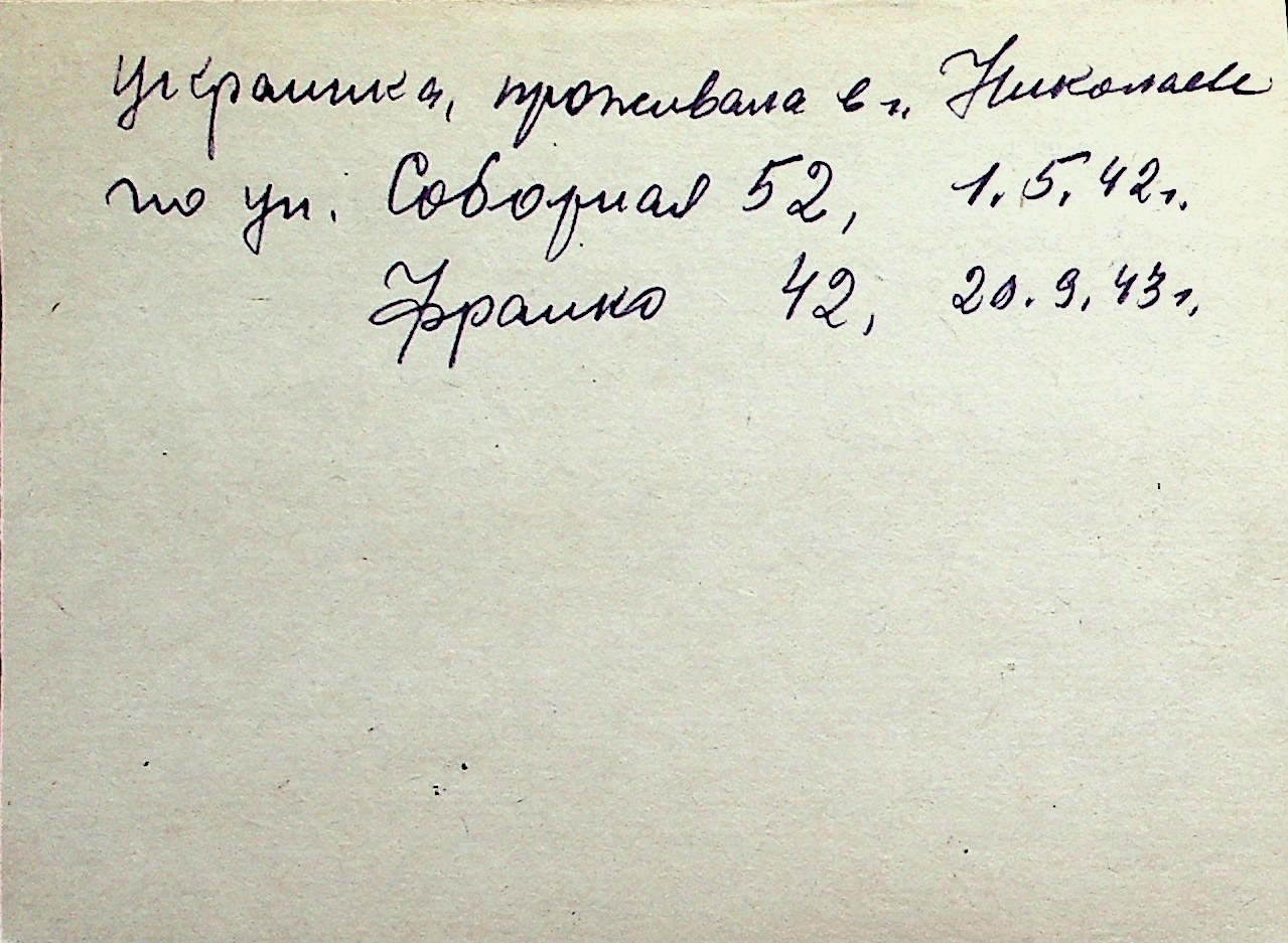 ◦ ◦ Перелік карток на осіб, які мешкали у м. Миколаїв у період окупації 1941–1944 років