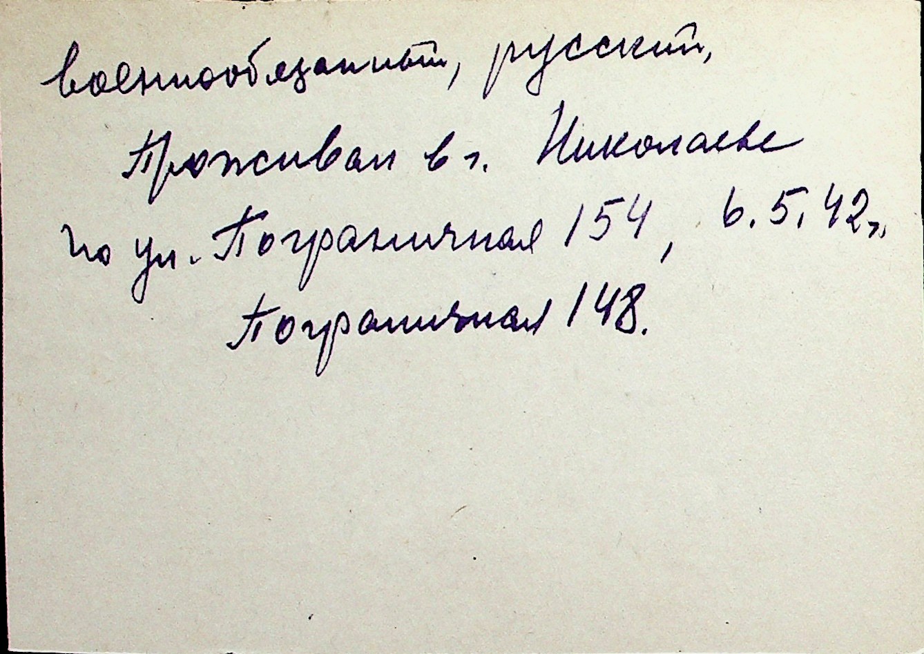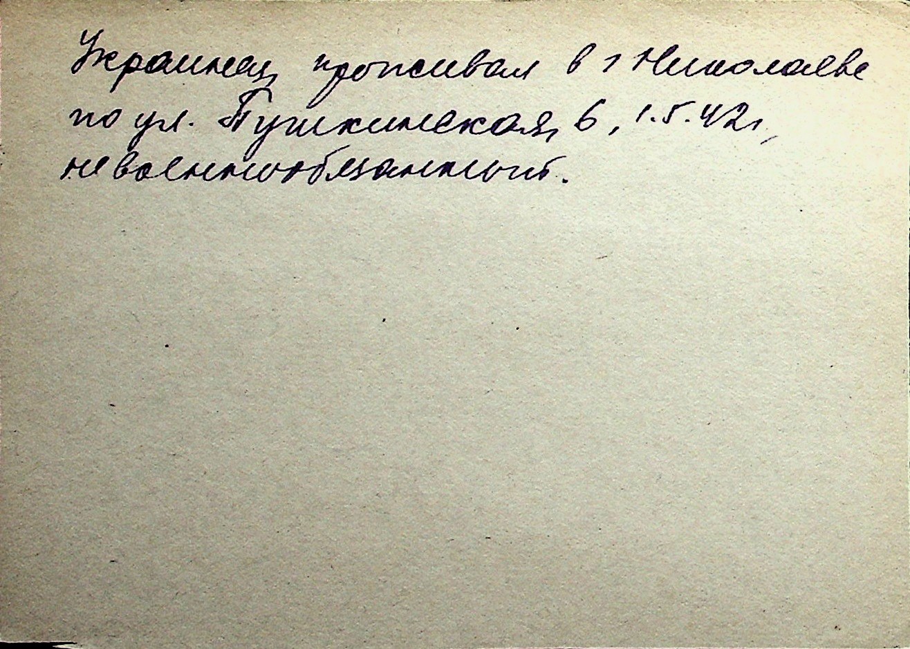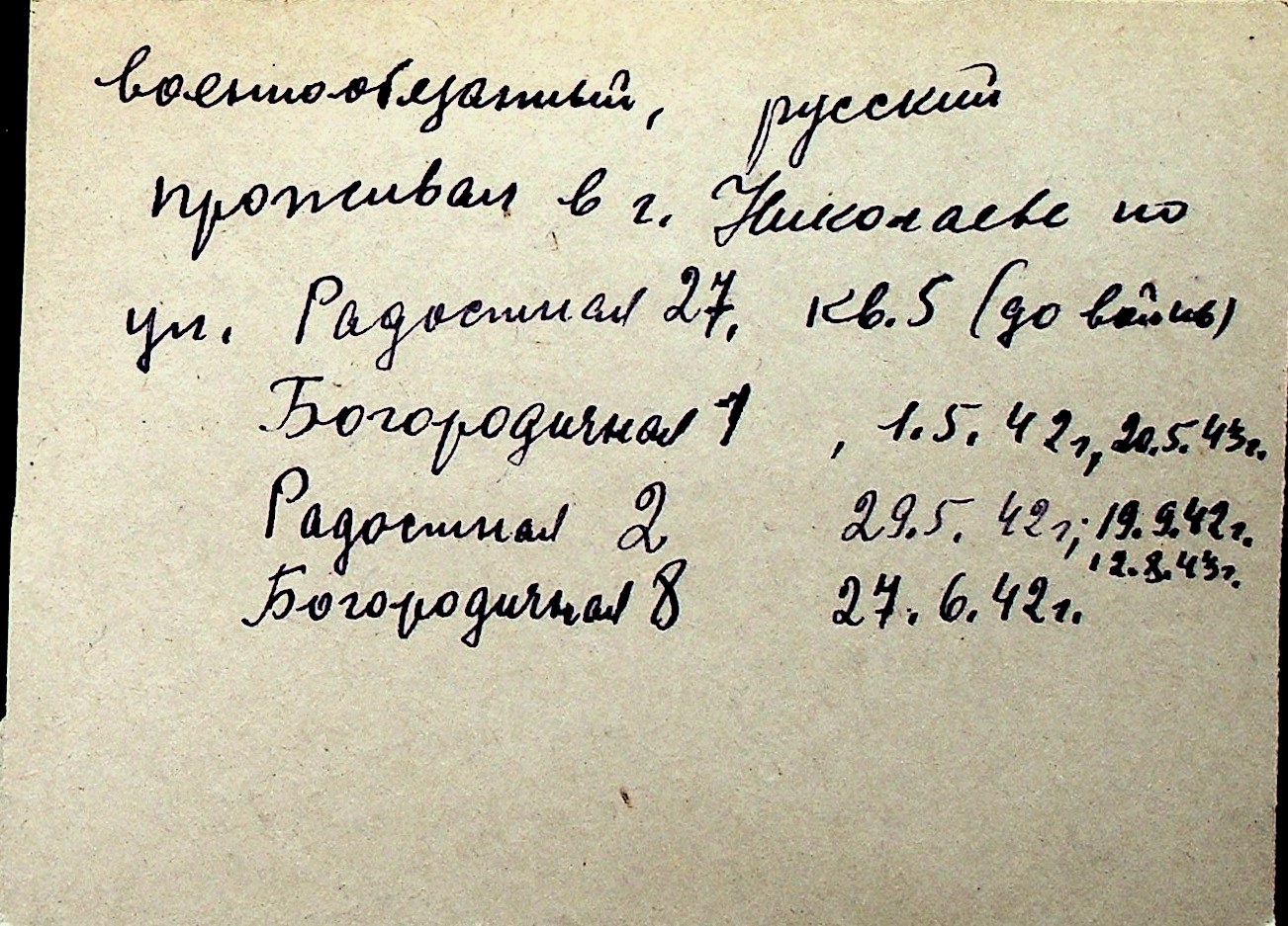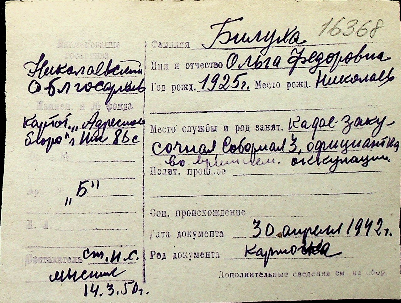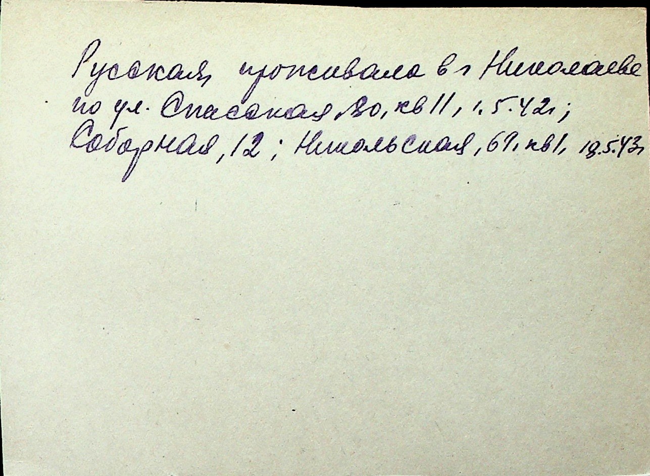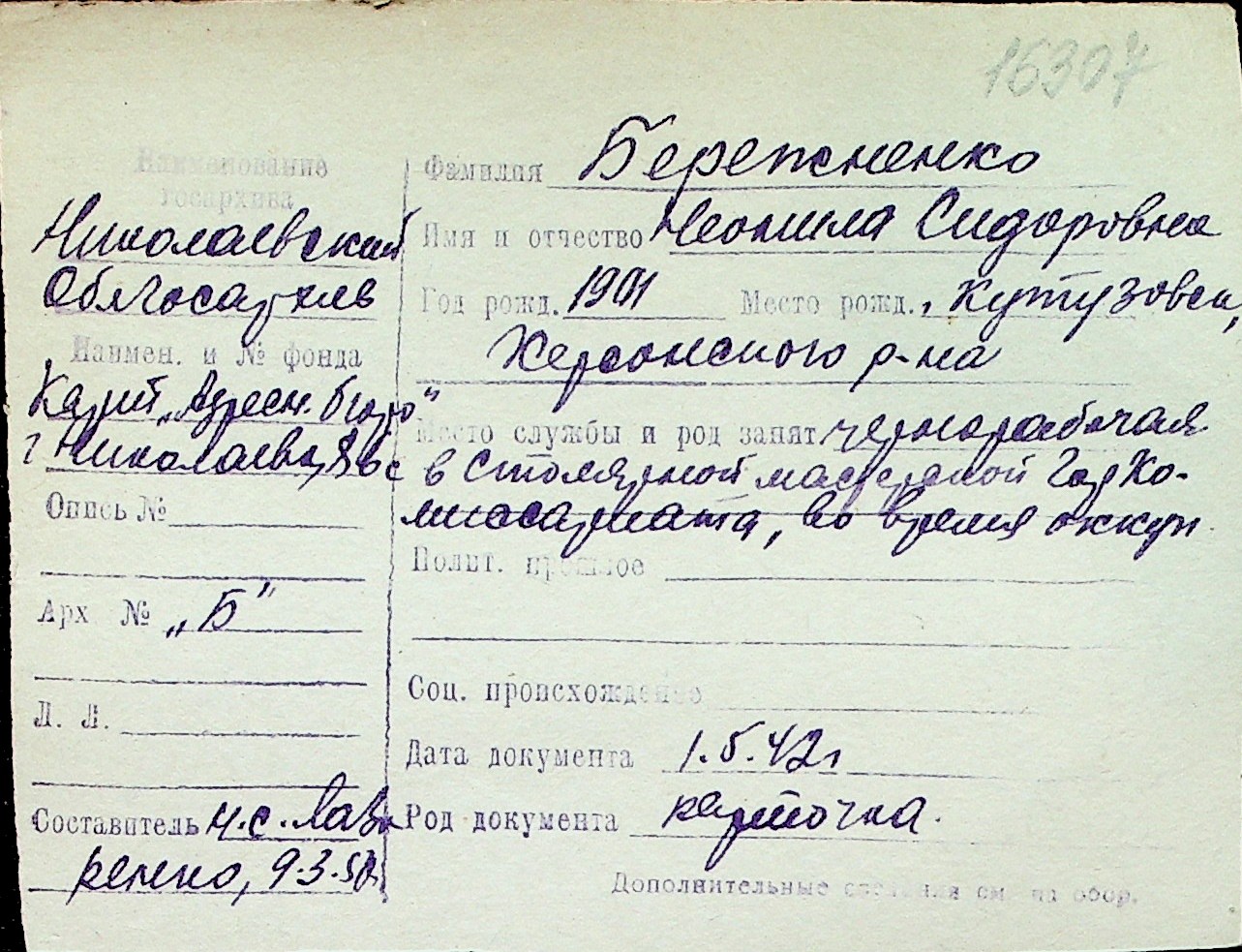 ◦ ◦ Перелік карток на осіб, які мешкали у м. Миколаїв у період окупації 1941–1944 років