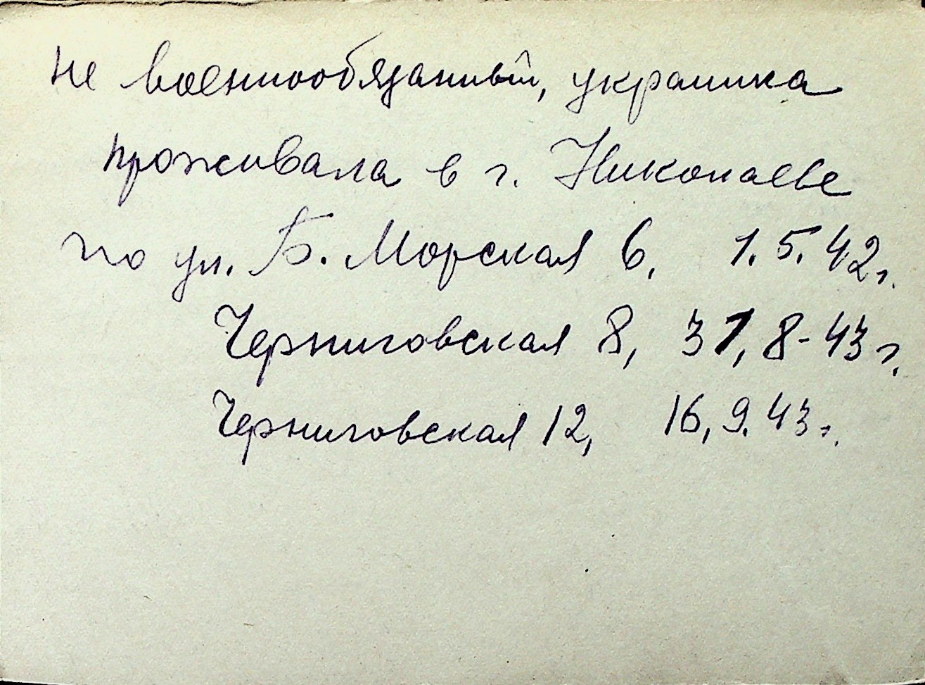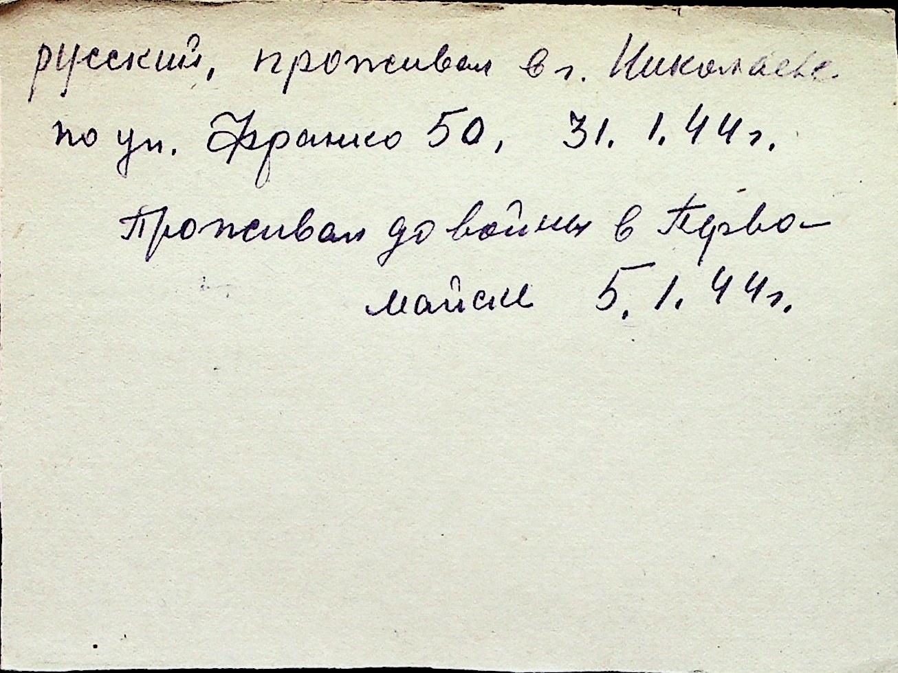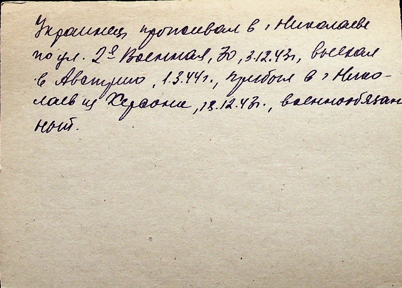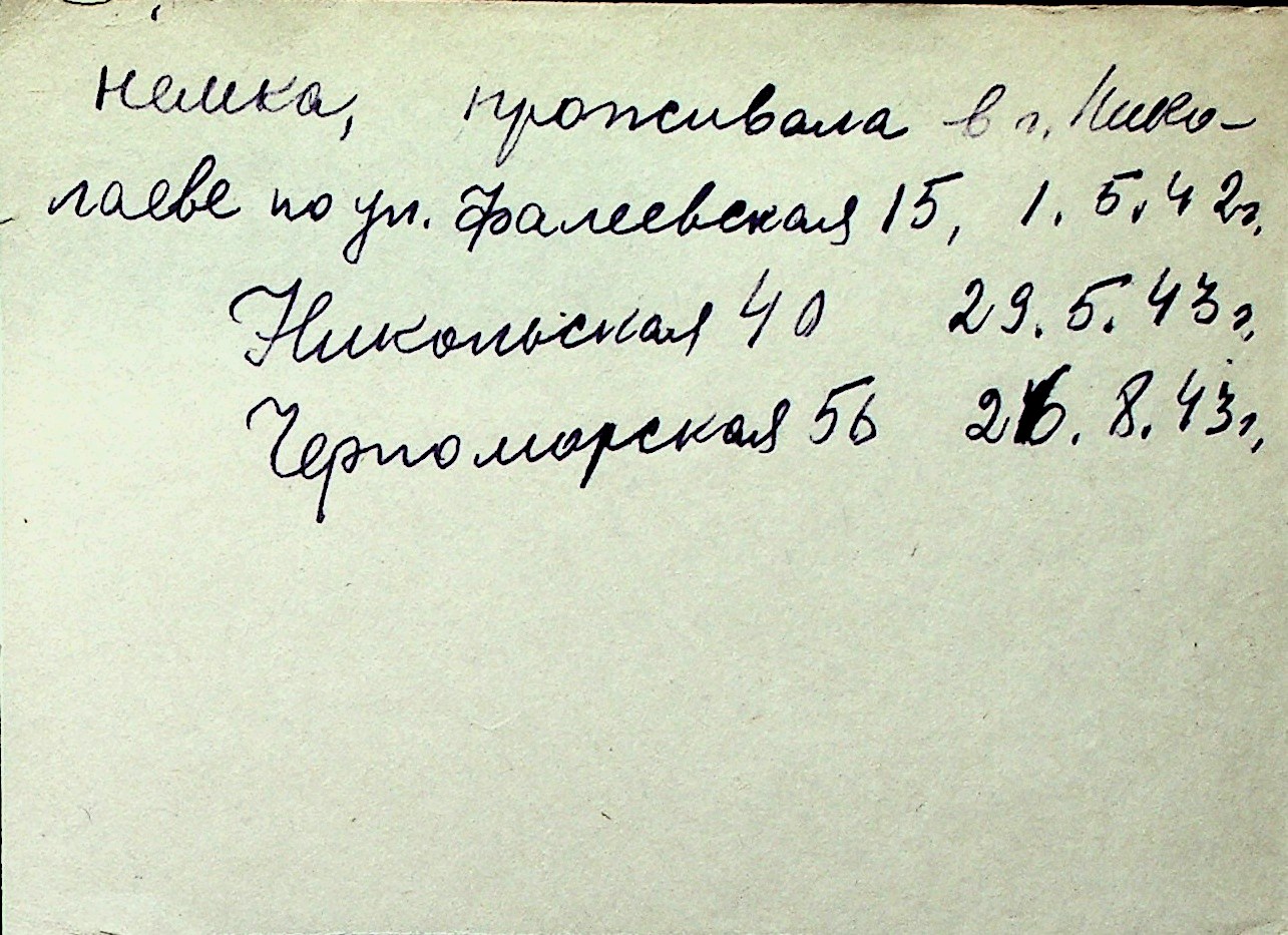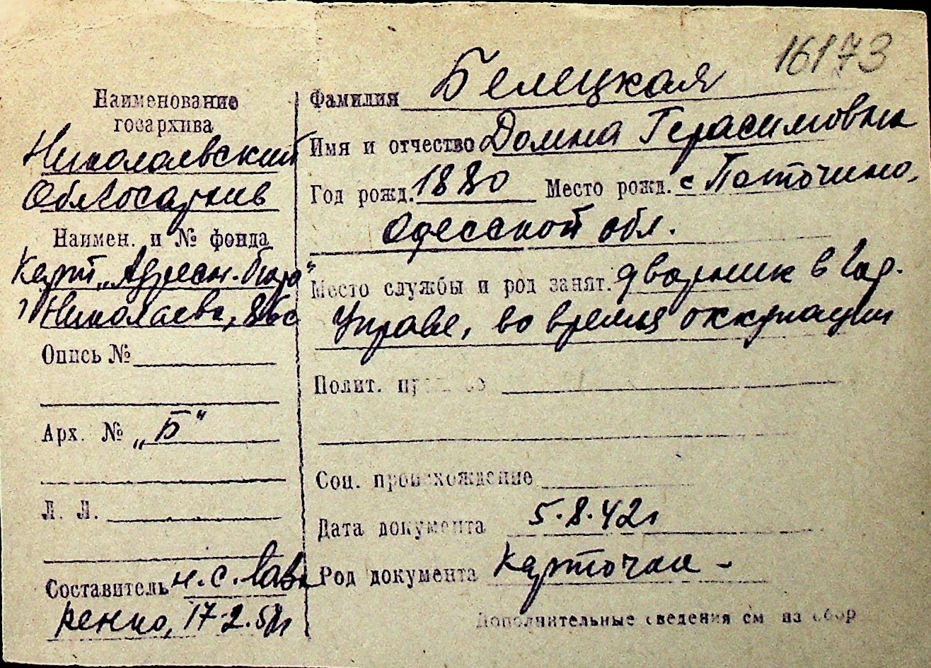 ◦ ◦ Перелік карток на осіб, які мешкали у м. Миколаїв у період окупації 1941–1944 років