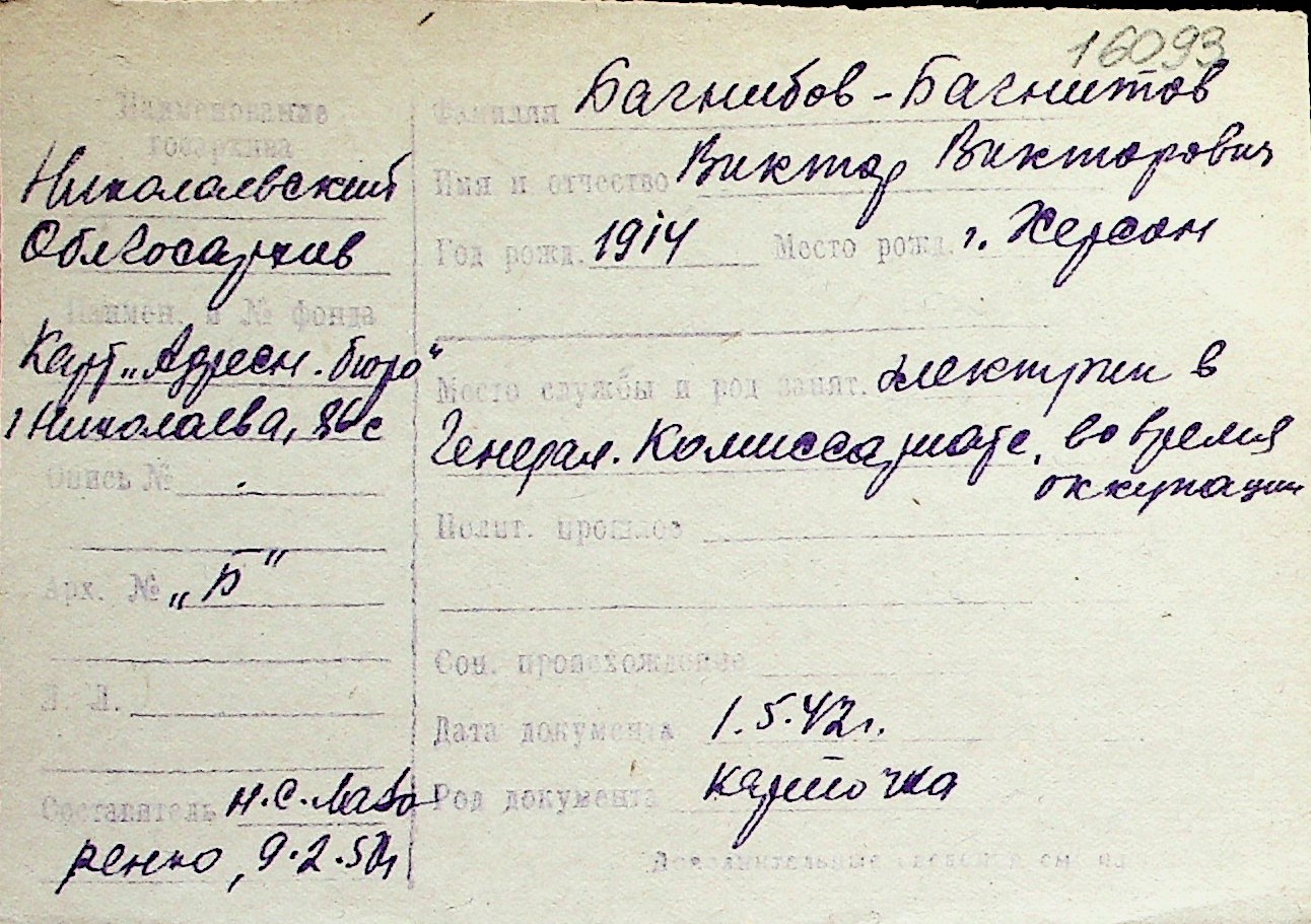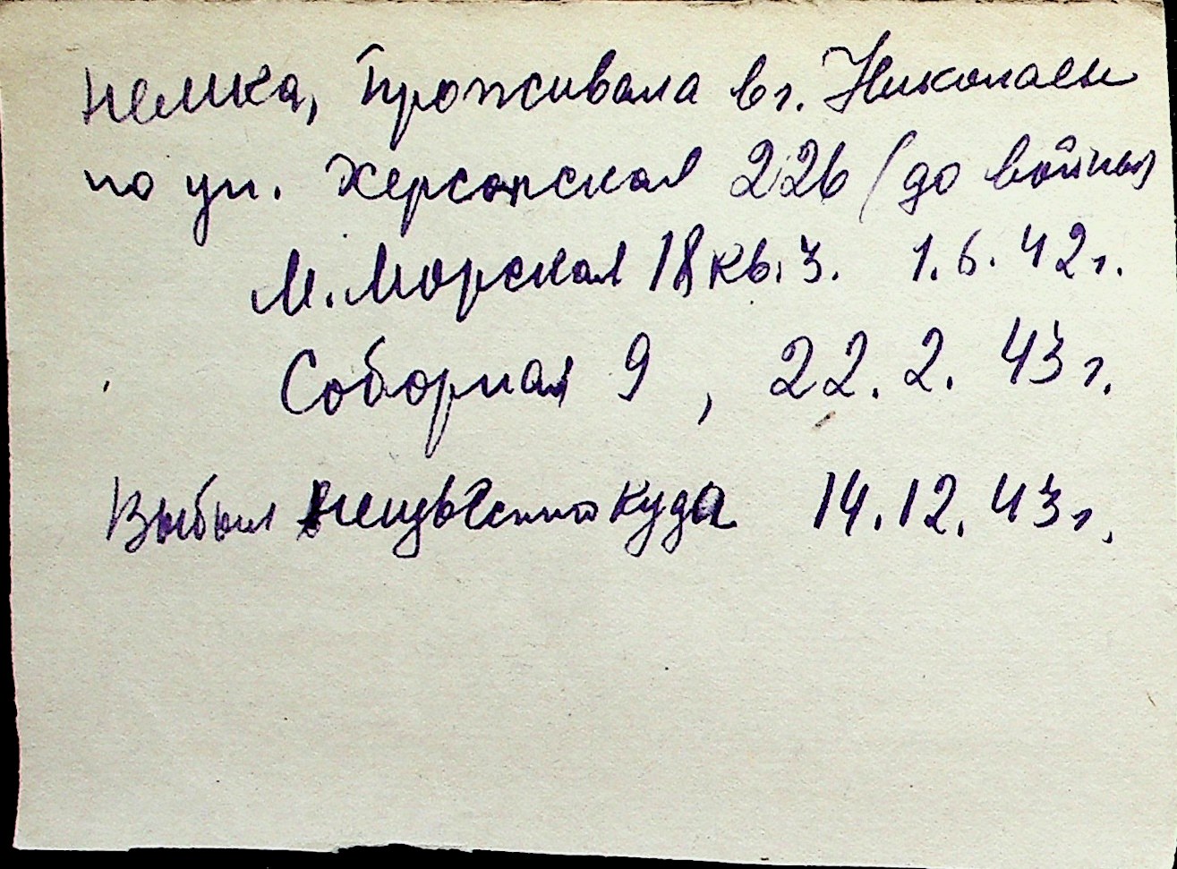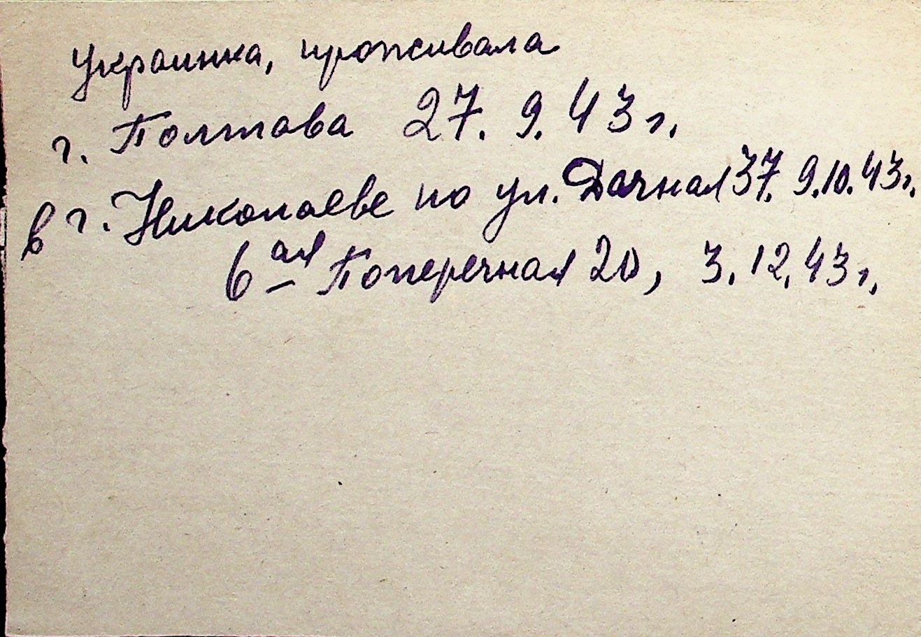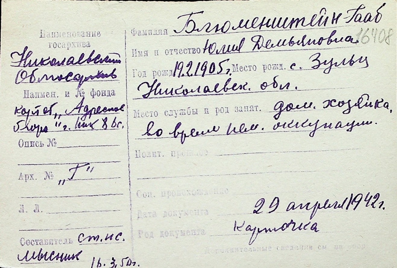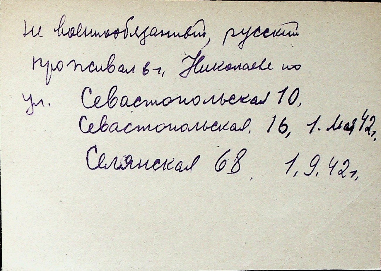 ◦ ◦ Перелік карток на осіб, які мешкали у м. Миколаїв у період окупації 1941–1944 років