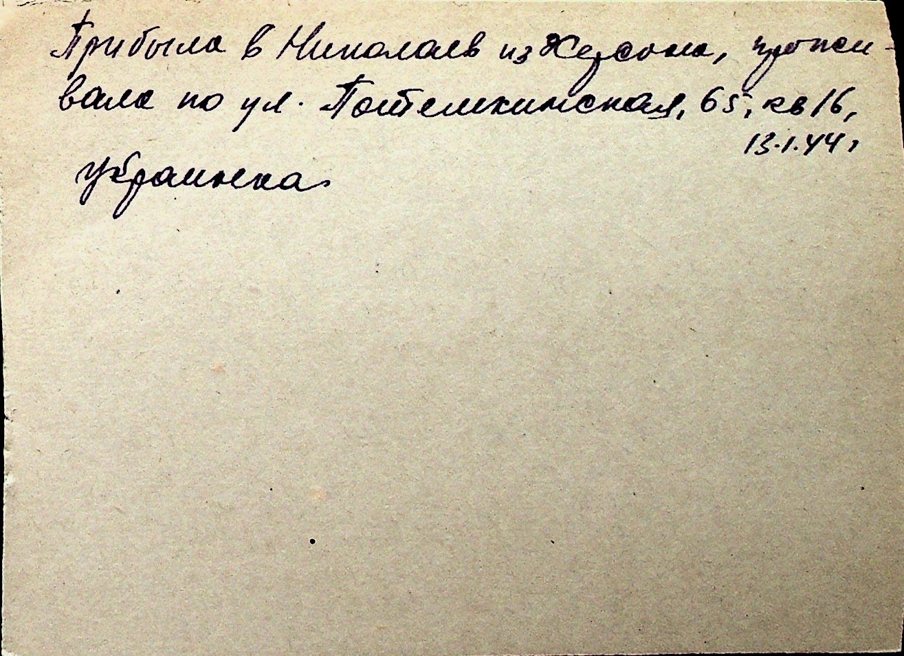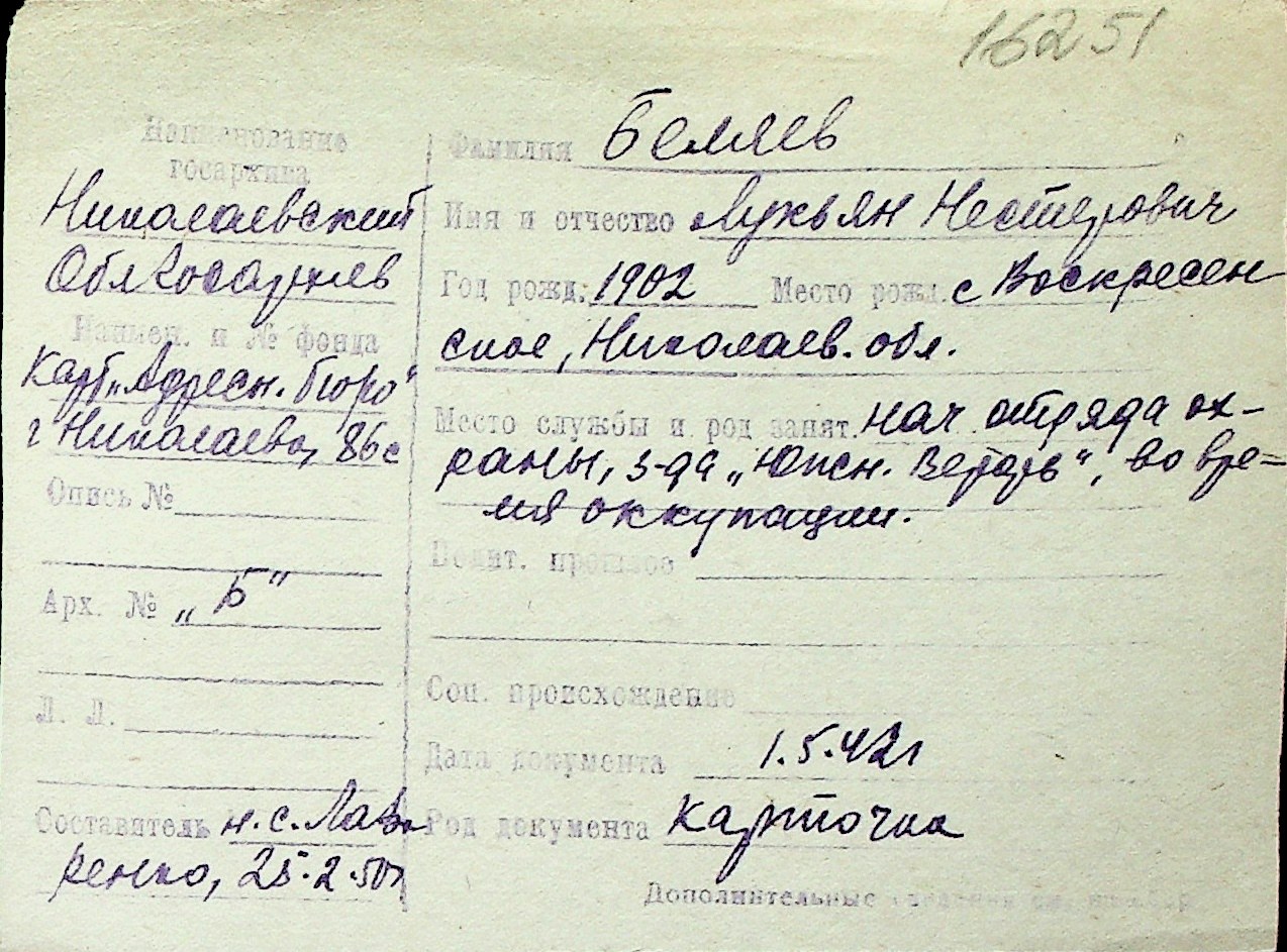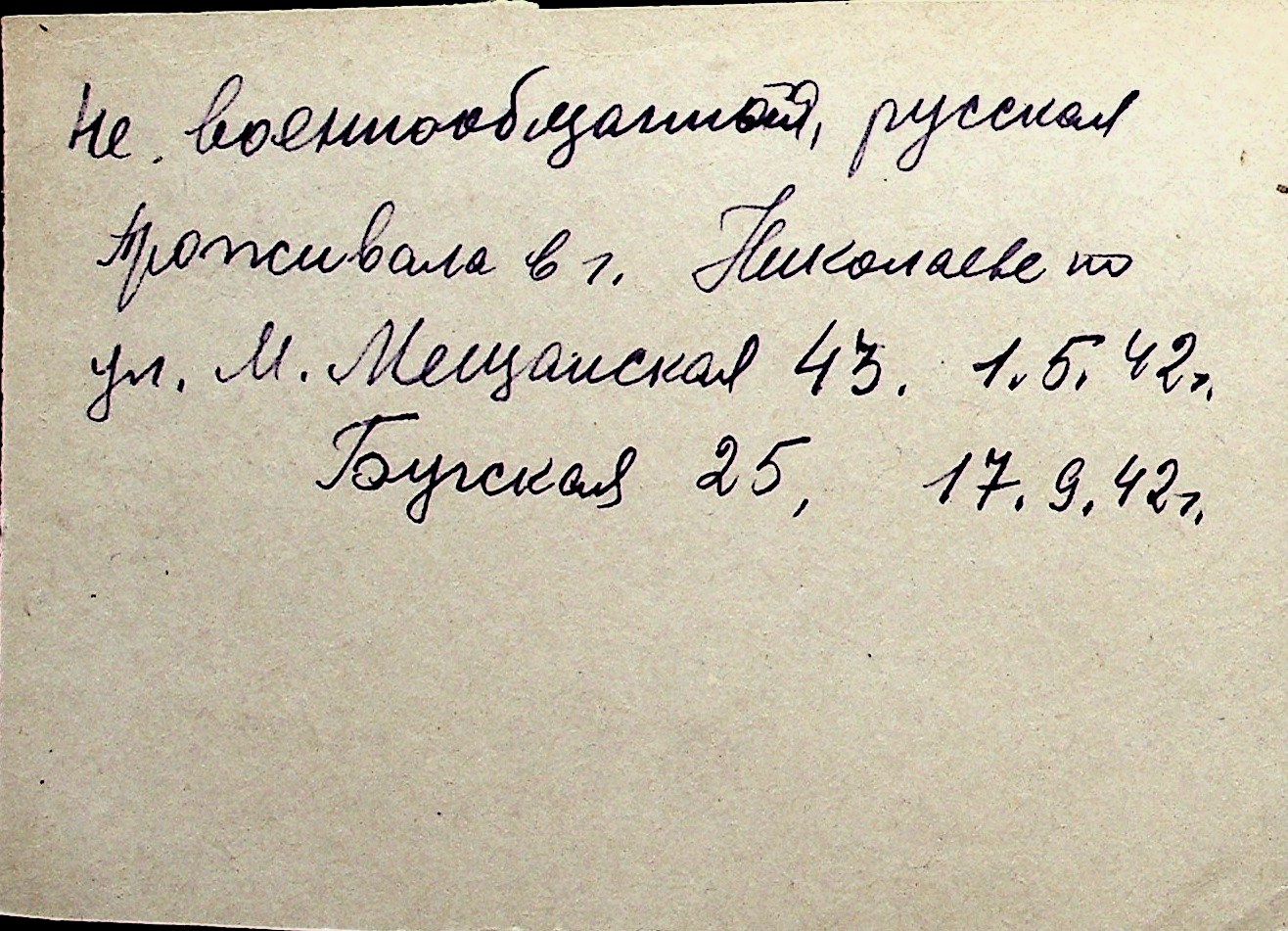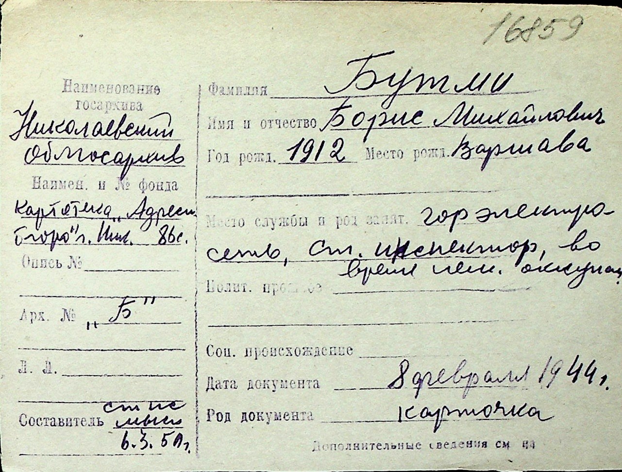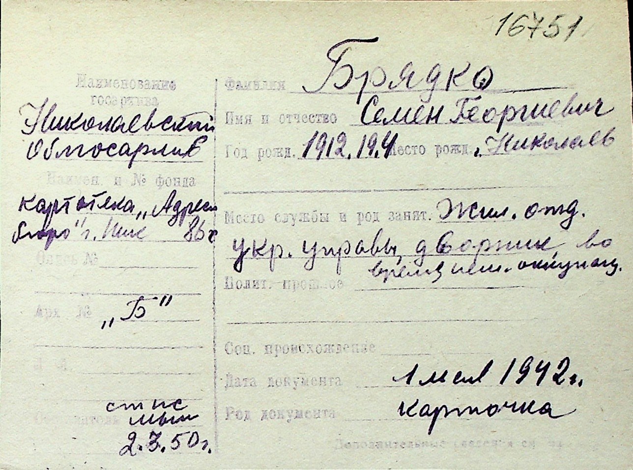 ◦ ◦ Перелік карток на осіб, які мешкали у м. Миколаїв у період окупації 1941–1944 років