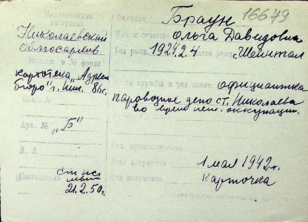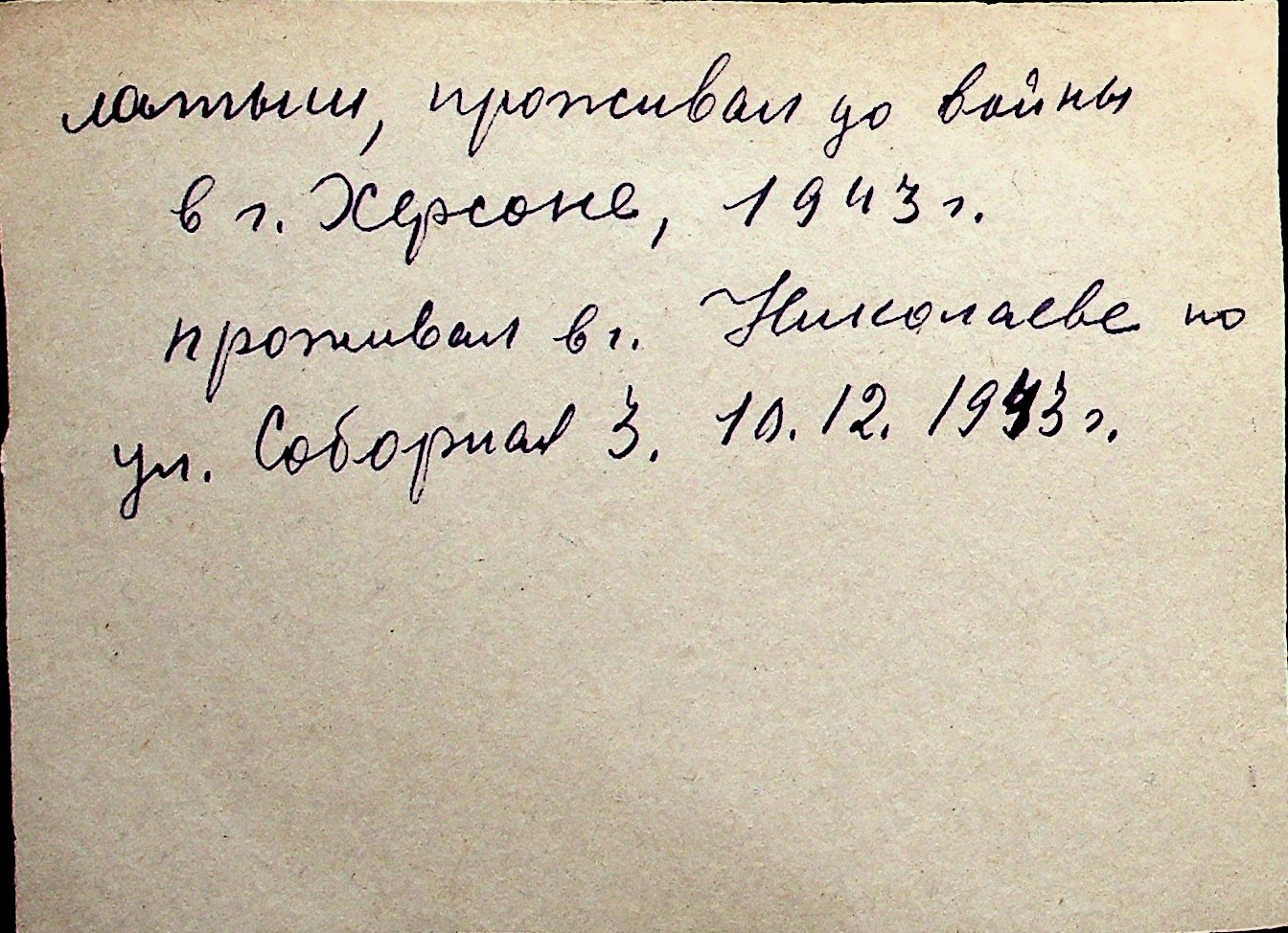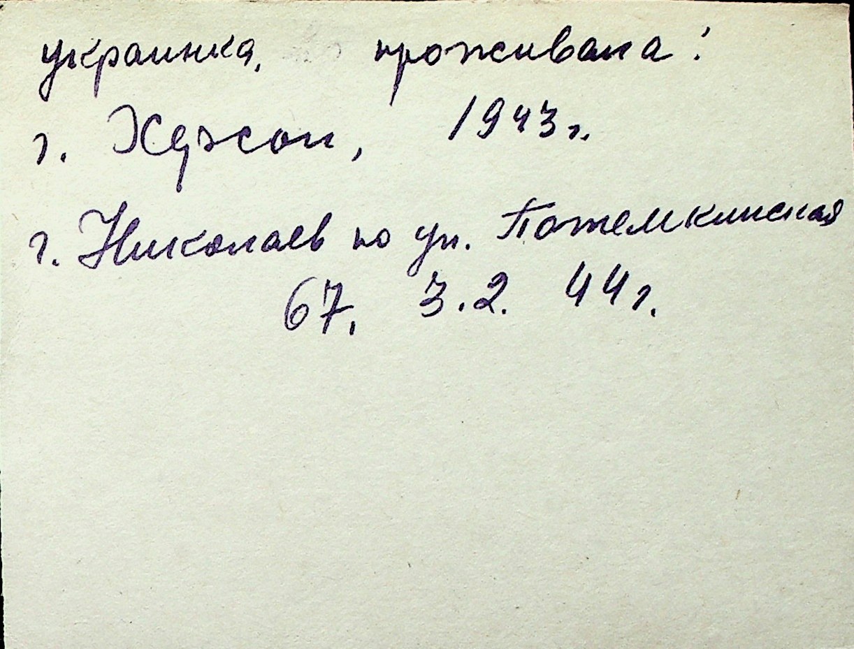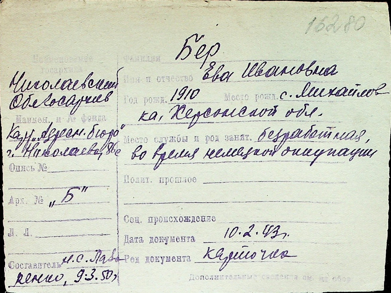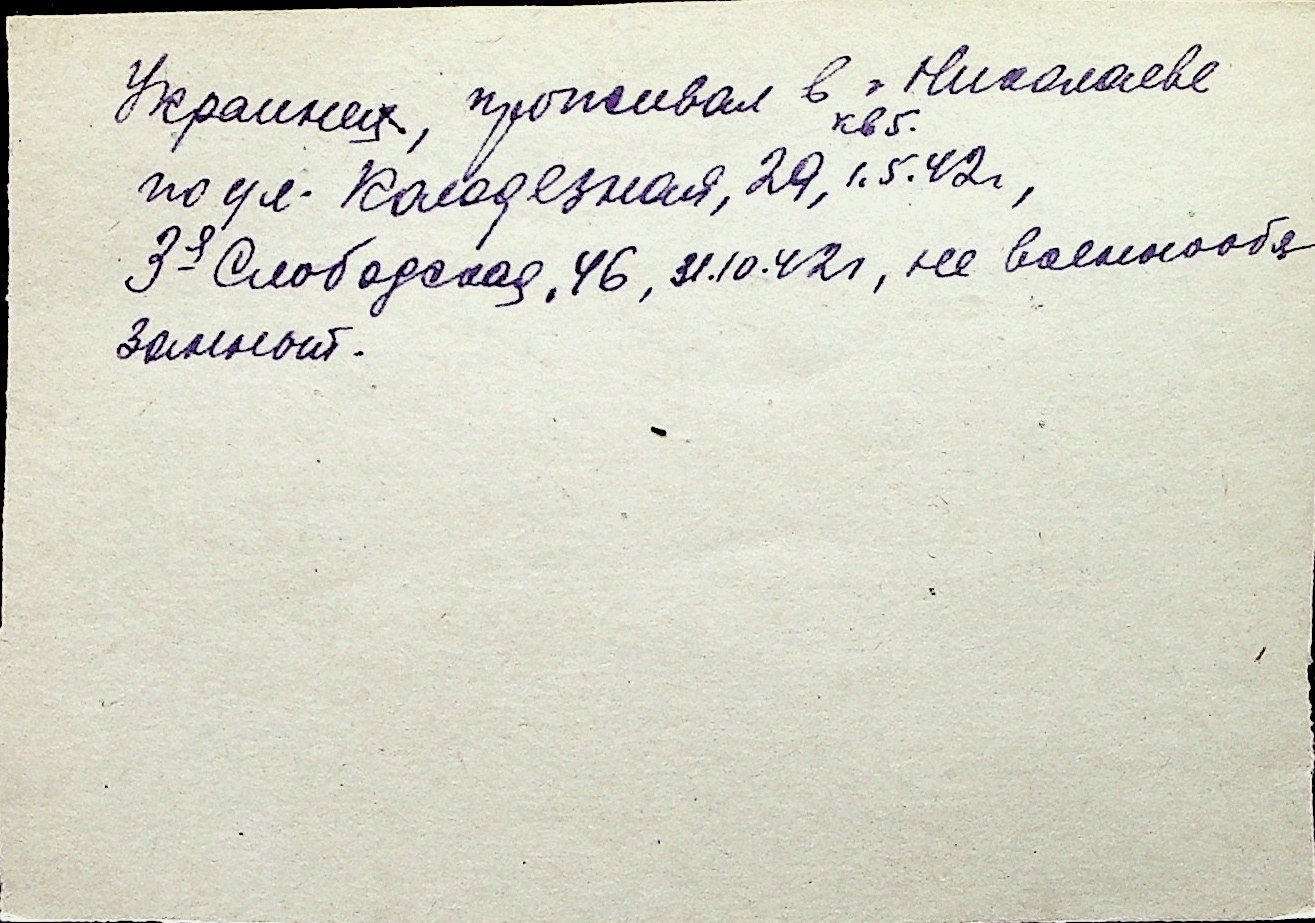 ◦ ◦ Перелік карток на осіб, які мешкали у м. Миколаїв у період окупації 1941–1944 років