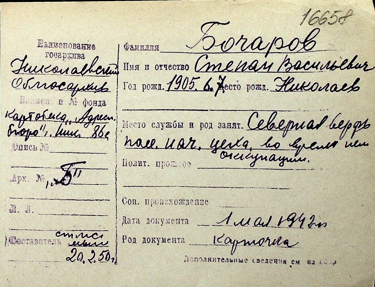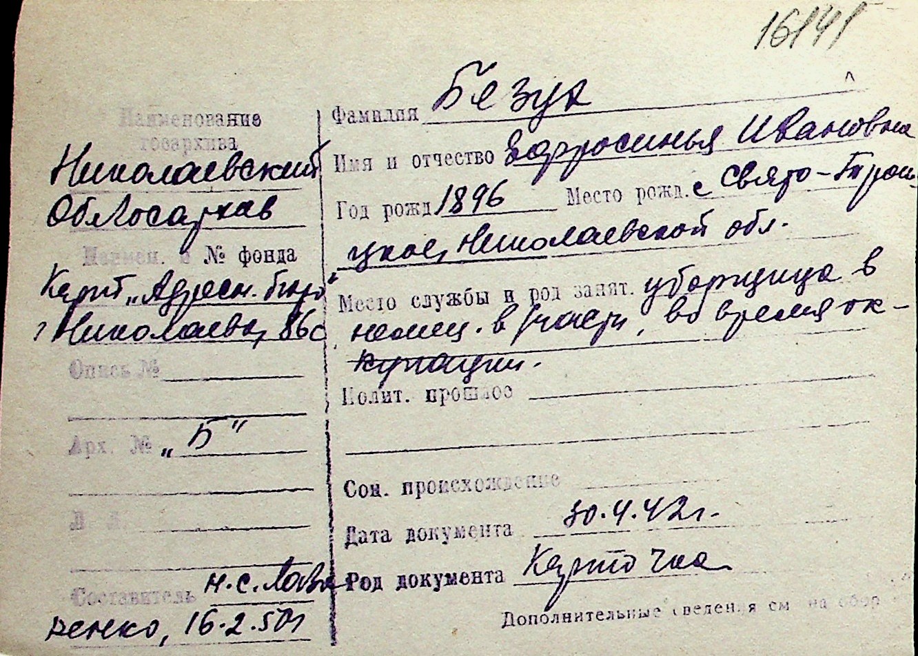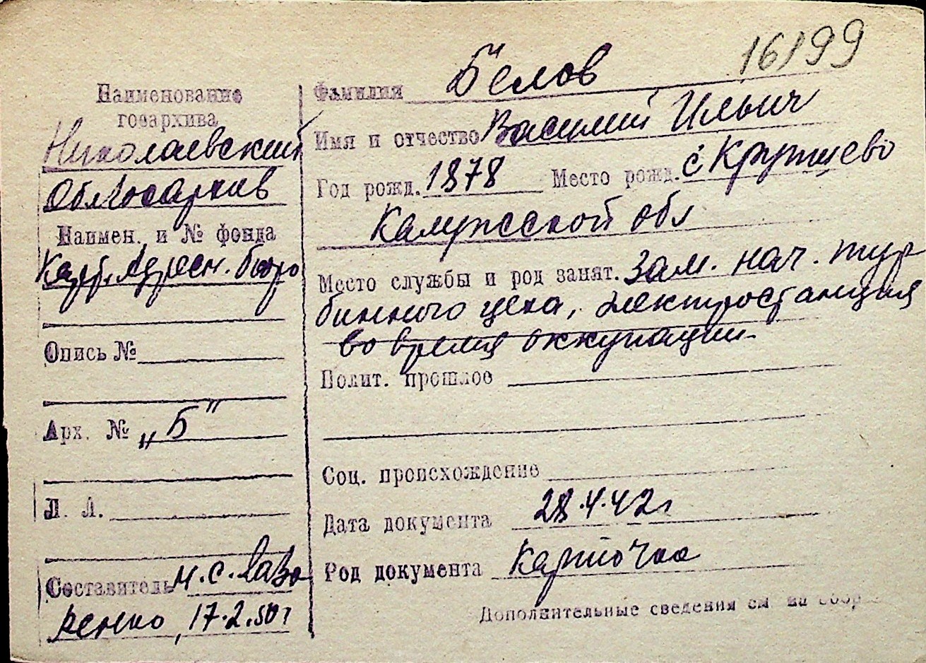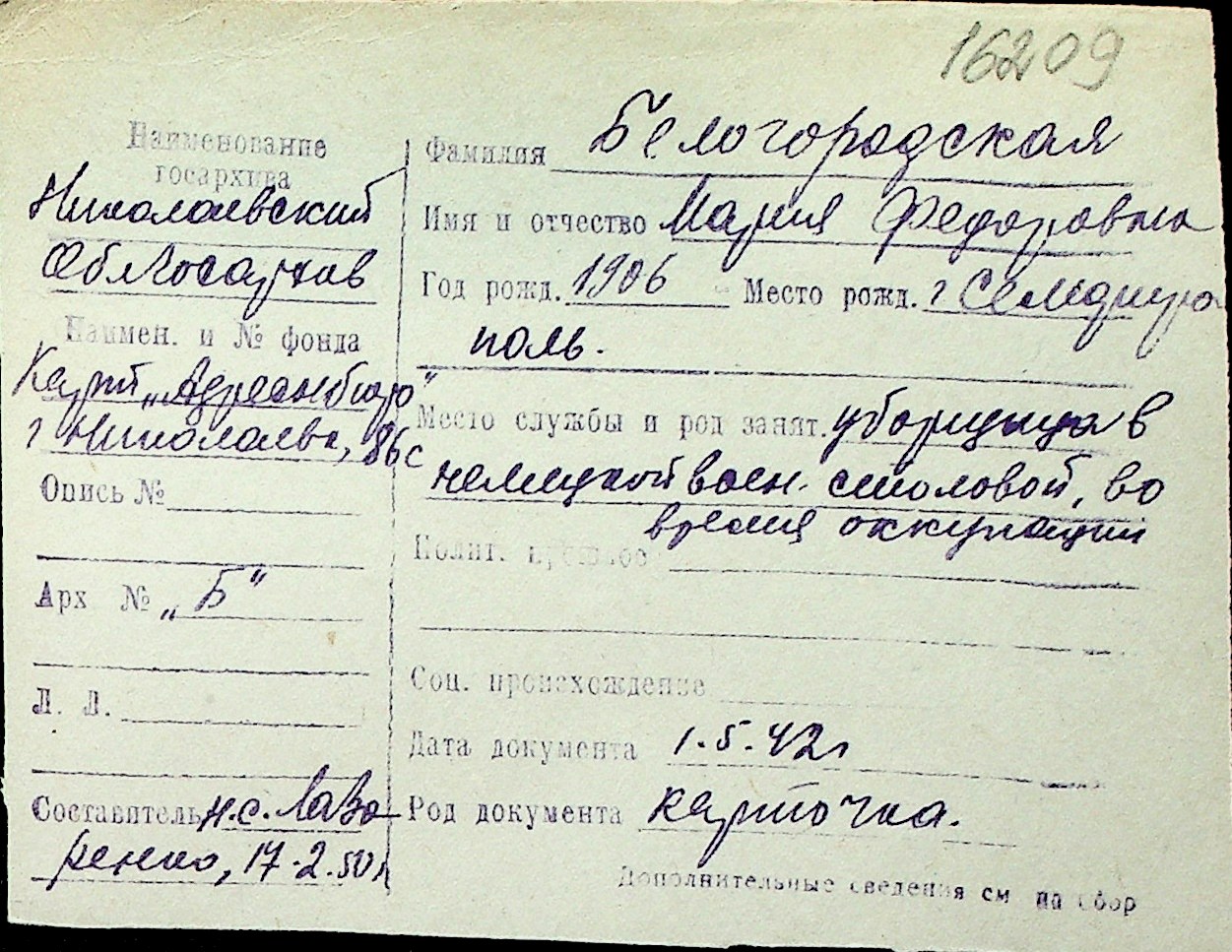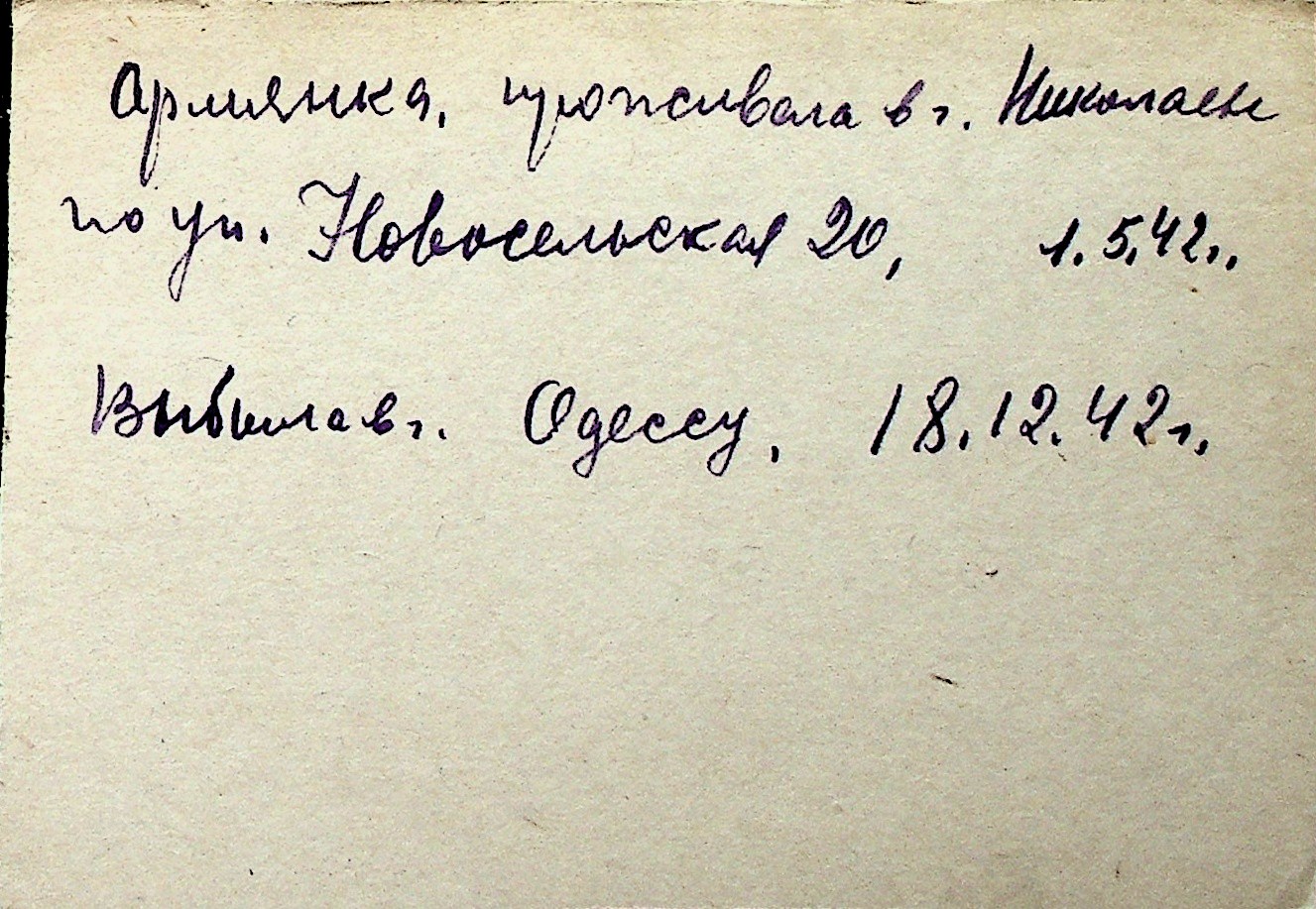 ◦ ◦ Перелік карток на осіб, які мешкали у м. Миколаїв у період окупації 1941–1944 років