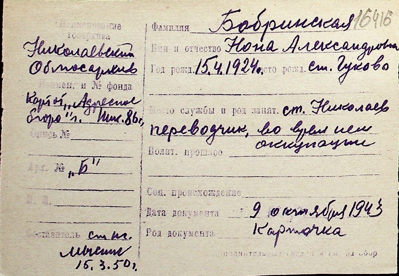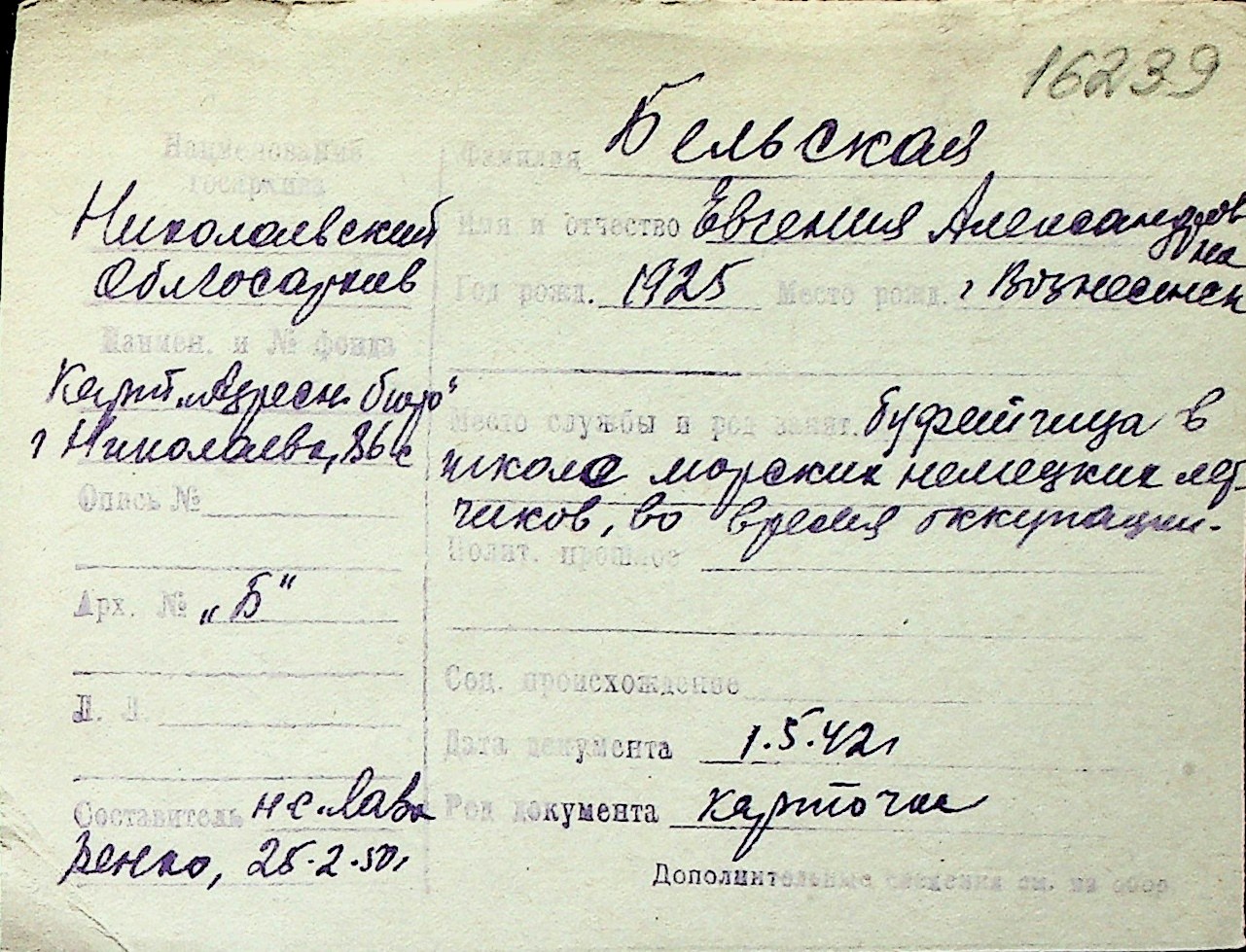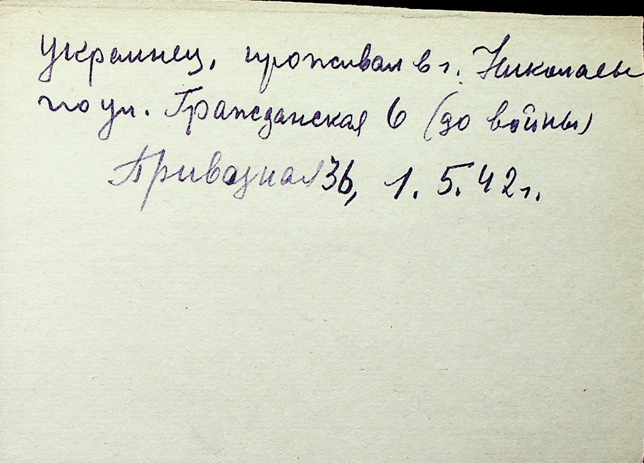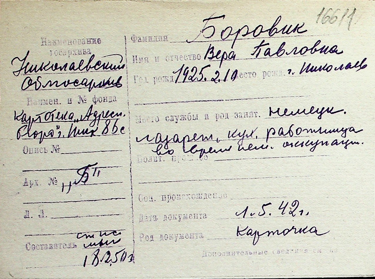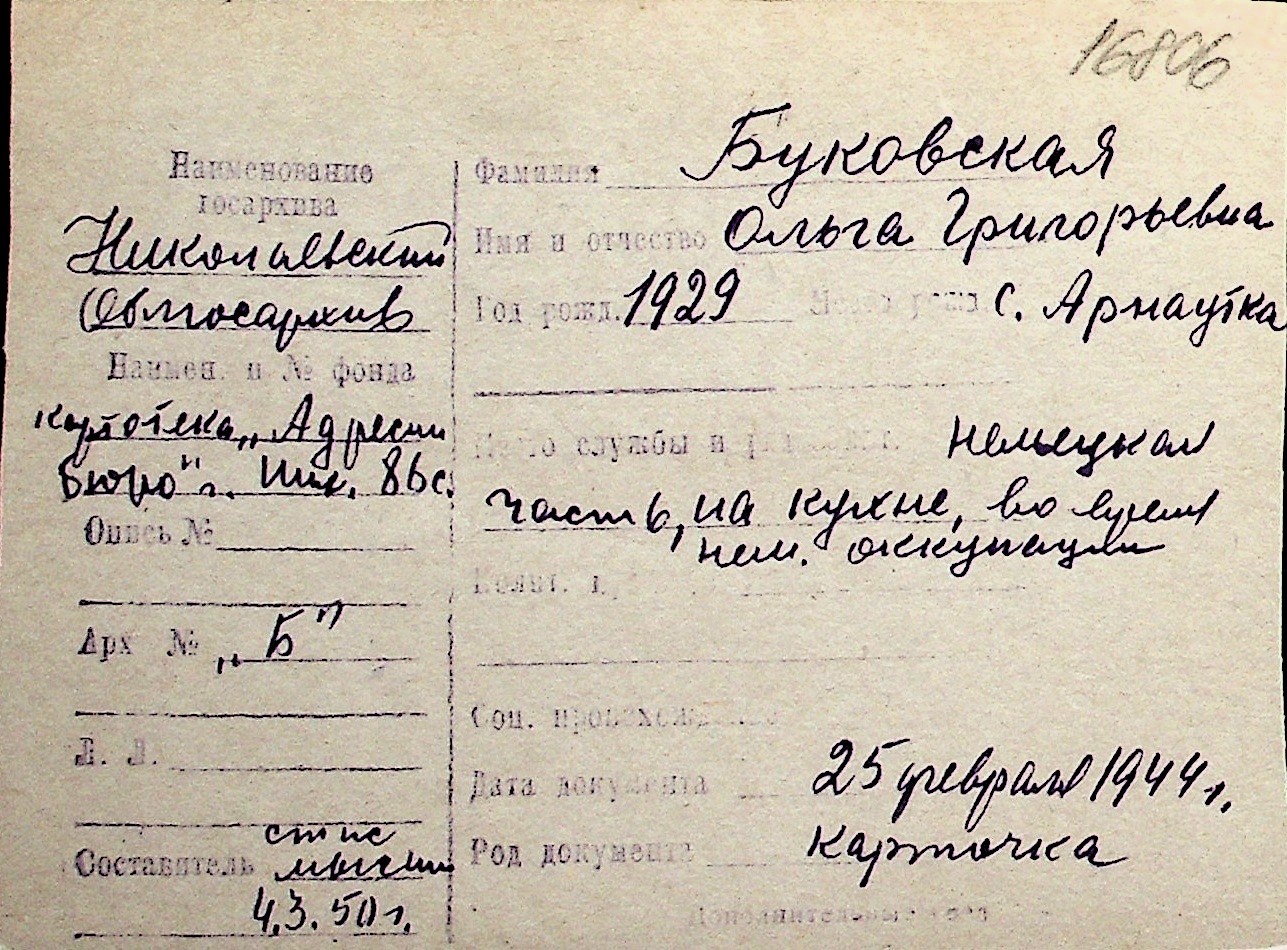 ◦ ◦ Перелік карток на осіб, які мешкали у м. Миколаїв у період окупації 1941–1944 років