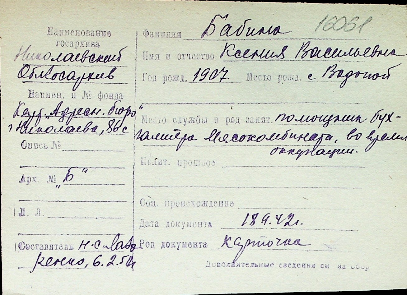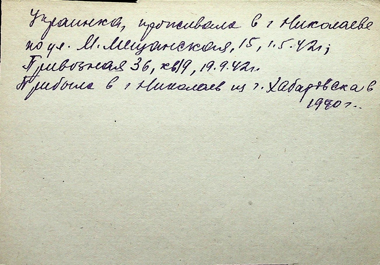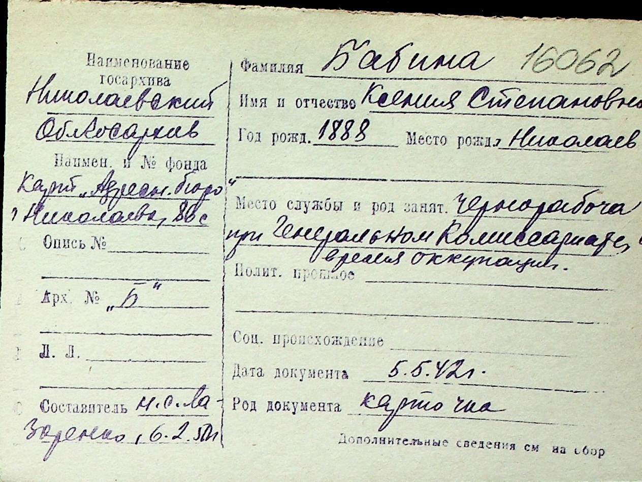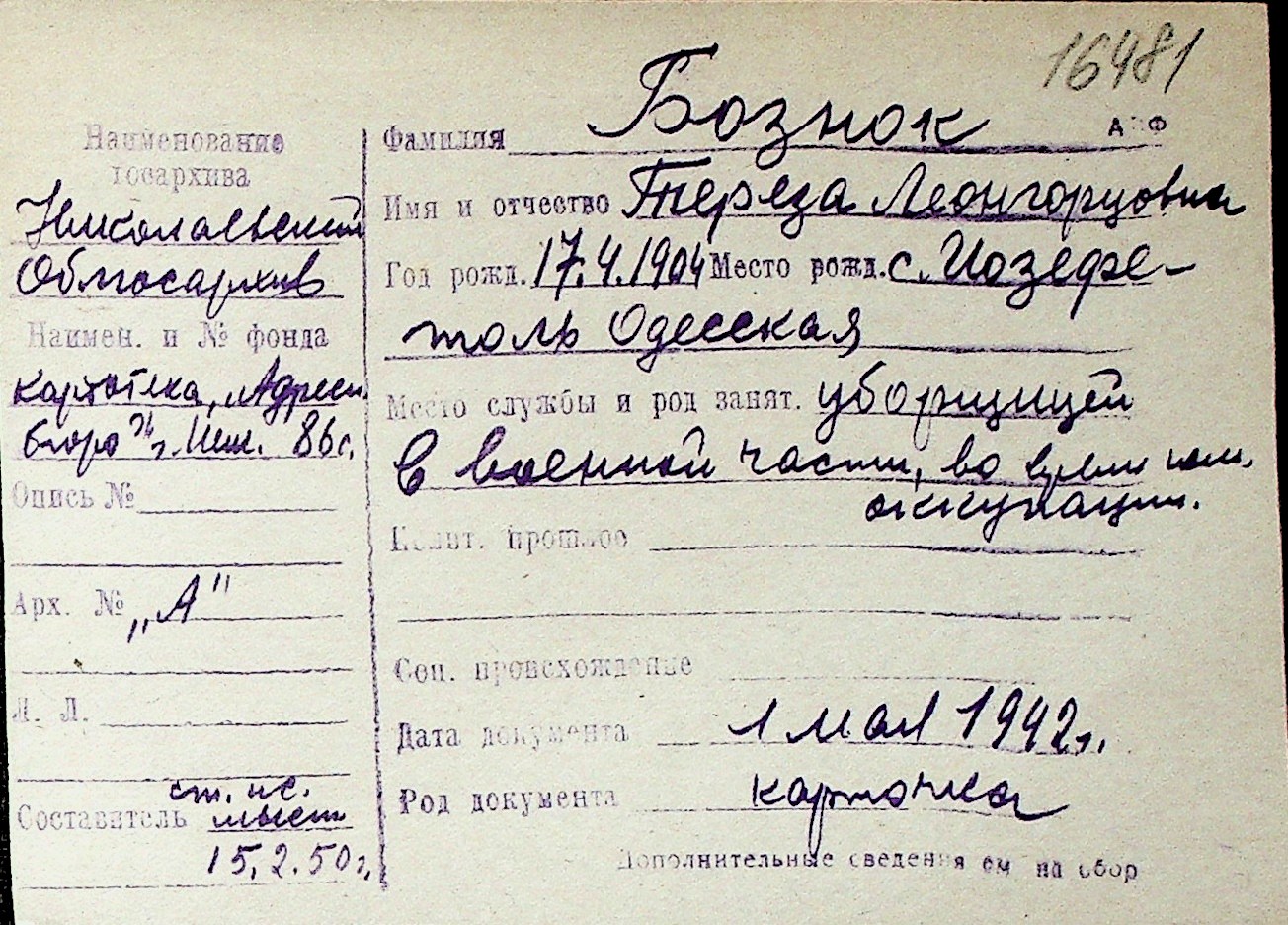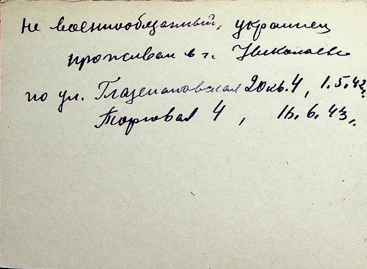 ◦ ◦ Перелік карток на осіб, які мешкали у м. Миколаїв у період окупації 1941–1944 років