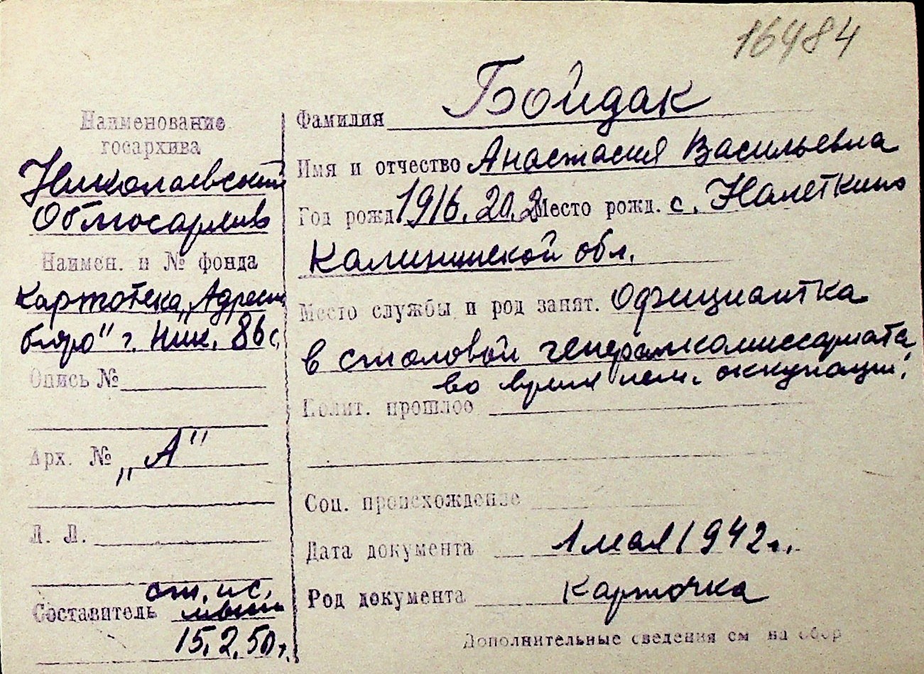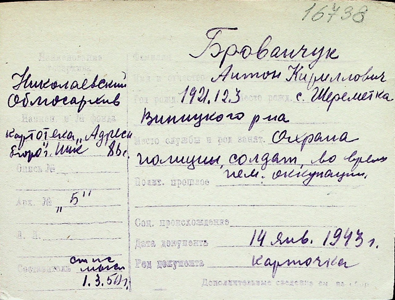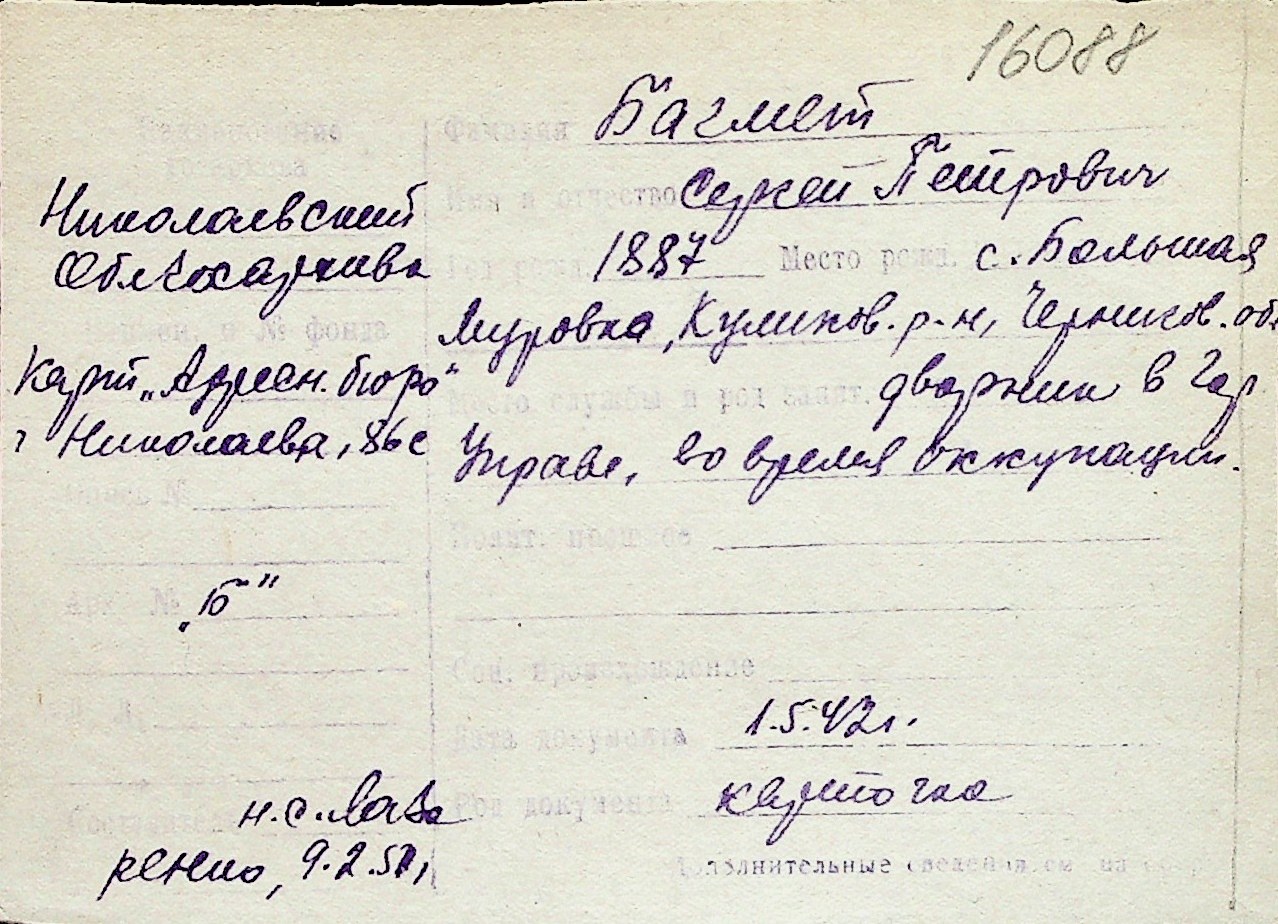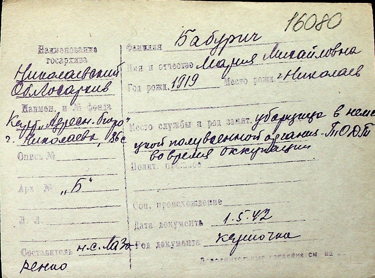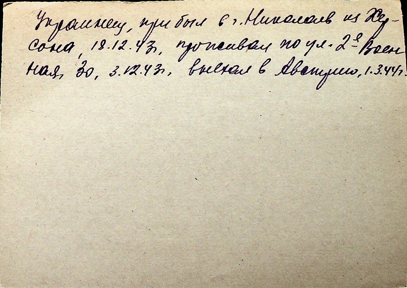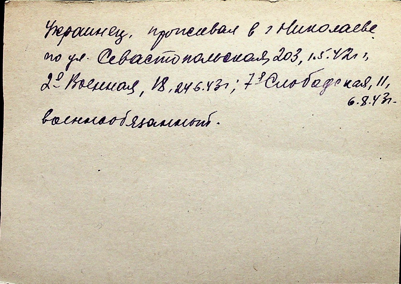 ◦ ◦ Перелік карток на осіб, які мешкали у м. Миколаїв у період окупації 1941–1944 років